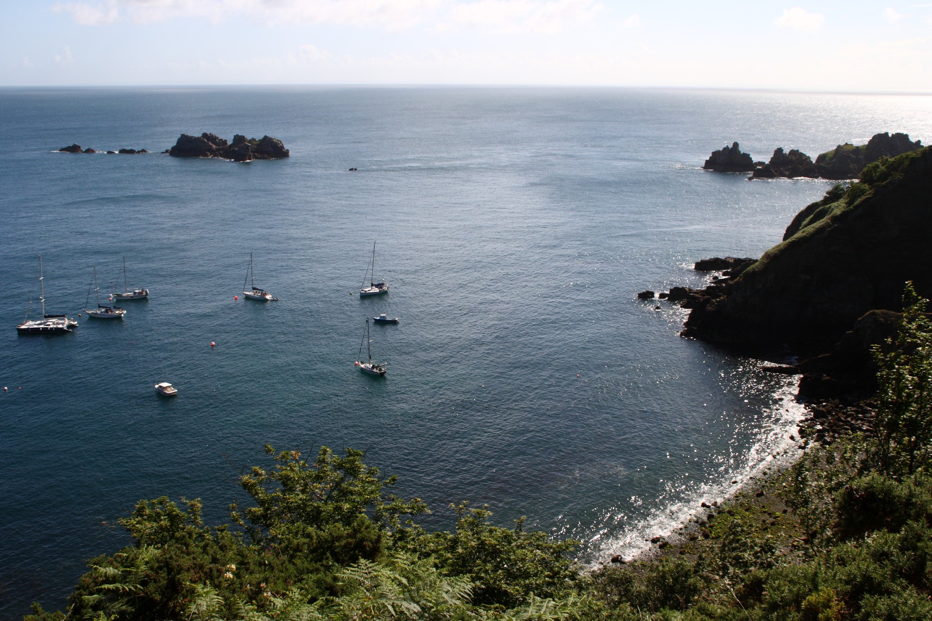 Wir verabschieden uns von Paul, der uns 2 ½ Wochen begleitet hat. Wir werden ihn vermissen. Dann verlassen wir Guernsey bei Hochwasser, wir haben 3,5 Meter über der Schwelle zum Hafenbecken und segeln die 8 Seemeilen zur Nachbarinsel Sark mit 3 Knoten Strömung. Als Ziel haben wir uns die Bucht „La Grève de la Ville“ gewählt, da wir dort ruhig in Lee liegen und der Schwell aus Südwest am geringsten sein soll. Die Bucht liegt wildromantisch auf der Landseite von Klippen und von der Seeseite von Untiefen und Felsinseln umgeben. Über uns kreisen die schreienden Möwen. Für Besucher stehen 6 Mooringtonnen bereit, wir liegen sehr geschützt mit vier anderen Yachten. Das Anlanden mit dem Dinghy ist nicht einfach, denn wir müssen es sehr weit den Kieselstrand hochschleppen, damit es sicher vor der nächsten Flut ist. Über eine Klippe ragt die Spitze des Leuchtturms. Als sich gegen Abend Nebel über die Insel legt, beginnt ein Nebelhorn regelmäßig einen Doppelton zu pfeifen. Draußen wird es bei Nieselregen ungemütlich und wir verkriechen uns gemütlich unters Deck.