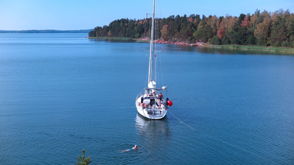 Wir schlängeln unseren Kurs im Uhrzeigersinn um die Hauptinsel zwischen den Schären hindurch und ankern in traumhaften Buchten wie südlich von Flatö. Der Jahrhundertsommer hat das Meer so erwärmt, dass wir jeden Tag mehrmals ins Wasser springen, aber er hinterlässt auch seine Spuren. Viele Bäume sind vertrocknet und haben braunes Laub; das Moos auf den Schären ist trocken wie Papier und knirscht, wenn man darüber läuft. In Holmsviken im Norden von Lumparland vertäuen wir „Anke-Sophie“ zwischen Schären und Anker. Unter Spi segeln wir bis Mariehamn, wo wir tatsächlich mal einen schlechten Tag mit Schauern haben. Dorothé und Thomas kommen mit der Fähre an und werden herzlich begrüßt.