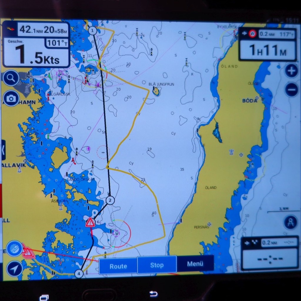 Auf dem Ausschnitt vom Kartenplotter sehen wir die Kreuz zwischen Öland und schwedischem Festland mit einer Wende bei Blå Jungfrun bis nach Mönsterås.