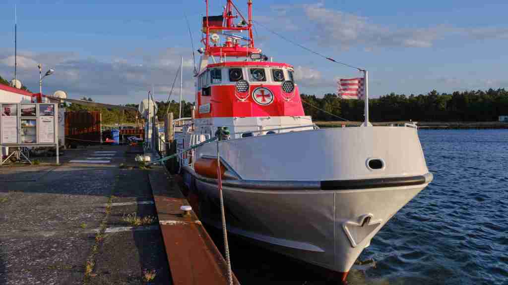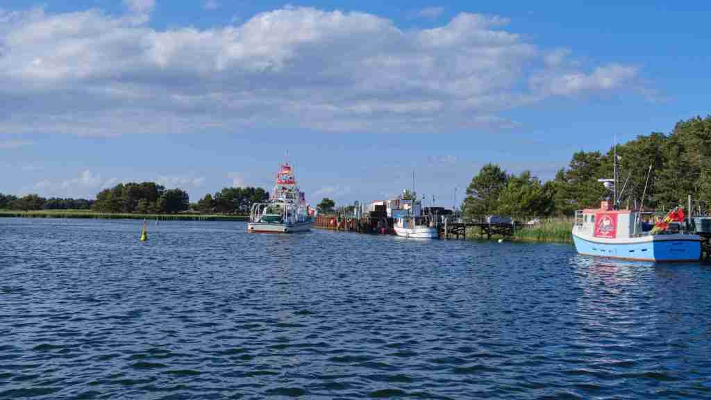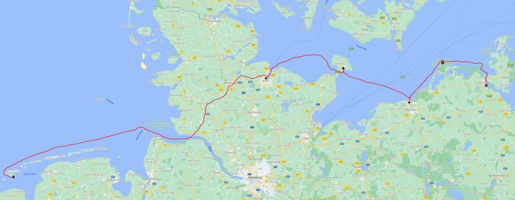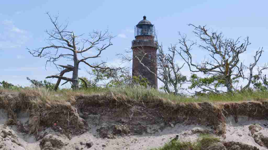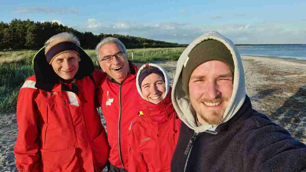 Stefan kommt mit Tochter Eira und Freund Artur in Stralsund an Bord, um mit mir die erste Etappe Richtung West zu segeln und das Boot in eine gute Ausgangsposition in der Nordsee zu bringen. Wir legen Freitagnachmittag sofort nach ihrer Ankunft ab, denn der Wetterbericht zeigt einen aufkommenden Starkwind, und zwar nach dem Prinzip der größten Gemeinheit genau aus West, also gegen an mit bis zu 28 kn in Böen. Wir entscheiden uns in die Nacht zu fahren und kreuzen bei noch mäßigem Wind und herrlichem Sonnenuntergang Richtung Darßer Ort. Morgens um 2 Uhr machen wir als einziges Segelboot im Nothafen fest. Müde, aber zufrieden, das erste Stück geschafft zu haben. Wir bleiben für anderthalb Tage hier und machen Spaziergänge durch das Naturschutzgebiet zum Leuchtturm Darßer Ort und entlang dem Strand nach Prerow.