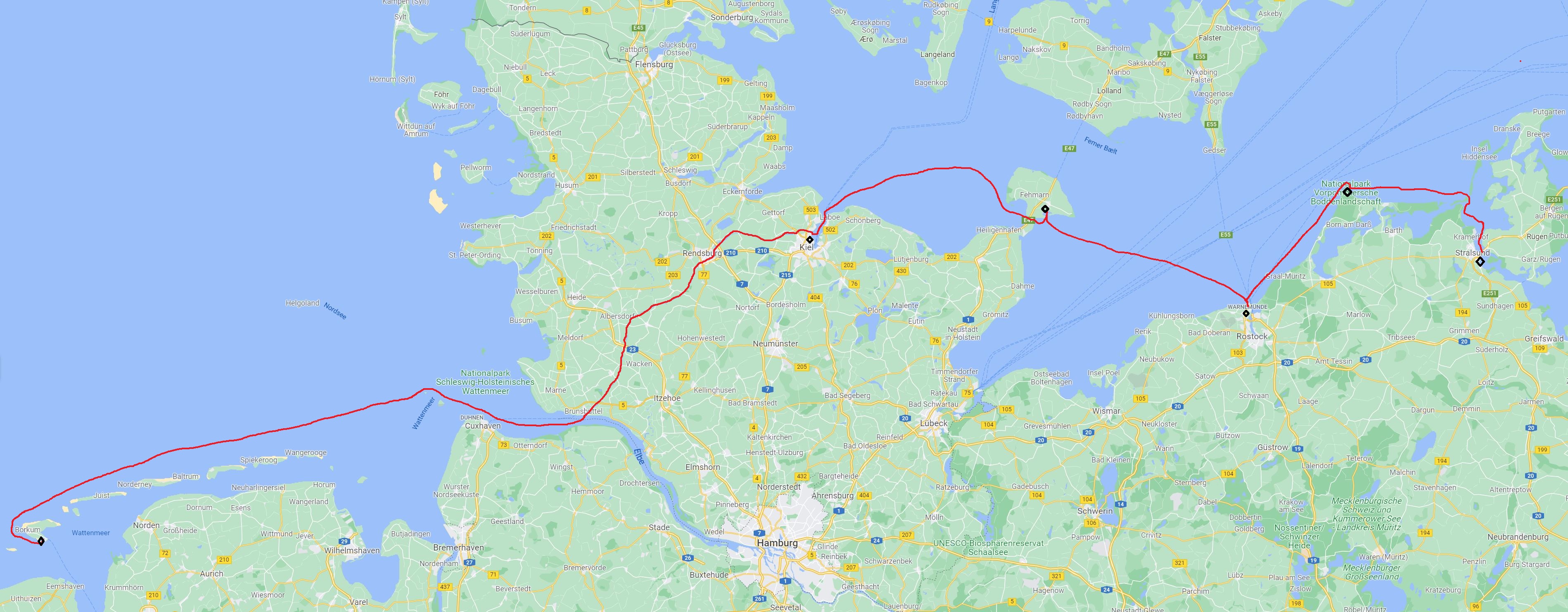 Stefan kommt mit Tochter Eira und Freund Artur in Stralsund an Bord, um mit mir die erste Etappe Richtung West zu segeln und das Boot in eine gute Ausgangsposition in der Nordsee zu bringen. Wir legen Freitagnachmittag sofort nach ihrer Ankunft ab, denn der Wetterbericht zeigt einen aufkommenden Starkwind, und zwar nach dem Prinzip der größten Gemeinheit genau aus West, also gegen an mit bis zu 28 kn in Böen. Wir entscheiden uns in die Nacht zu fahren und kreuzen bei noch mäßigem Wind und herrlichem Sonnenuntergang Richtung Darßer Ort. Morgens um 2 Uhr machen wir als einziges Segelboot im Nothafen fest. Müde, aber zufrieden, das erste Stück geschafft zu haben. Wir bleiben für anderthalb Tage hier und machen Spaziergänge durch das Naturschutzgebiet zum Leuchtturm Darßer Ort und entlang dem Strand nach Prerow.