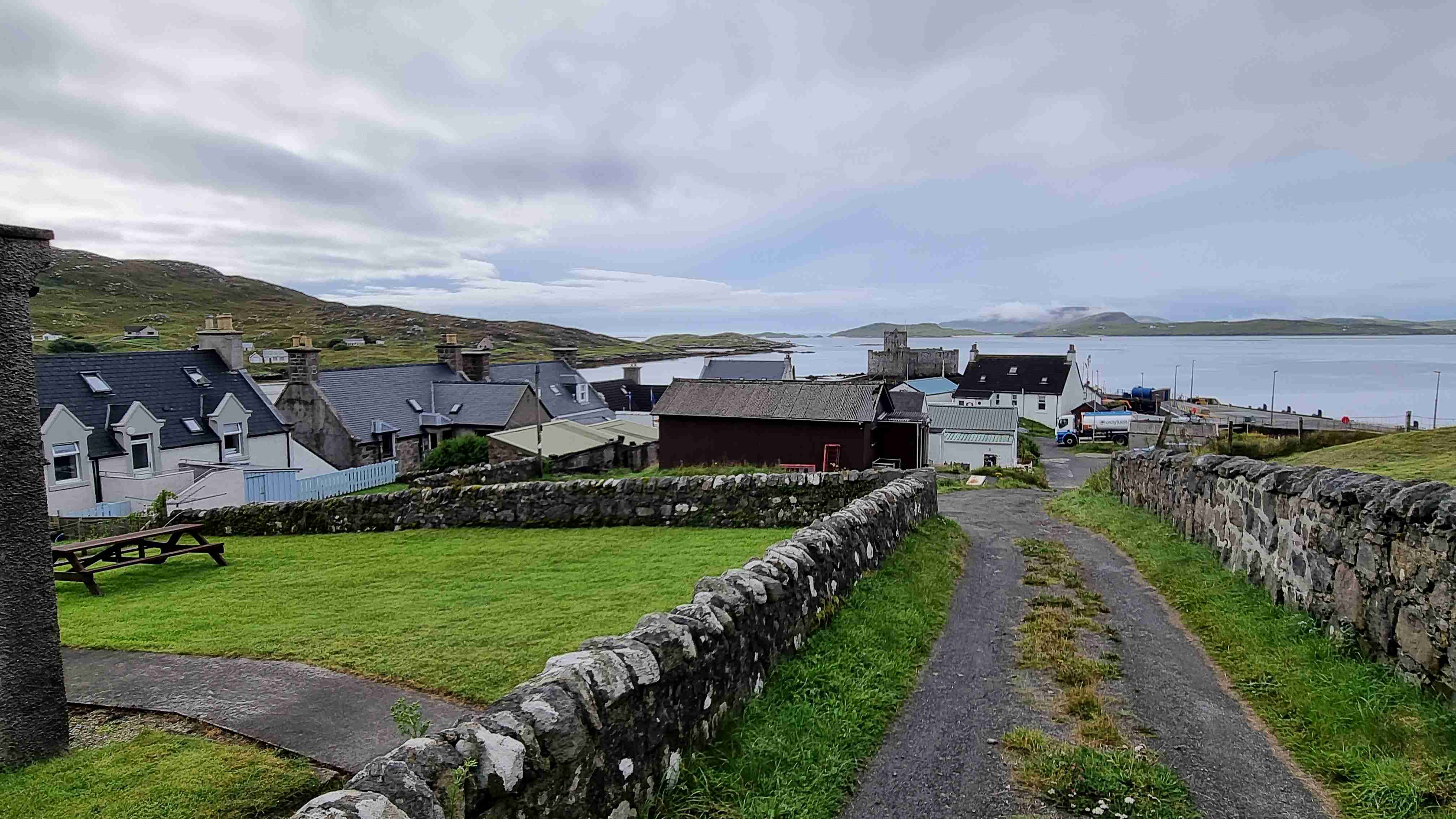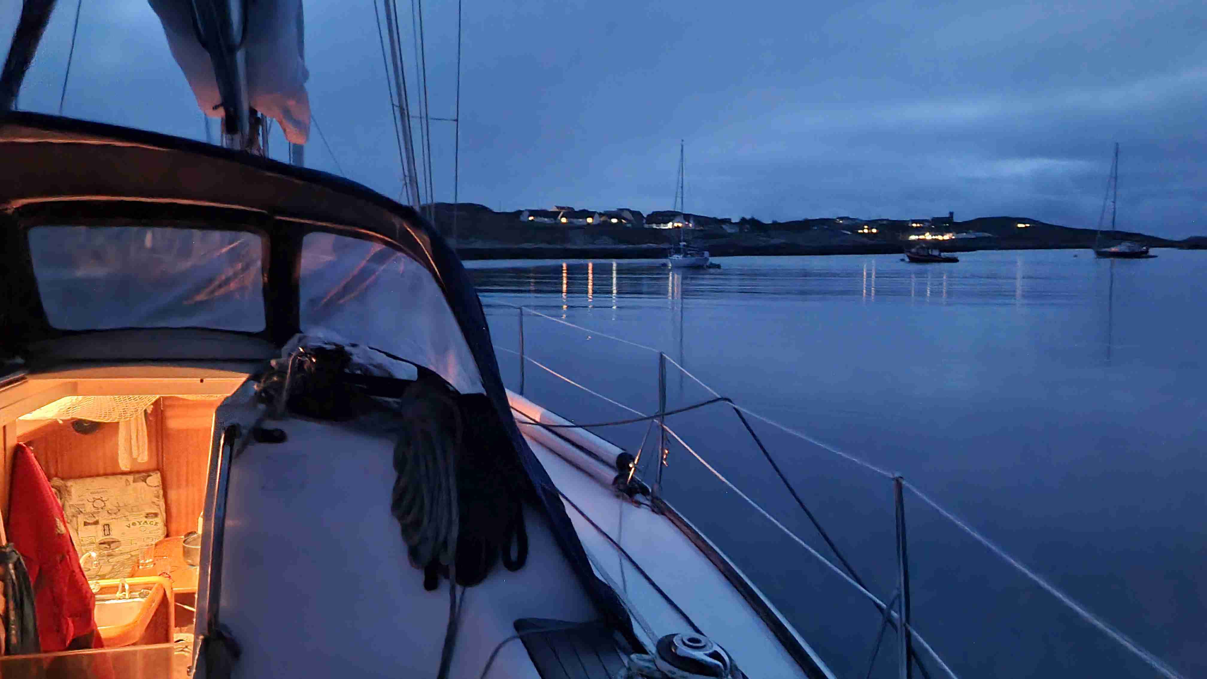 Da wieder ein Starkwind auf uns zukommt, dieses Mal zum Glück aus Südosten, müssen wir zeitig aufbrechen, um unser Ziel Castlebay auf Barra zu erreichen, die zu den Äußeren Hebriden zählt. Ich übernehme die erste Wache und lege um 3 Uhr ab, Till hilft mir um 4:30 die Segel zu setzen, der erste Wind kommt auf und nimmt jede Stunde um mehr als 2 Knoten zu und soll ab 13 Uhr bis 30 Knoten und mehr erreichen, je nach Wettermodell. Leider steht die Strömung entlang von Coll gegen uns und in der Passage zwischen Coll und Tiree mit bis zu 2 Knoten. Dann können wir mit achterlichem Wind unser Ziel direkt anliegen. Um schneller zu werden, setzen wir zunächst den Spi und wechseln auf die Genua, als der Wind auf über 4 Bft. aufgefrischt hat. Der Himmel wird immer dunkler und wir freuen uns über einen guten Liegeplatz am Ponton der Castlebay Marina. Ich schaffe es gerade noch zur Dusche und zurück, da pfeift auch schon der Wind und die Schauer ziehen über uns hinweg. Eine warme Dusche ist schon ein sagenhaftes Erlebnis nach drei Wochen ohne diesen Luxus. Diese Inselwelt ist so abgelegen, dass wir uns in dieser Zeit mit einer kalten Dusche am Heck begnügen durften.