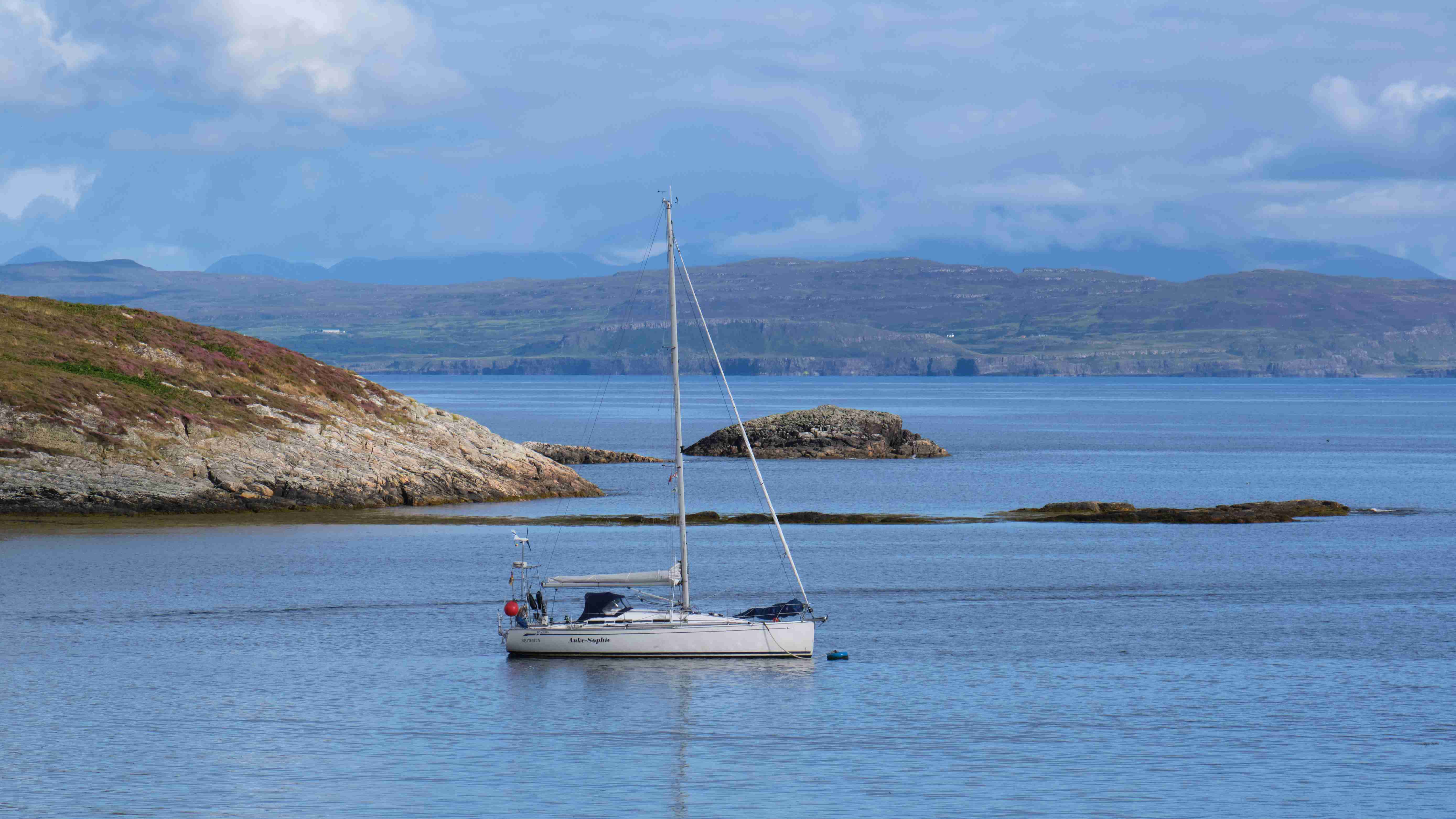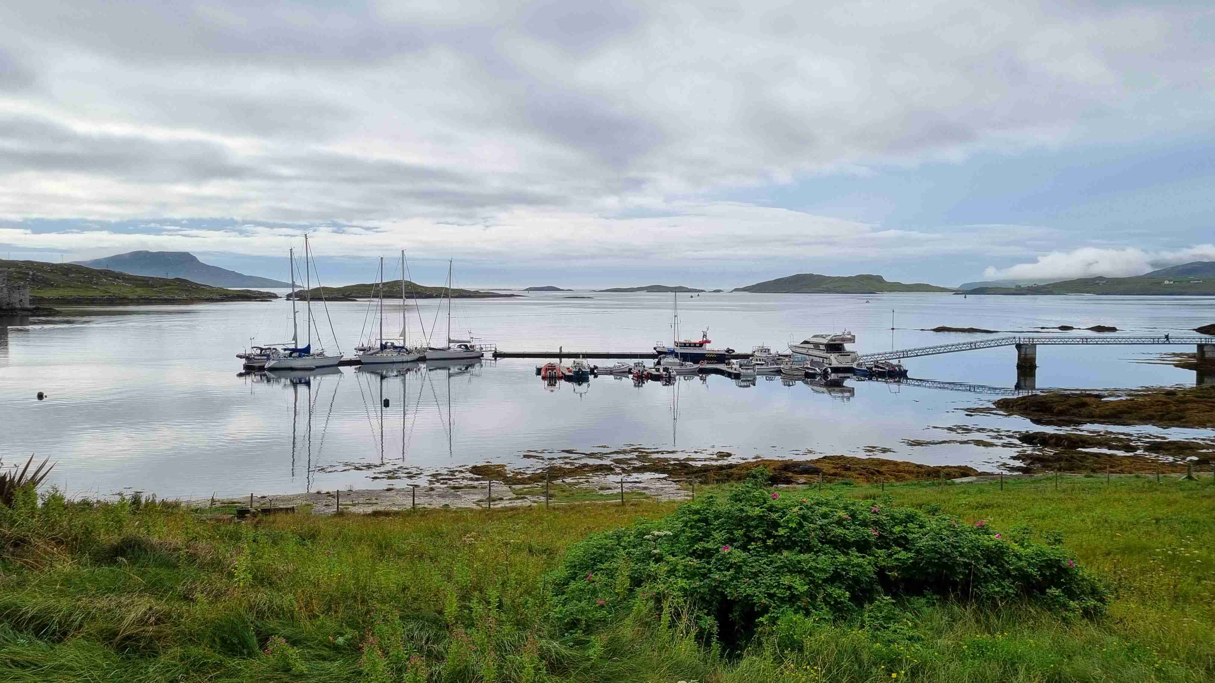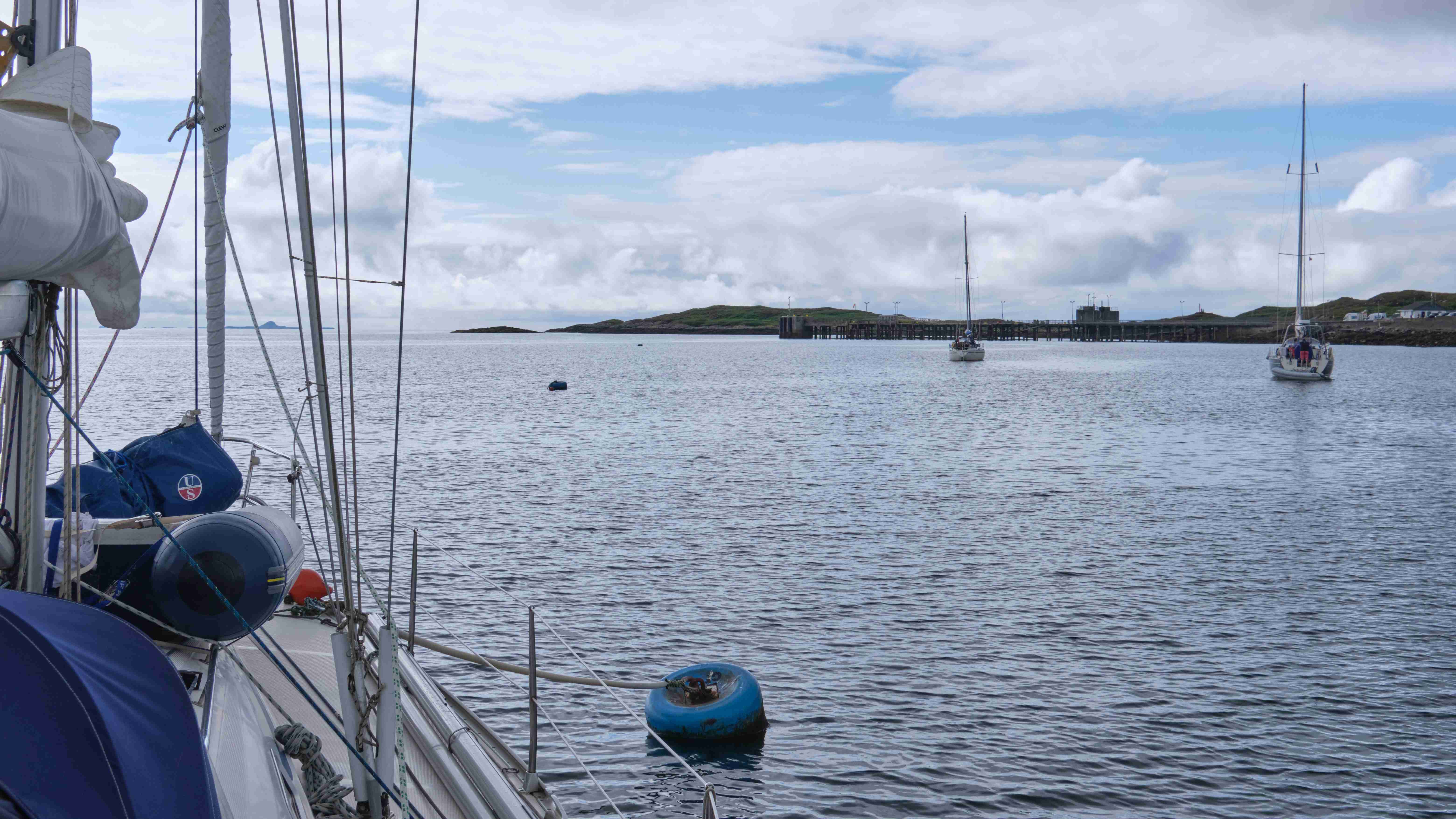 Wir legen nachmittags wieder ab, um das kleine Stück bis zur Insel Coll zu segeln, die zu den Inneren Hebriden gehört. Bei frischem NW-Wind können wir den Kurs bis zum Loch Eatharna fast anliegen und brauchen nur einen kurzen Holeschlag, um uns an eine Mooringtonne vor dem kleinen urigen Fischerort Arinagour zu bringen. Da am nächsten Tag ein Flautentag ist, beschließen wir hier eine Pause einzulegen. Es gibt ein nettes Hotel, wo wir einen Kaffee und Internet bekommen, aber leider kein Abendessen, denn das hätten wir Tage zuvor schon buchen müssen. Wir kennen ja das Spiel, heute wird wieder an Bord gekocht. Der Ort steht für ein Naturschauspiel. Man kann vor der Küste mit Basking sharks (Riesenhaie) schnorcheln. Die besonderen seltenen Tiere leben vom Plankton. Auch Minkwale wurden heute gesehen. Leider haben wir keine Zeit, eine Tour zu organisieren, denn wir müssen weiter zu den Äußeren Hebriden.