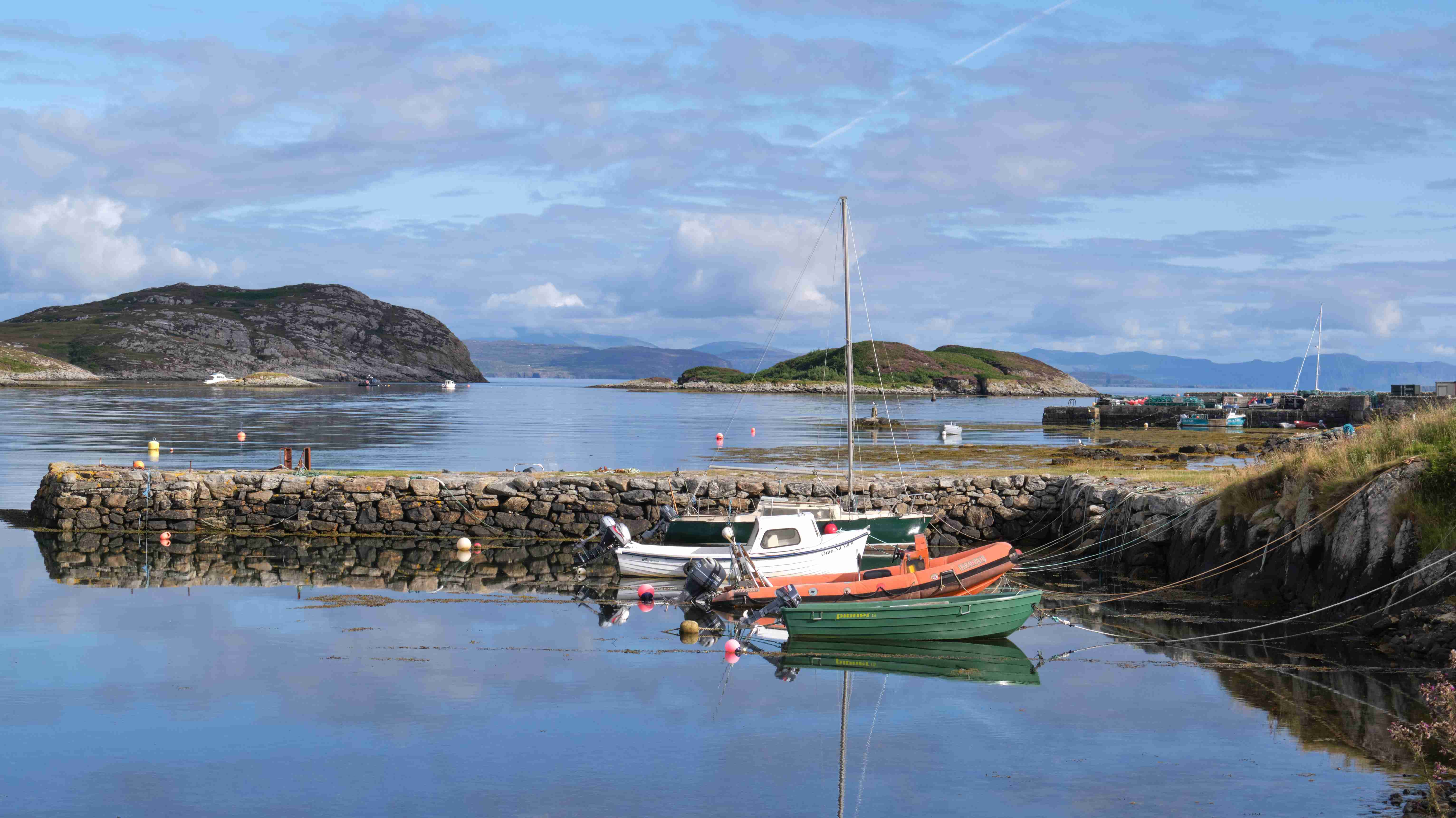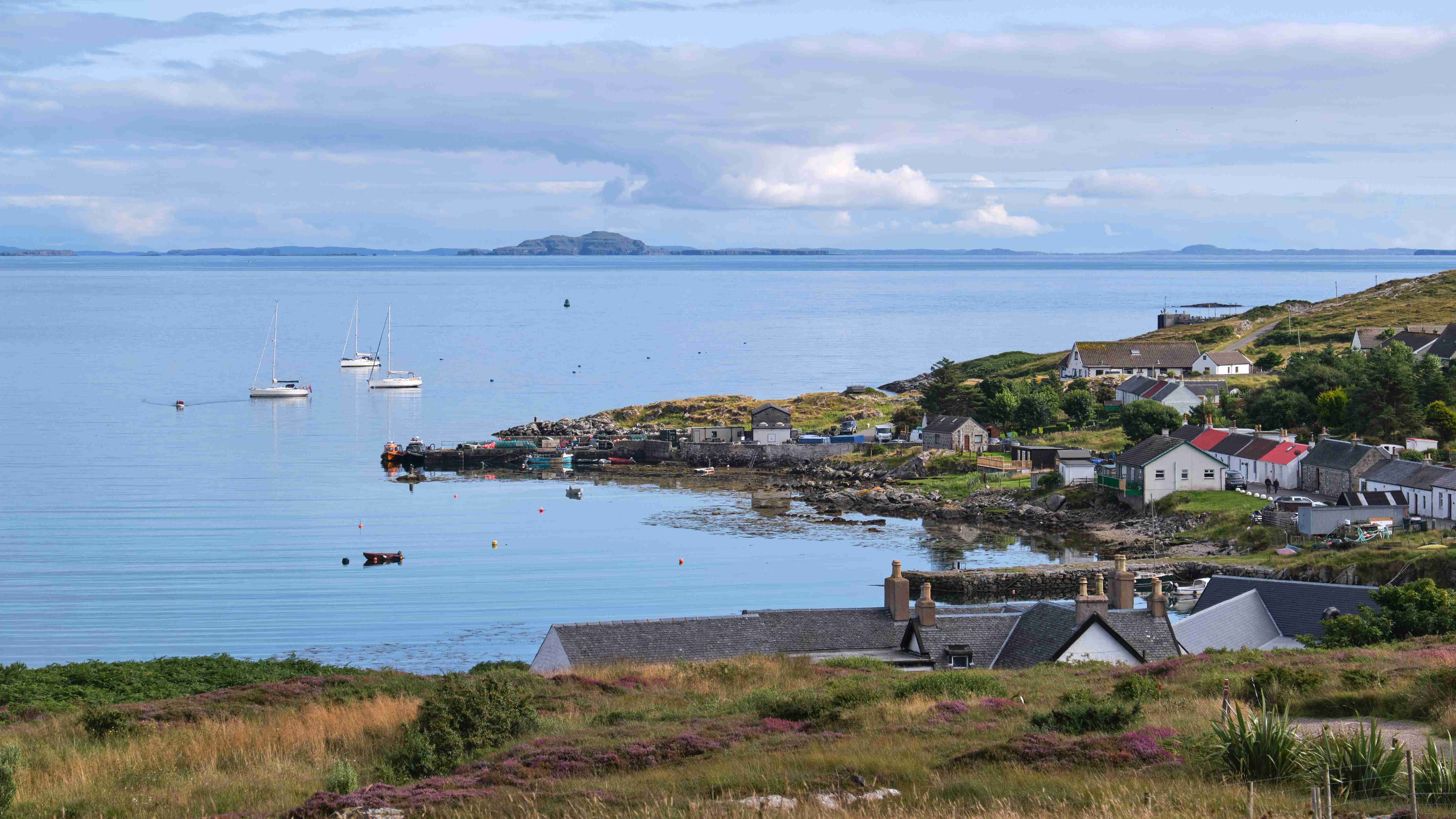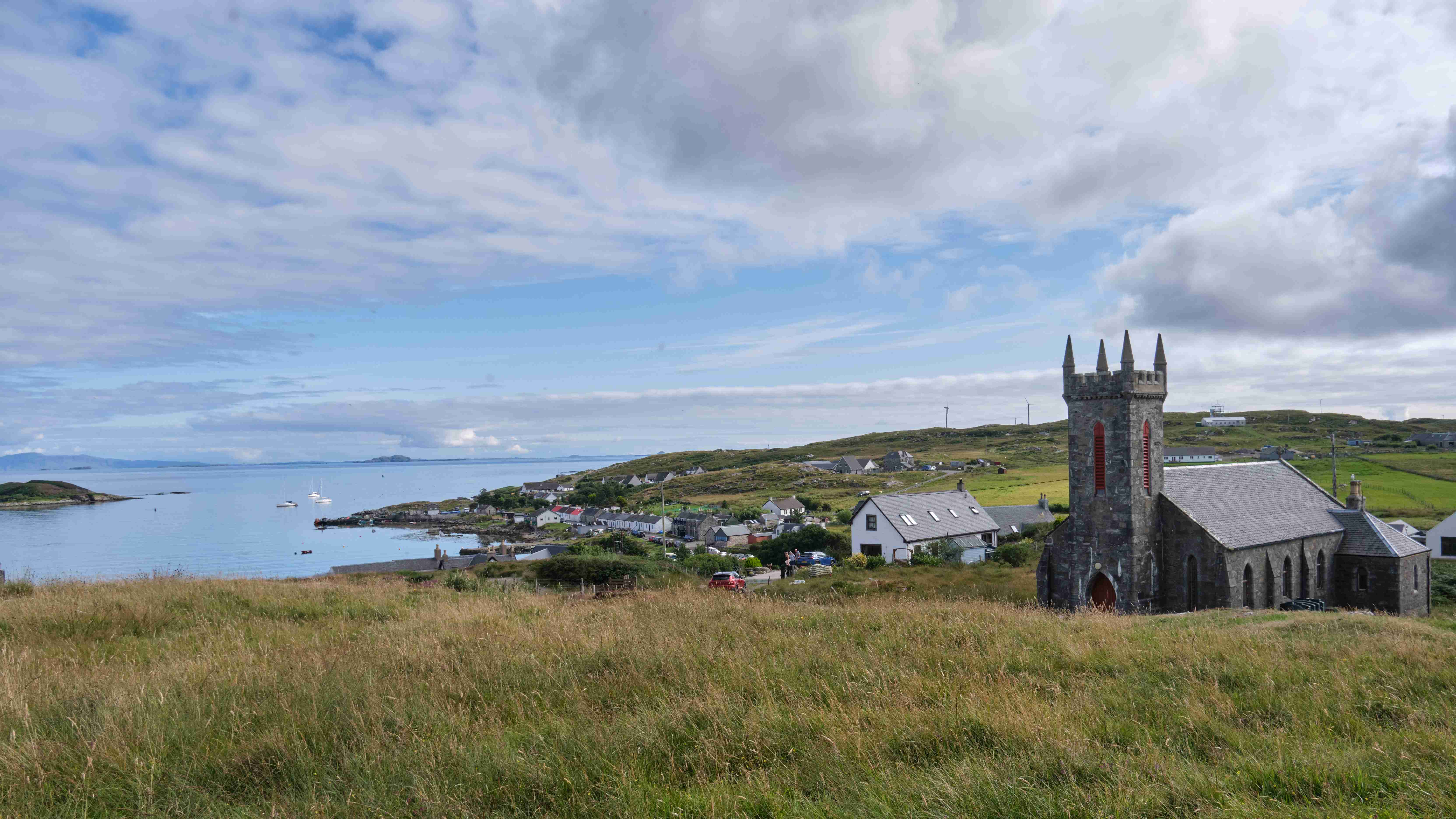 Wir legen nachmittags wieder ab, um das kleine Stück bis zur Insel Coll zu segeln, die zu den Inneren Hebriden gehört. Bei frischem NW-Wind können wir den Kurs bis zum Loch Eatharna fast anliegen und brauchen nur einen kurzen Holeschlag, um uns an eine Mooringtonne vor dem kleinen urigen Fischerort Arinagour zu bringen. Da am nächsten Tag ein Flautentag ist, beschließen wir hier eine Pause einzulegen. Es gibt ein nettes Hotel, wo wir einen Kaffee und Internet bekommen, aber leider kein Abendessen, denn das hätten wir Tage zuvor schon buchen müssen. Wir kennen ja das Spiel, heute wird wieder an Bord gekocht. Der Ort steht für ein Naturschauspiel. Man kann vor der Küste mit Basking sharks (Riesenhaie) schnorcheln. Die besonderen seltenen Tiere leben vom Plankton. Auch Minkwale wurden heute gesehen. Leider haben wir keine Zeit, eine Tour zu organisieren, denn wir müssen weiter zu den Äußeren Hebriden.