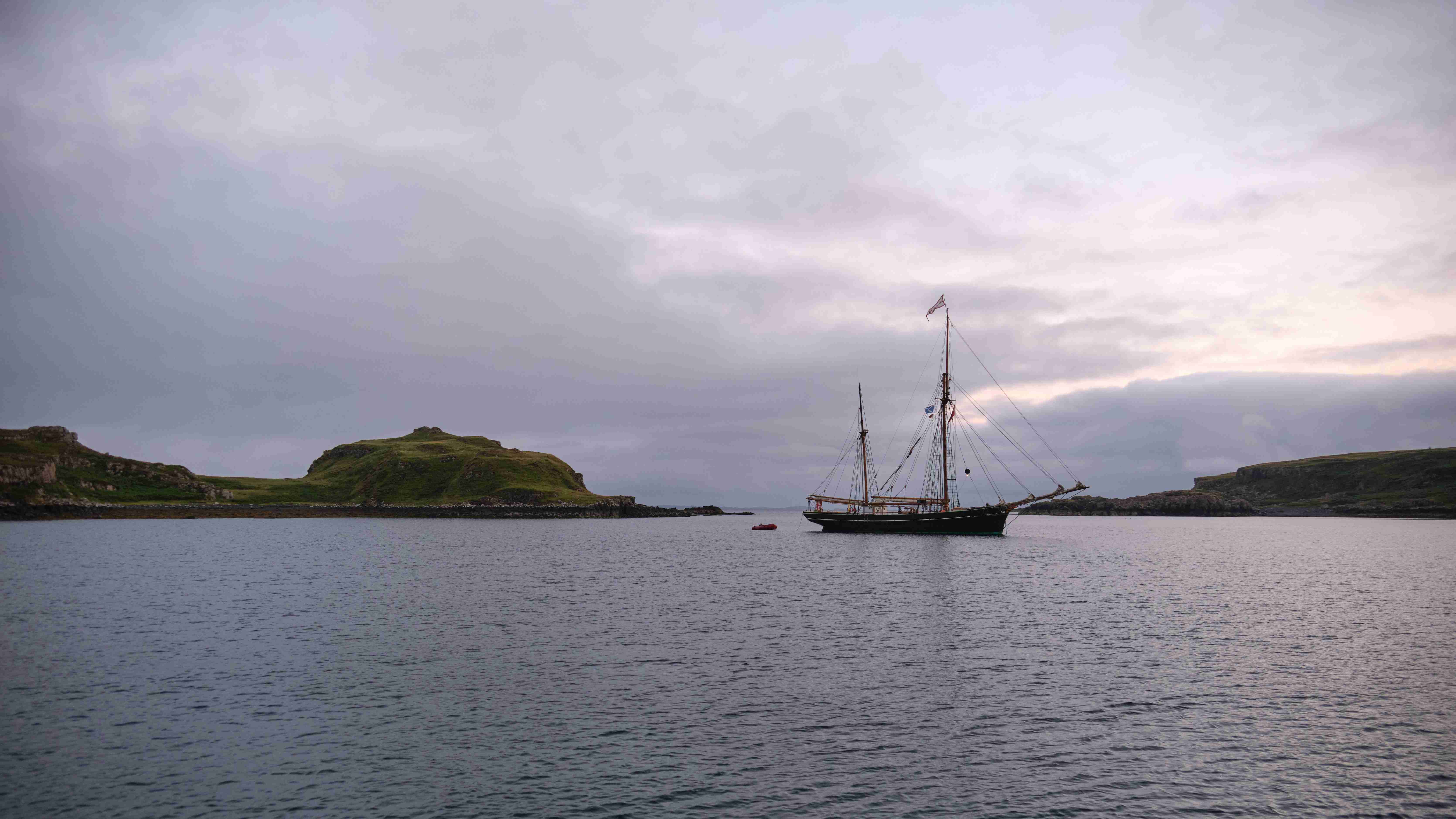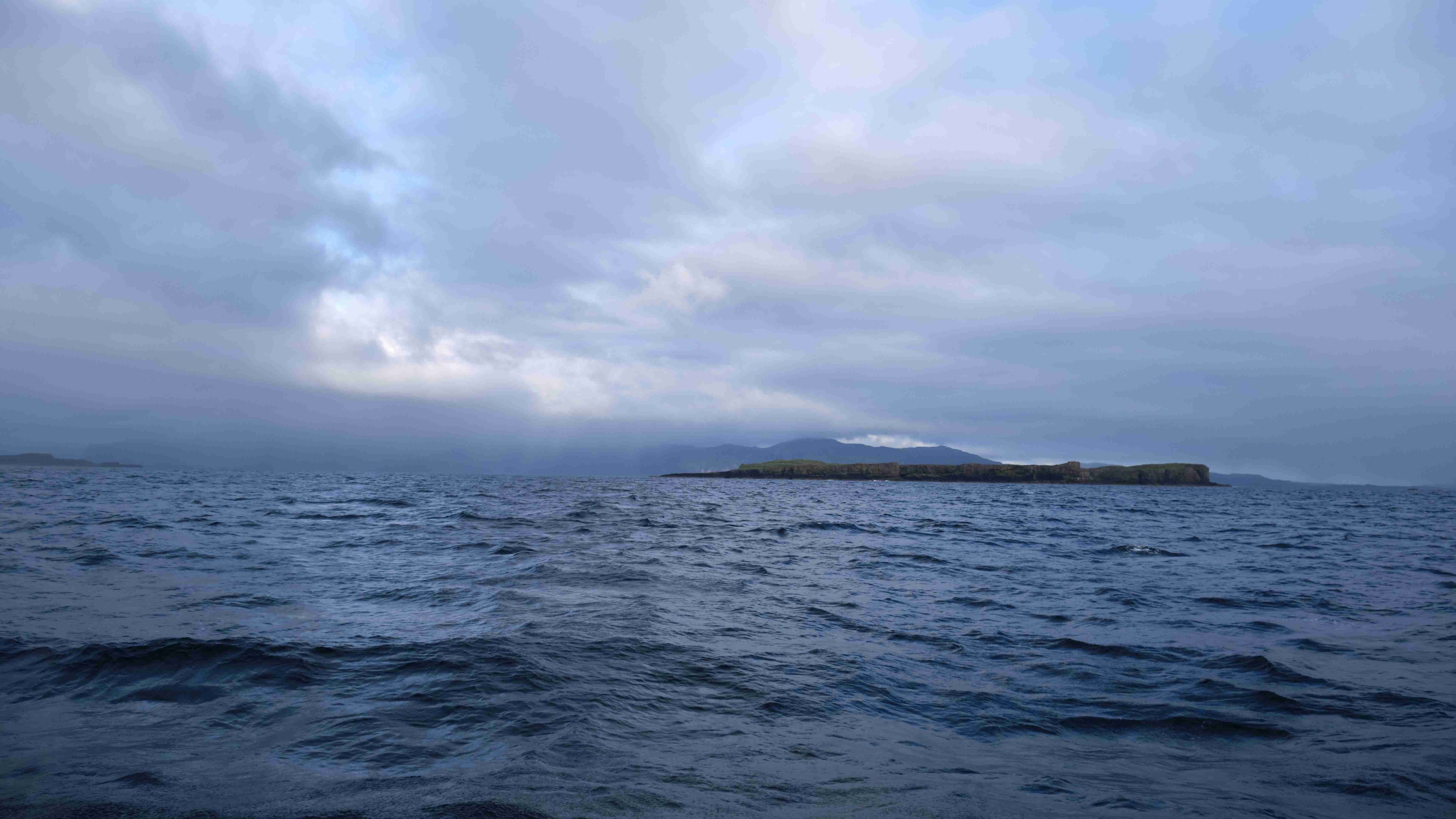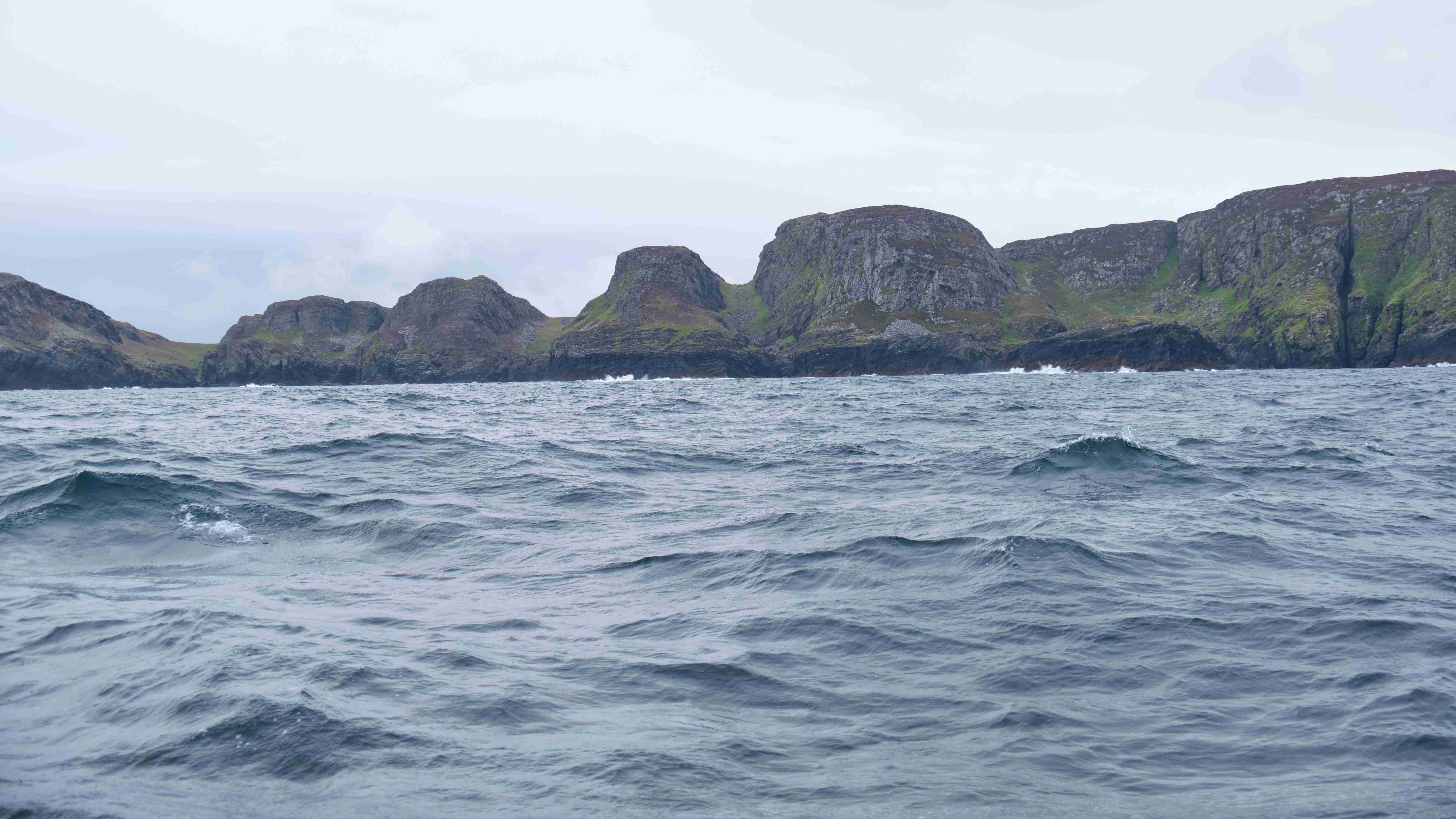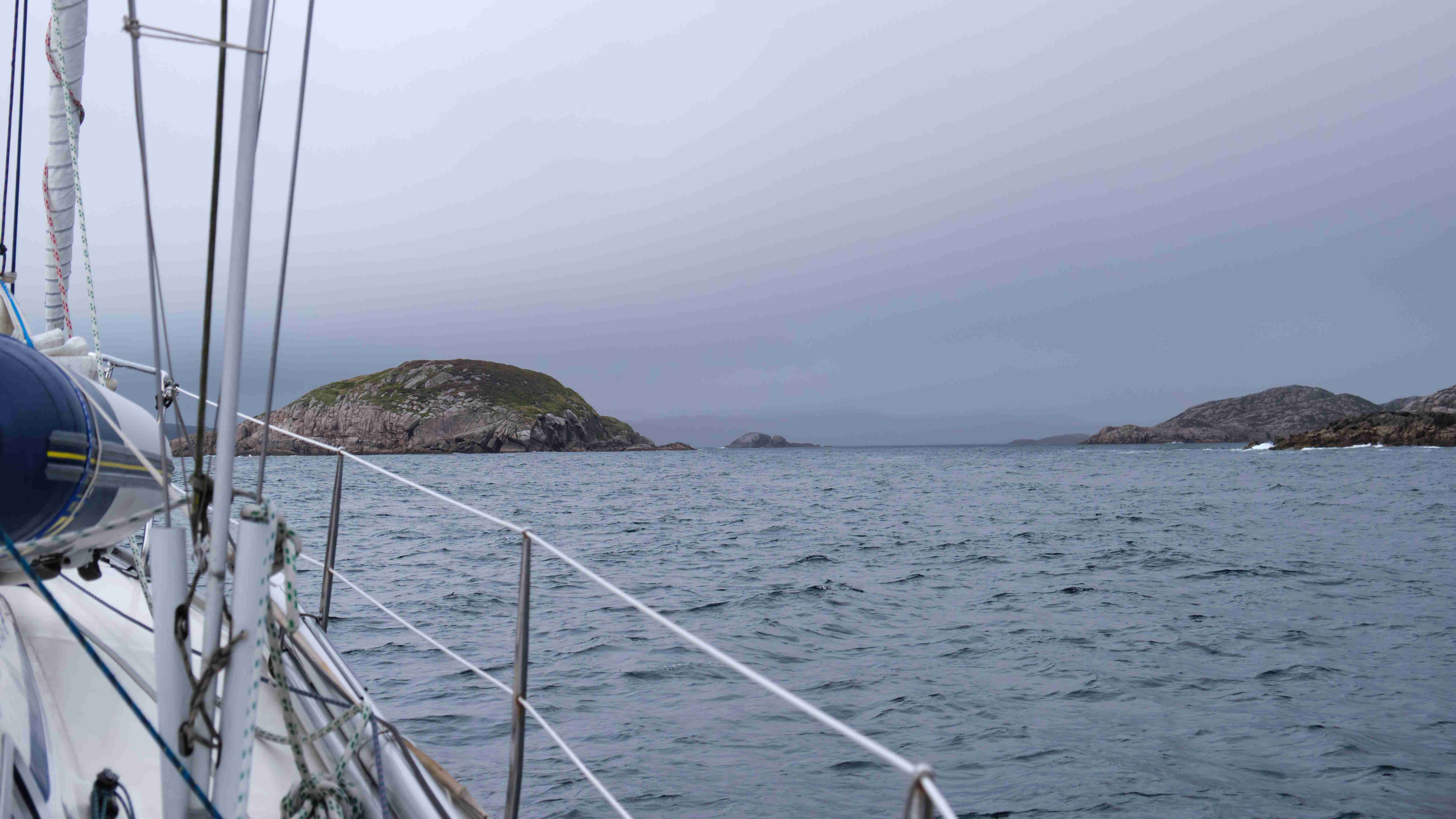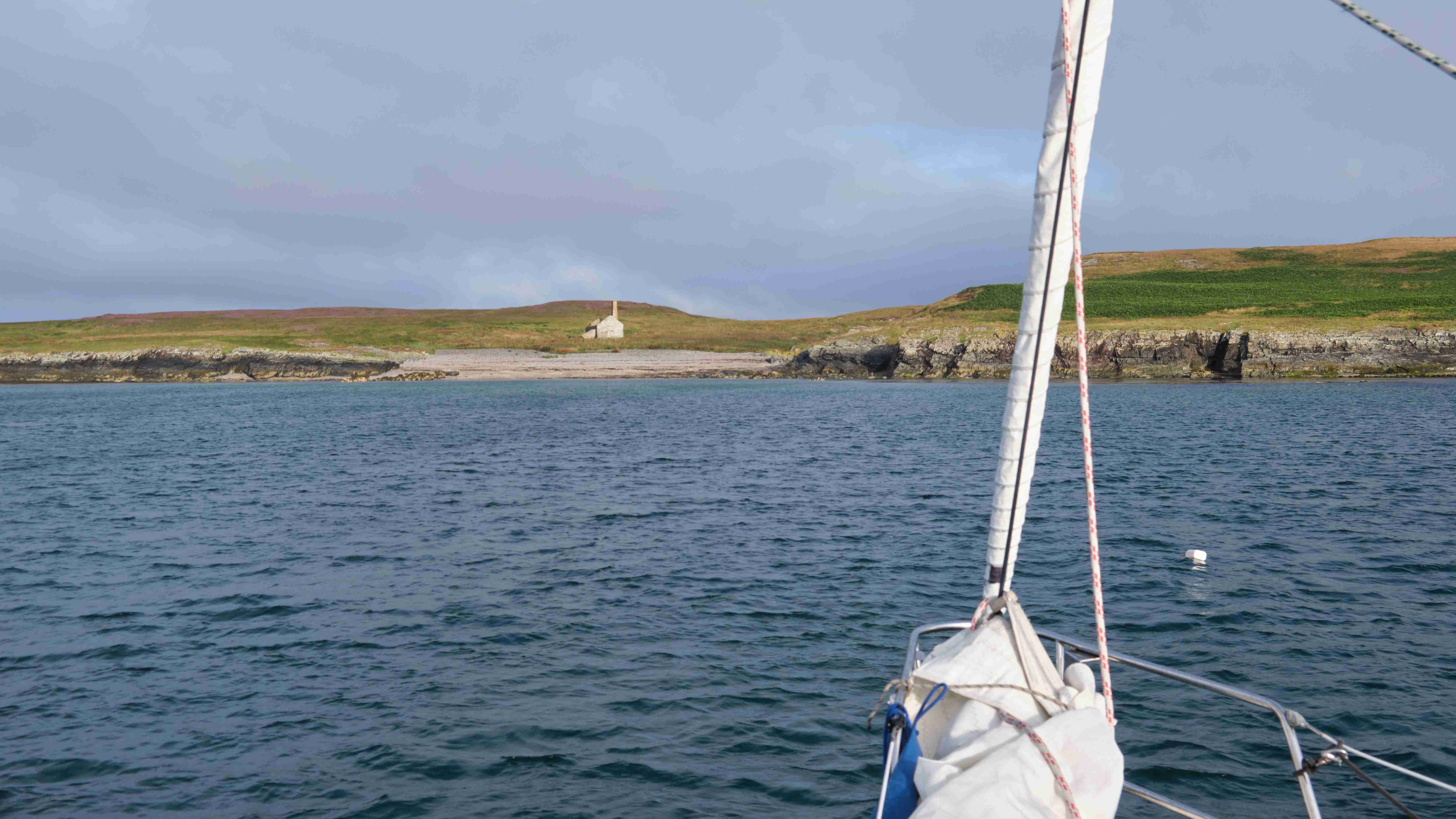 Am nächsten Morgen trennen sich unsere Wege auf Tory Island, Peter und seine irische Crew fährt weiter entlang der irischen Nordküste und für uns heißt es um 5 Uhr aufstehen, denn die Überfahrt nach Schottland steht an. Es weht ein kräftiger NW 5-6, der uns hilft, die 78 Seemeilen in 12,5 Stunden zu meistern. Eine starke Atlantikdünung begleitet uns auf unserem Weg, sodass wir am Abend, nachdem mehrere Schauer über uns hinweggezogen sind, doch sehr froh waren, die geschützte Bucht am Nordende von Islay zu erreichen. Wir ankern südöstlich der vorgelagerten kleinen Insel Nave und liegen in einer traumhaften Bucht nahe einer verfallenen Kapelle an Land. Wir verbringen einen gemütlichen Abend unter Deck, während sich draußen Regen, Nebelschwaden und Böen abwechseln. Wir beobachten die Robben, die neugierig zu uns Eindringlinge in die Einsamkeit geschwommen kommen.