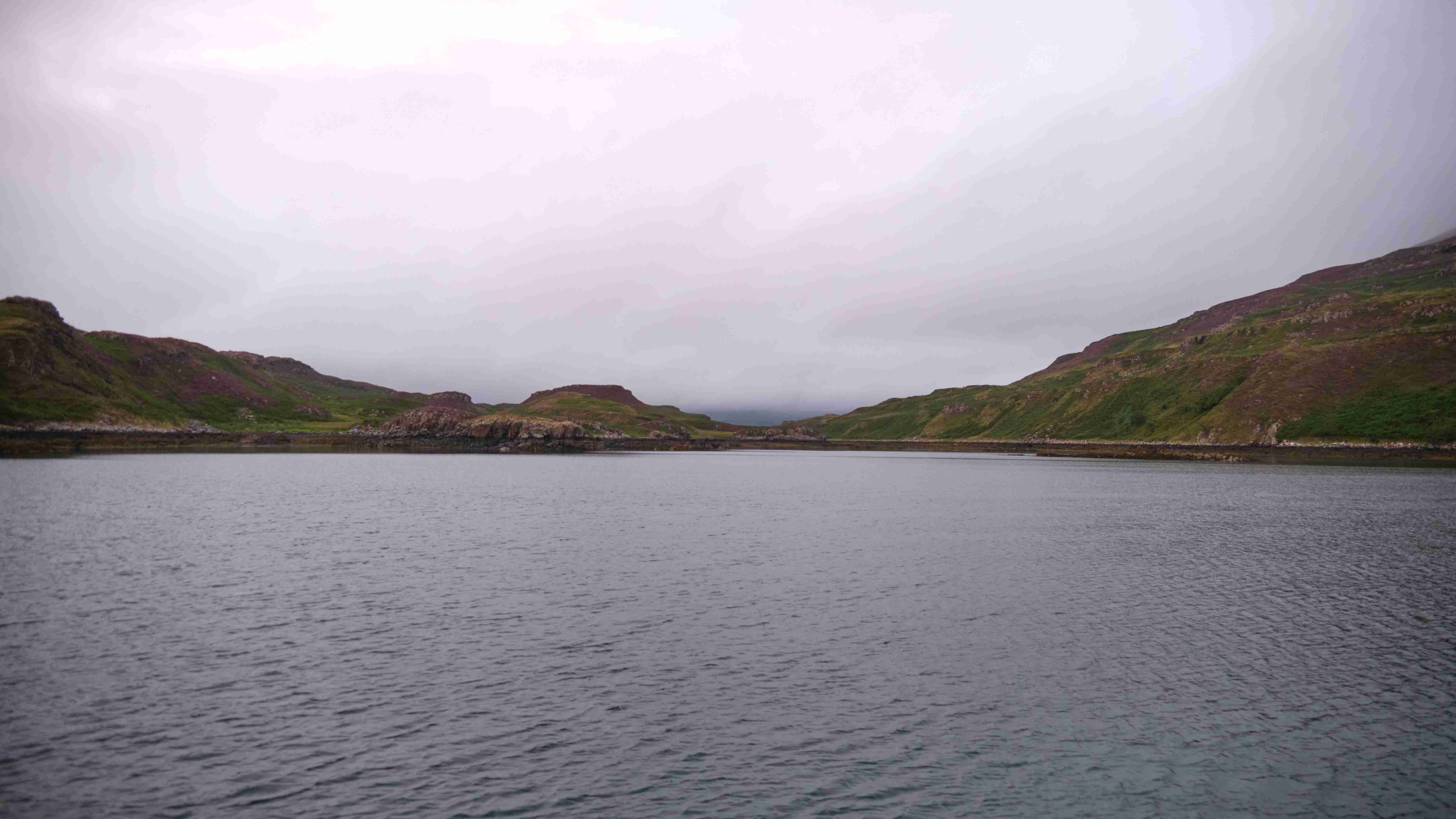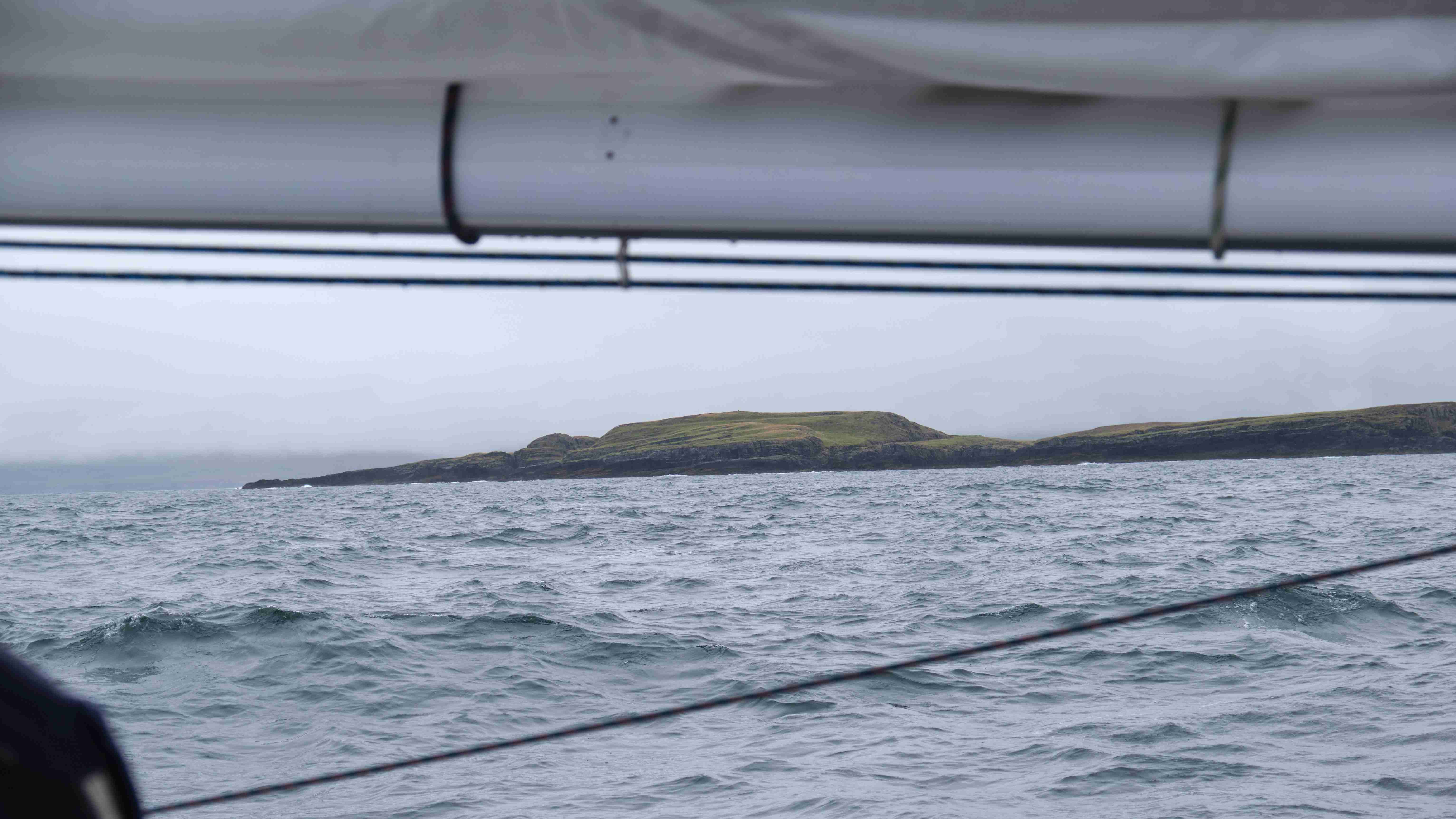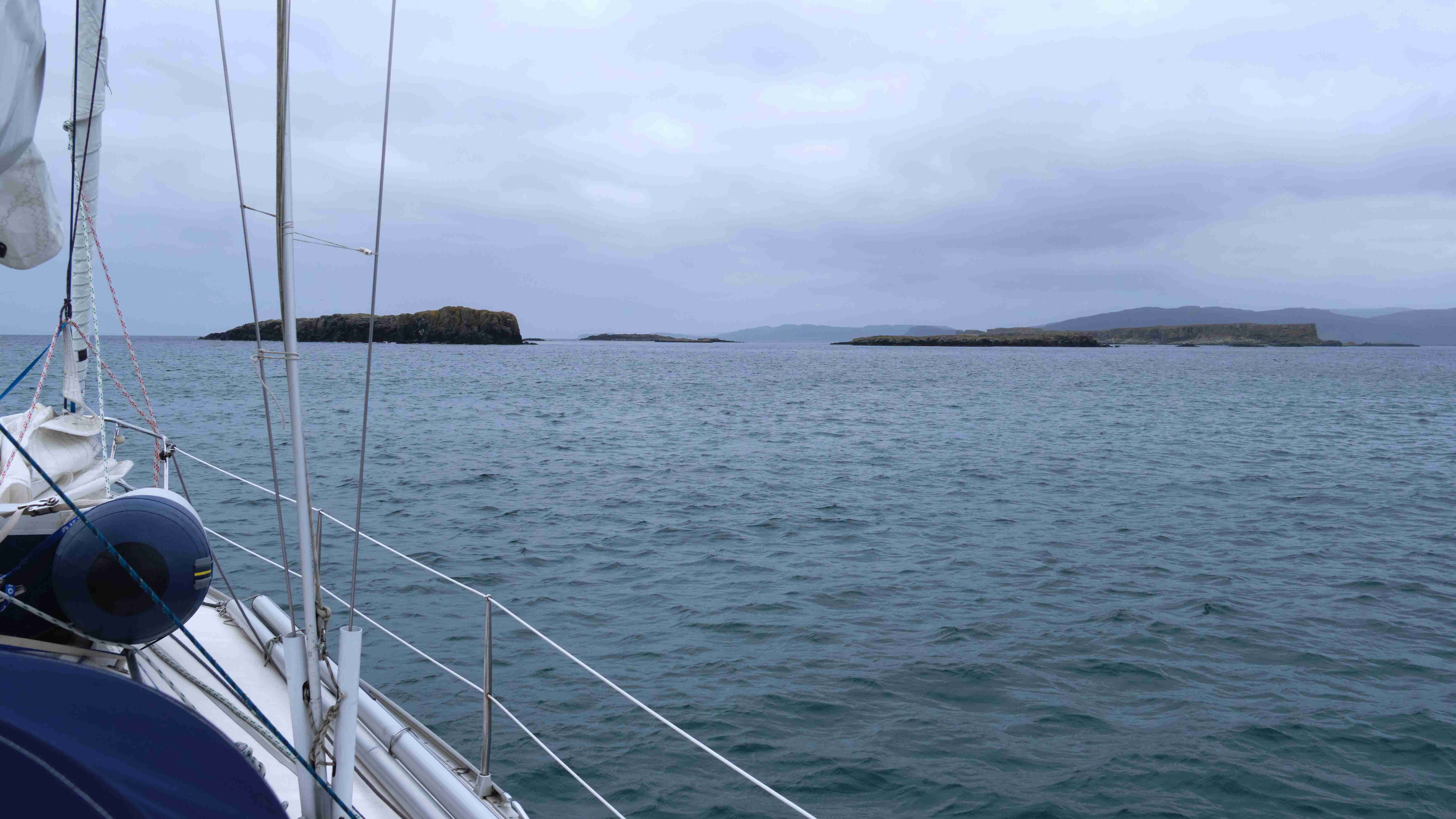 Uns wurde die kleine Insel Lunga als Vogelparadies empfohlen und wir nehmen uns diese Insel als Ziel vor. Leider müssen wir gegen den NW-Wind ankreuzen und kommen nicht schnell genug voran, um das Ziel vor dem Abend zu erreichen. So suchen wir uns die kleine Bucht Tinkers Hole als Zwischenziel aus. Wir erreichen die Insel Erraid auch und schlüpfen durch die sehr enge spannende Einfahrt an der Südostecke hinein in die kleine Passage zur Insel En Dubh, um dann leider festzustellen, dass der Abstand zwischen den Felswänden so eng ist, dass der Kreis zum Schwojen nicht ausreichen würde. Schweren Herzens treten wir den Rückzug an und müssen weitersegeln, obwohl ich keine Lust mehr habe, dieser Tag ist nicht mein Tag.