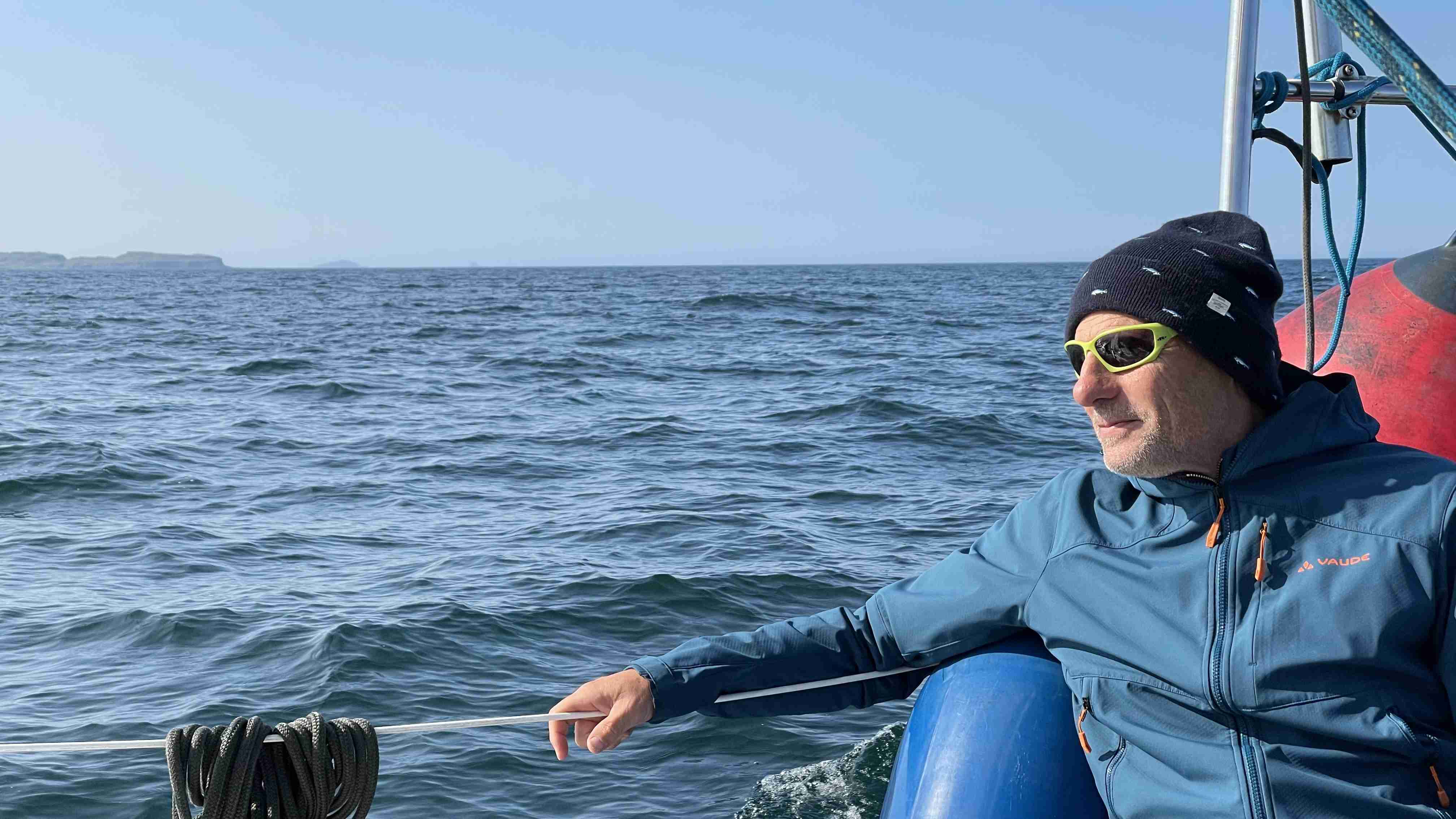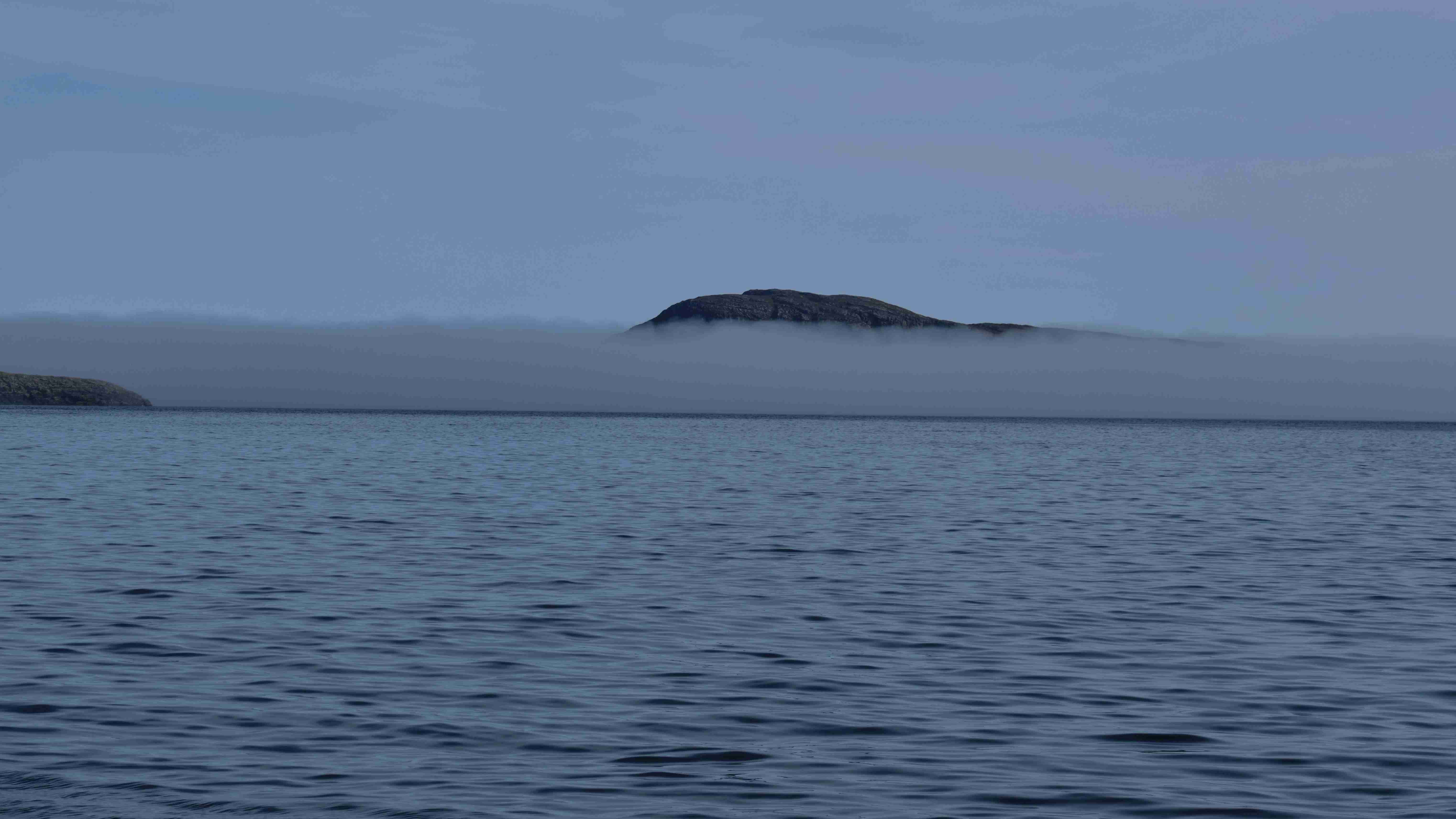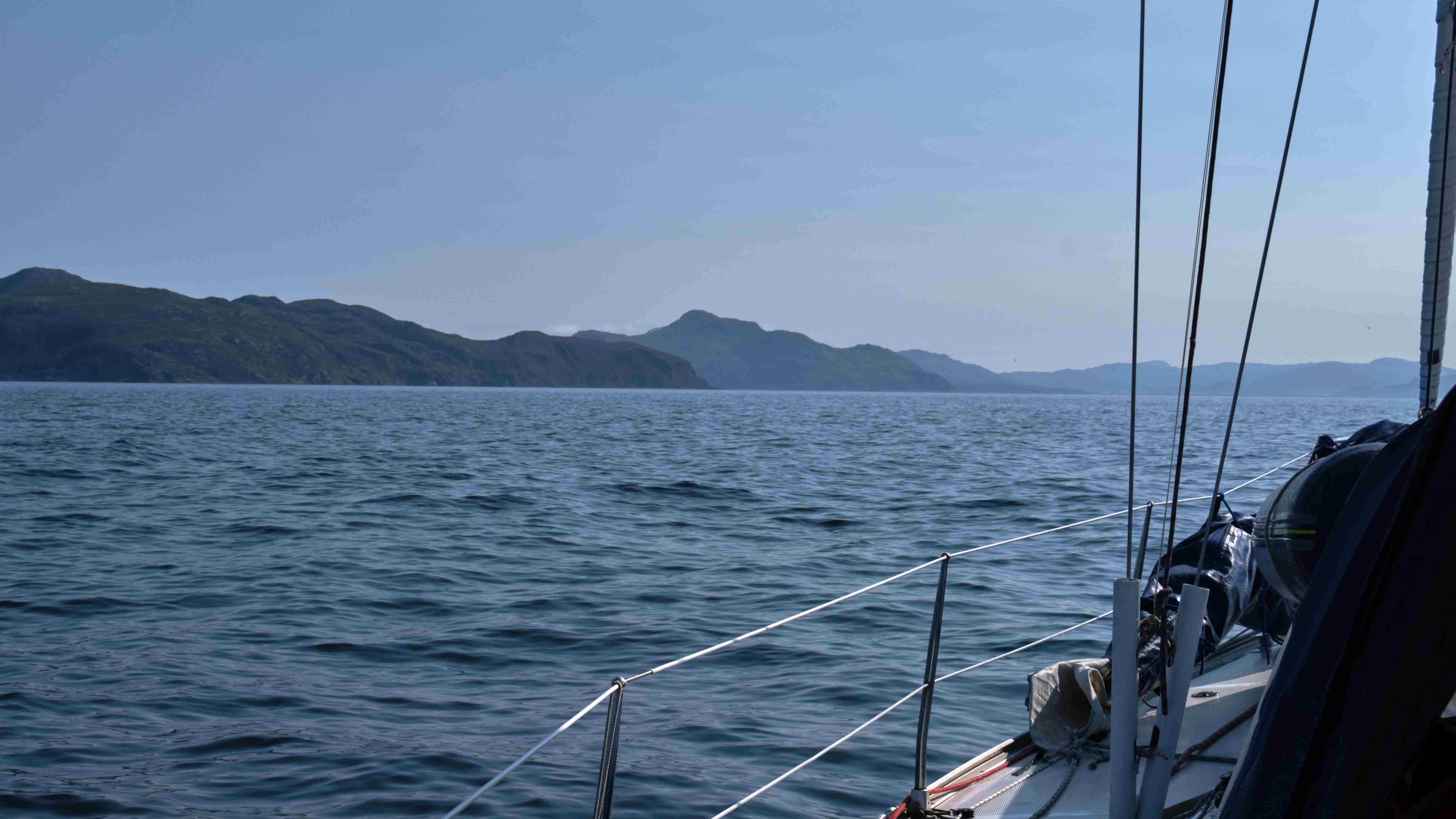 Till und Sophia sind schweren Herzens nach zwei guten Wochen von Bord gegangen; wir kamen trotz mehrerer Starkwindsituationen gut voran und konnten den Rückstand von Galway wieder aufholen. Stefan und Fernando, der sich kurzentschlossen entschieden hatte, kommen zur letzten Etappe an Bord nach Barra, wir haben einen schönen ersten Abend im gleichen Restaurant und am nächsten Morgen geht es los. Wir haben ein wunderschönes Sommerwetter, ein kräftiges Hoch bildet sich über Großbritannien und blockiert die nachziehenden Tiefs. Der Nebeneffekt bedeutet aber eine Schwachwindperiode von mindestens drei Tagen, in denen Segeln fast unmöglich ist. Nach dem Ablegen in Castlebay können wir mit einer schönen Seebrise aus der Bucht kreuzen, müssen dann aber auf offener See den Motor starten und werden von aufziehendem Seenebel verschluckt. Gespenstig und schemenhaft tauchen Inseln daraus hervor.