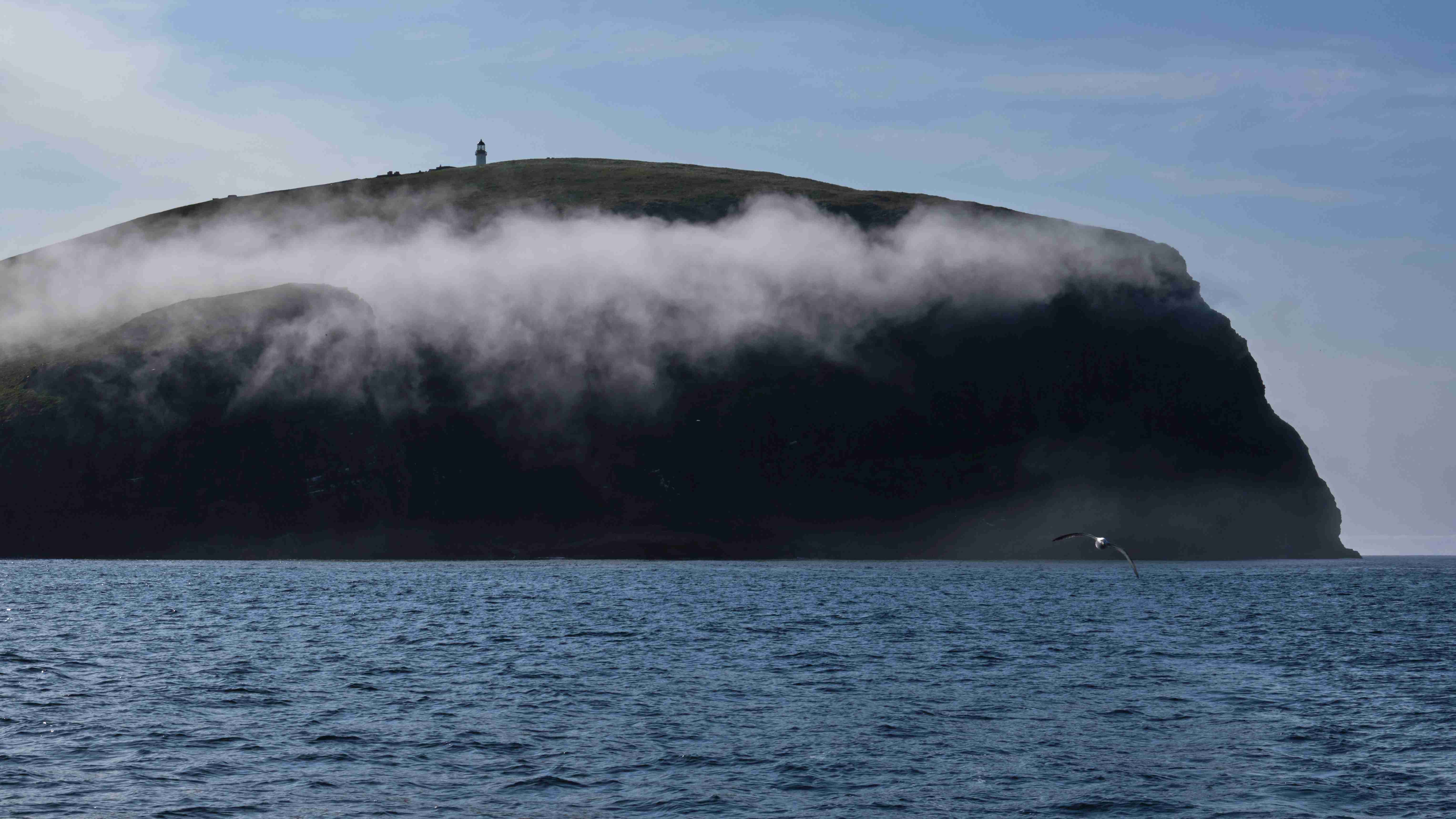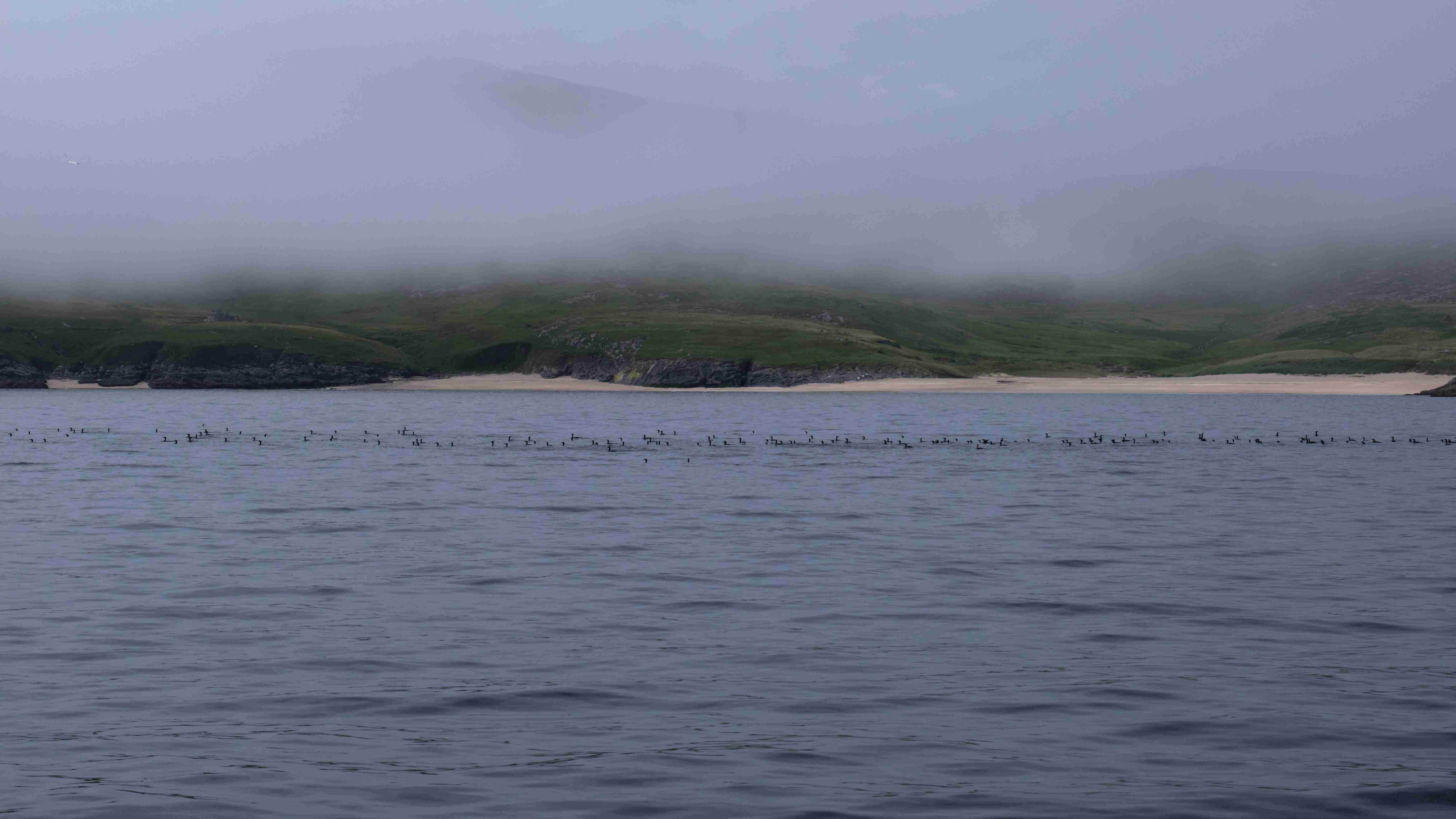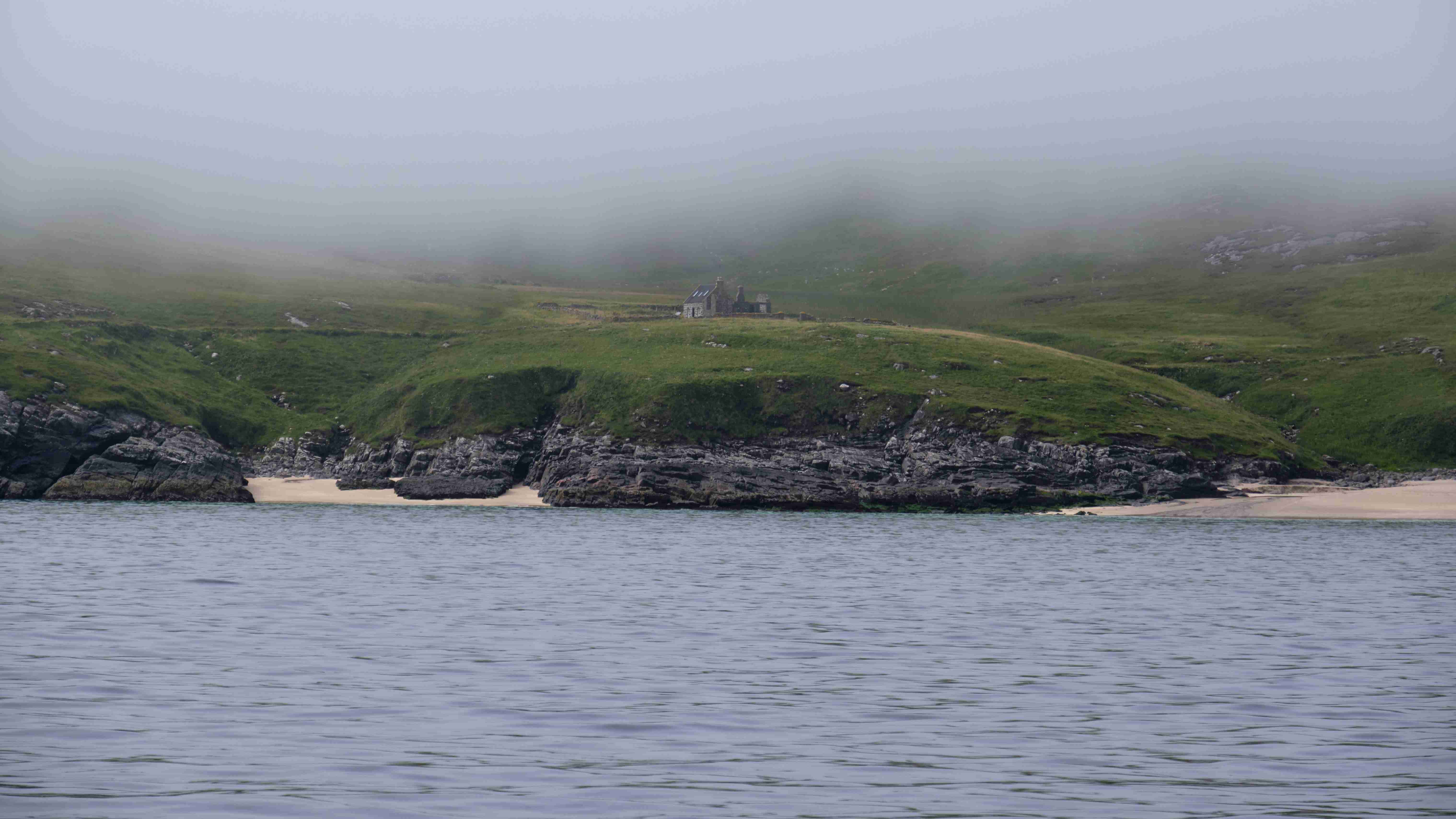 Am nächsten Morgen motoren wir, da nach wie vor kein Wind weht, durch den Sound of Berneray, der südlichsten Insel der Äußeren Hebriden. Mystisch liegt weit über uns der Leuchtturm. Die Klippen sind spektakulär und wir sehen nun die Klippen von gestern in der umgekehrten Perspektive. Dann verschwinden die Klippen im dichten Seenebel, der vom kalten Atlantik herüber quillt. Wir motoren durch den Nebel und sehen die weiteren Klippen nur ab und zu in einer Lücke. Wir legen uns in die Vatersay Bay direkt vor den ½ km langen Sandstrand und haben einen wunderschönen Sommerabend.