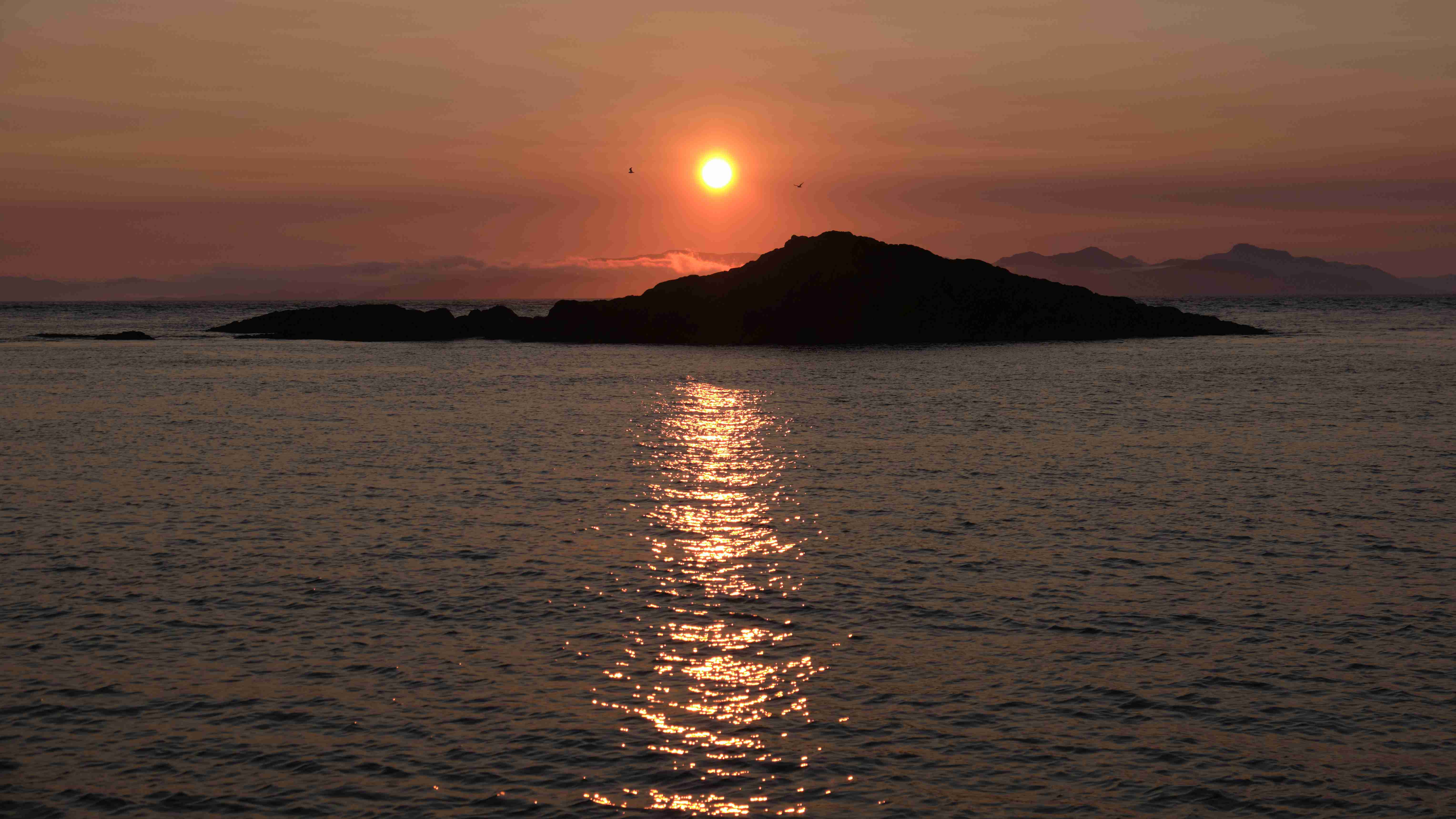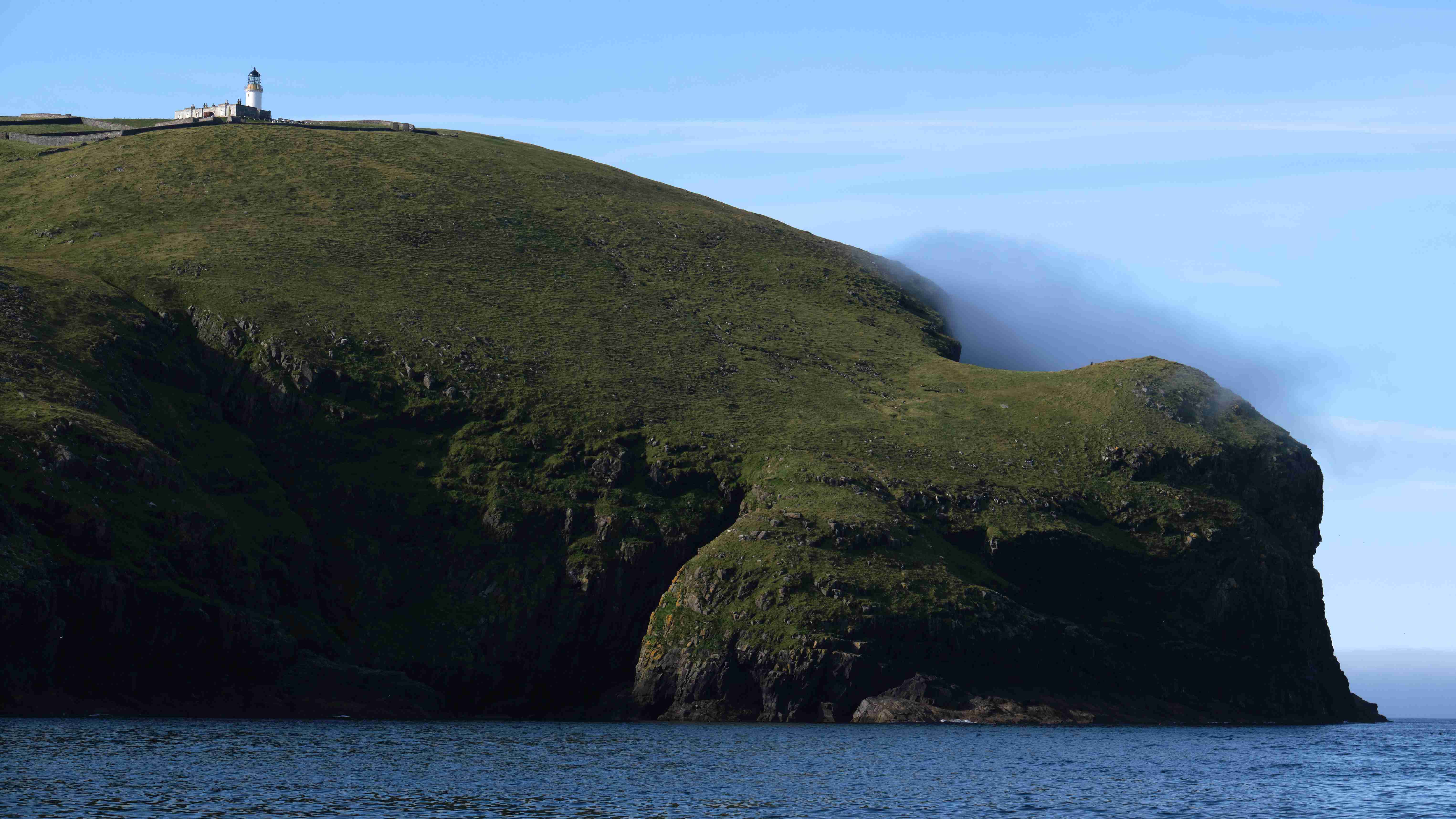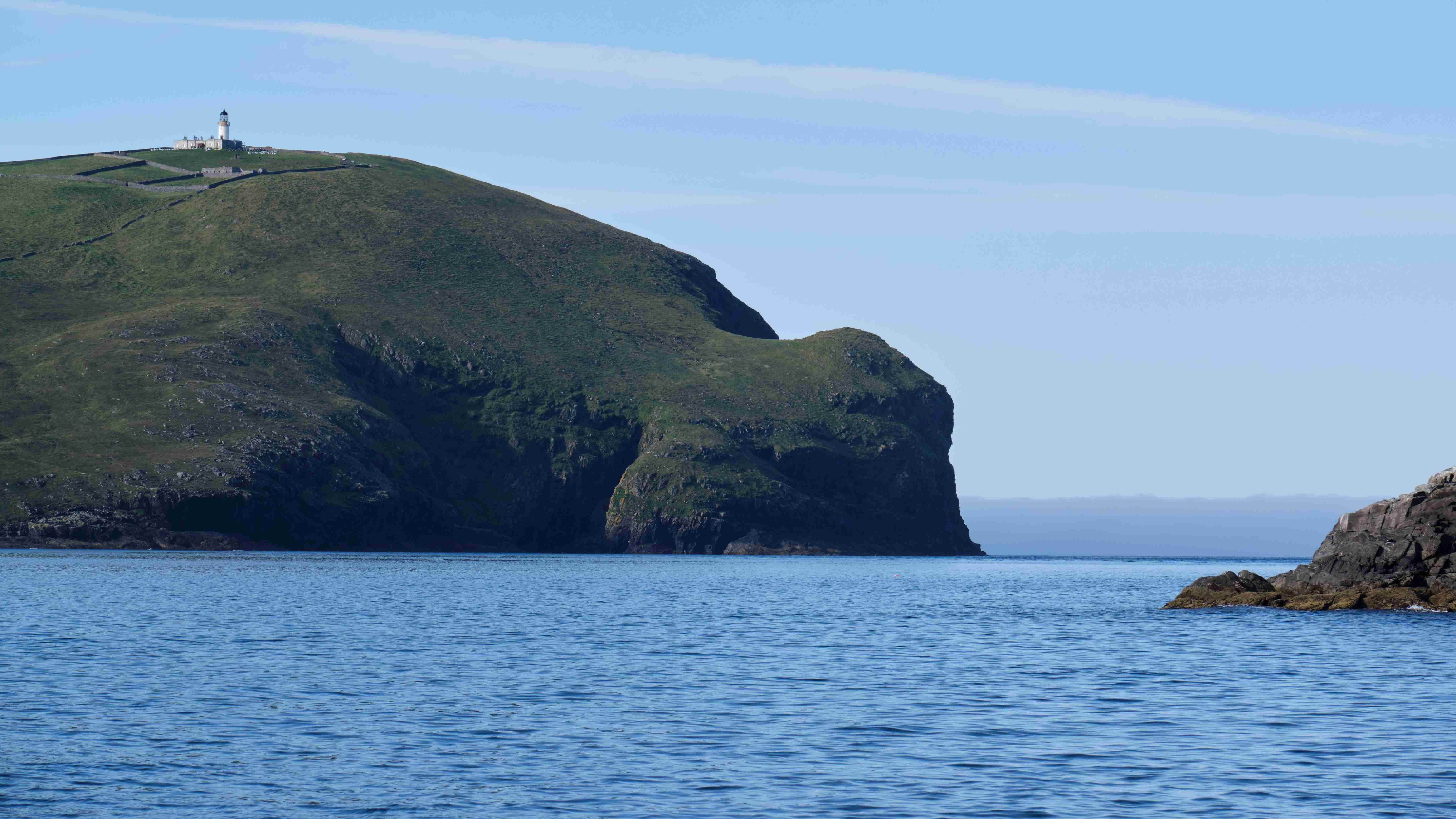 Am nächsten Morgen motoren wir, da nach wie vor kein Wind weht, durch den Sound of Berneray, der südlichsten Insel der Äußeren Hebriden. Mystisch liegt weit über uns der Leuchtturm. Die Klippen sind spektakulär und wir sehen nun die Klippen von gestern in der umgekehrten Perspektive. Dann verschwinden die Klippen im dichten Seenebel, der vom kalten Atlantik herüber quillt. Wir motoren durch den Nebel und sehen die weiteren Klippen nur ab und zu in einer Lücke. Wir legen uns in die Vatersay Bay direkt vor den ½ km langen Sandstrand und haben einen wunderschönen Sommerabend.