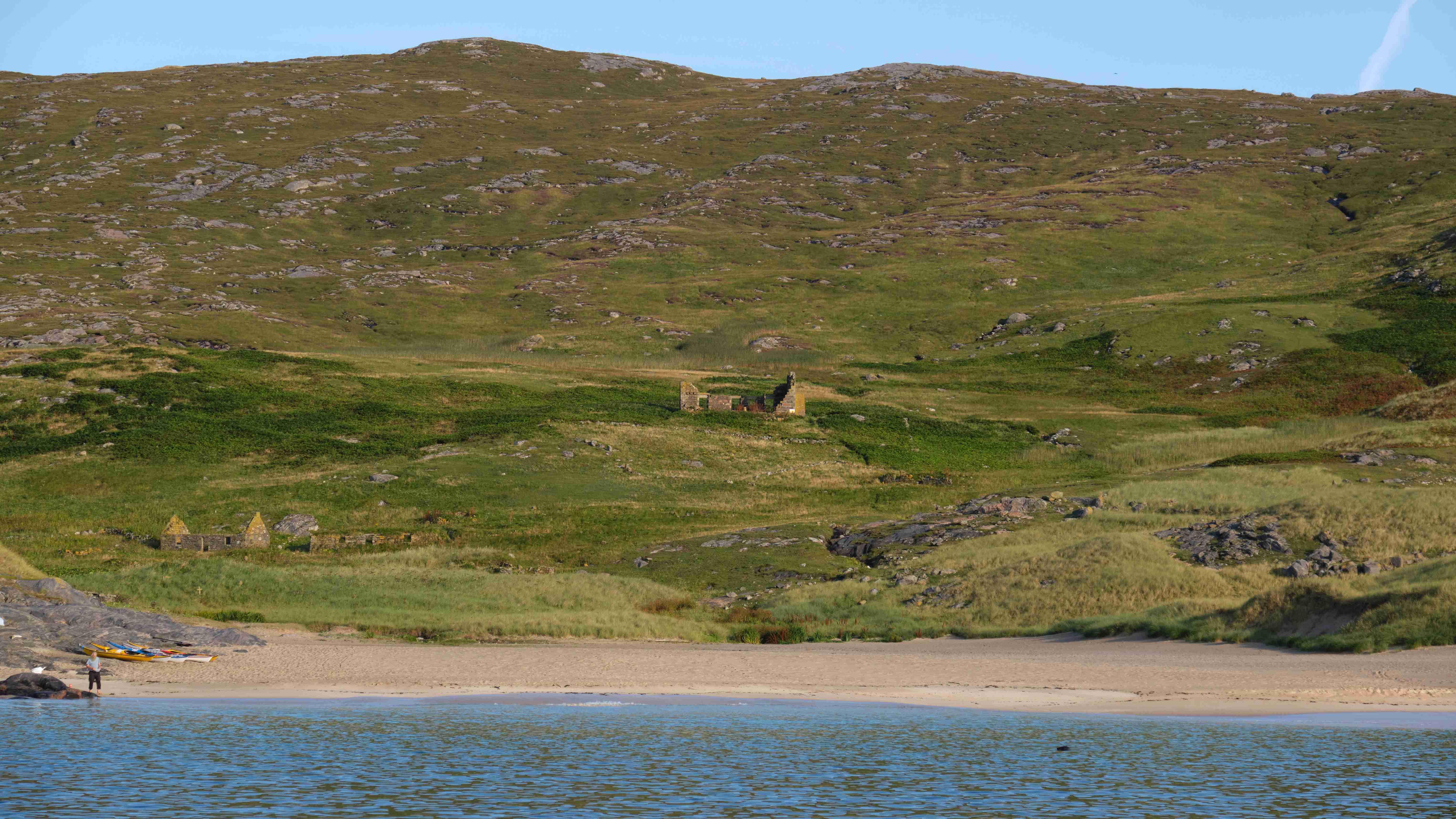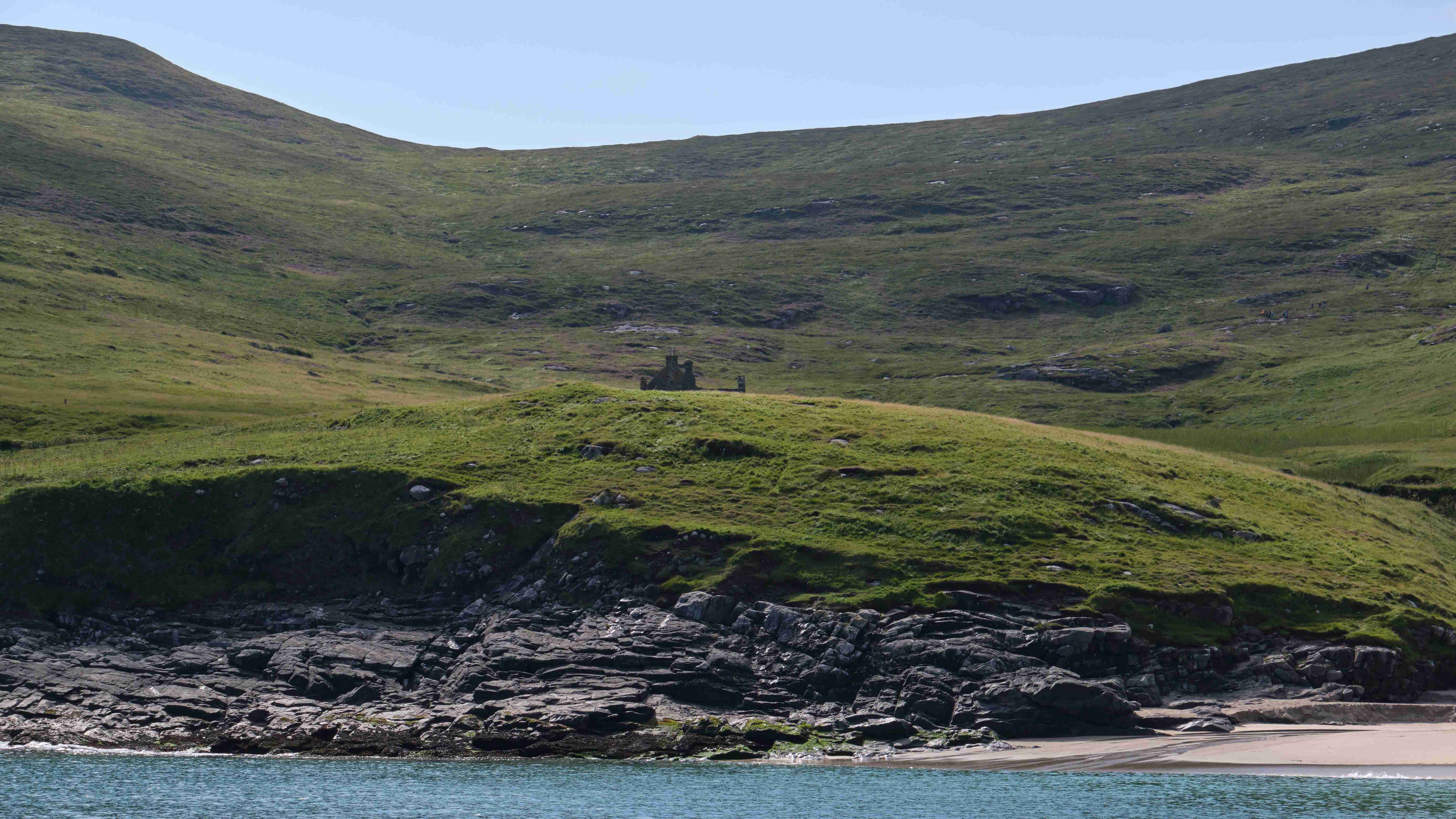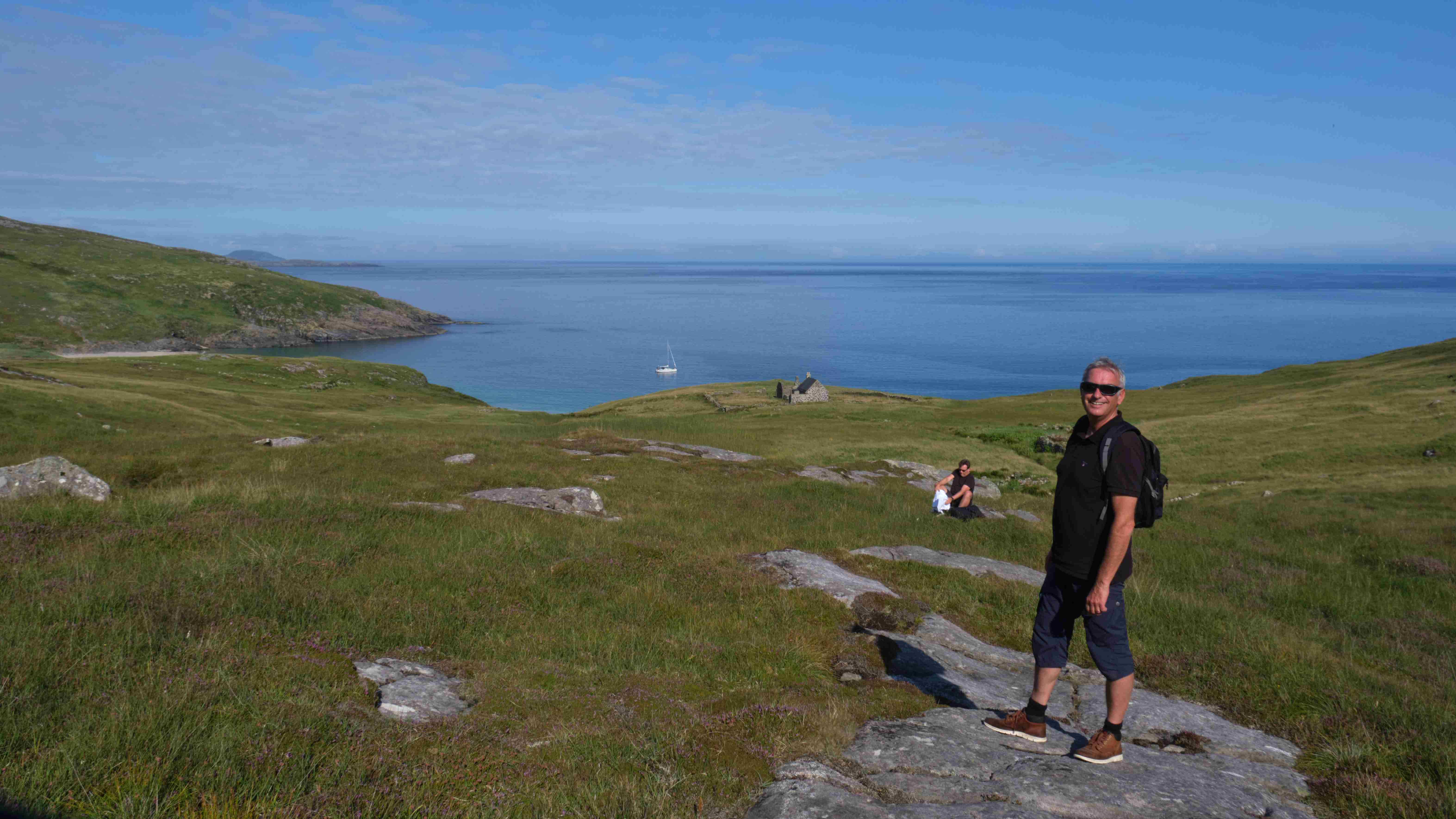 Ziel ist ein Tipp von einem Einheimischen: Mingulay, die zweitsüdliche Insel der Äußeren-Hebriden Kette. Die Geschichte der Insel passt zu der von der Insel St. Kilda, die weit außen im Atlantik liegt. Das kleine Dorf an der Mingulay Bay auf der Ostseite wurde 1912 aufgegeben, da sich die Bewirtschaftung nicht mehr rentierte. Wir besichtigen das ehemalige Schulgebäude, das 1881 für 494 Pfund erbaut worden war und in dem bis 1910 bis zu 48 Schüler unterrichtet wurden. In dem Buch „The Scottish Islands“ von Haswell-Smith lesen wir, dass der Sammler Macphee hier anlandete und seiner Crew im Ruderboot zurief, dass alle Einwohner an der Pest gestorben seien. Daraufhin flüchteten die Ruderer ohne ihn und ließen ihn auf der Insel in seinem Schicksal zurück. Er musste ein Jahr auf der Insel ausharren und hatte lediglich die Pestleichen um sich, bis er gerettet wurde, heute ist ein Berg nach ihm auf der Insel benannt.