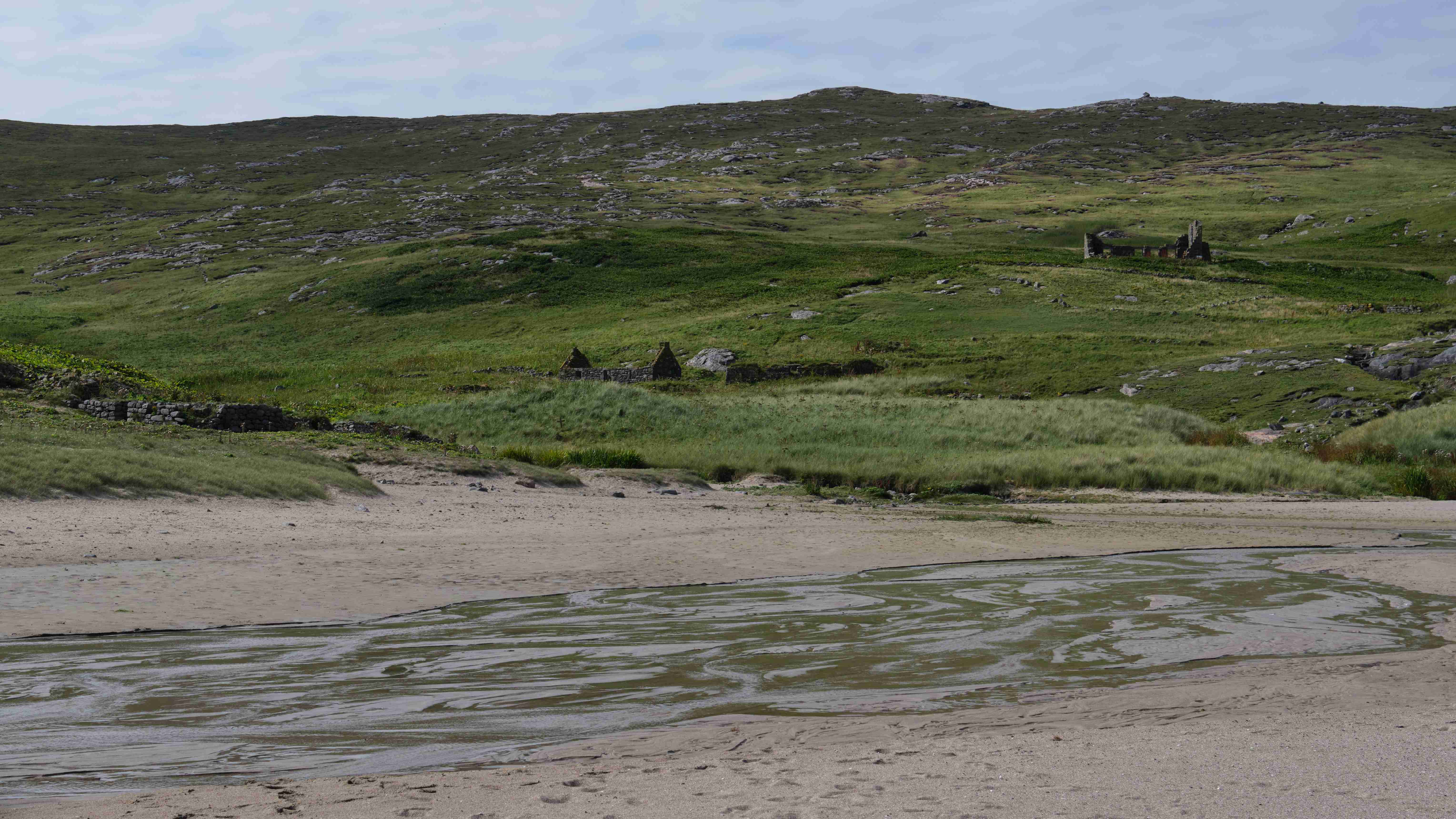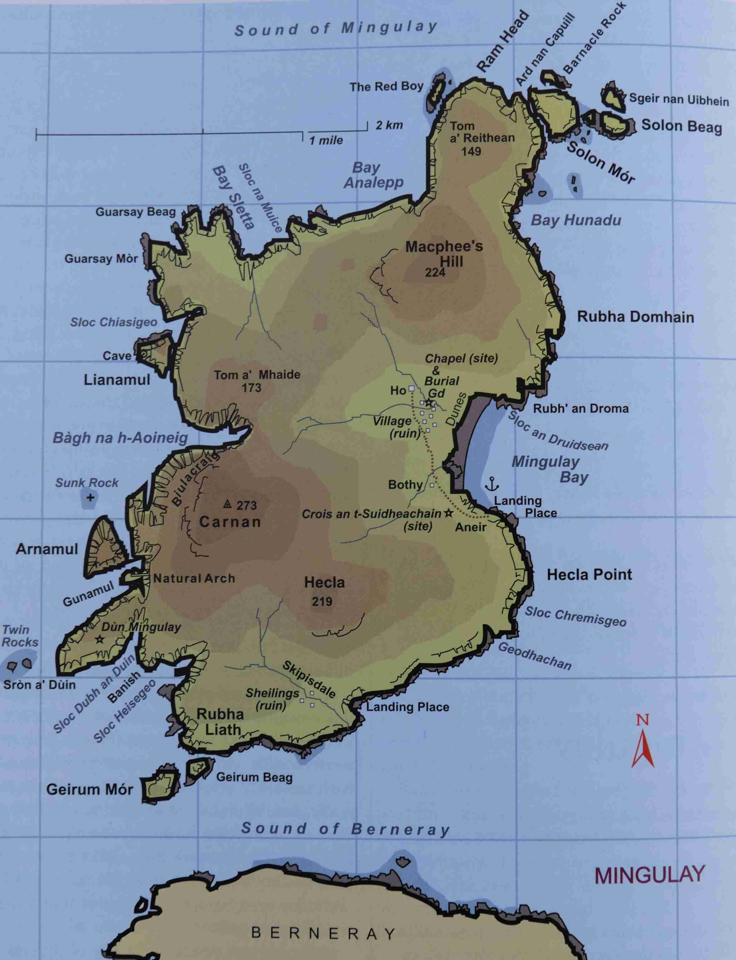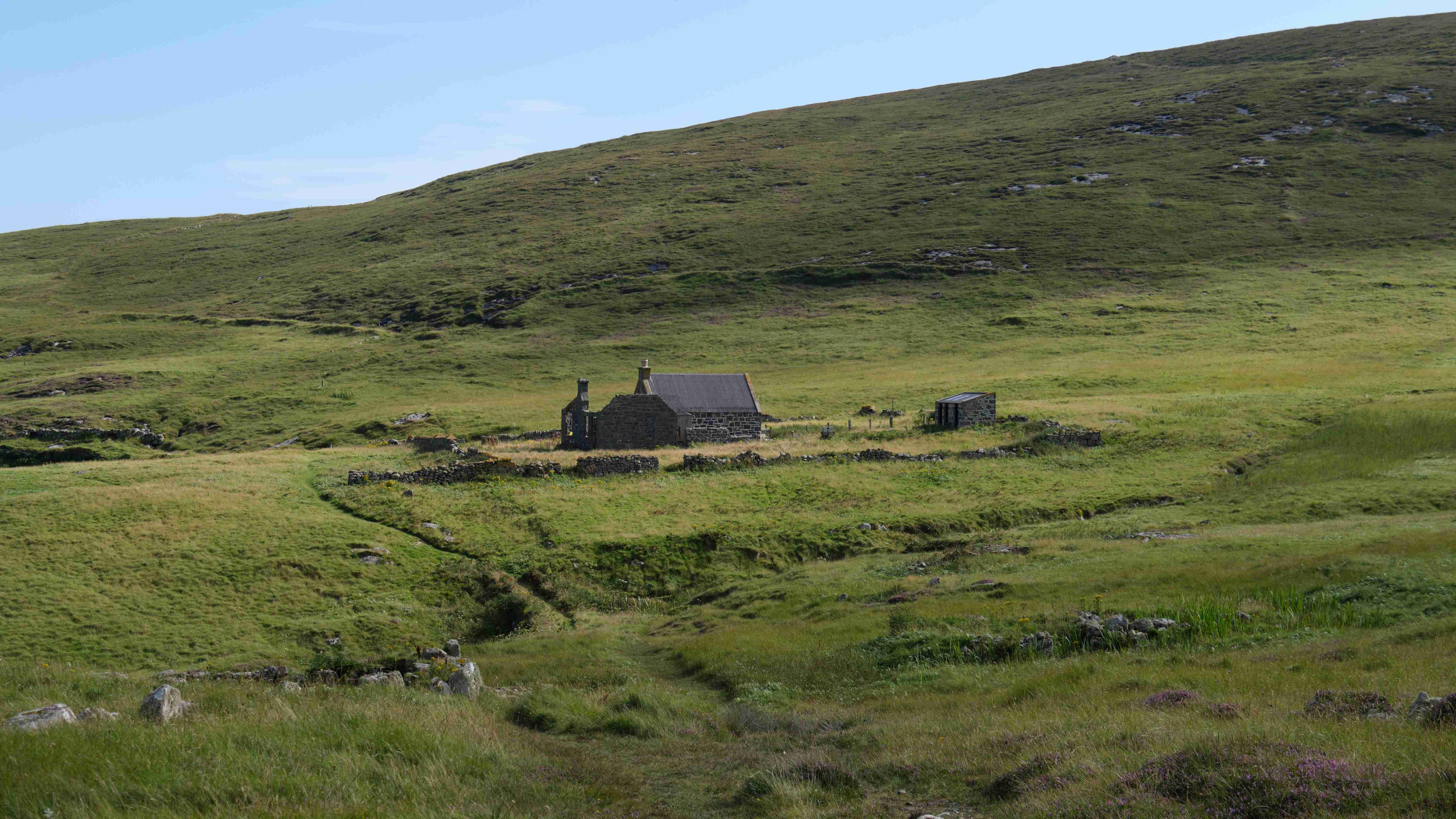 Ziel ist ein Tipp von einem Einheimischen: Mingulay, die zweitsüdliche Insel der Äußeren-Hebriden Kette. Die Geschichte der Insel passt zu der von der Insel St. Kilda, die weit außen im Atlantik liegt. Das kleine Dorf an der Mingulay Bay auf der Ostseite wurde 1912 aufgegeben, da sich die Bewirtschaftung nicht mehr rentierte. Wir besichtigen das ehemalige Schulgebäude, das 1881 für 494 Pfund erbaut worden war und in dem bis 1910 bis zu 48 Schüler unterrichtet wurden. In dem Buch „The Scottish Islands“ von Haswell-Smith lesen wir, dass der Sammler Macphee hier anlandete und seiner Crew im Ruderboot zurief, dass alle Einwohner an der Pest gestorben seien. Daraufhin flüchteten die Ruderer ohne ihn und ließen ihn auf der Insel in seinem Schicksal zurück. Er musste ein Jahr auf der Insel ausharren und hatte lediglich die Pestleichen um sich, bis er gerettet wurde, heute ist ein Berg nach ihm auf der Insel benannt.