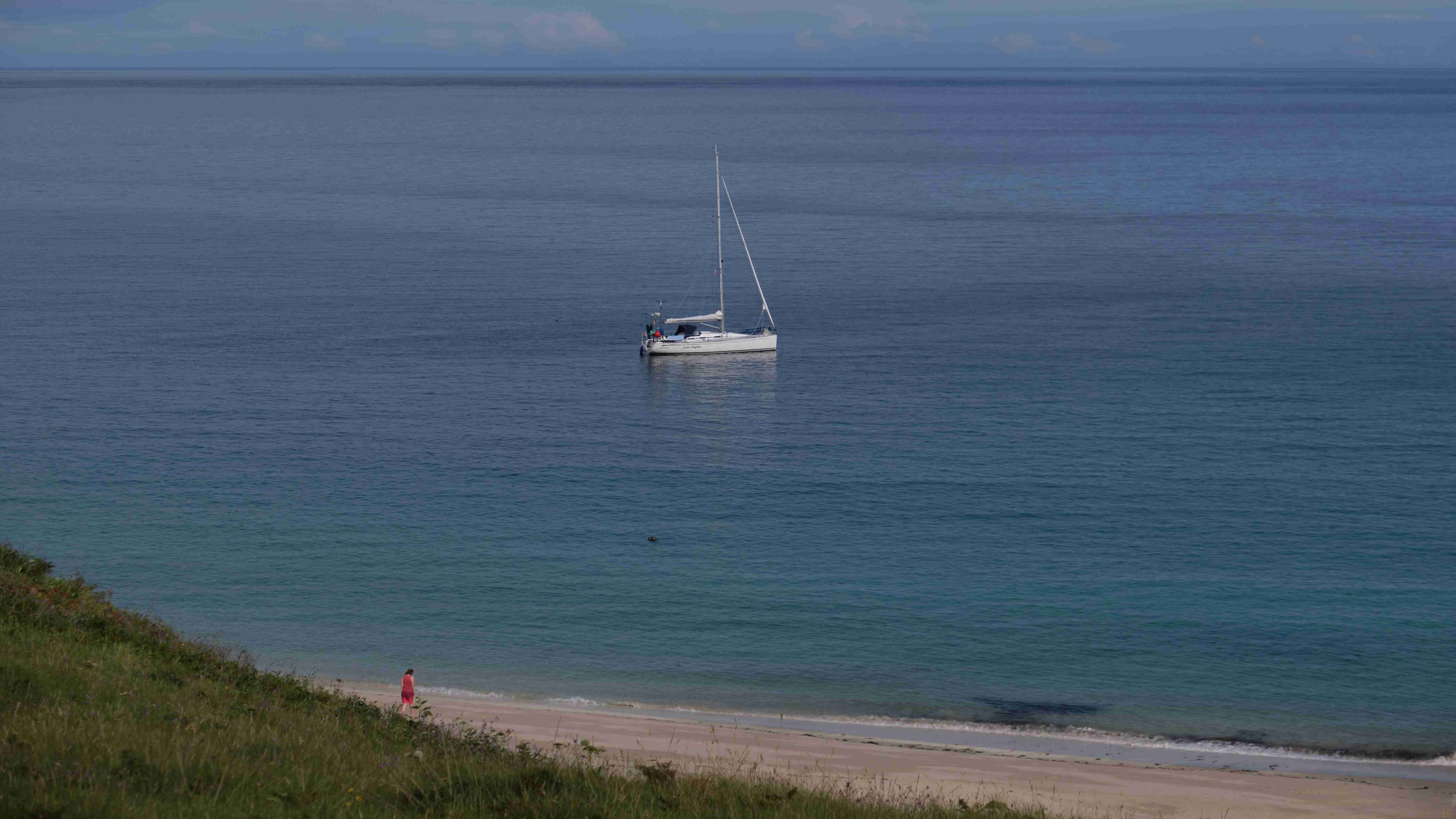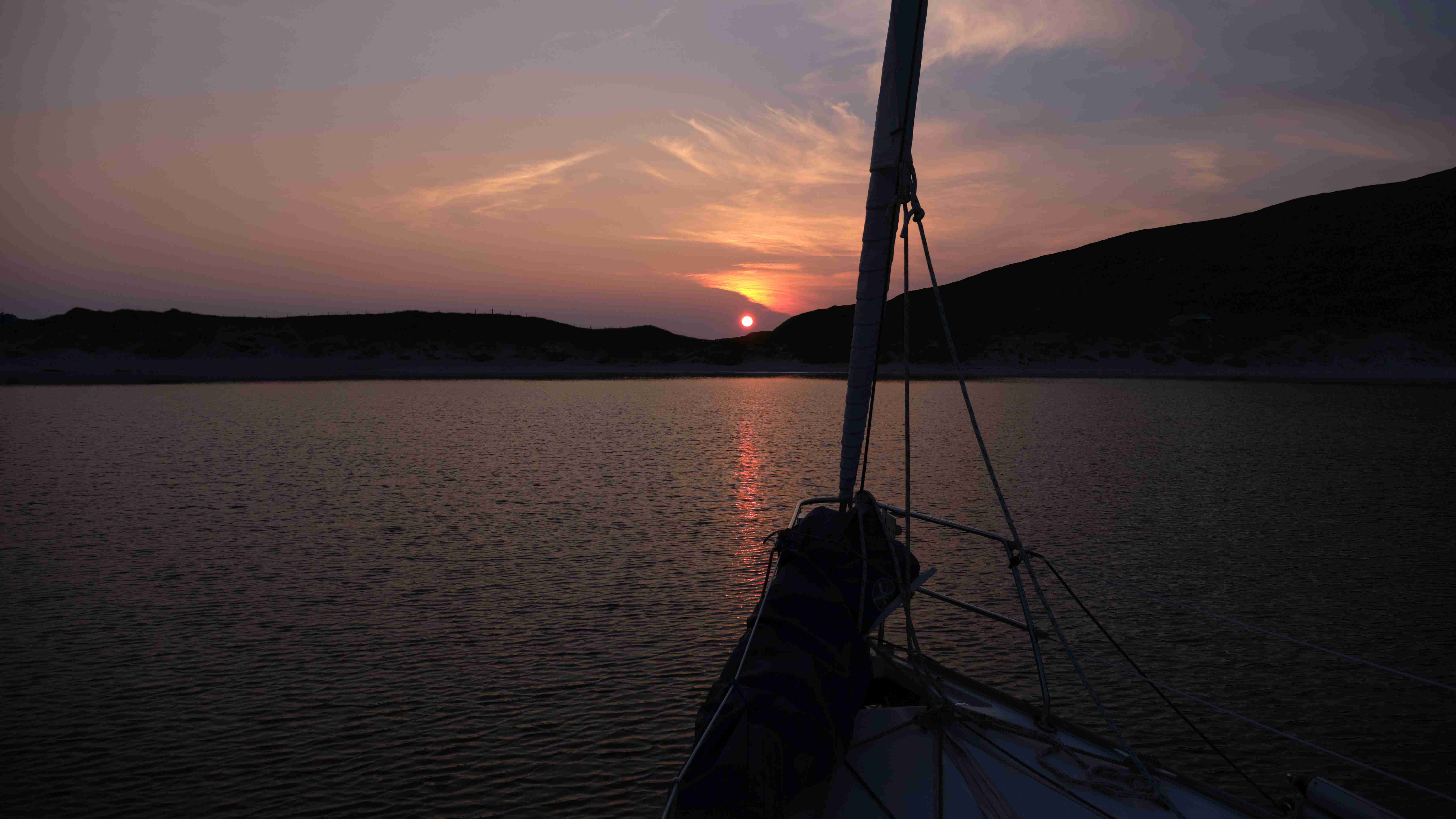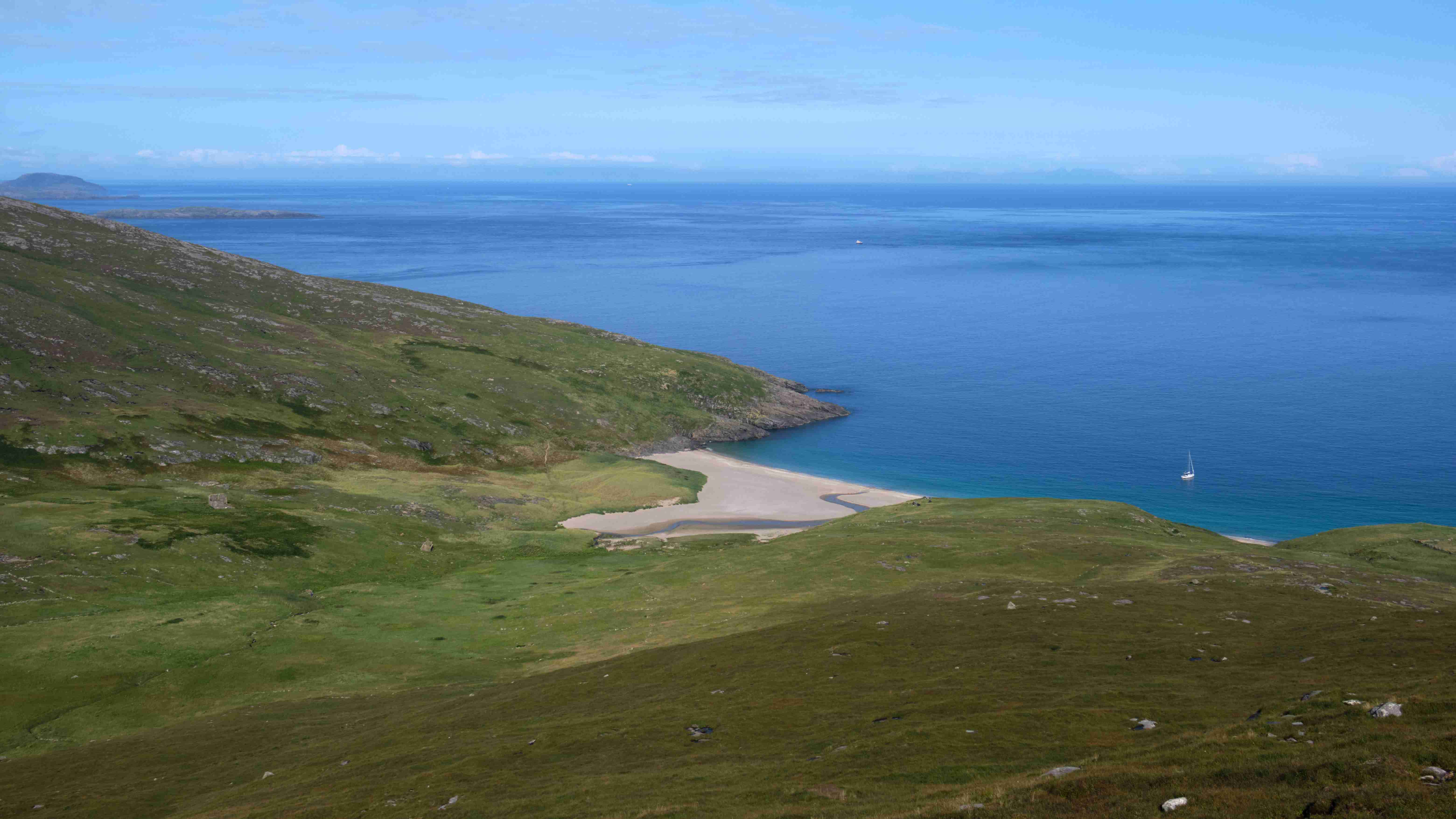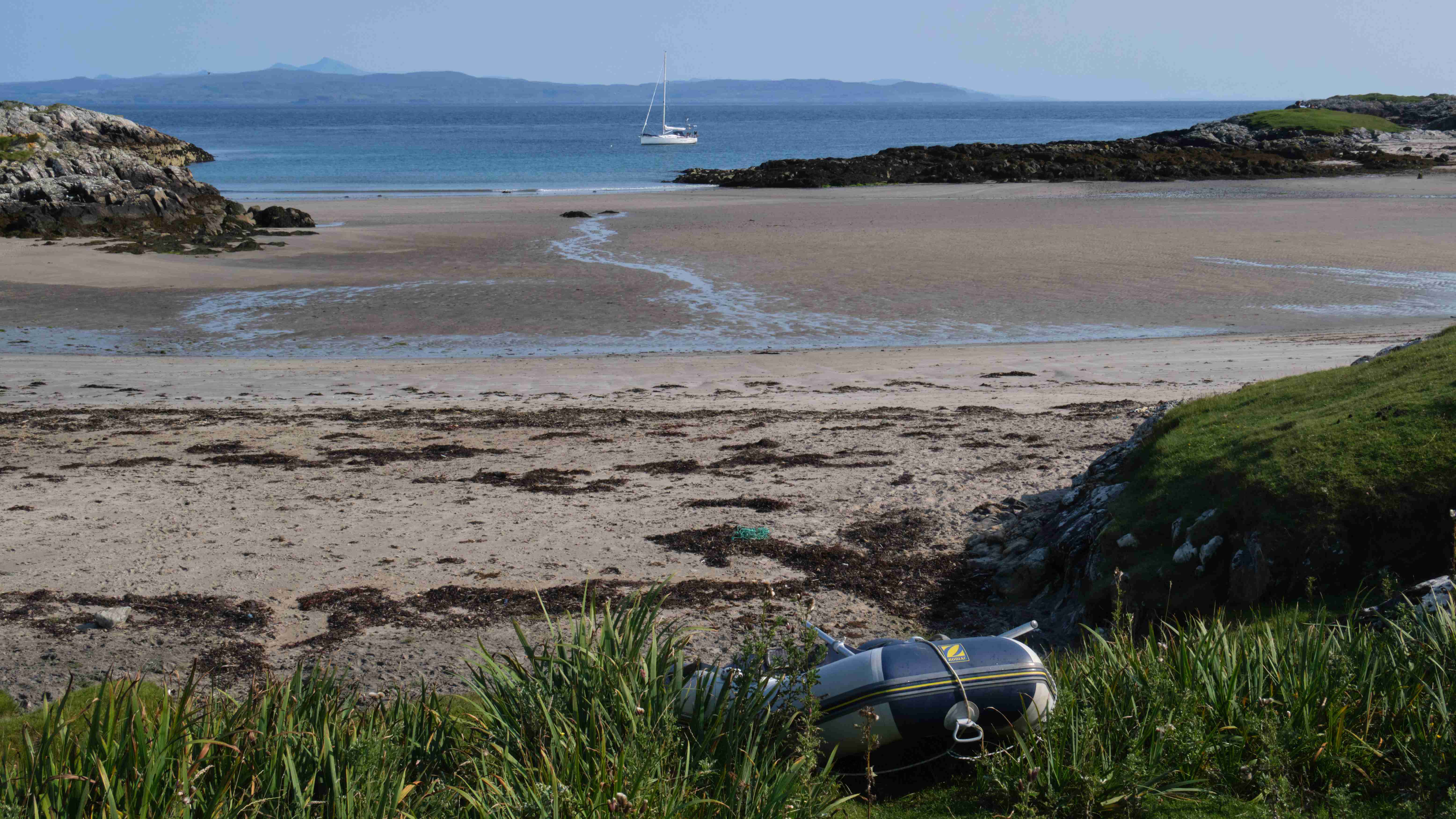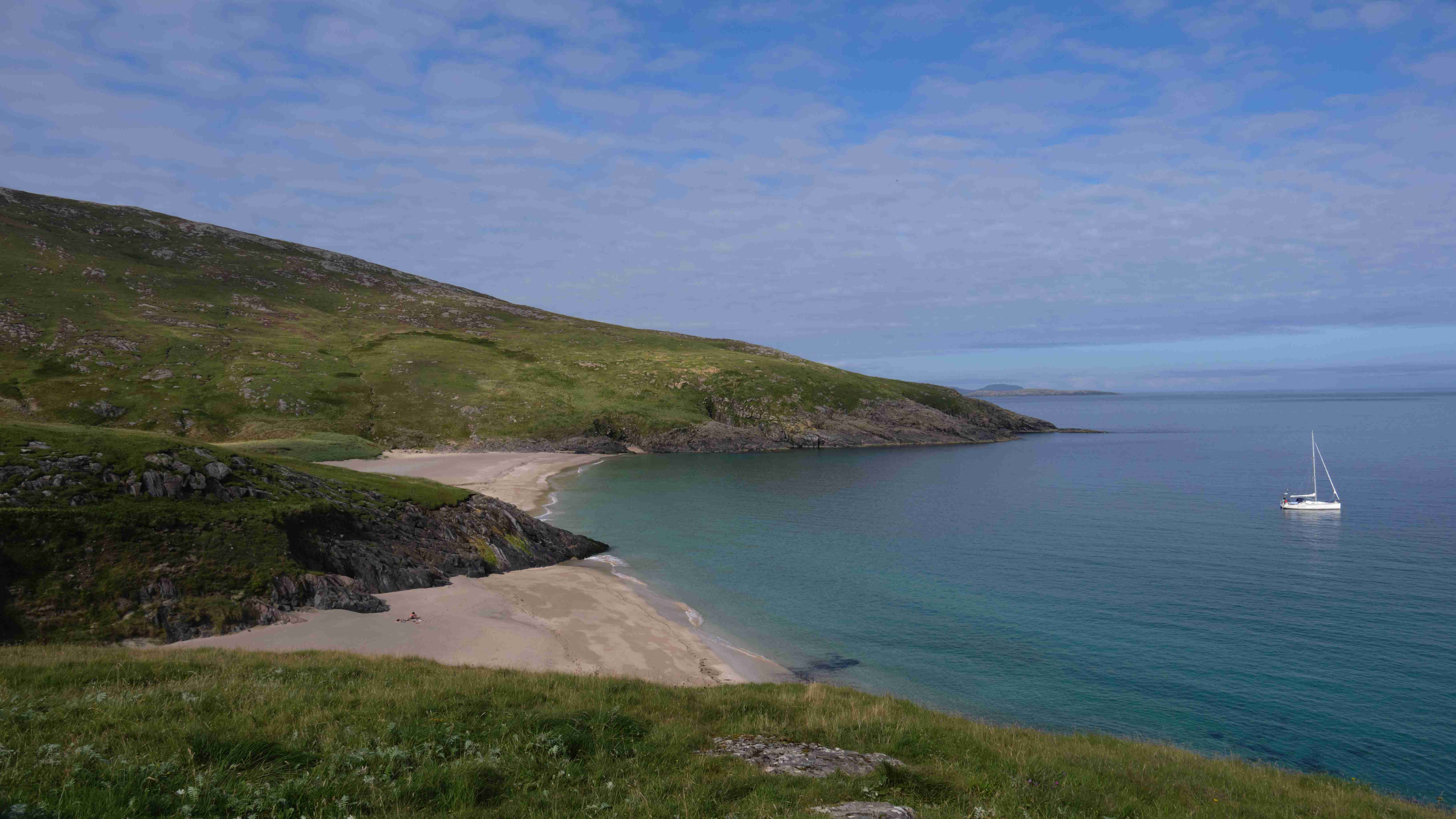 Wie vorhergesagt haben wir am Mittwoch einen guten Nordostwind und können diesen für die Überfahrt zu den Inneren Hebriden nutzen. Wir entscheiden uns gegen das südlich gelegene Tiree, da wir keine Höhe für den kommenden Tag verlieren wollen, und ankern in der kleinen Bucht Sorosdale an der Nordostspitze von Coll. Die Bucht ist recht eng, aber hinter einer kleinen vorgelagerten Insel finden wir etwas Schutz. Wir unternehmen eine kurze Wanderung und genießen weiter das gute Wetter.