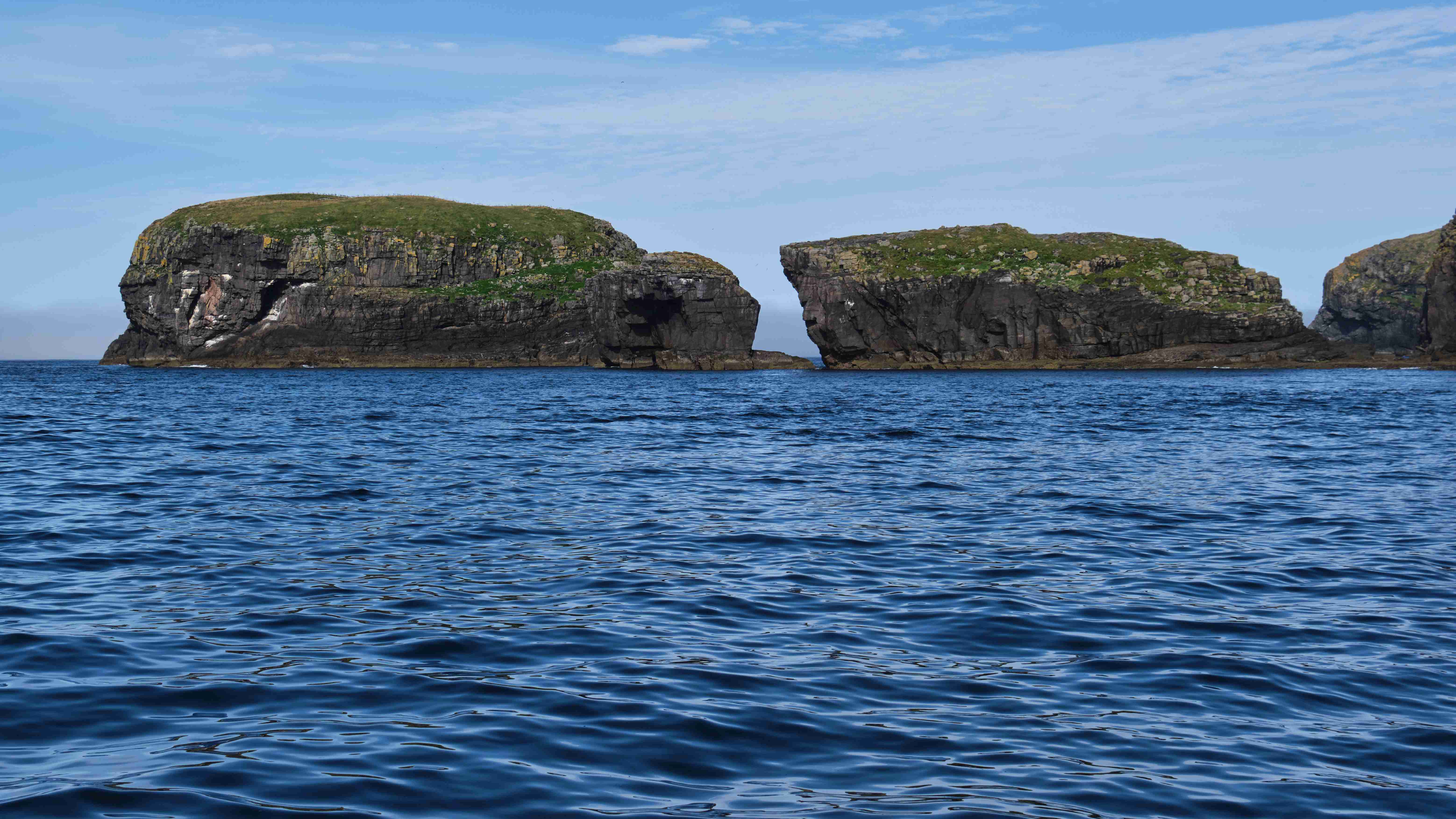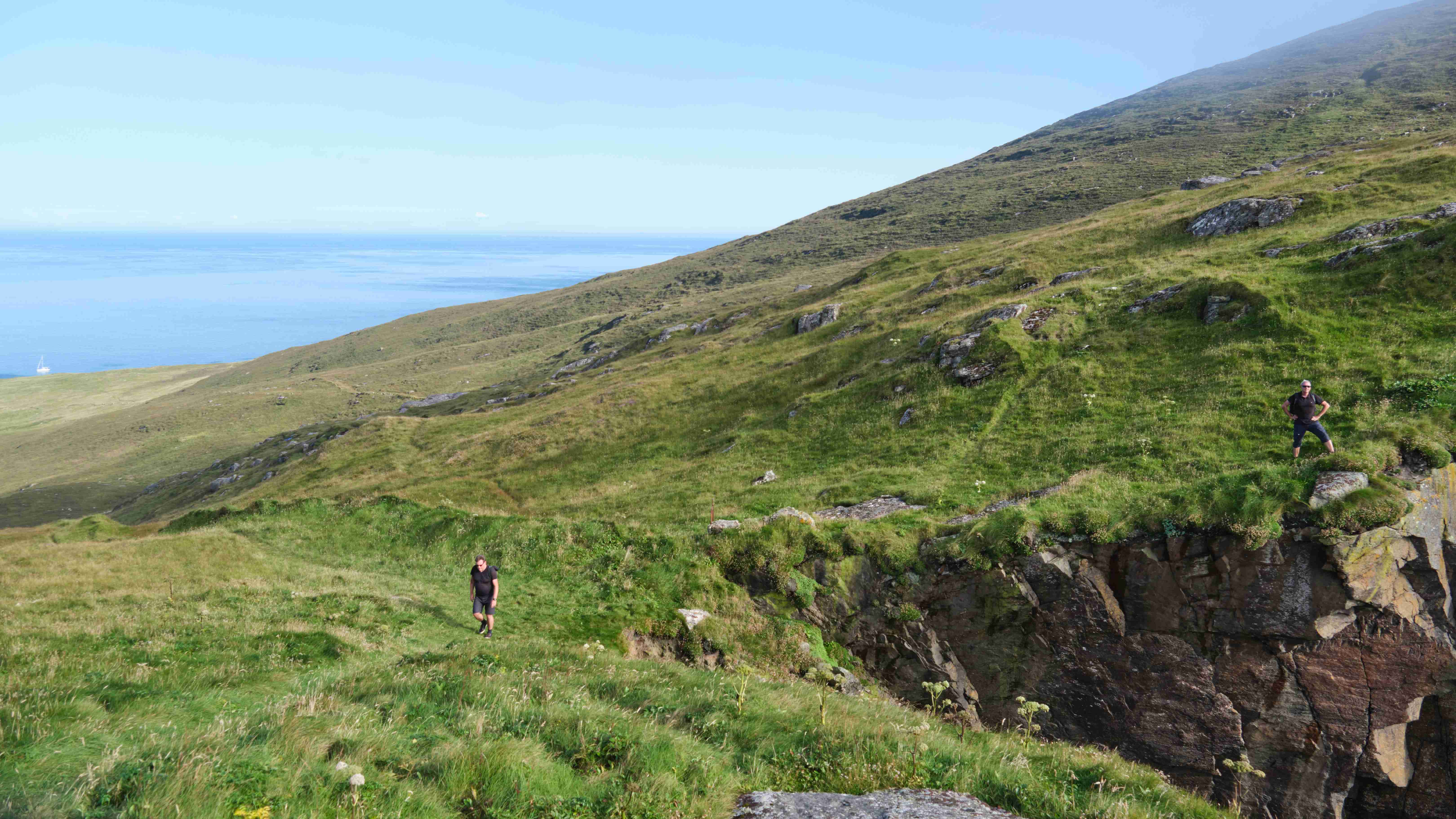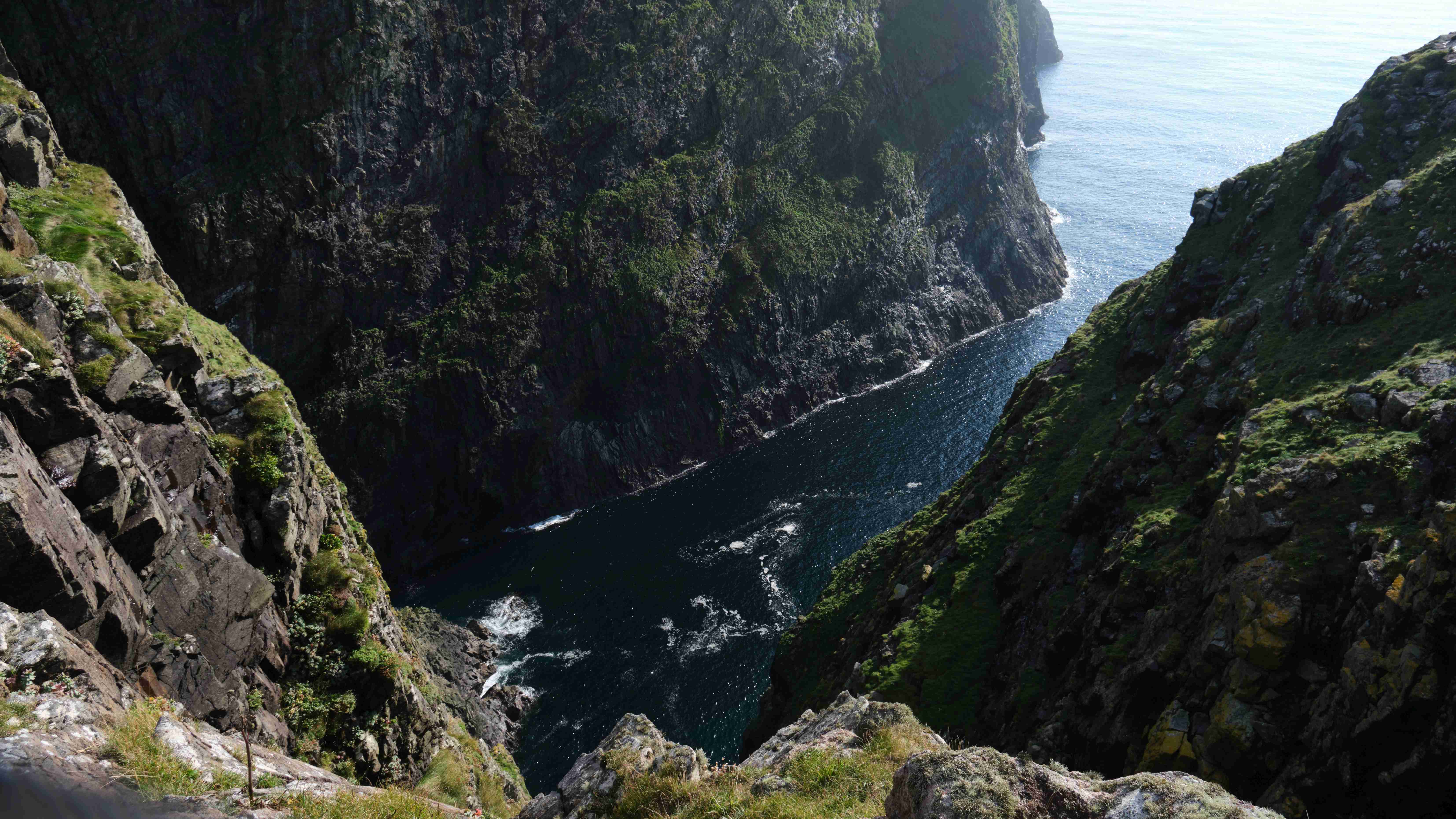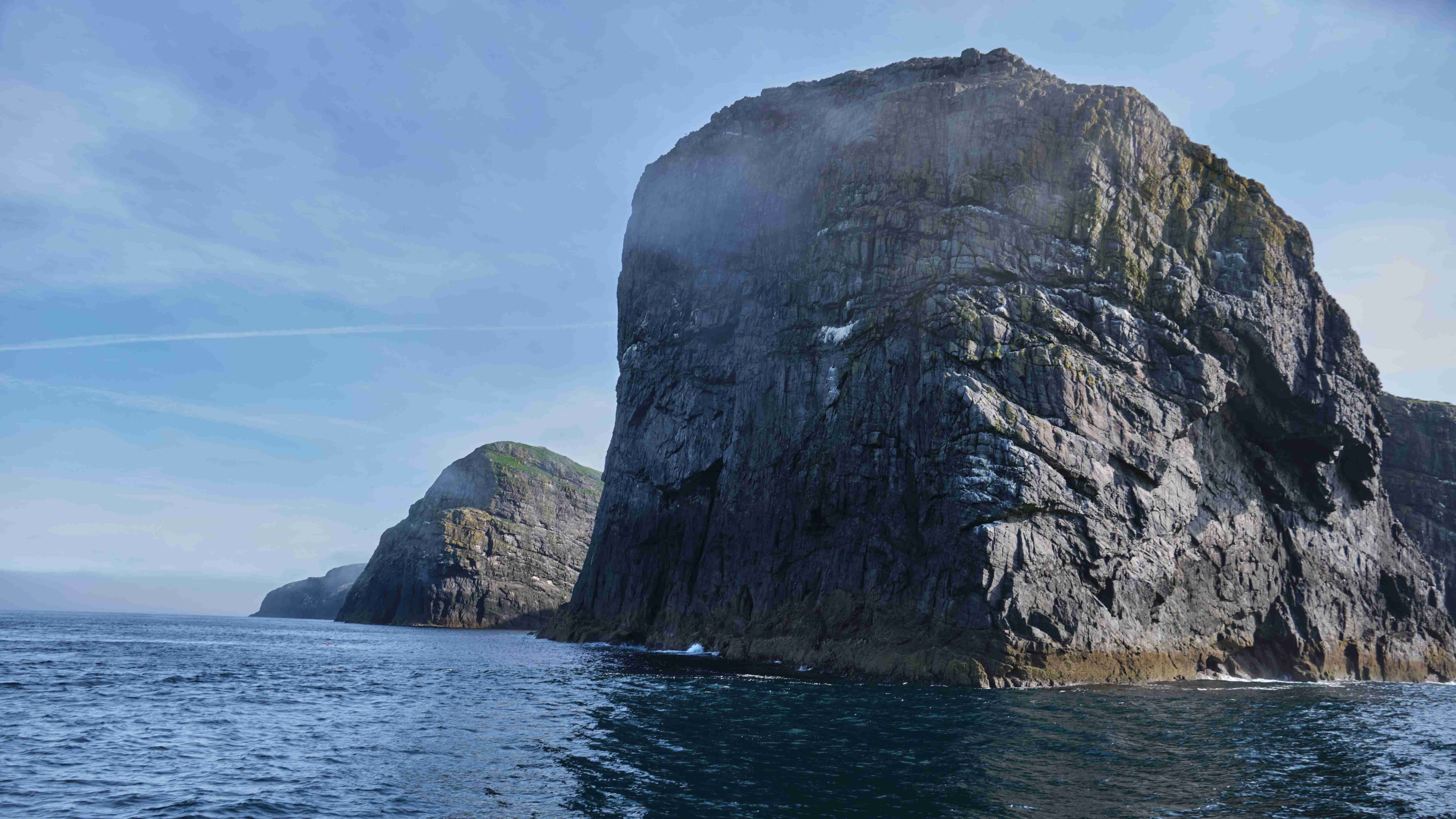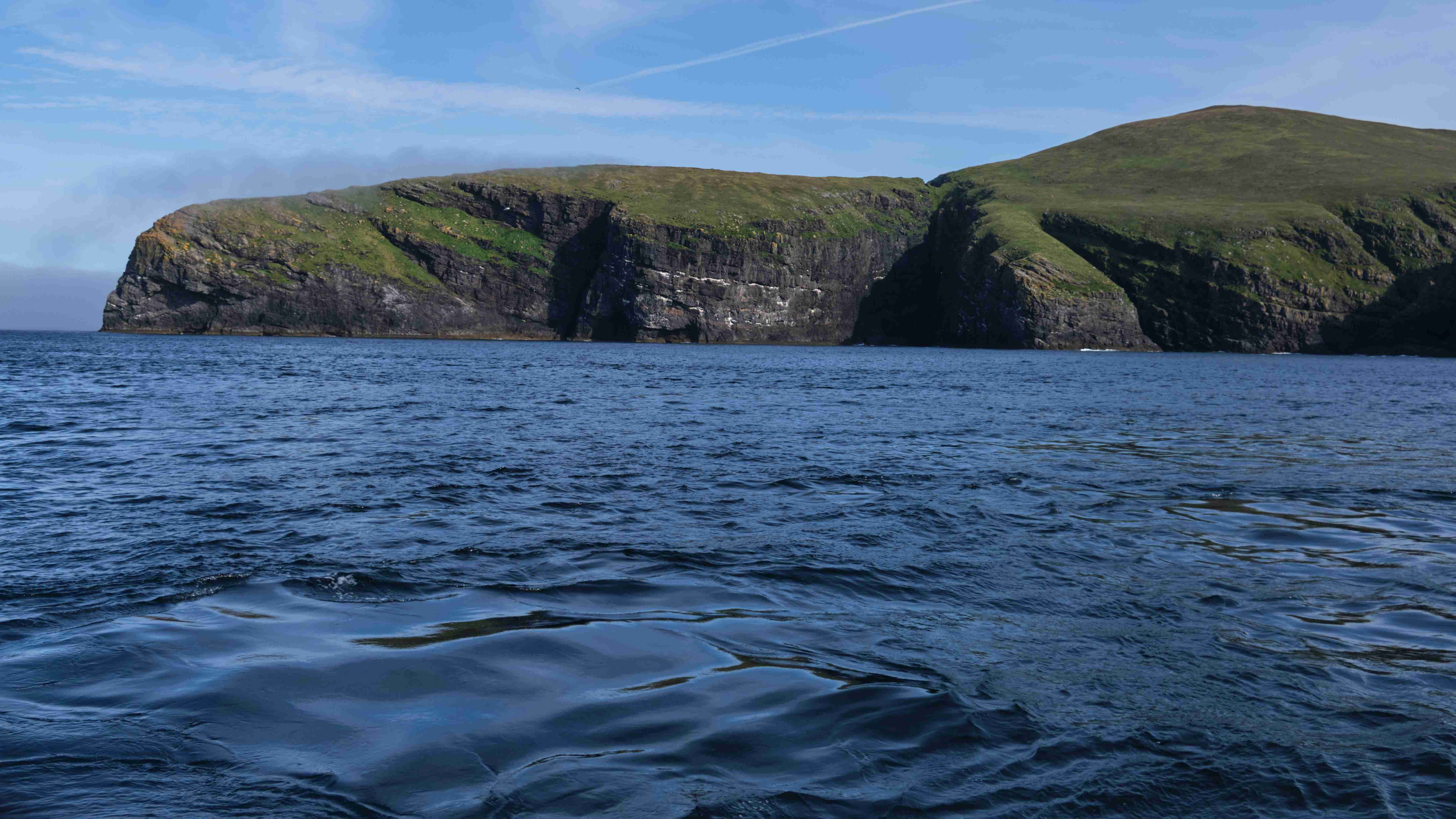 Auf unserem Landgang treffen wir eine Gruppe Kajak-Fahrer, die hier in der Einsamkeit auf der Insel zelten. Bei bestem Wetter erkunden wir die Ruinen des aufgegebenen Dorfes und steigen weglos und mühsam über die nassen Wiesenhänge hinauf auf die Hügel zur Westseite der Insel. Und dann oben angelangt öffnet sich für uns ein fantastischer Blick über die 200 – 300 m hohen schroffen Klippen hinab auf die See.