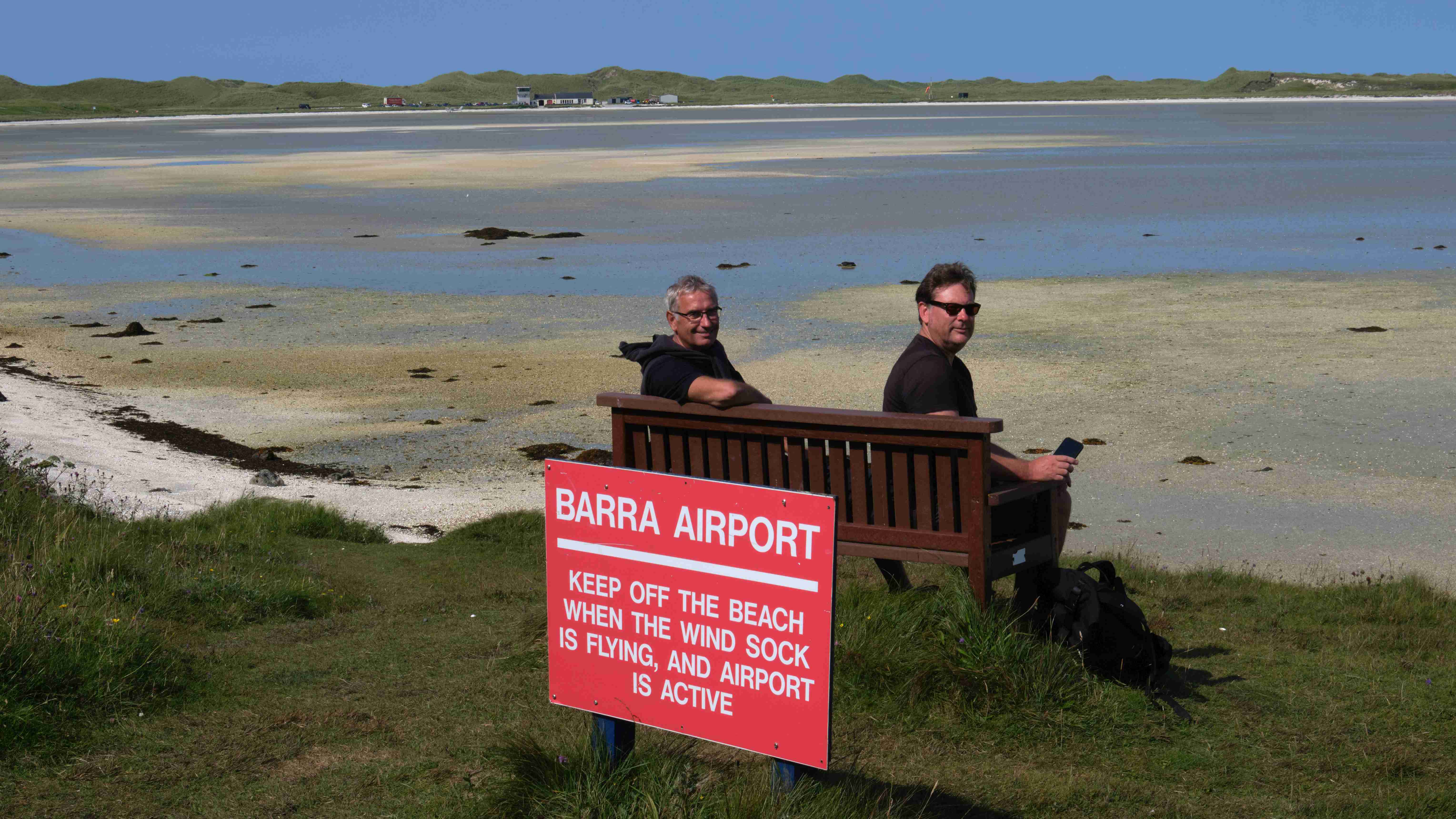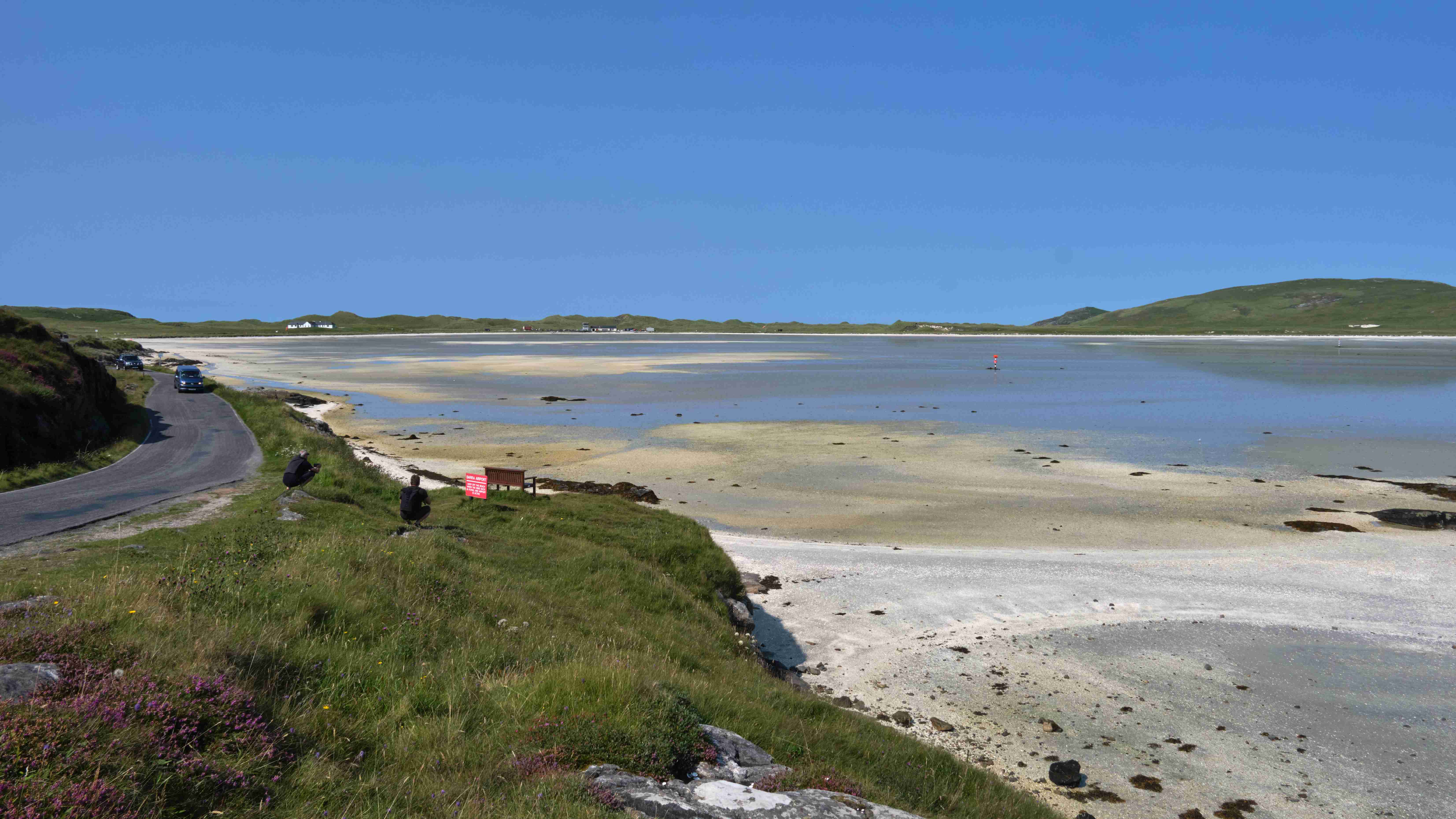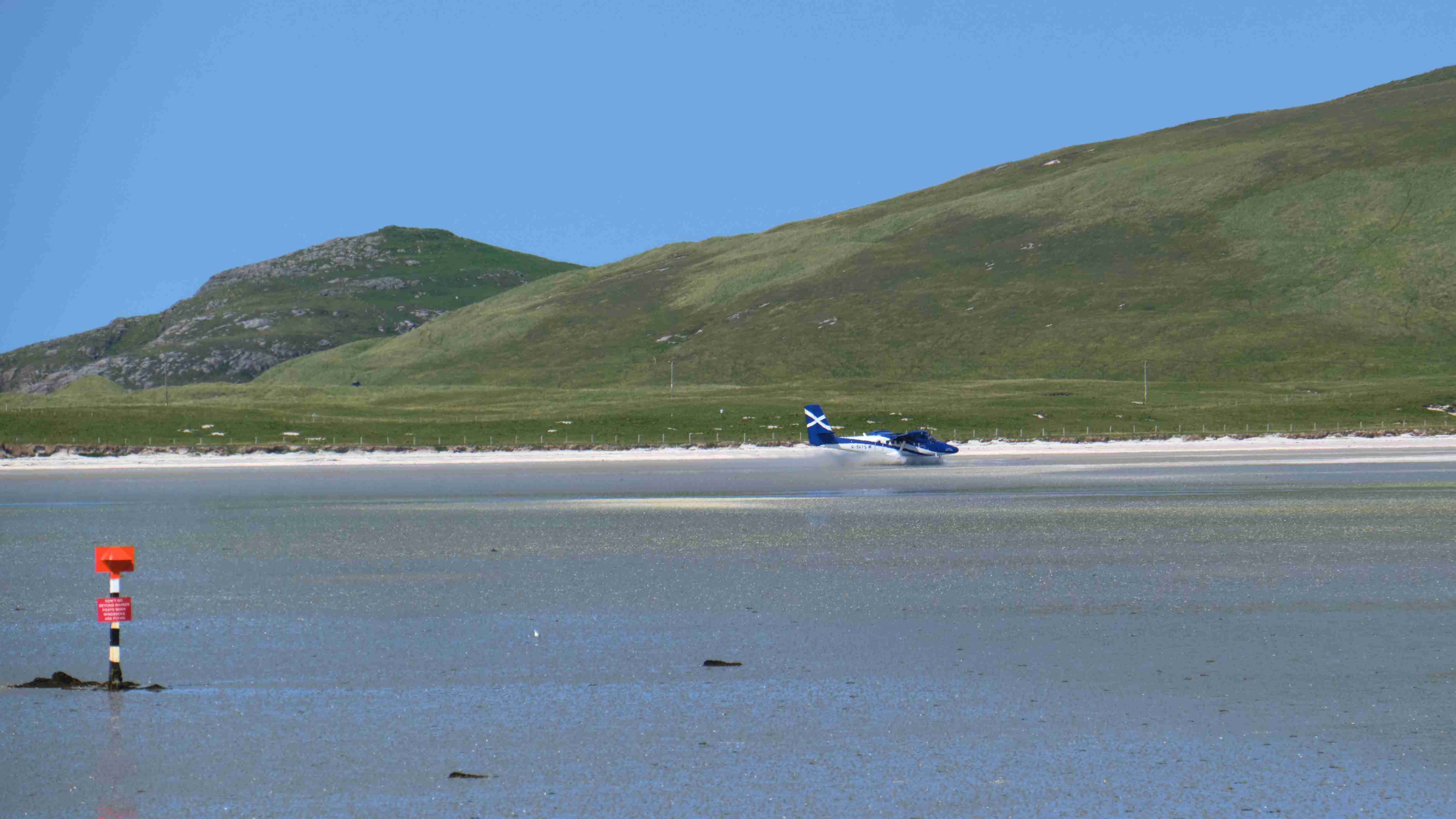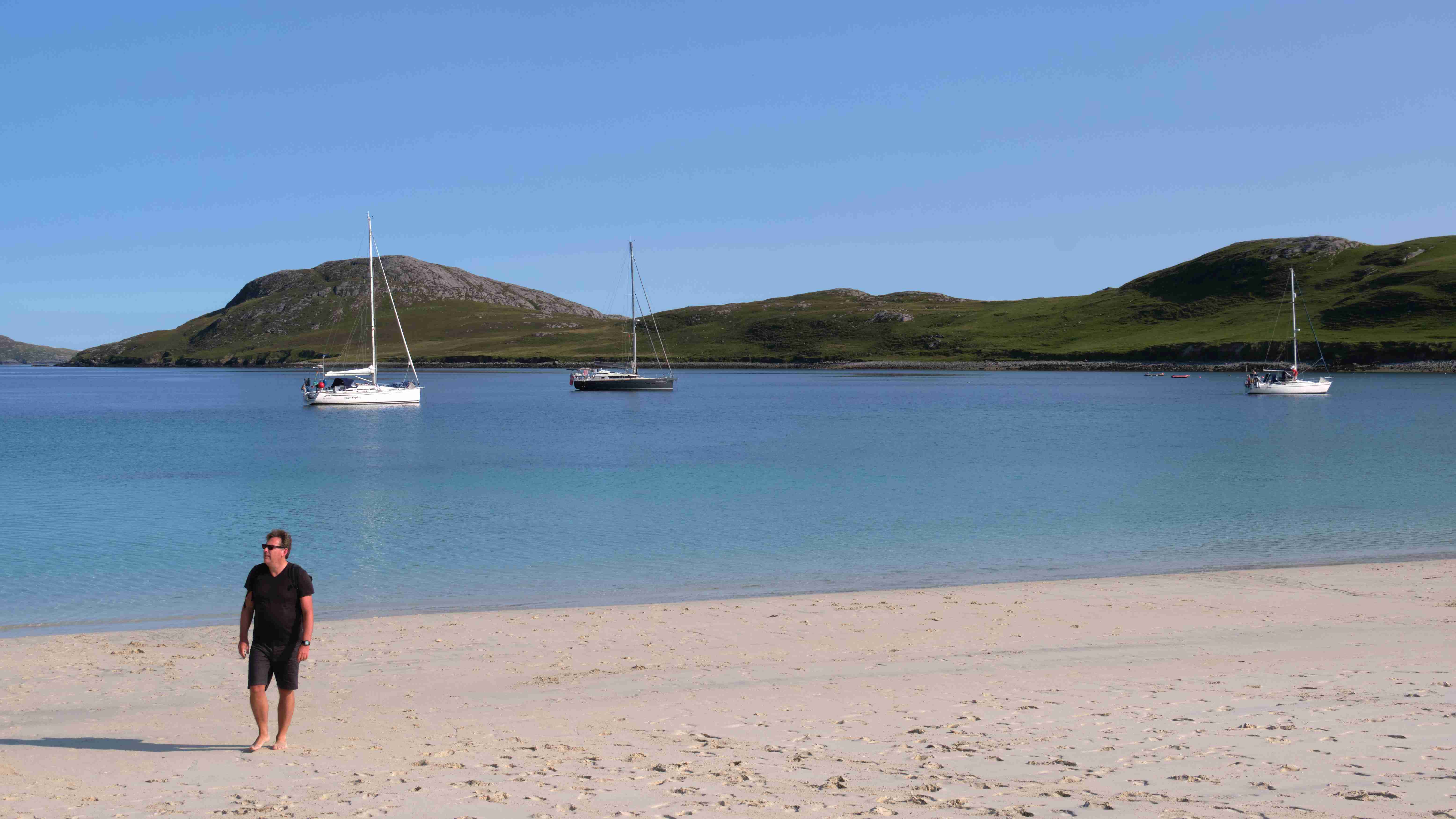 Tags darauf das gleiche Spiel: Wir motoren bei Windstille und flacher See nun die Ostküste von Barra entlang nach Norden bis zur Hirivagh Bay bei dem Fischerort Ardveenish. Wir wollen von dort entlang der Hulavagh Bay bis zu der riesigen Sandbucht Traigh Mhor wandern, die als Landeplatz für den lokalen Flugplatz dient. Der Flugplan ist auf die Tide abgestimmt, genau zu Niedrigwasser landet eine Turboprop aus Glasgow auf dem trockengefallenen Strand. Es ist der einzige Flugplatz auf einem Strand in Europa. Da unsere Ankerbucht für eventuell drehende Winde über Nacht zu schmal ist, verlegen wir uns am Abend hinaus zwischen die Inseln und kochen uns wieder ein fürstliches Mahl.