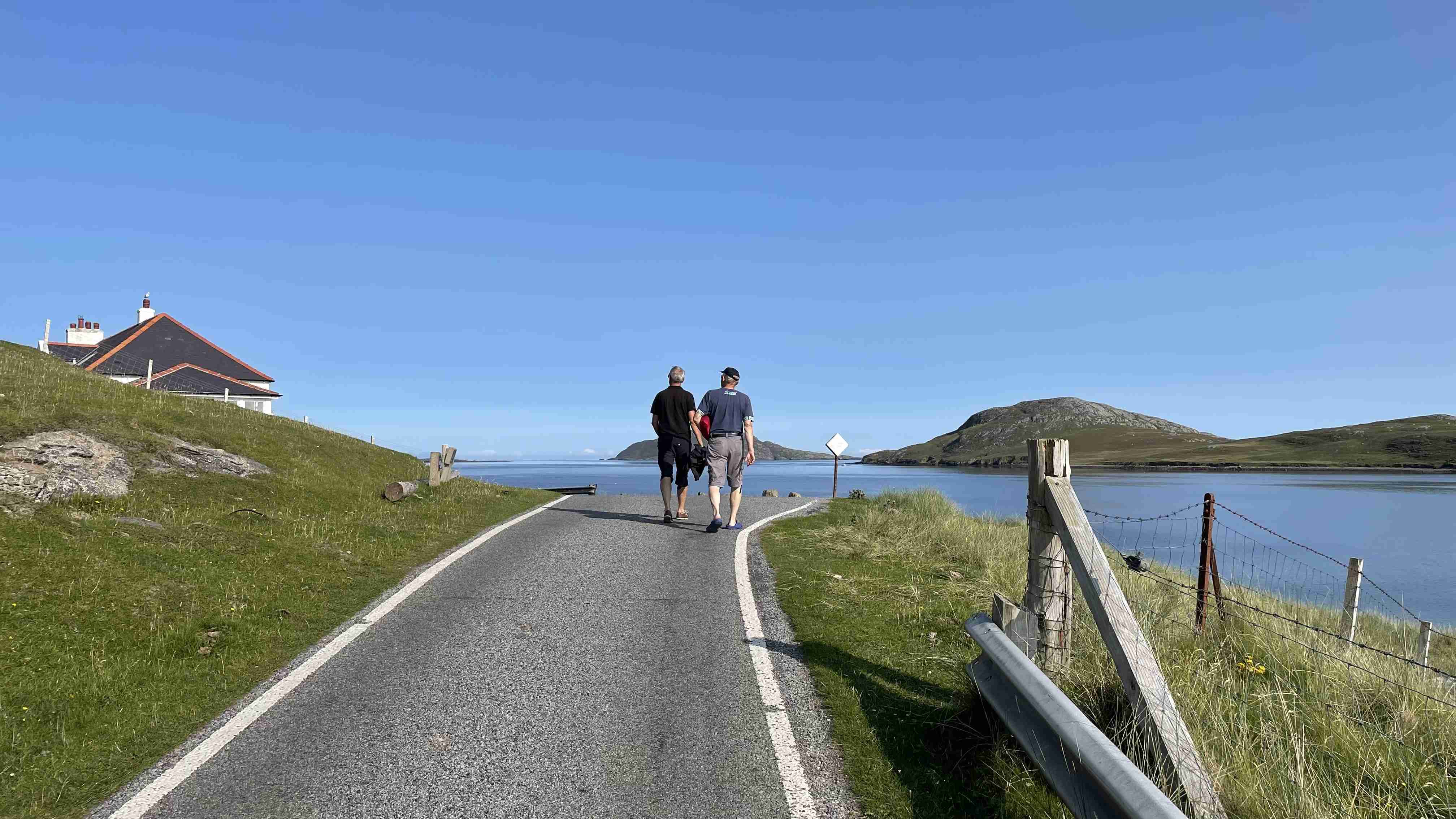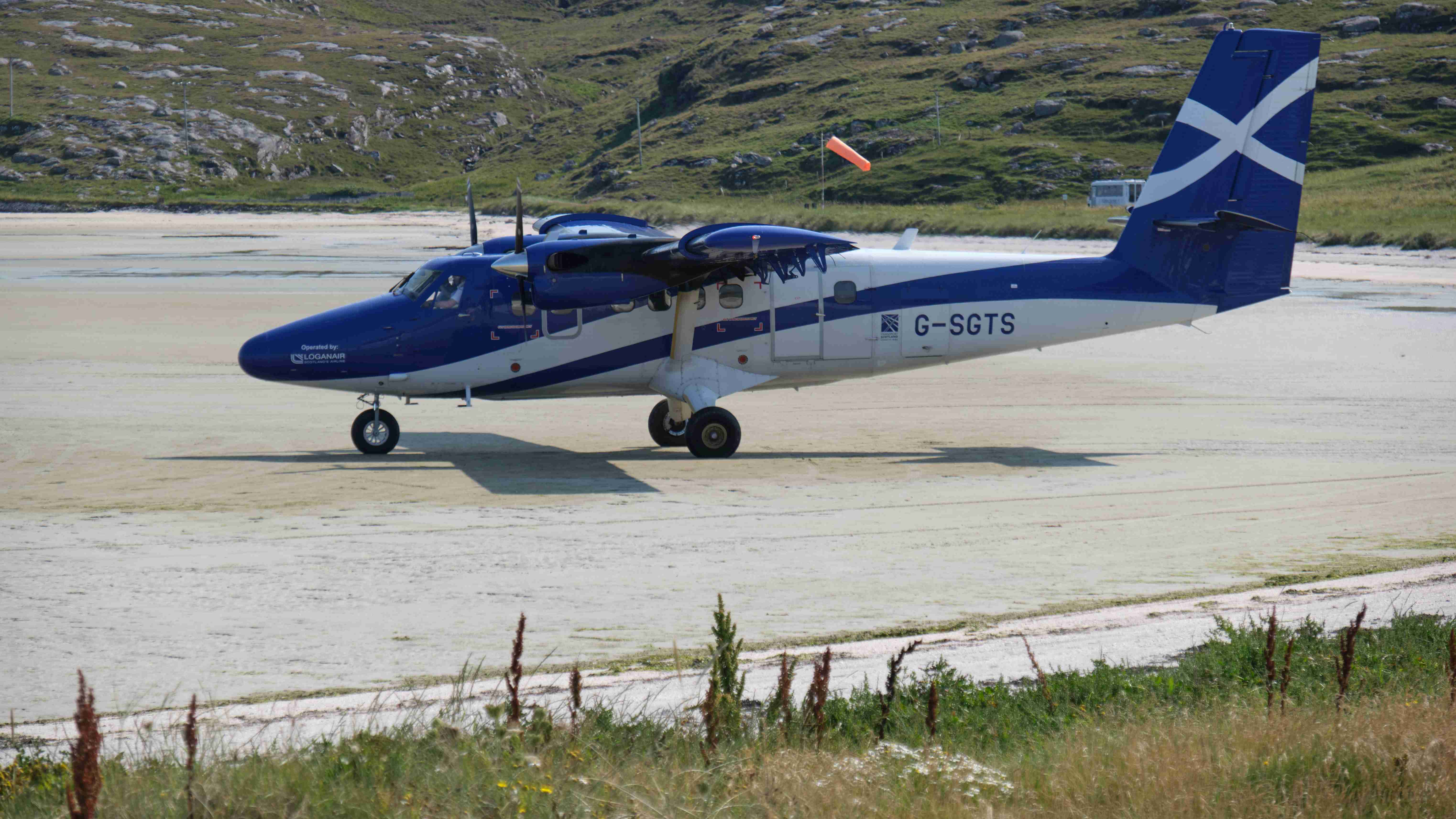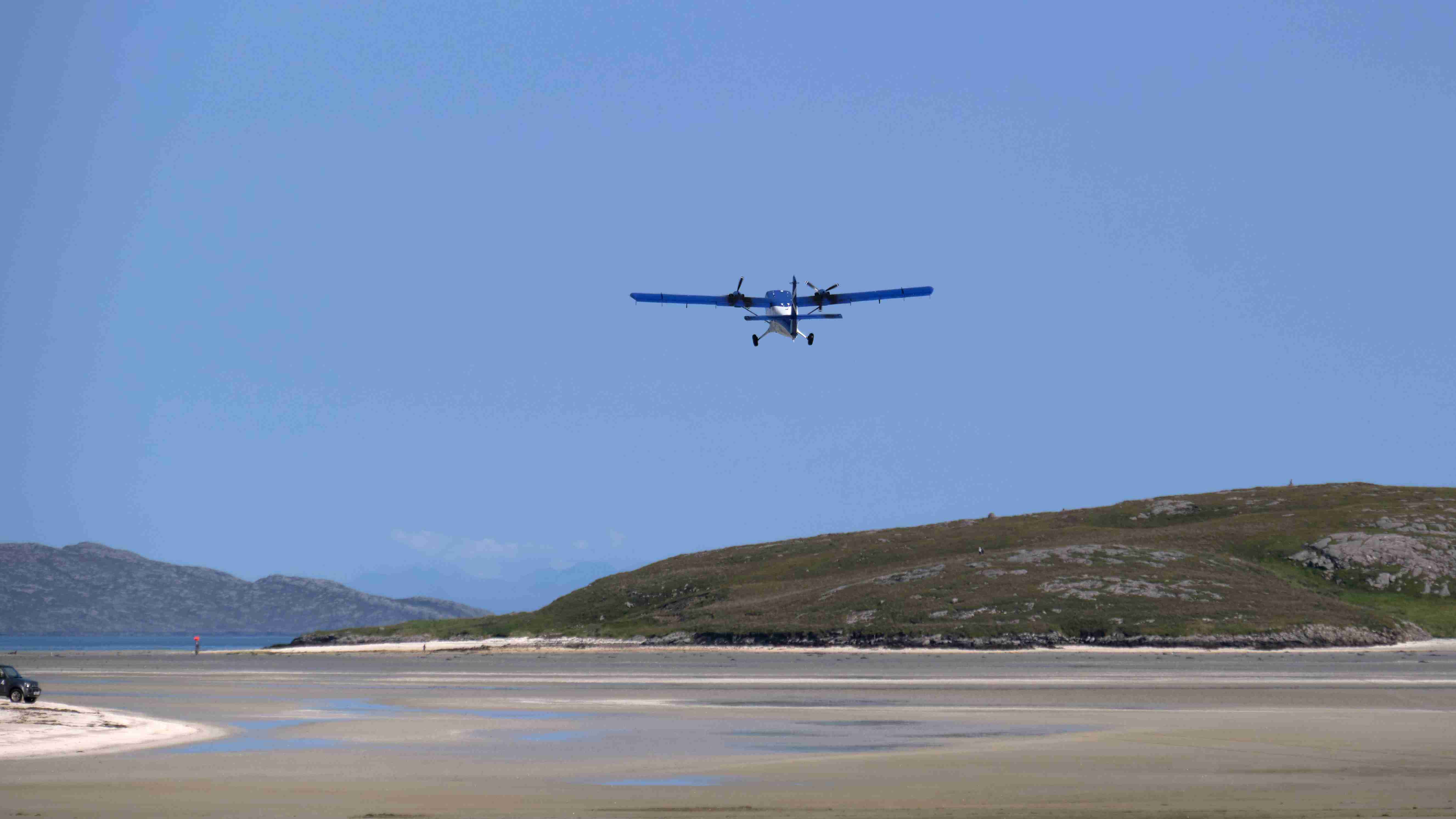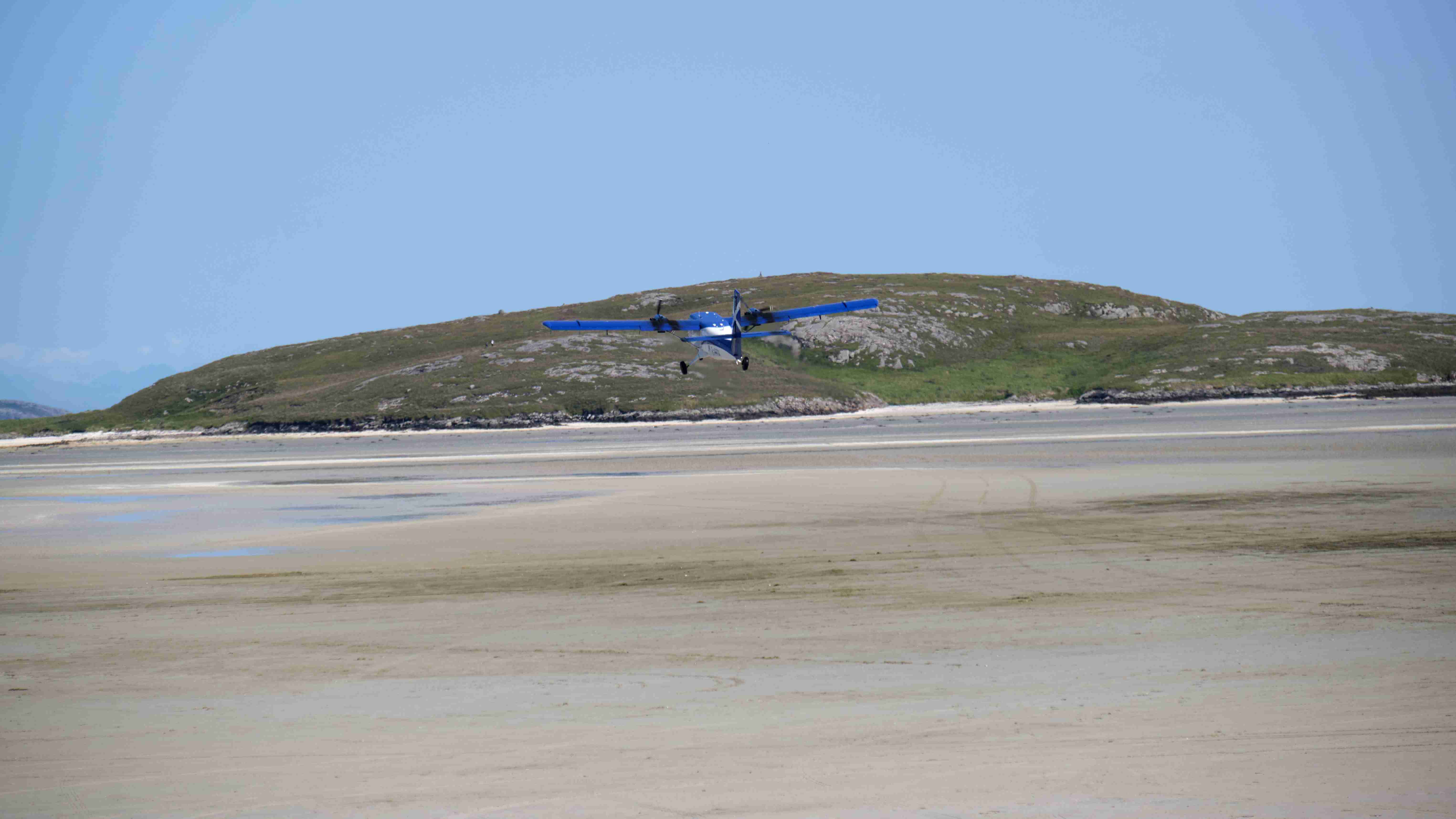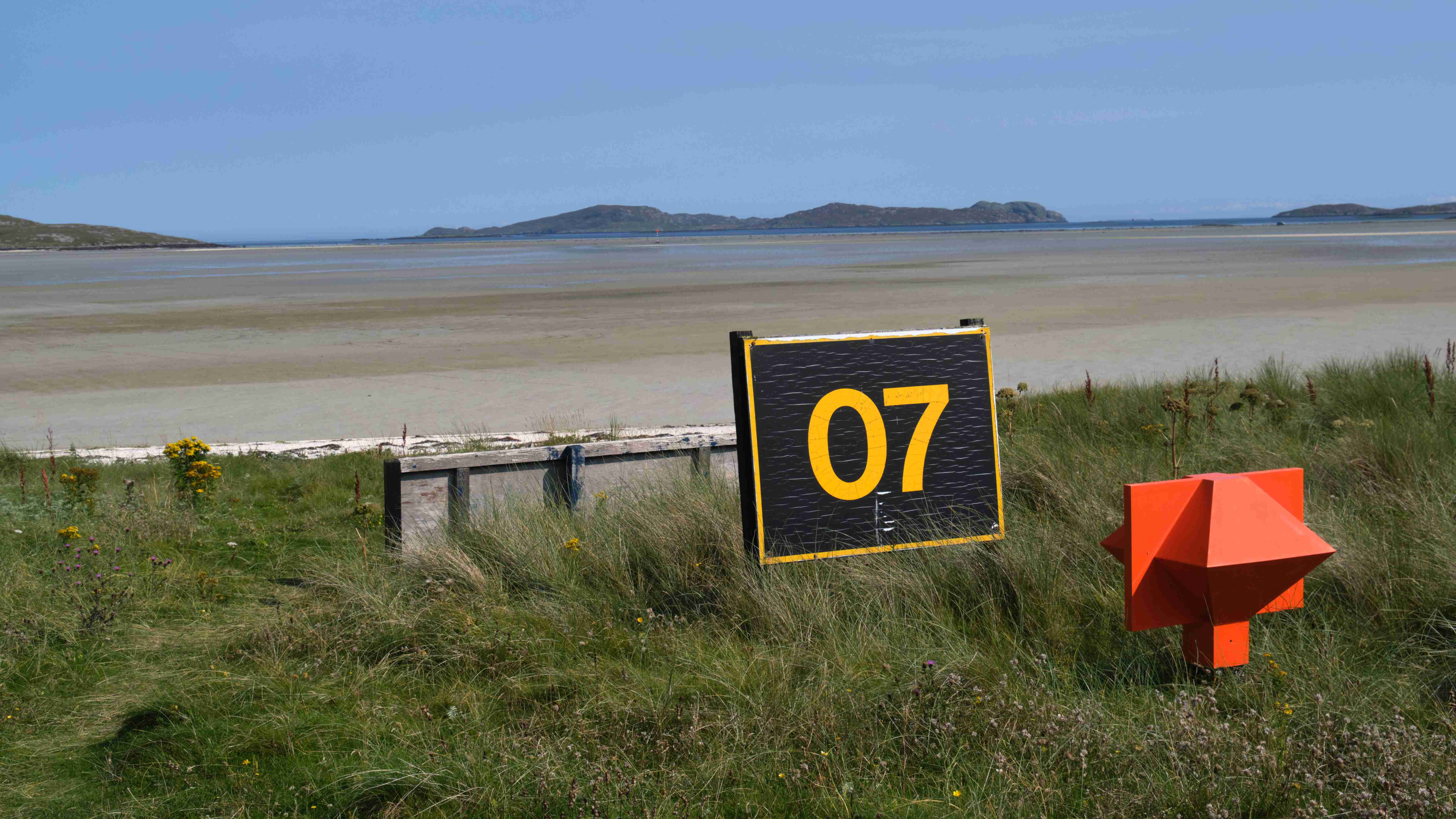 Tags darauf das gleiche Spiel: Wir motoren bei Windstille und flacher See nun die Ostküste von Barra entlang nach Norden bis zur Hirivagh Bay bei dem Fischerort Ardveenish. Wir wollen von dort entlang der Hulavagh Bay bis zu der riesigen Sandbucht Traigh Mhor wandern, die als Landeplatz für den lokalen Flugplatz dient. Der Flugplan ist auf die Tide abgestimmt, genau zu Niedrigwasser landet eine Turboprop aus Glasgow auf dem trockengefallenen Strand. Es ist der einzige Flugplatz auf einem Strand in Europa. Da unsere Ankerbucht für eventuell drehende Winde über Nacht zu schmal ist, verlegen wir uns am Abend hinaus zwischen die Inseln und kochen uns wieder ein fürstliches Mahl.