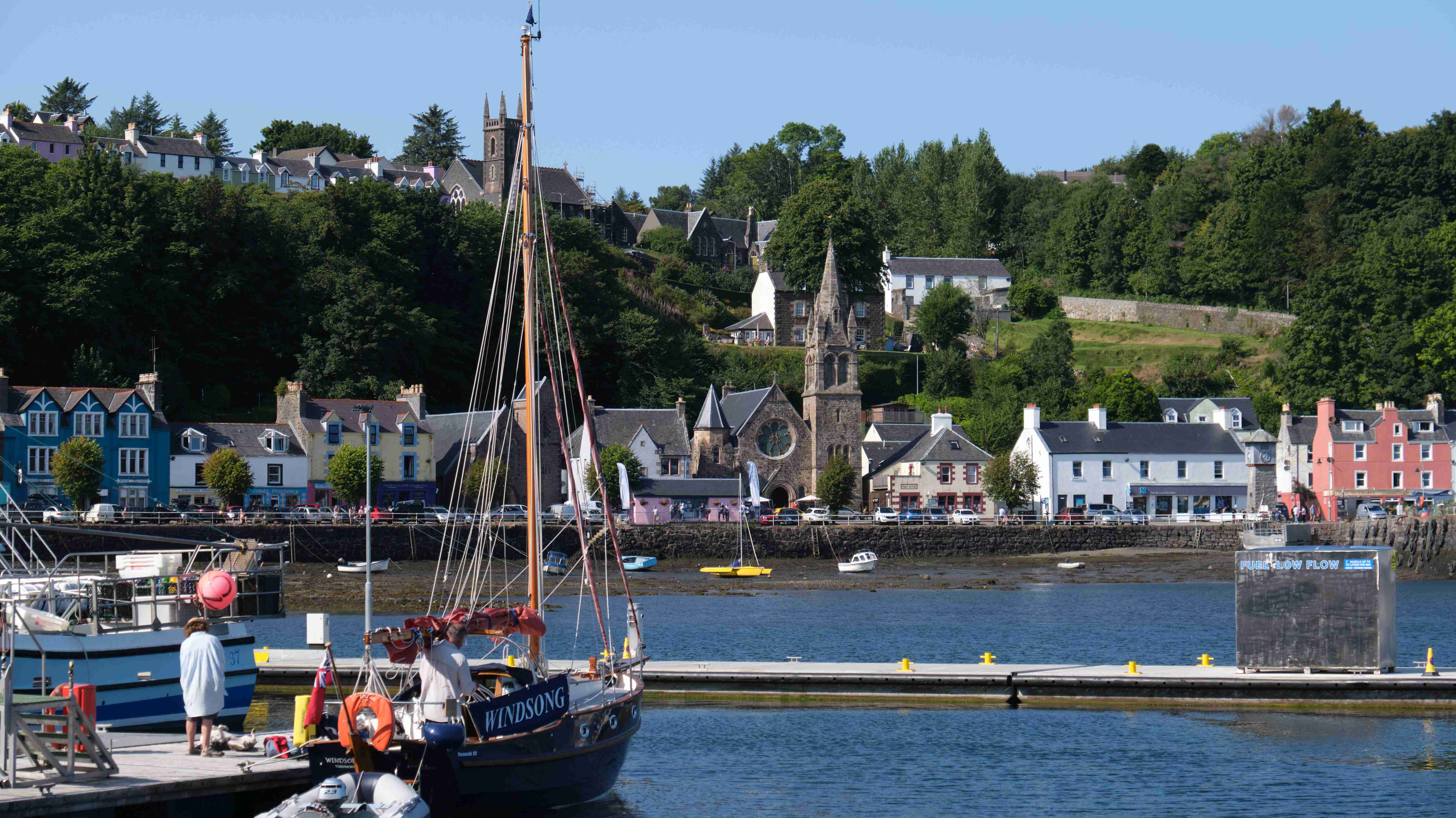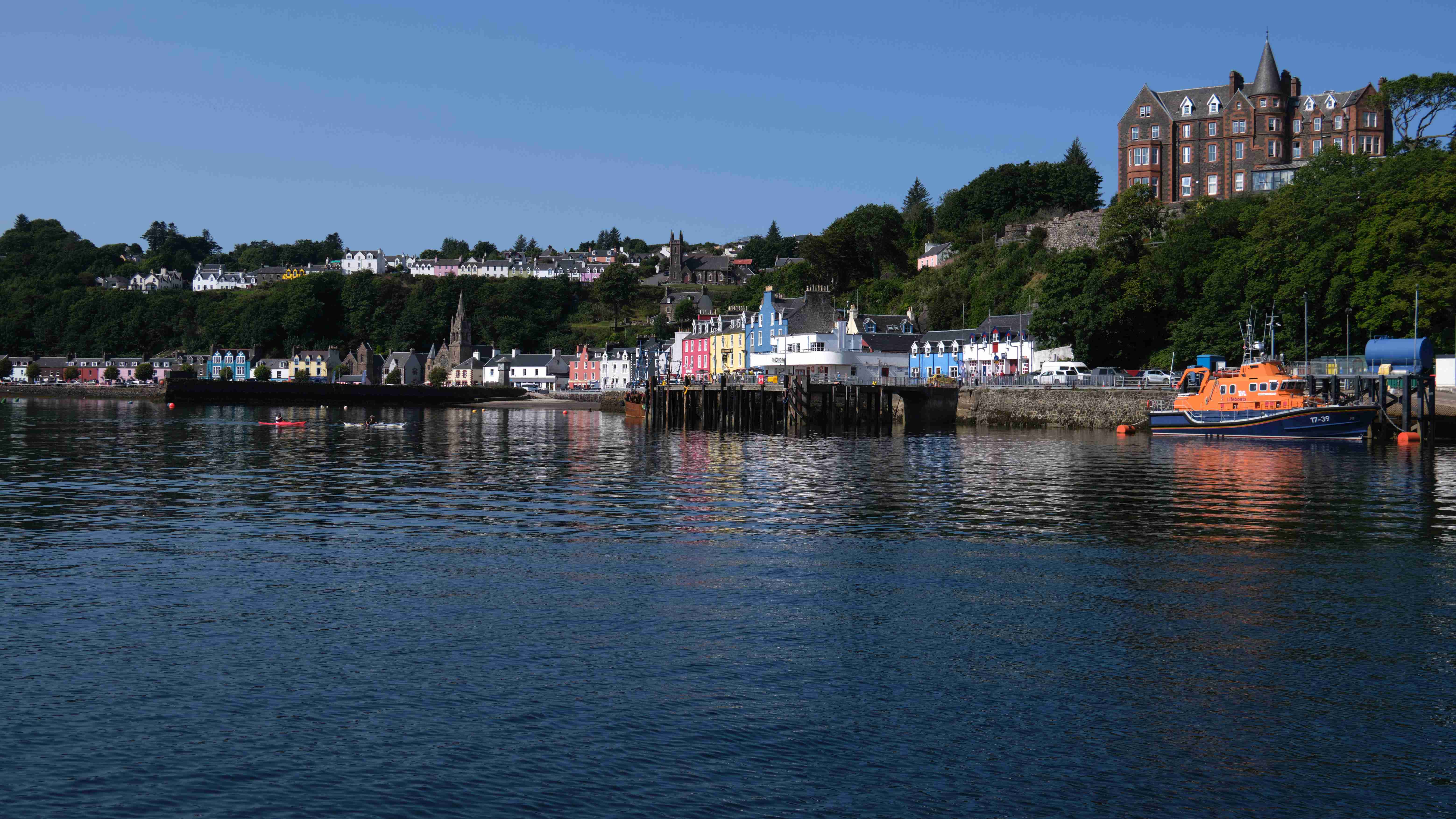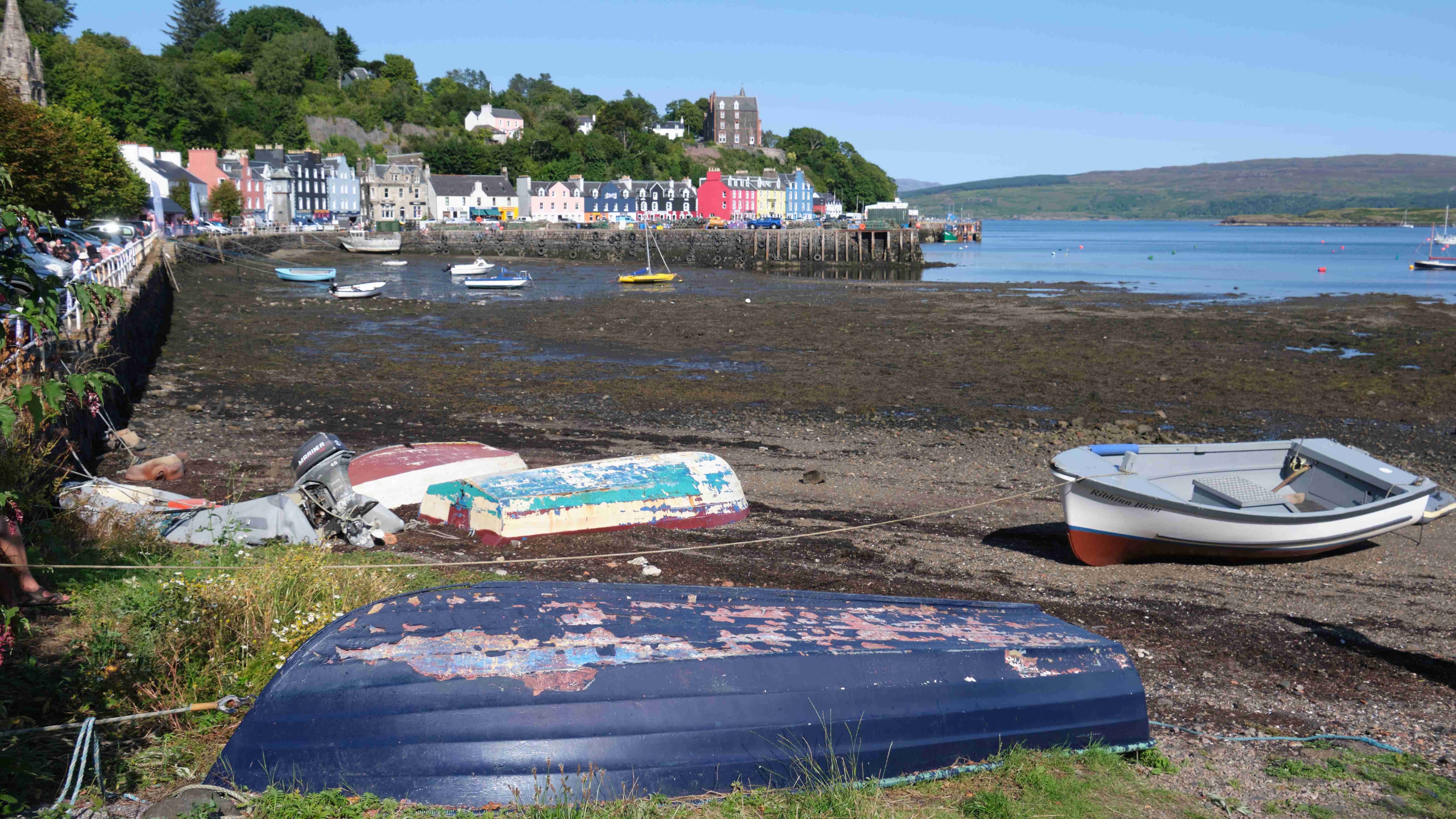 In der Nacht kommt unerwartet aus Südosten für zwei Stunden ein sehr unangenehmer Schwell in die Bucht, der uns ordentlich durchschaukelt, sodass niemand währenddessen schlafen kann. Dann ist der Spuk vorbei und die Nacht ist wieder ruhig, bis wir am Morgen den Anker für die weitere Etappe in den Sound of Mull heben. Dort finden wir einen Platz in der Marina von Tobermory. Wir hatten schon Bilder von diesem pittoresken Ort gesehen, aber bei diesem Sommerwetter erstrahlt er in voller Farbenpracht.