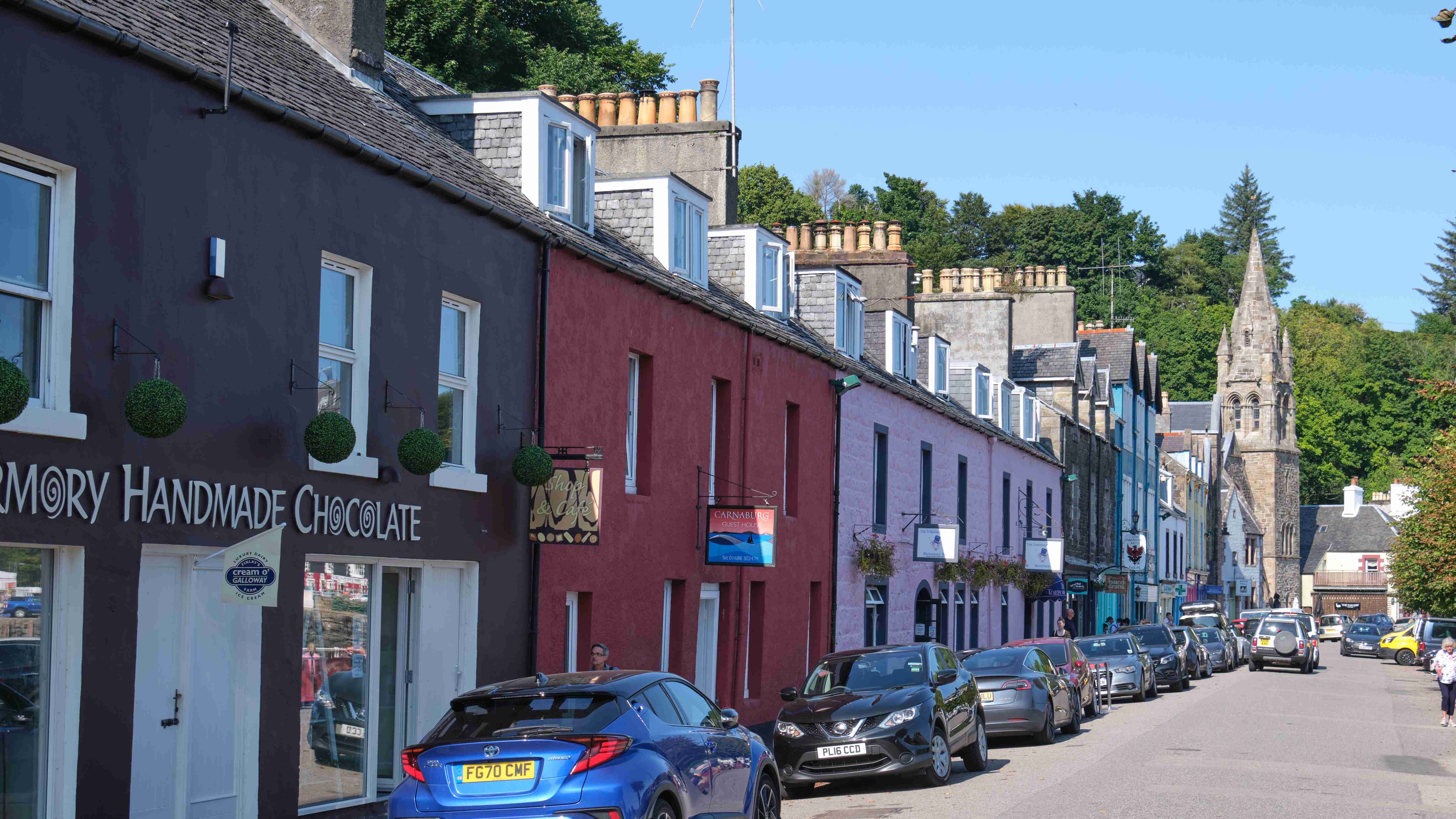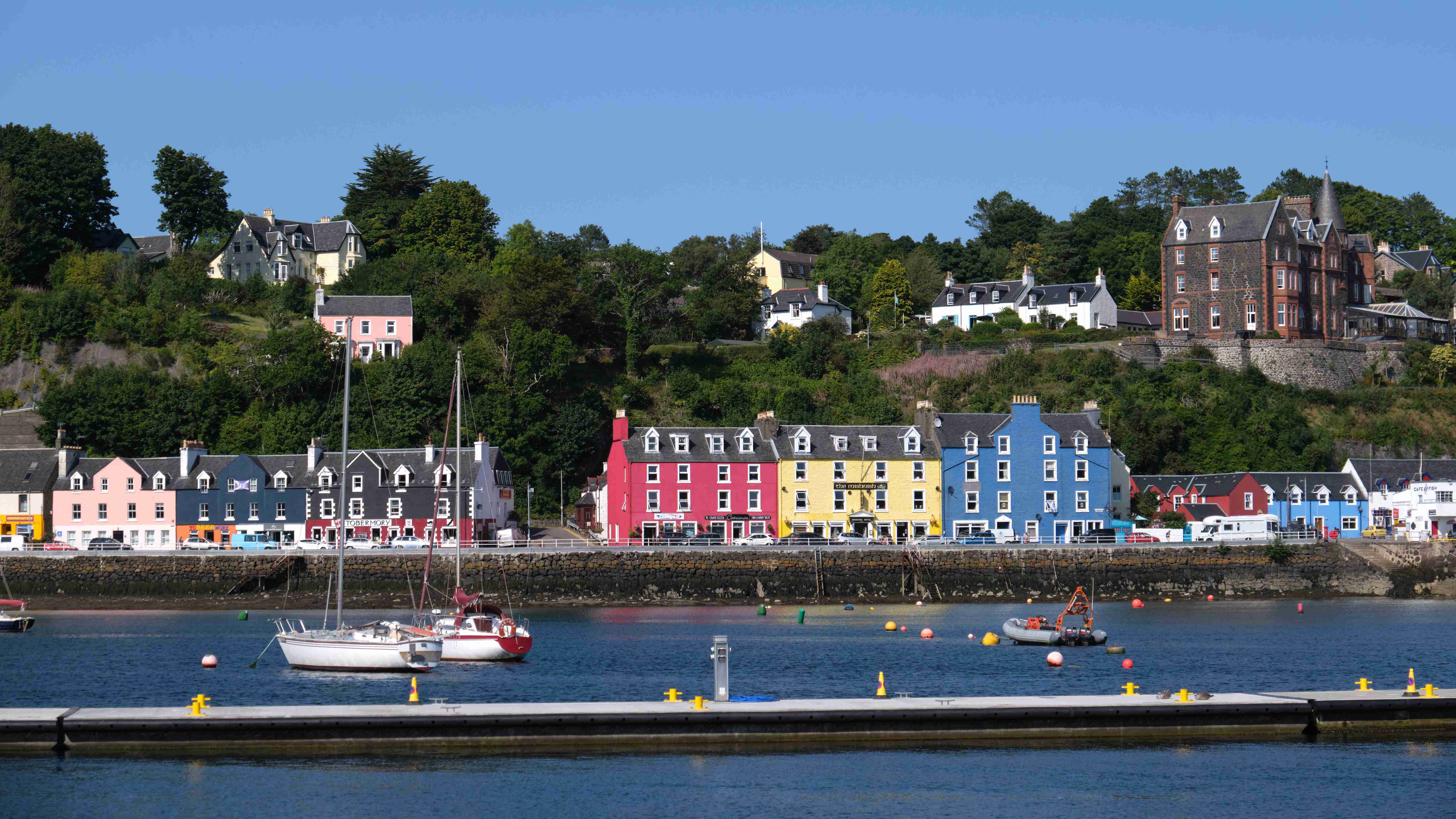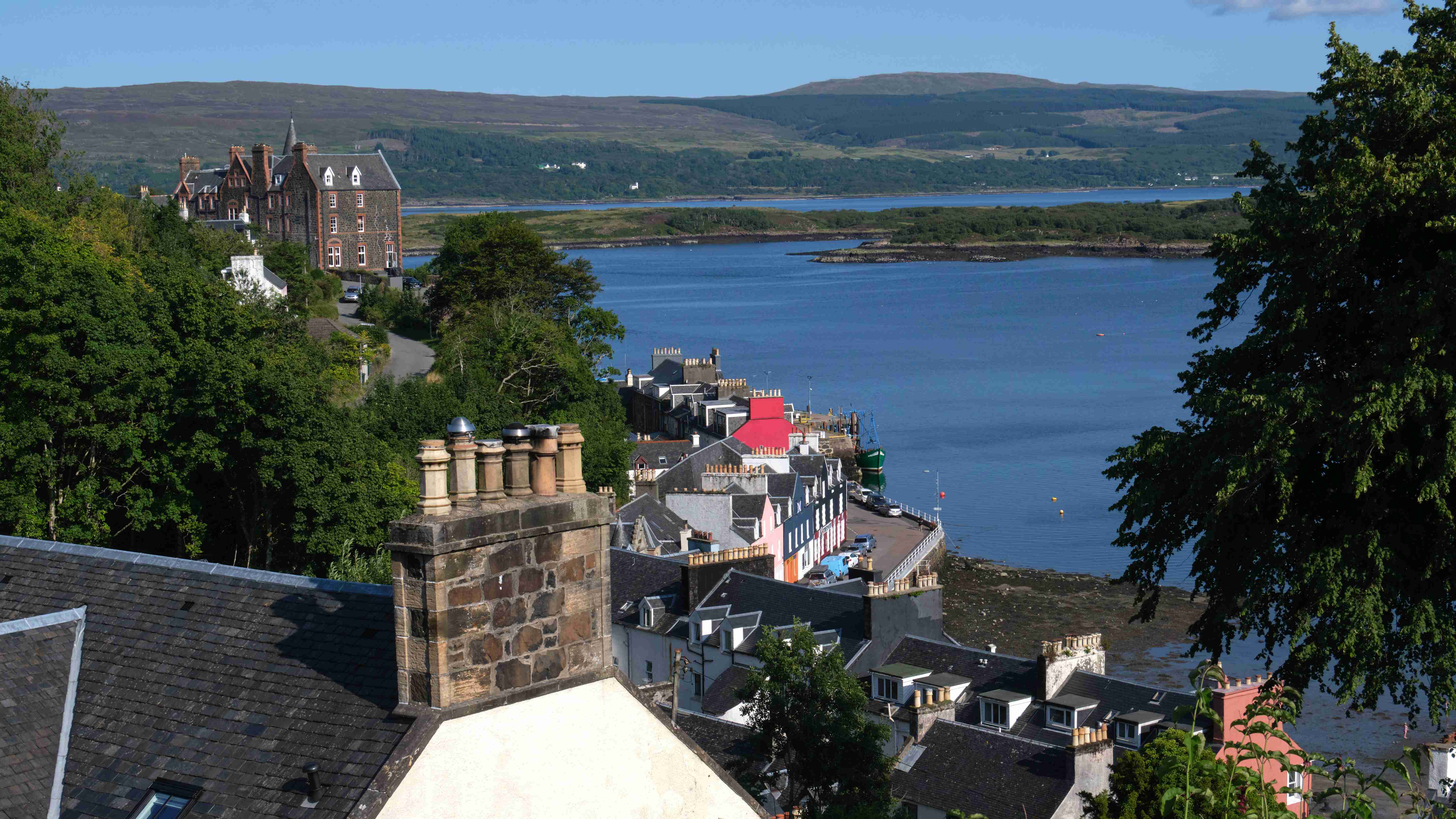 In der Nacht kommt unerwartet aus Südosten für zwei Stunden ein sehr unangenehmer Schwell in die Bucht, der uns ordentlich durchschaukelt, sodass niemand währenddessen schlafen kann. Dann ist der Spuk vorbei und die Nacht ist wieder ruhig, bis wir am Morgen den Anker für die weitere Etappe in den Sound of Mull heben. Dort finden wir einen Platz in der Marina von Tobermory. Wir hatten schon Bilder von diesem pittoresken Ort gesehen, aber bei diesem Sommerwetter erstrahlt er in voller Farbenpracht.