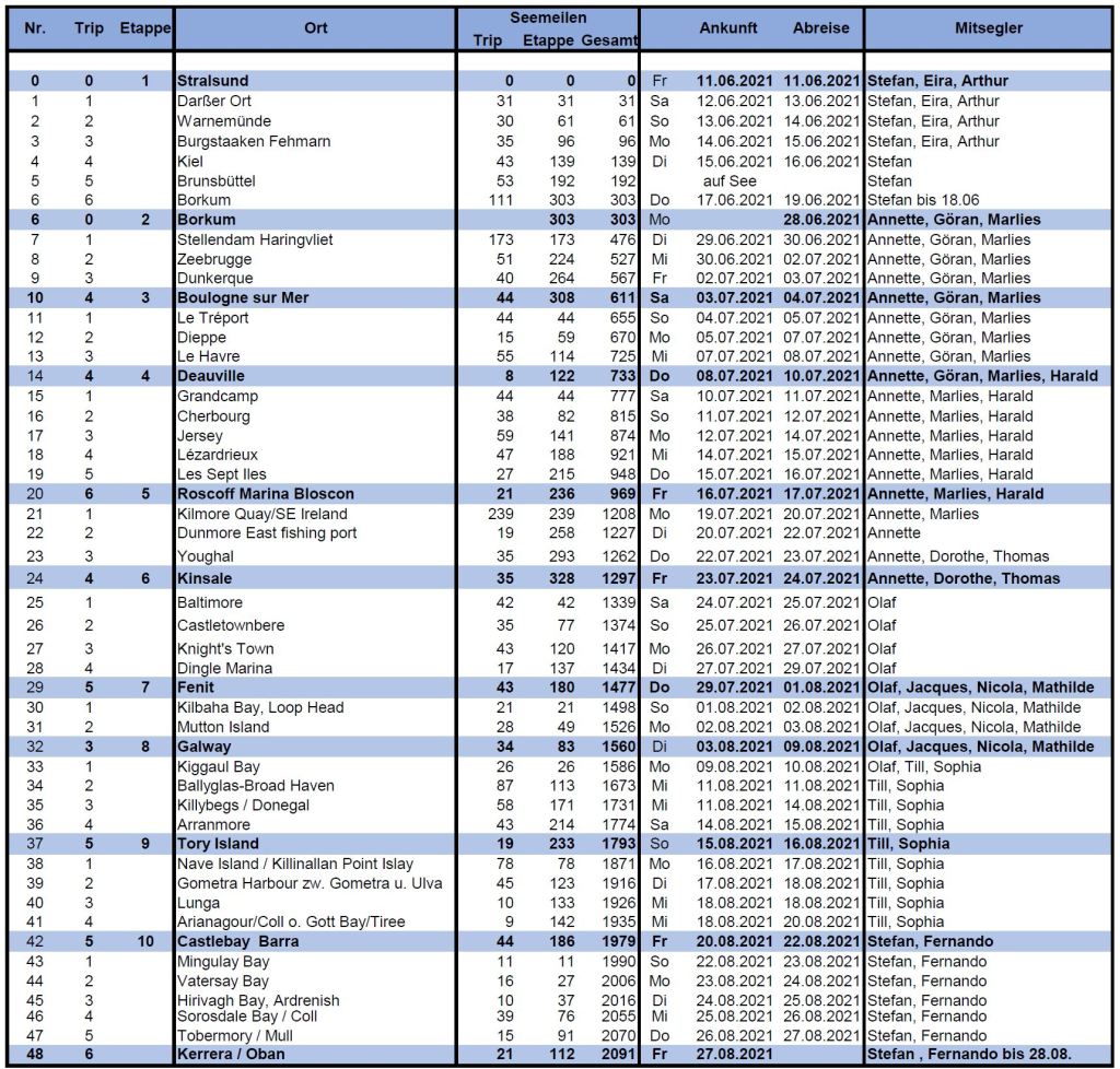 Die Reise hat uns 2021 in 10 Wochen von Stralsund entlang der Küste von Deutschland, den Niederlanden, Belgien, Frankreich, Irland in die Inselwelt Schottlands an 48 Ziele gebracht. Wir haben dabei 2.091 Seemeilen zurückgelegt. Wir haben sehr gutes Wetter, aber auch weniger gutes gehabt, den einen oder anderen Starkwind abgewettert und einige Flauten überwunden. Es waren schöne Etappen mit guten Freunden und vielen guten Erinnerungen, aber auch mit Auswirkungen der Covid-Pandemie sowie mit technischen Problemen am Schiff, die zu lösen waren und noch sind. ANKE-SOPHIE wird auf Kerrera bei Oban überwintern und nächstes Jahr soll es weiter Richtung Norden über die Orkney Islands und vielleicht über die Shetland Islands nach Norwegen gehen.