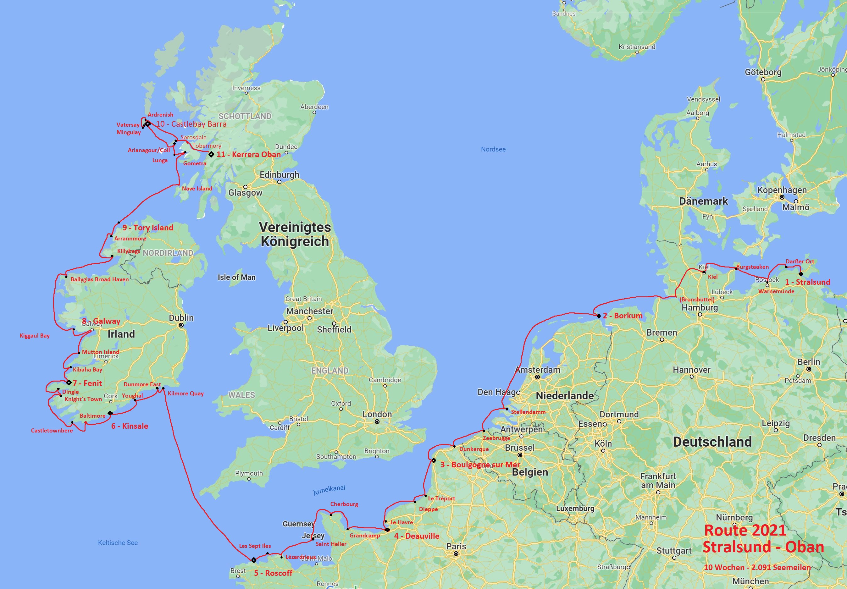 Die Reise hat uns 2021 in 10 Wochen von Stralsund entlang der Küste von Deutschland, den Niederlanden, Belgien, Frankreich, Irland in die Inselwelt Schottlands an 48 Ziele gebracht. Wir haben dabei 2.091 Seemeilen zurückgelegt. Wir haben sehr gutes Wetter, aber auch weniger gutes gehabt, den einen oder anderen Starkwind abgewettert und einige Flauten überwunden. Es waren schöne Etappen mit guten Freunden und vielen guten Erinnerungen, aber auch mit Auswirkungen der Covid-Pandemie sowie mit technischen Problemen am Schiff, die zu lösen waren und noch sind. ANKE-SOPHIE wird auf Kerrera bei Oban überwintern und nächstes Jahr soll es weiter Richtung Norden über die Orkney Islands und vielleicht über die Shetland Islands nach Norwegen gehen.