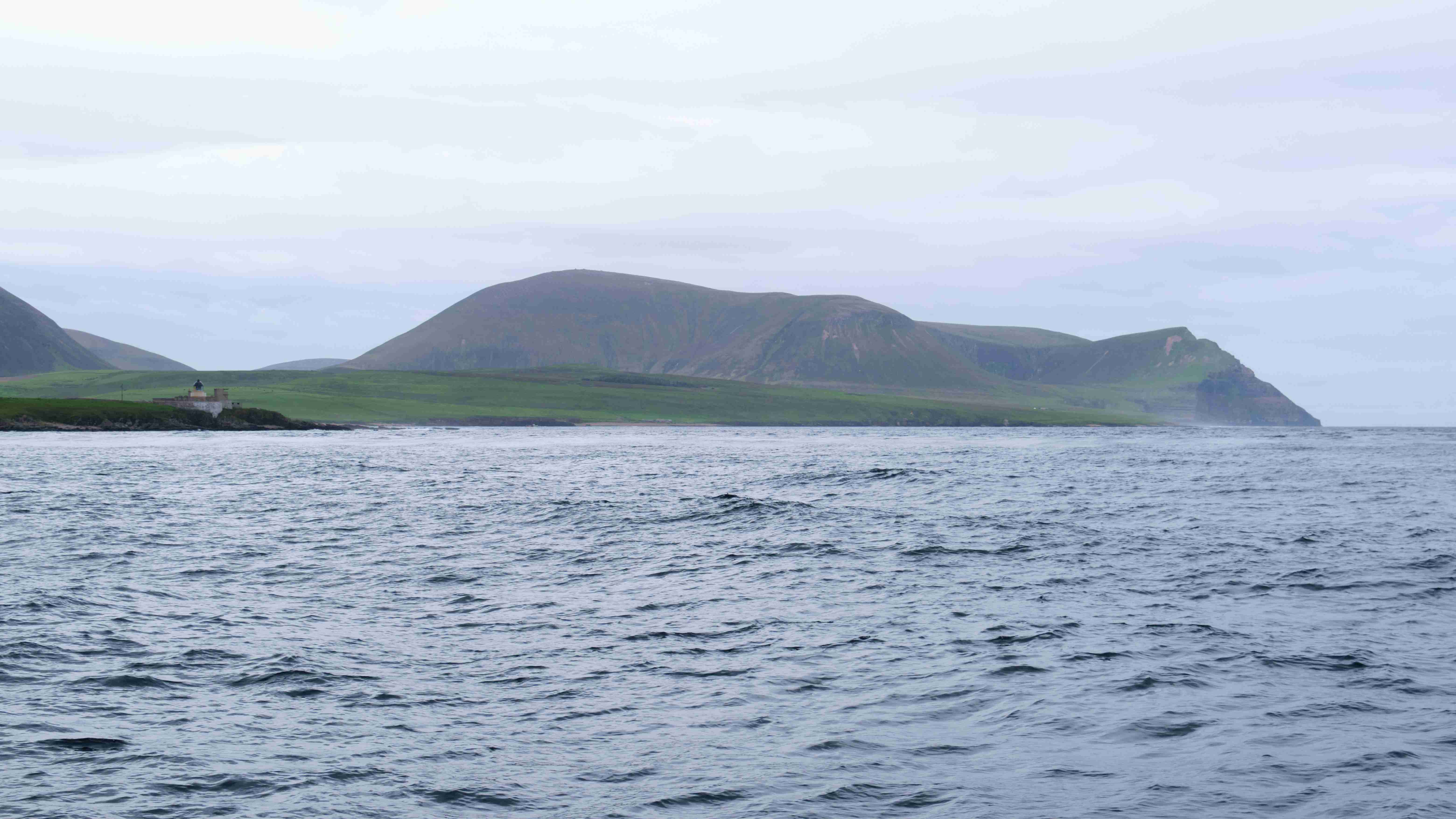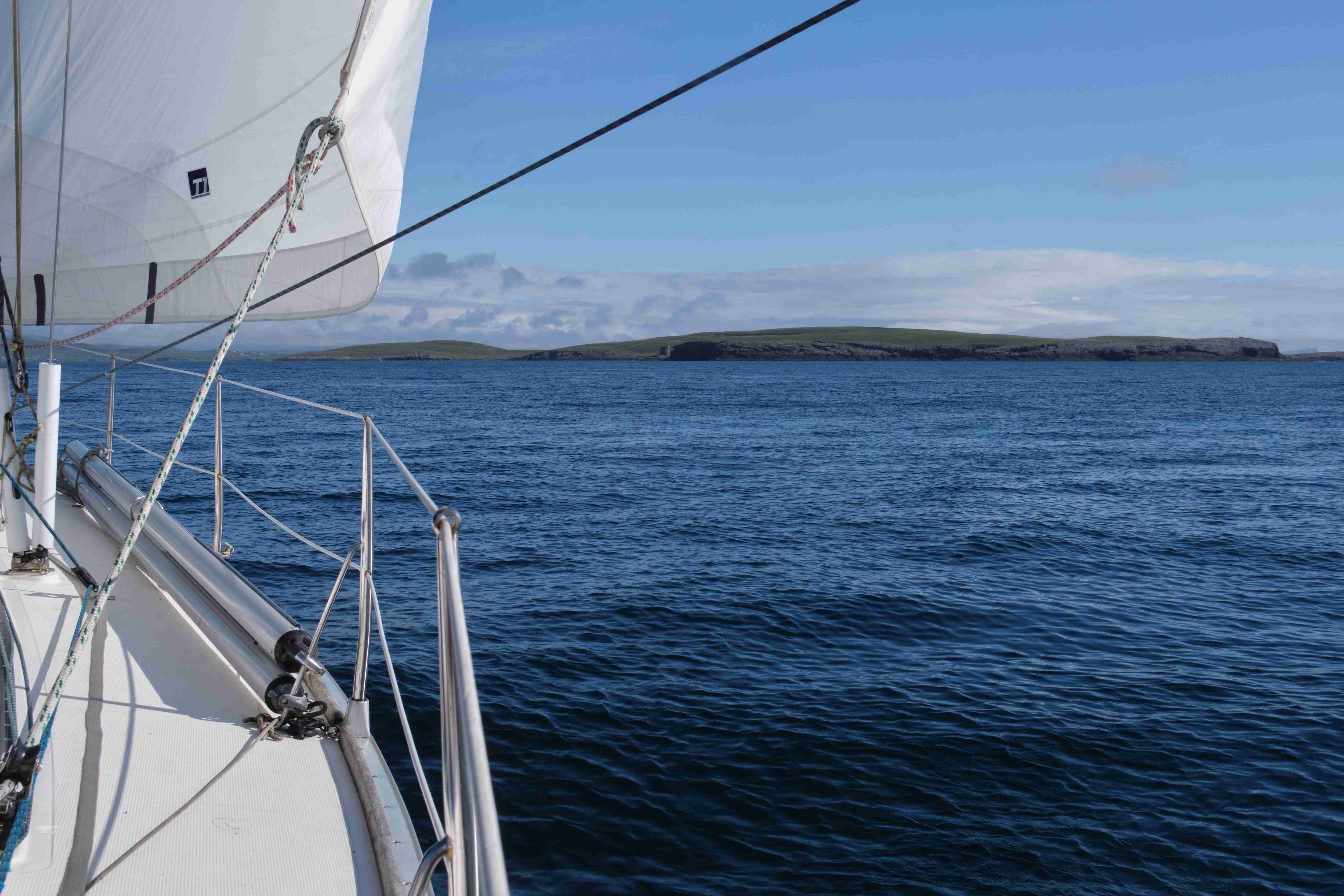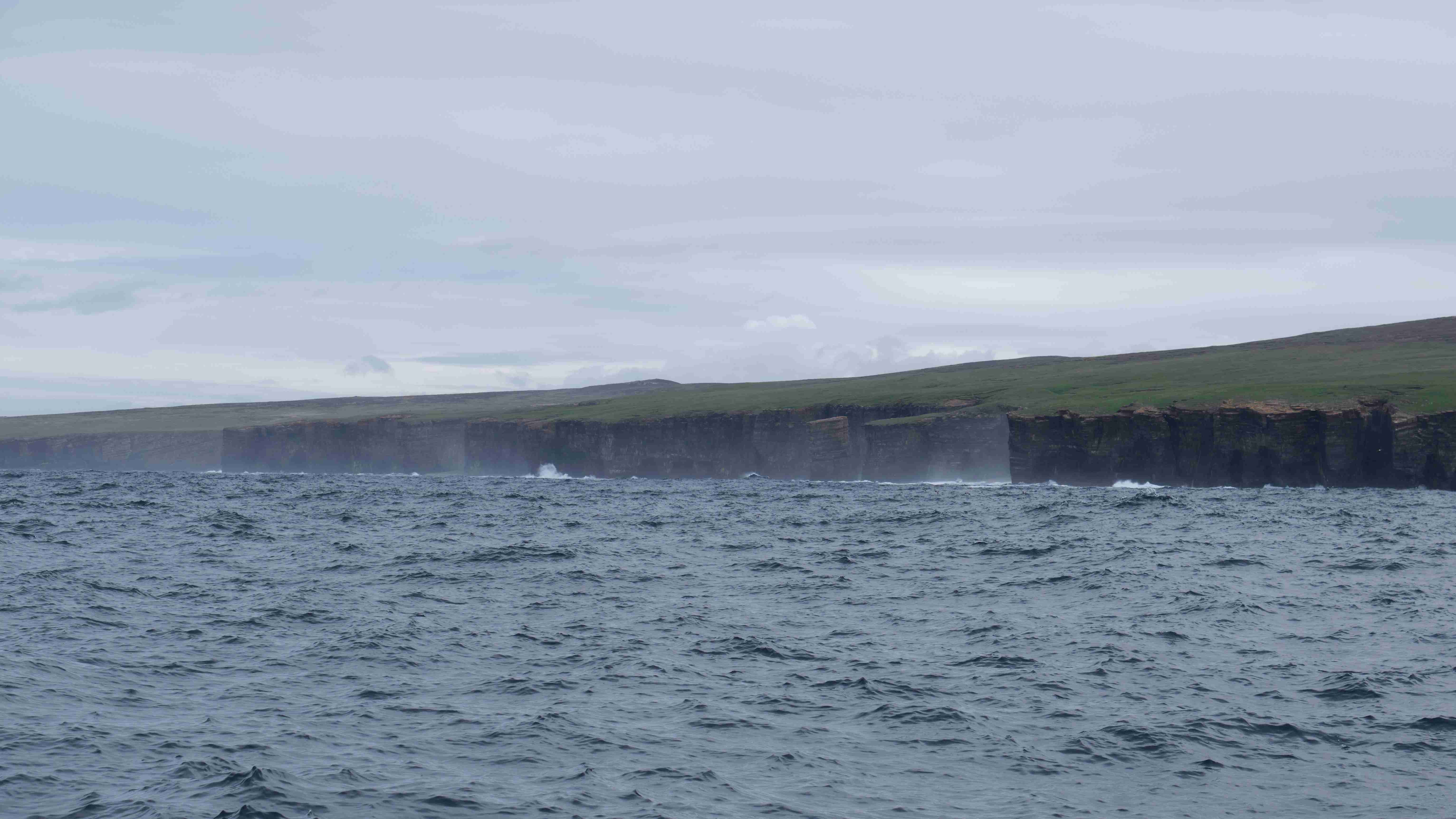 Da wir nun drei Tage mit ruhigem Wetter vor uns haben, entscheiden wir uns, das Kulturprogramm über die Orkney Inseln in Stromness zu streichen und lieber stattdessen das Zeitfenster zu nutzen, um über Fair Isle zu den Shetlands überzusetzen. Also verlassen wir gleich wieder am nächsten Morgen Stromness, um dem Küstenverlauf der Orkney Inseln zu folgen. Für die Ausfahrt haben wir das Kentern der Strömung für 10:30 Uhr ermittelt. Aber wir müssen noch einkaufen und sind eine halbe Stunde zu spät im Sound of Moy, was wir sofort zu spüren bekommen. Wir müssen durch eine extrem kurze steile stehende Welle mit Maschine gegenan kämpfen. Das Boot knallt von Welle zu Welle, bis wir endlich frei sind. Leider ist der Wind schwächer als vorhergesagt und die Dünung viel stärker als erwartet, sodass wir die Segel gleich wieder bergen müssen. Uns bleibt nur, neun Stunden bis Westray zu motoren, was wir hassen. Im kleinen Hafen Pierowall können wir längsseits einer großen niederländischen Yacht liegen und legen gemeinsam am nächsten Morgen um 6 Uhr ab.