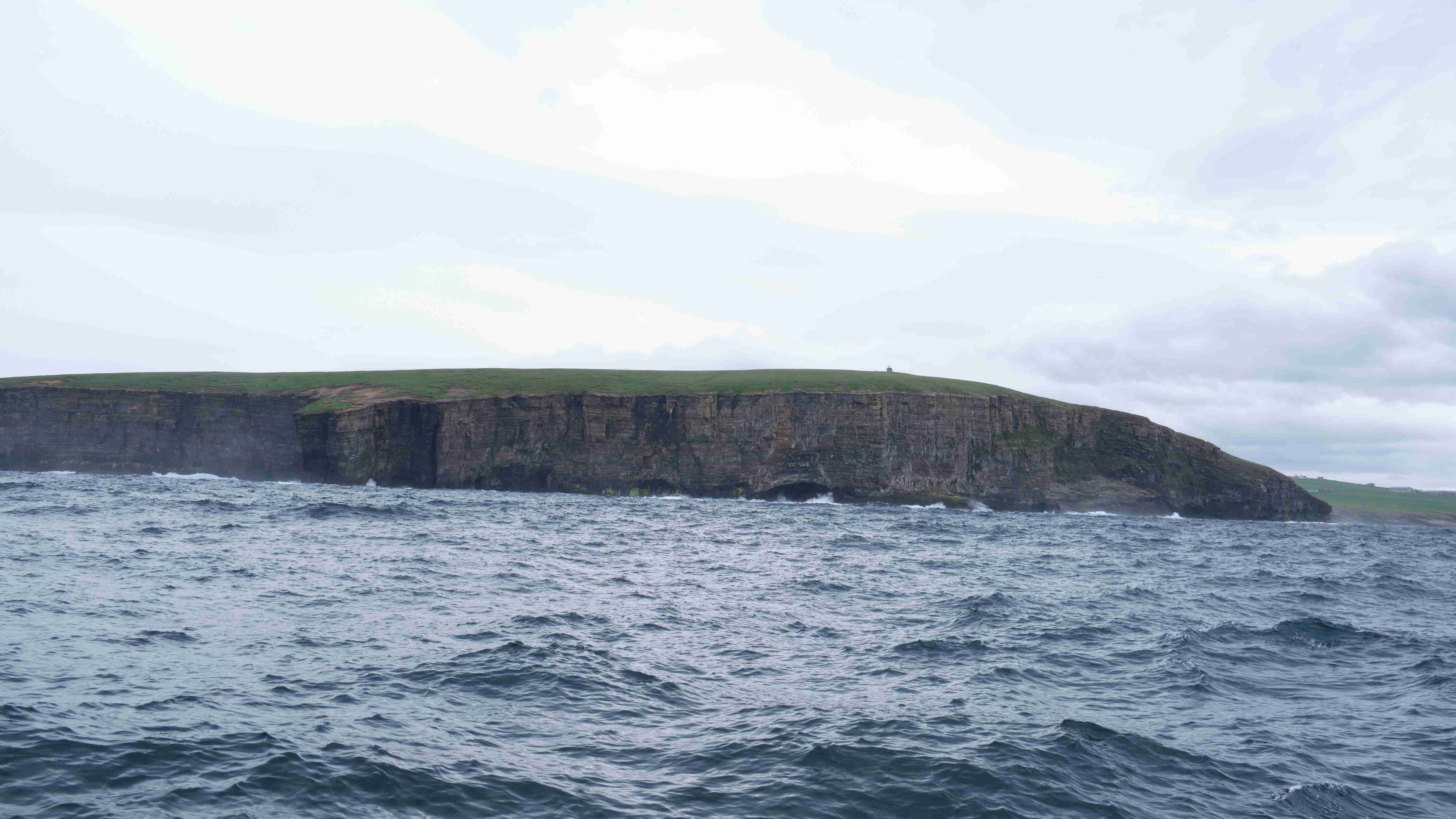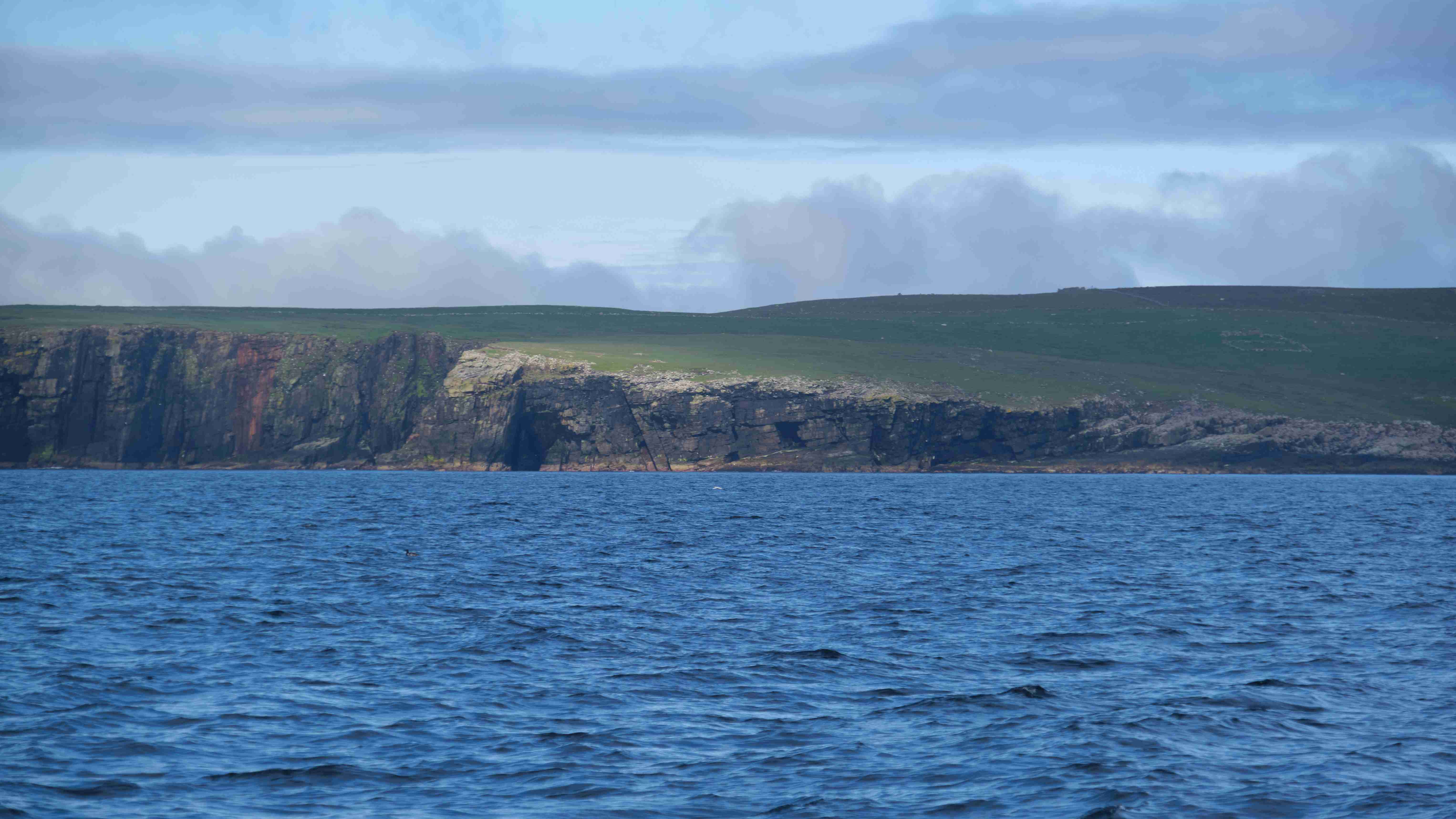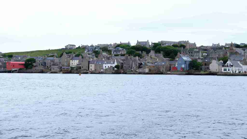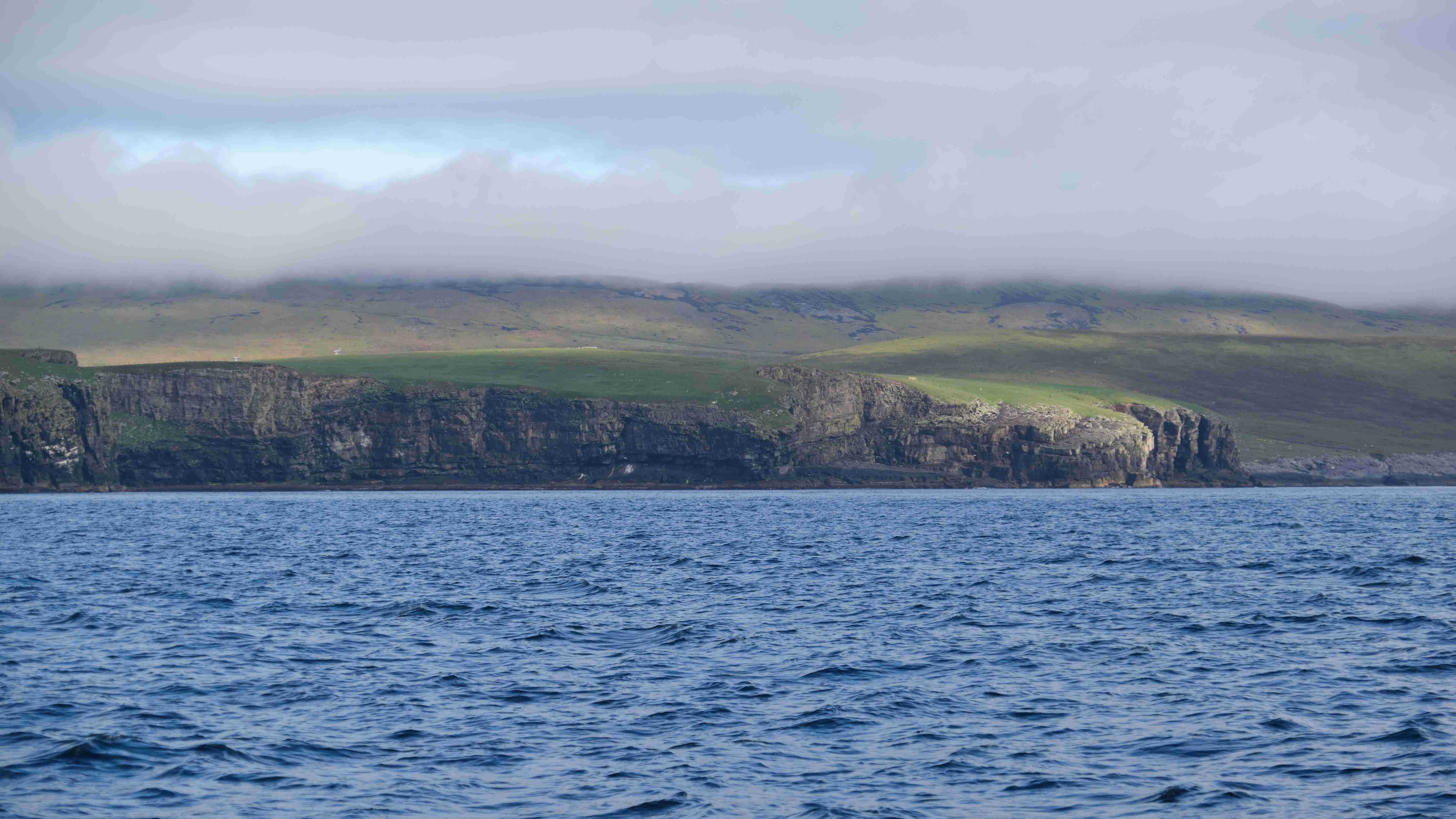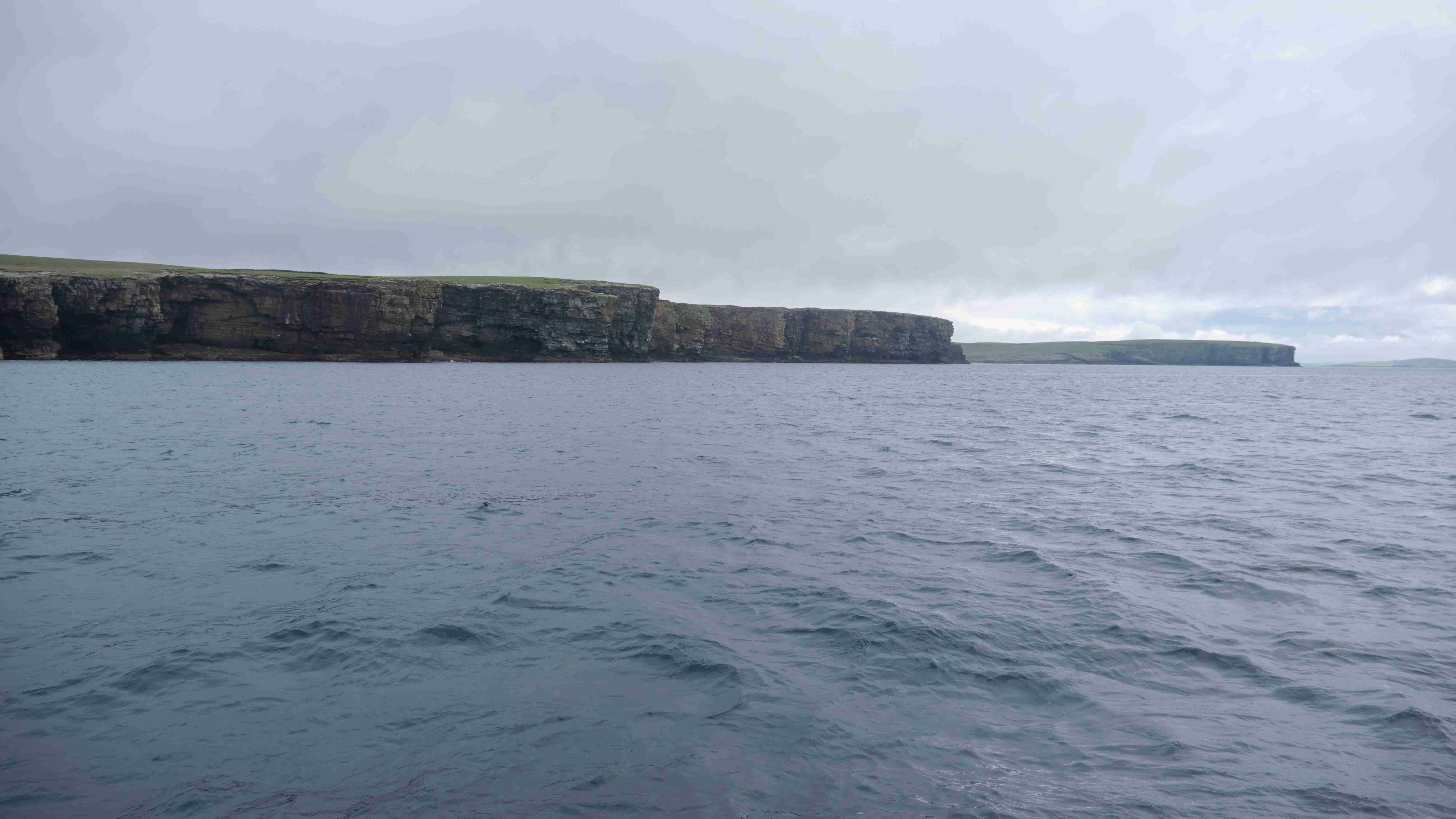 Da wir nun drei Tage mit ruhigem Wetter vor uns haben, entscheiden wir uns, das Kulturprogramm über die Orkney Inseln in Stromness zu streichen und lieber stattdessen das Zeitfenster zu nutzen, um über Fair Isle zu den Shetlands überzusetzen. Also verlassen wir gleich wieder am nächsten Morgen Stromness, um dem Küstenverlauf der Orkney Inseln zu folgen. Für die Ausfahrt haben wir das Kentern der Strömung für 10:30 Uhr ermittelt. Aber wir müssen noch einkaufen und sind eine halbe Stunde zu spät im Sound of Moy, was wir sofort zu spüren bekommen. Wir müssen durch eine extrem kurze steile stehende Welle mit Maschine gegenan kämpfen. Das Boot knallt von Welle zu Welle, bis wir endlich frei sind. Leider ist der Wind schwächer als vorhergesagt und die Dünung viel stärker als erwartet, sodass wir die Segel gleich wieder bergen müssen. Uns bleibt nur, neun Stunden bis Westray zu motoren, was wir hassen. Im kleinen Hafen Pierowall können wir längsseits einer großen niederländischen Yacht liegen und legen gemeinsam am nächsten Morgen um 6 Uhr ab.