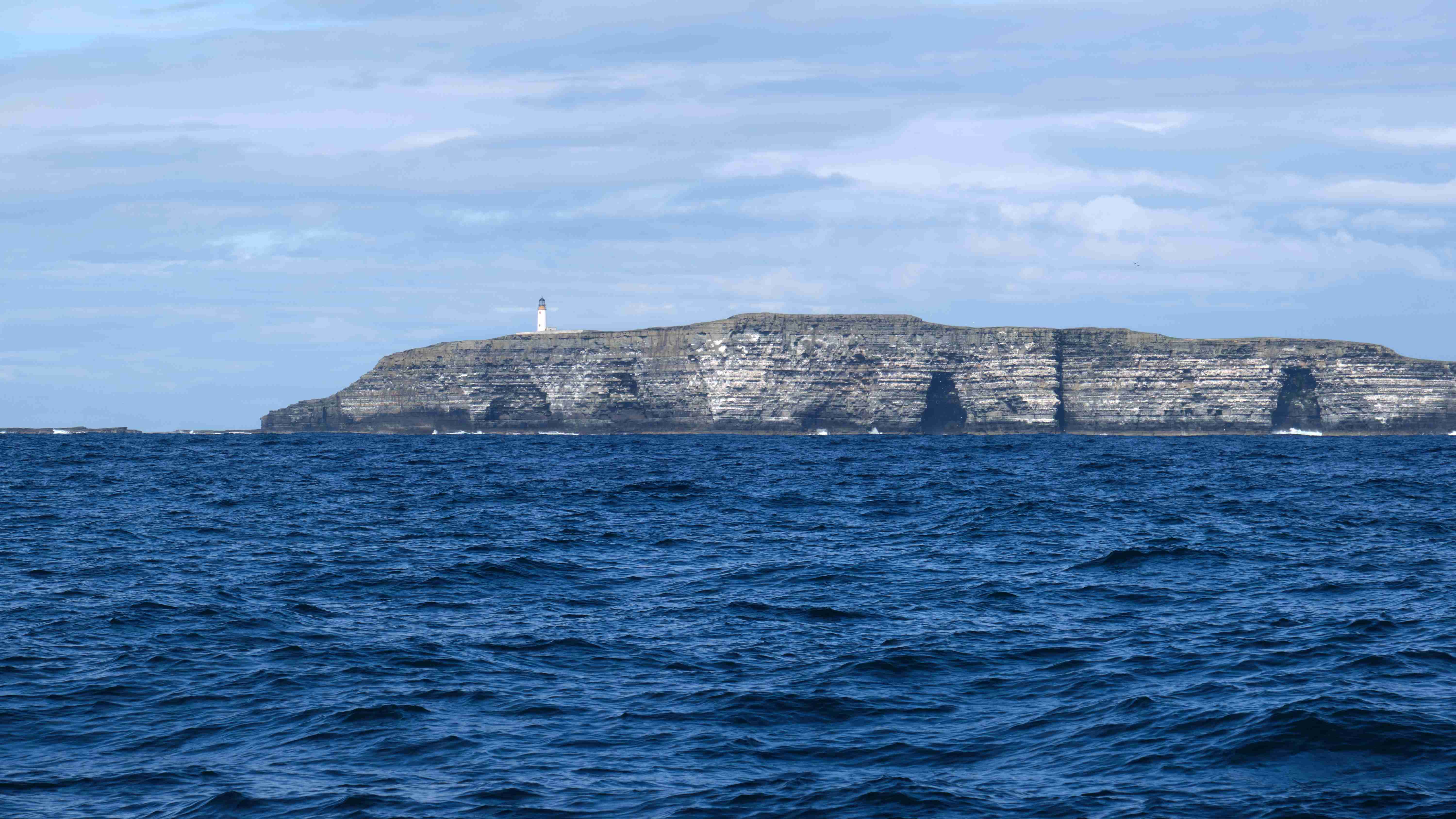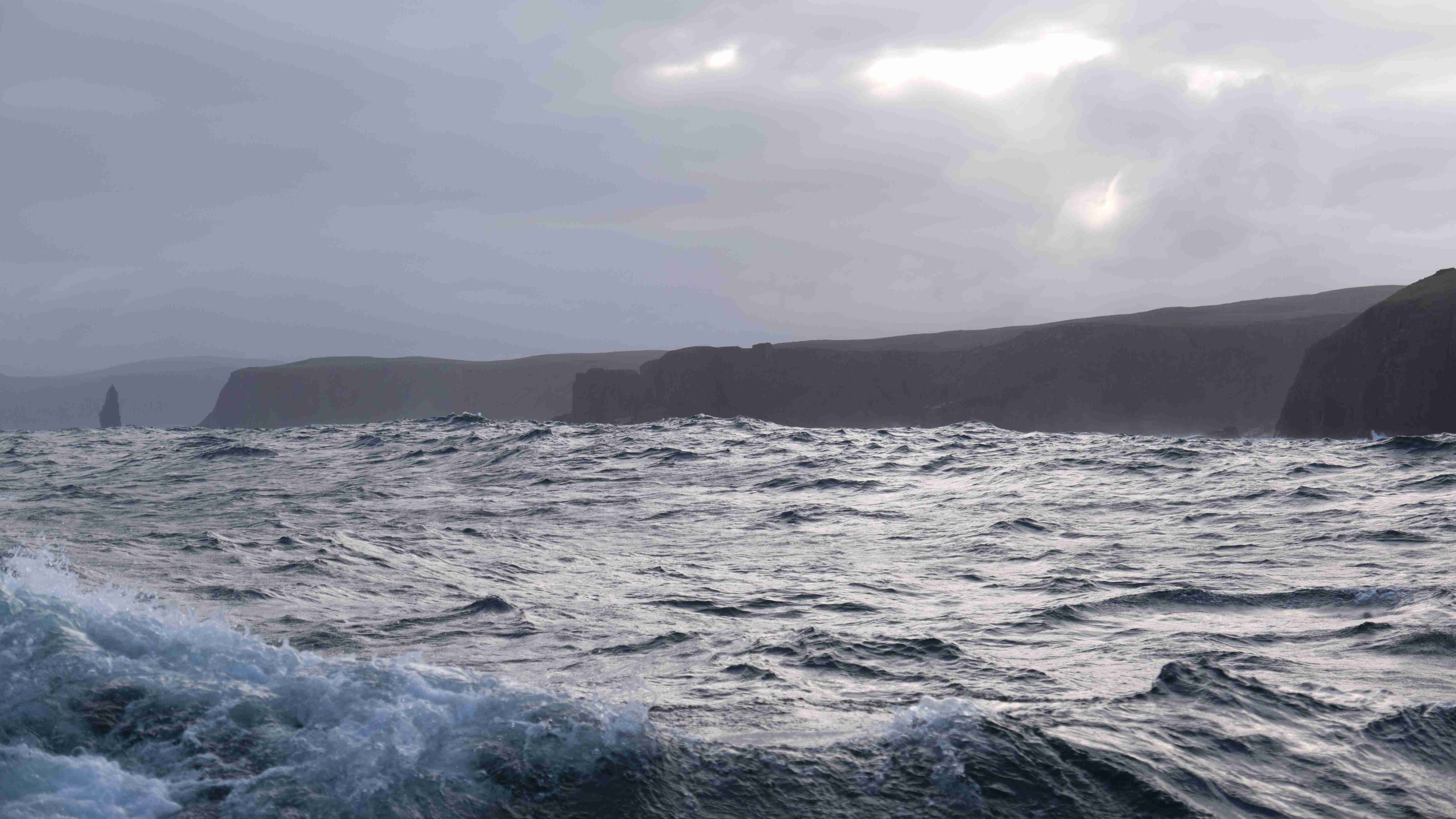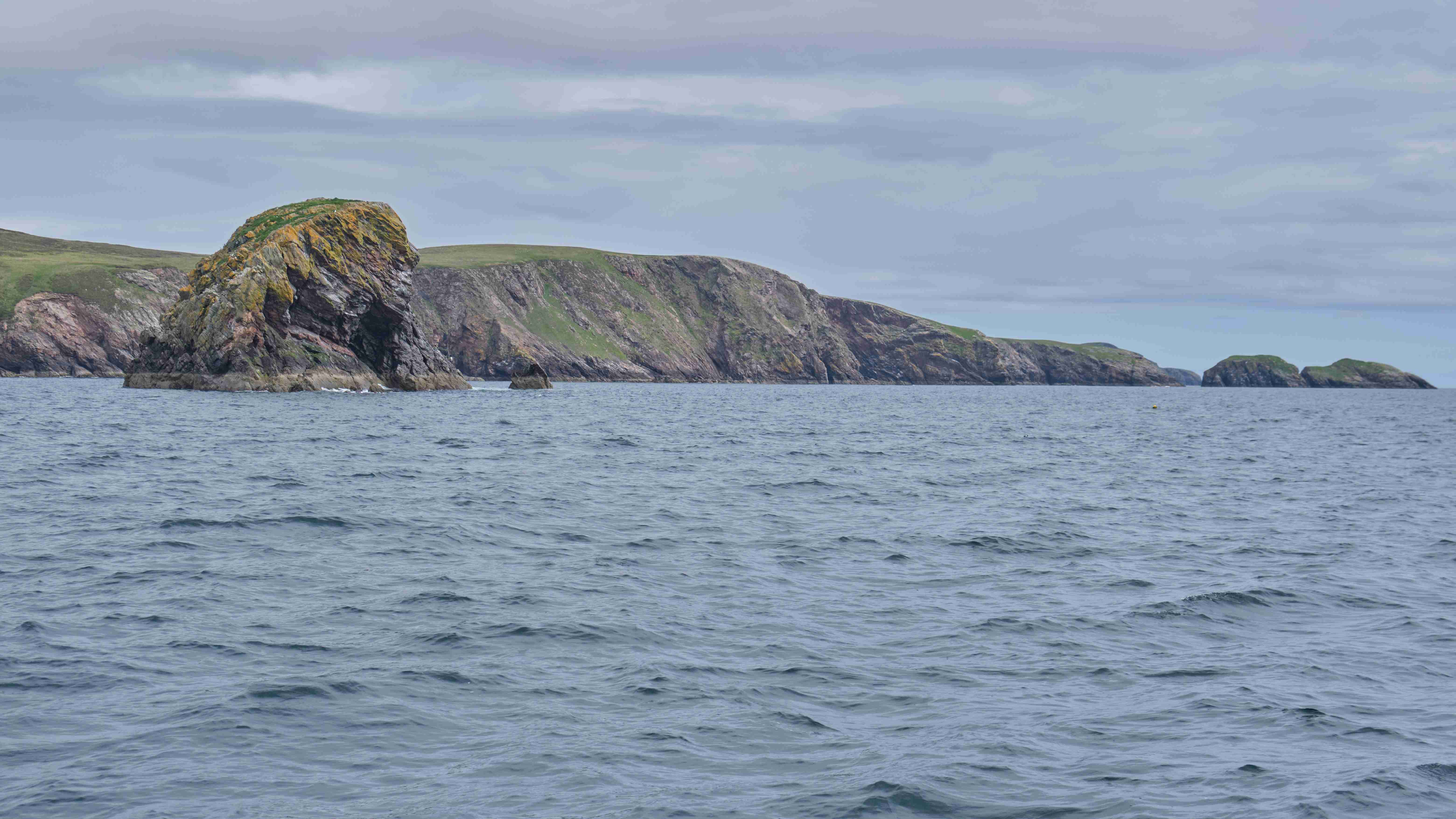 Da wir nun drei Tage mit ruhigem Wetter vor uns haben, entscheiden wir uns, das Kulturprogramm über die Orkney Inseln in Stromness zu streichen und lieber stattdessen das Zeitfenster zu nutzen, um über Fair Isle zu den Shetlands überzusetzen. Also verlassen wir gleich wieder am nächsten Morgen Stromness, um dem Küstenverlauf der Orkney Inseln zu folgen. Für die Ausfahrt haben wir das Kentern der Strömung für 10:30 Uhr ermittelt. Aber wir müssen noch einkaufen und sind eine halbe Stunde zu spät im Sound of Moy, was wir sofort zu spüren bekommen. Wir müssen durch eine extrem kurze steile stehende Welle mit Maschine gegenan kämpfen. Das Boot knallt von Welle zu Welle, bis wir endlich frei sind. Leider ist der Wind schwächer als vorhergesagt und die Dünung viel stärker als erwartet, sodass wir die Segel gleich wieder bergen müssen. Uns bleibt nur, neun Stunden bis Westray zu motoren, was wir hassen. Im kleinen Hafen Pierowall können wir längsseits einer großen niederländischen Yacht liegen und legen gemeinsam am nächsten Morgen um 6 Uhr ab.