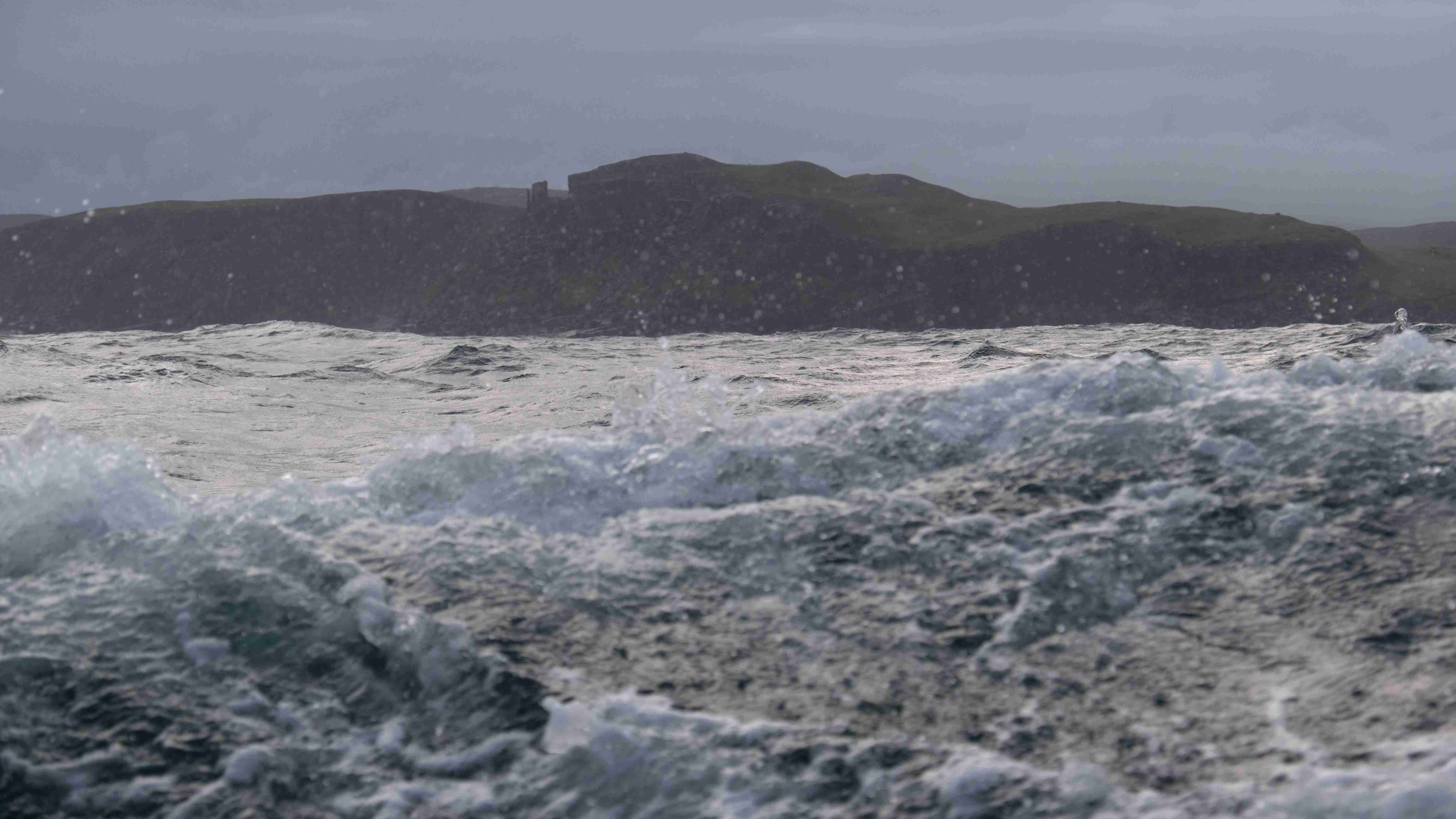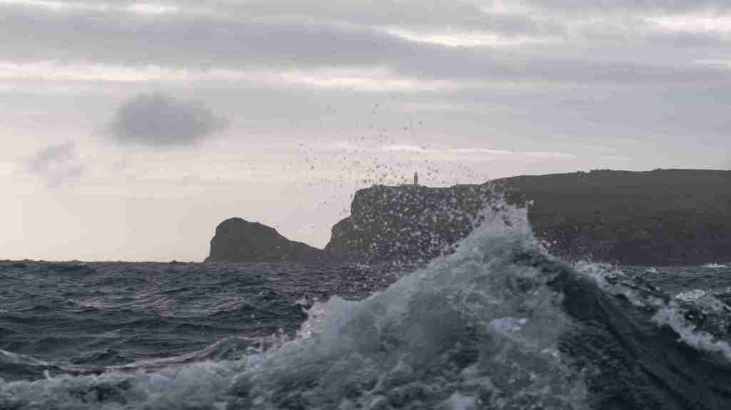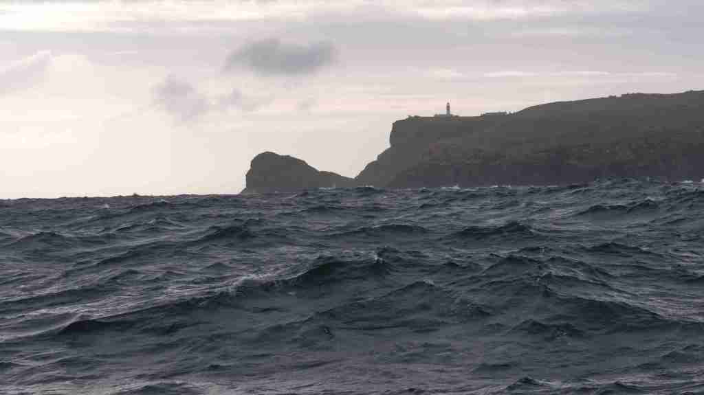 Auf See erwartet uns eine mächtige Welle, die ich am besten mit der folgenden Serie vom Cape Warth aufzeige. Auf der Welle sieht man die Cape Wrath, in der Welle nur die Spitze vom Leuchtturm.