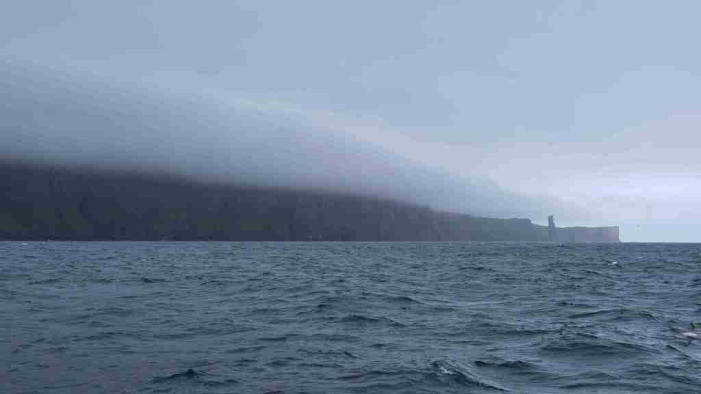 Wir kommen dann so gut voran, dass wir sogar die Geschwindigkeit reduzieren, um nicht zu früh anzukommen, denn es gilt die Situation Wind gegen Strom im Sund zu vermeiden. Dann erreichen wir die Orkney-Inseln am Sound zwischen Mainland und Moy. Vor Moy steht der eine Felsnadel „Old man of Moy“.