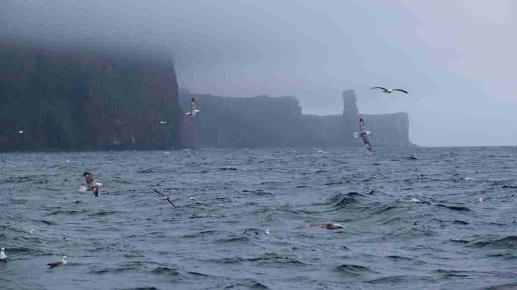 Nach einer sehr schönen Überfahrt bei leichtem Wind und mäßiger Welle -auch das gibt es also hier oben- segeln wir einem von mir lange ersehntem Ziel entgegen: Fair Isle. Durch Berichte anderer Segler ist mir die Insel allgegenwärtig und ich freue mich auf Fridarey (die friedvolle Insel) oder Fara (die entlegene Insel), wie ihr nordischer Name lautet. Sie liegt zwischen den Orkney und den Shetland-Inseln. Im natürlichen Nordhafen haben schon viele Yachten schwere Stürme abgewettert. Wir wandern über die Südinsel bis zum Leuchtturm, haben nette Gespräche mit einem der 60 Inselbewohner und erhalten von einem britischen Vogelkundler Tipps, wo wir die ersehnten Papageientaucher bzw. Puffins finden können. Insgesamt wurden von Vogelkundlern 335 Arten im Bird Observatorium registriert.