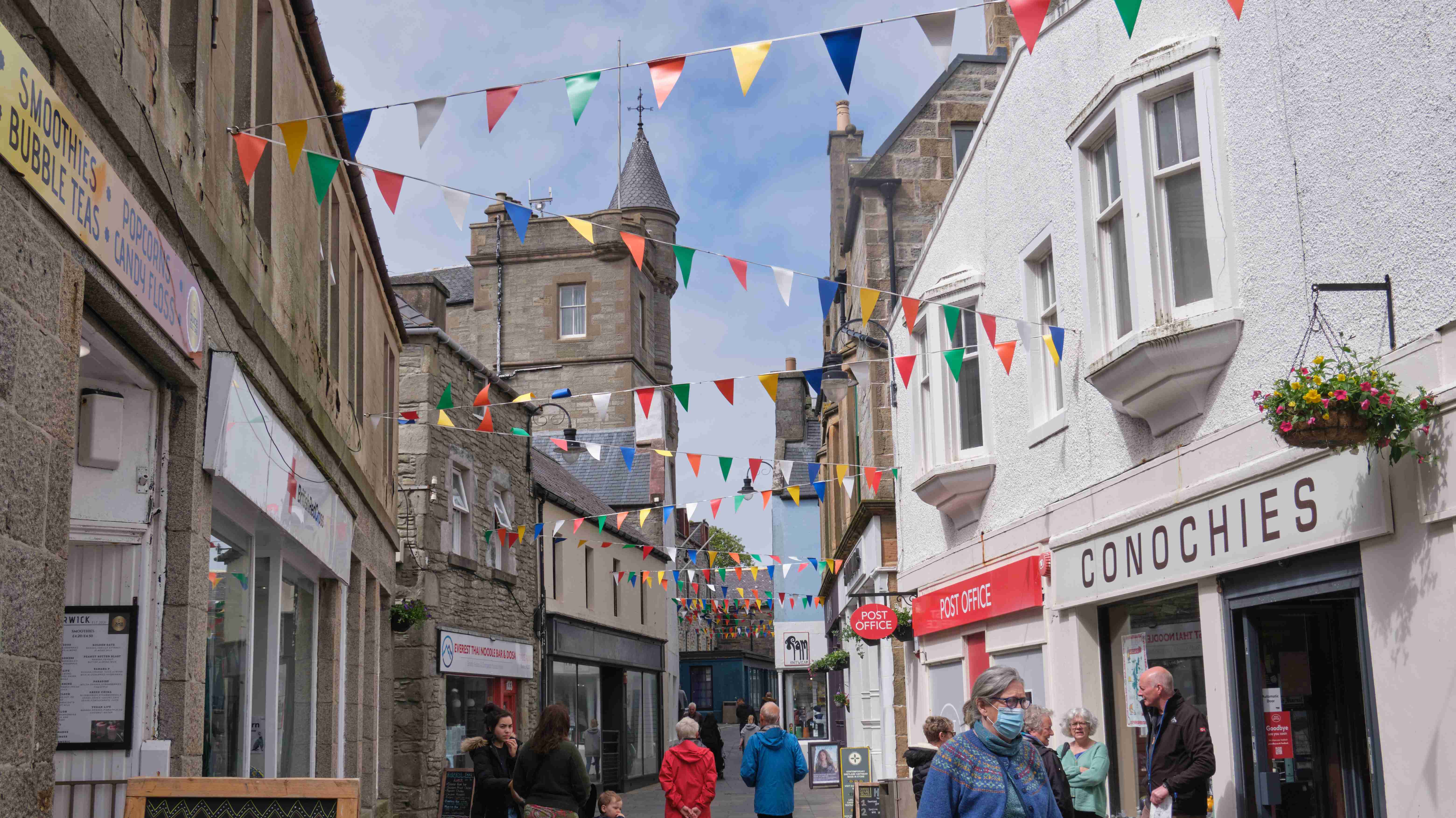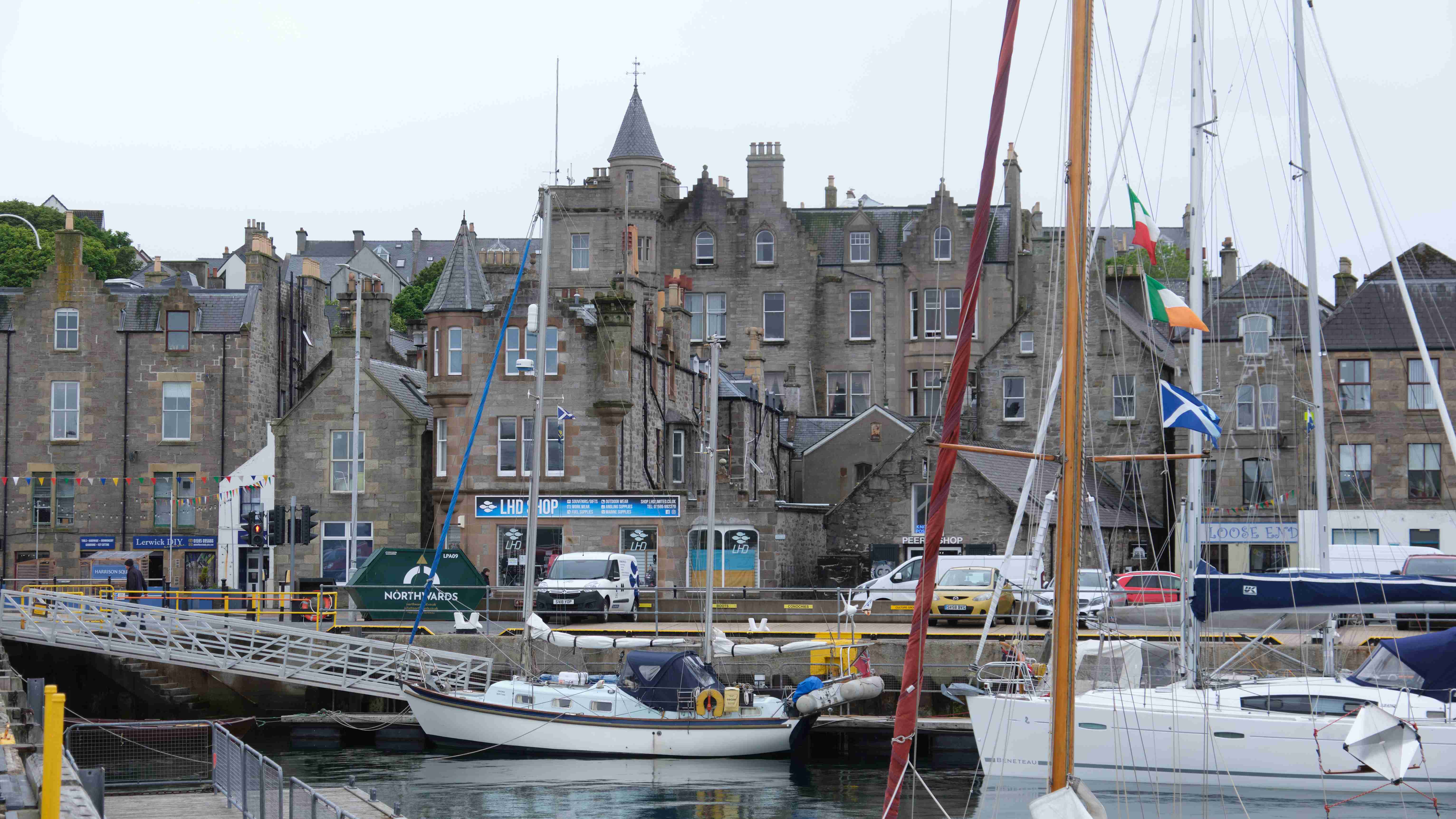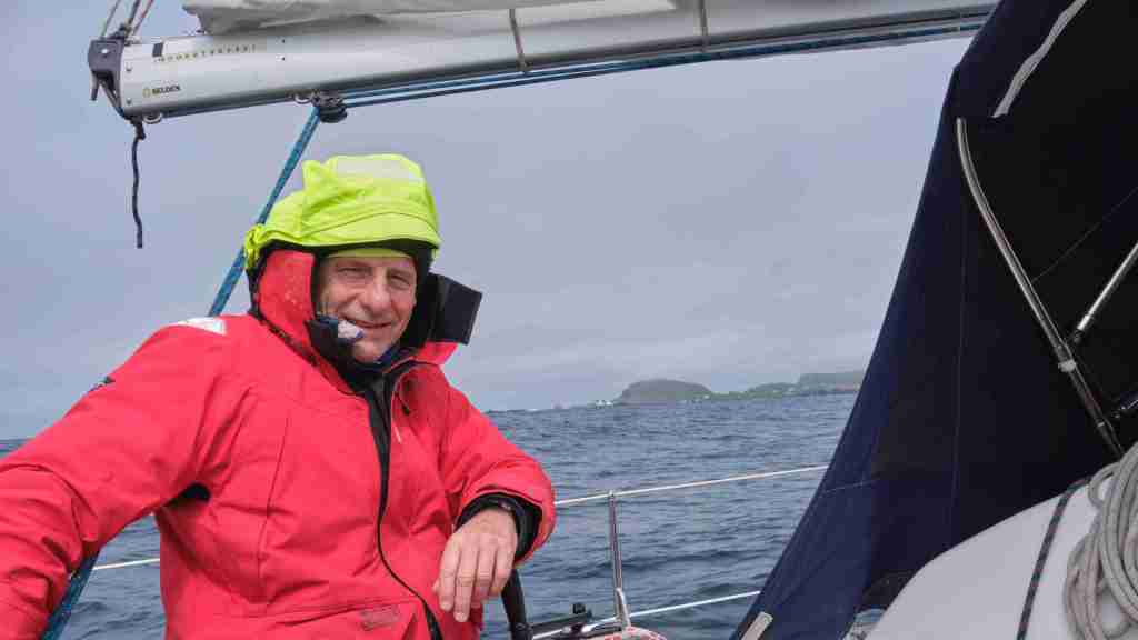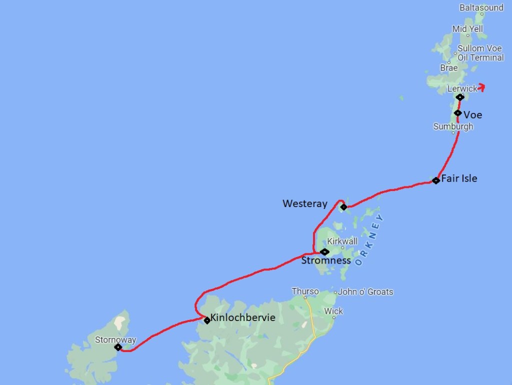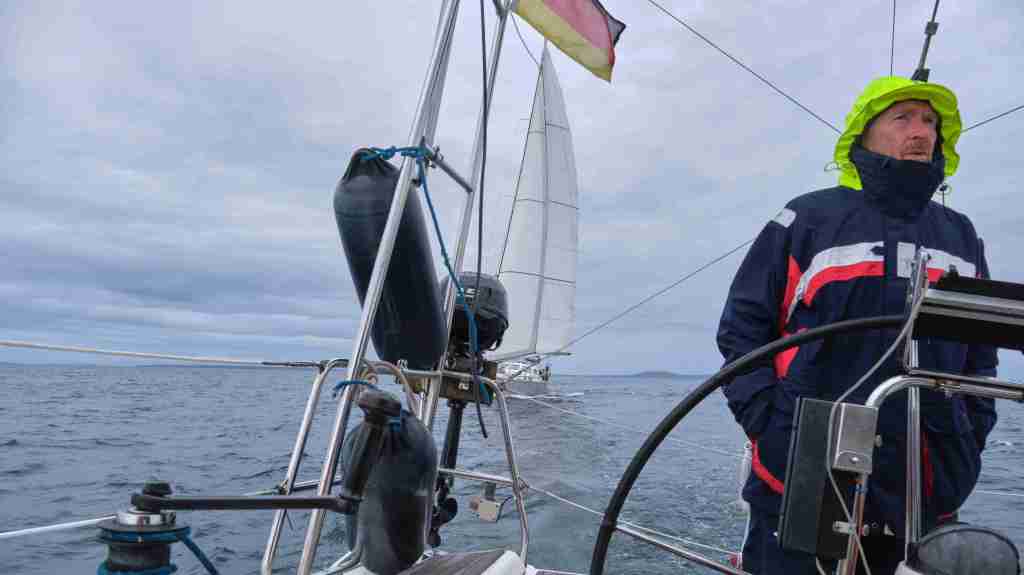 Ich bin sehr froh, dass mein Freund Thomas K. (zur Unterscheidung MacTom genannt) mich die ersten drei Wochen begleiten wird. Es ist ein gutes Gefühl, wieder zum Boot zu kommen. Wir haben einen Flug von Berlin über Amsterdam und Glasgow nach Stornoway auf den Äußeren Hebriden gebucht. Als wir am Abend ankommen, fehlt unser Gepäck. Das Flughafenpersonal lächelt gequält und erzählt uns, dass das mit KLM leider oft passieren würde. Wir lassen keine schlechte Laune aufkommen, fahren mit dem Taxi zum Hafen und entscheiden uns, im nahen Hotel essen zu gehen. Den ersten Tag an Bord nutzen wir für Reparaturen, z.B. installiere ich den Windmesser wieder auf der Mastspitze, nachdem ich ihn habe reparieren lassen. Am nächsten Morgen fahren wir zum Flughafen, um nach unserem Gepäck zu forschen. Wir erfahren, dass meines angekommen war und bereits zum Hafen geliefert wurde, aber das von Thomas fehlt immer noch. Wir vereinbaren, dass es uns hinterherfliegen soll auf unserer Route über die Orkneys zu den Shetland Inseln und MacTom kauft sich erst einmal neue Klamotten.