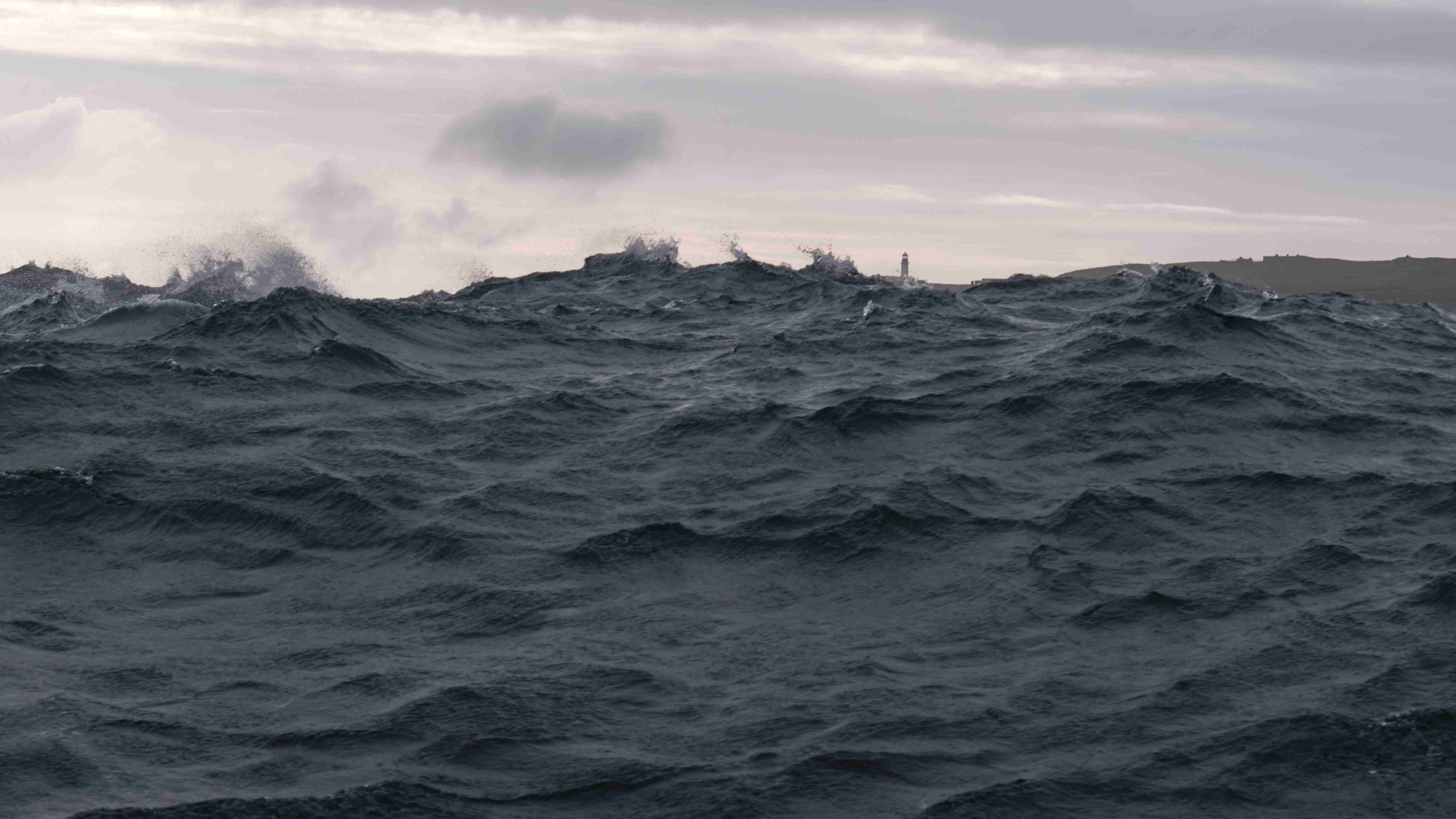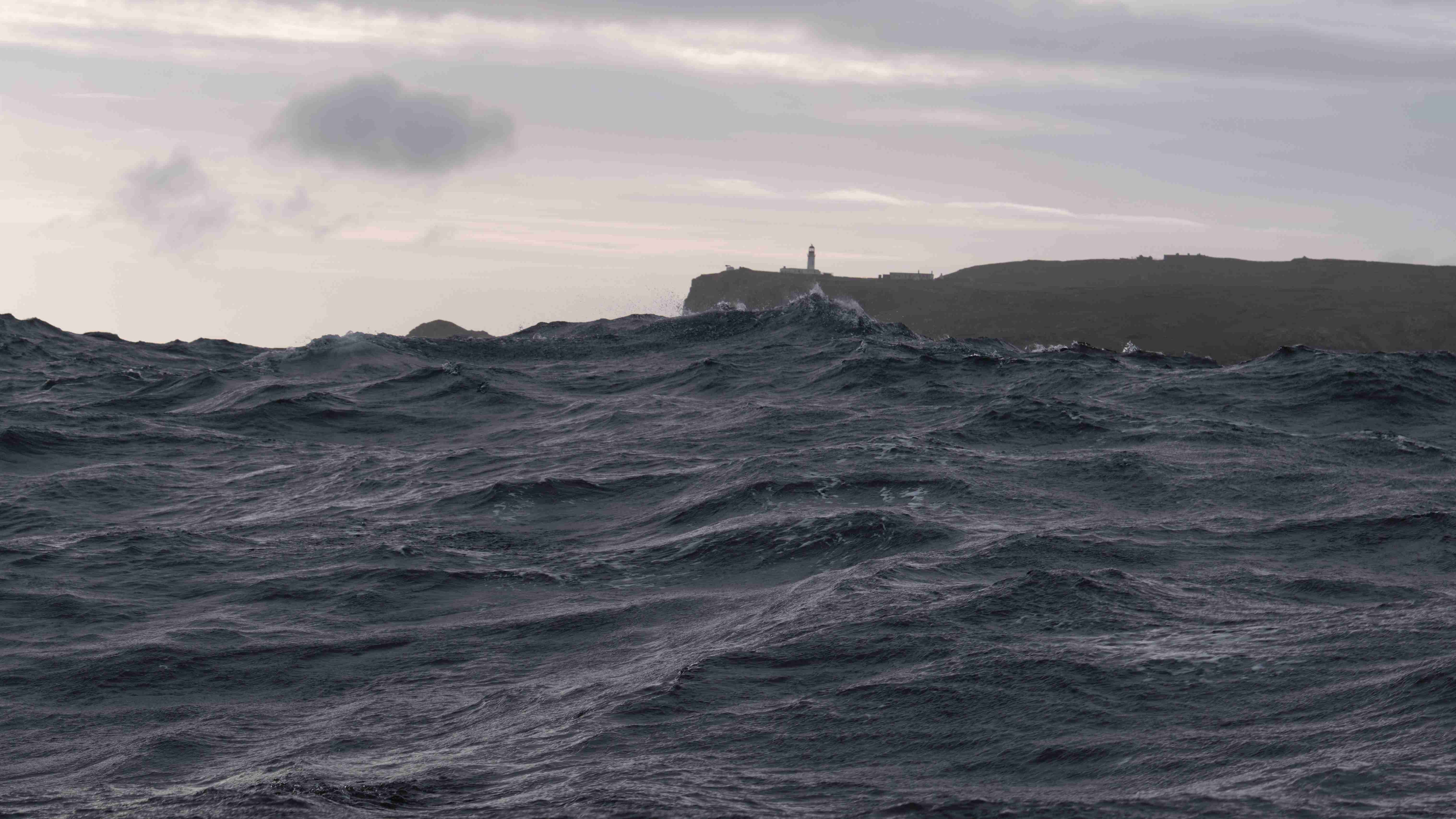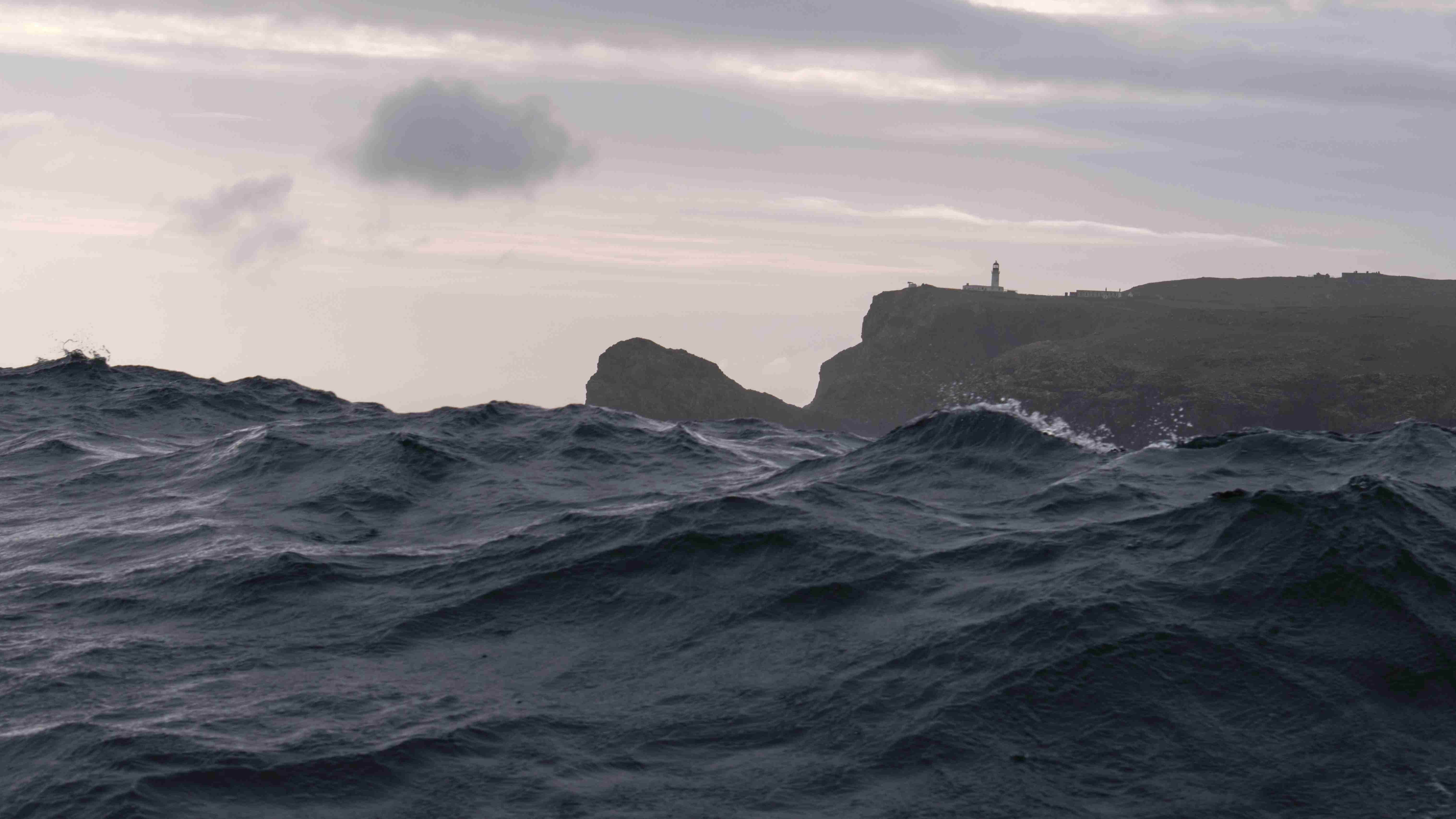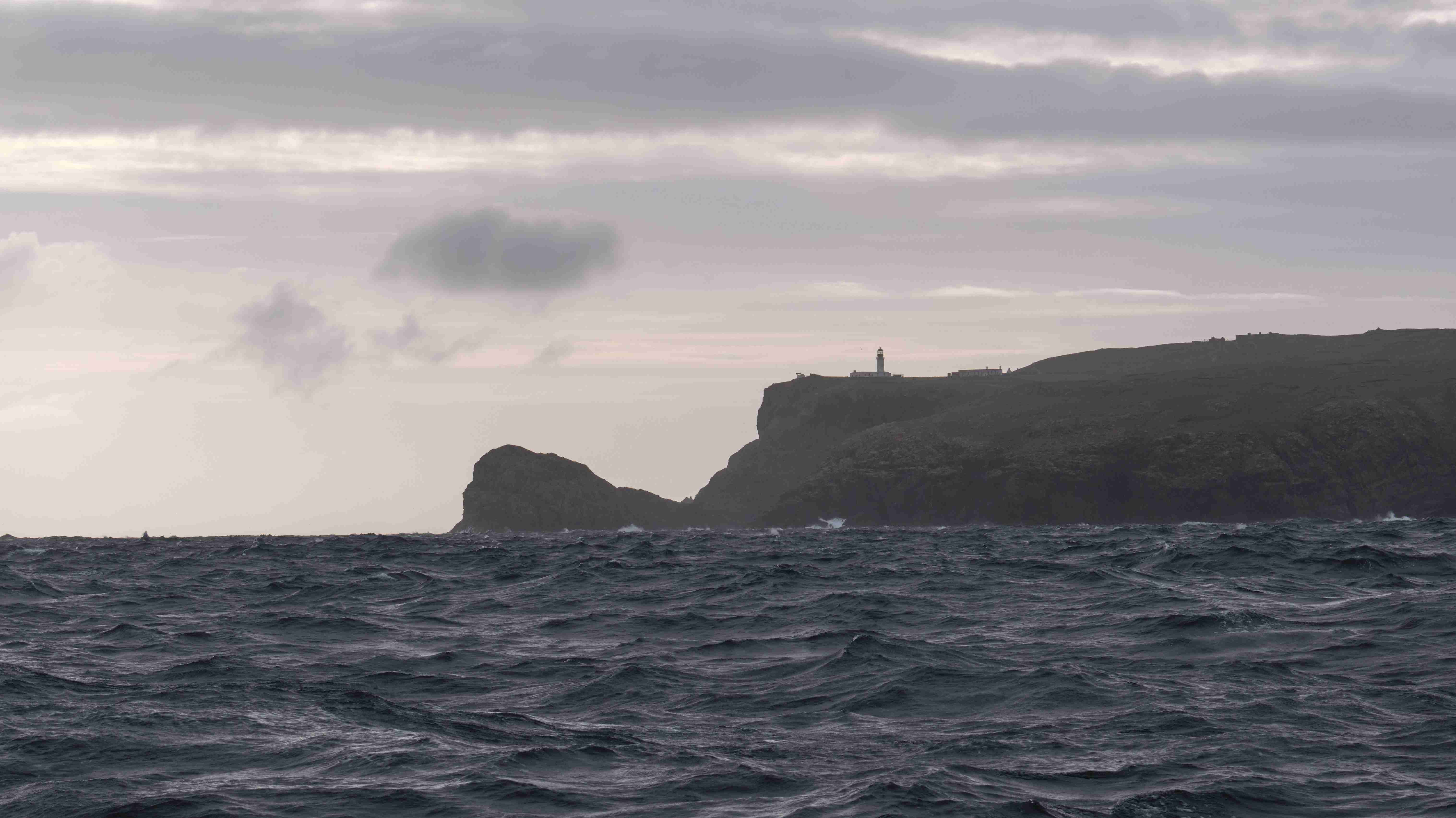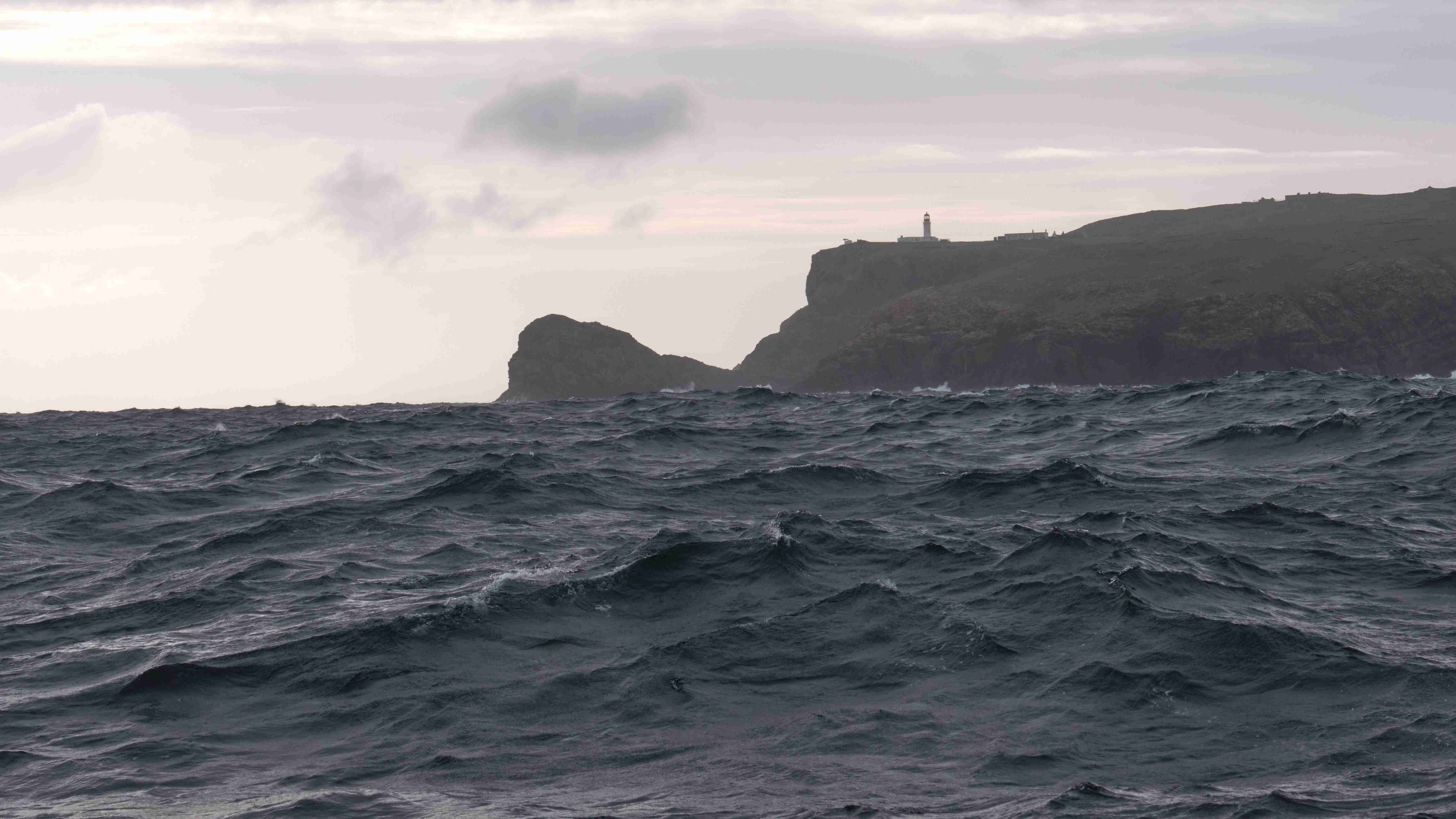 Auf See erwartet uns eine mächtige Welle, die ich am besten mit der folgenden Serie vom Cape Warth aufzeige. Auf der Welle sieht man die Cape Wrath, in der Welle nur die Spitze vom Leuchtturm.