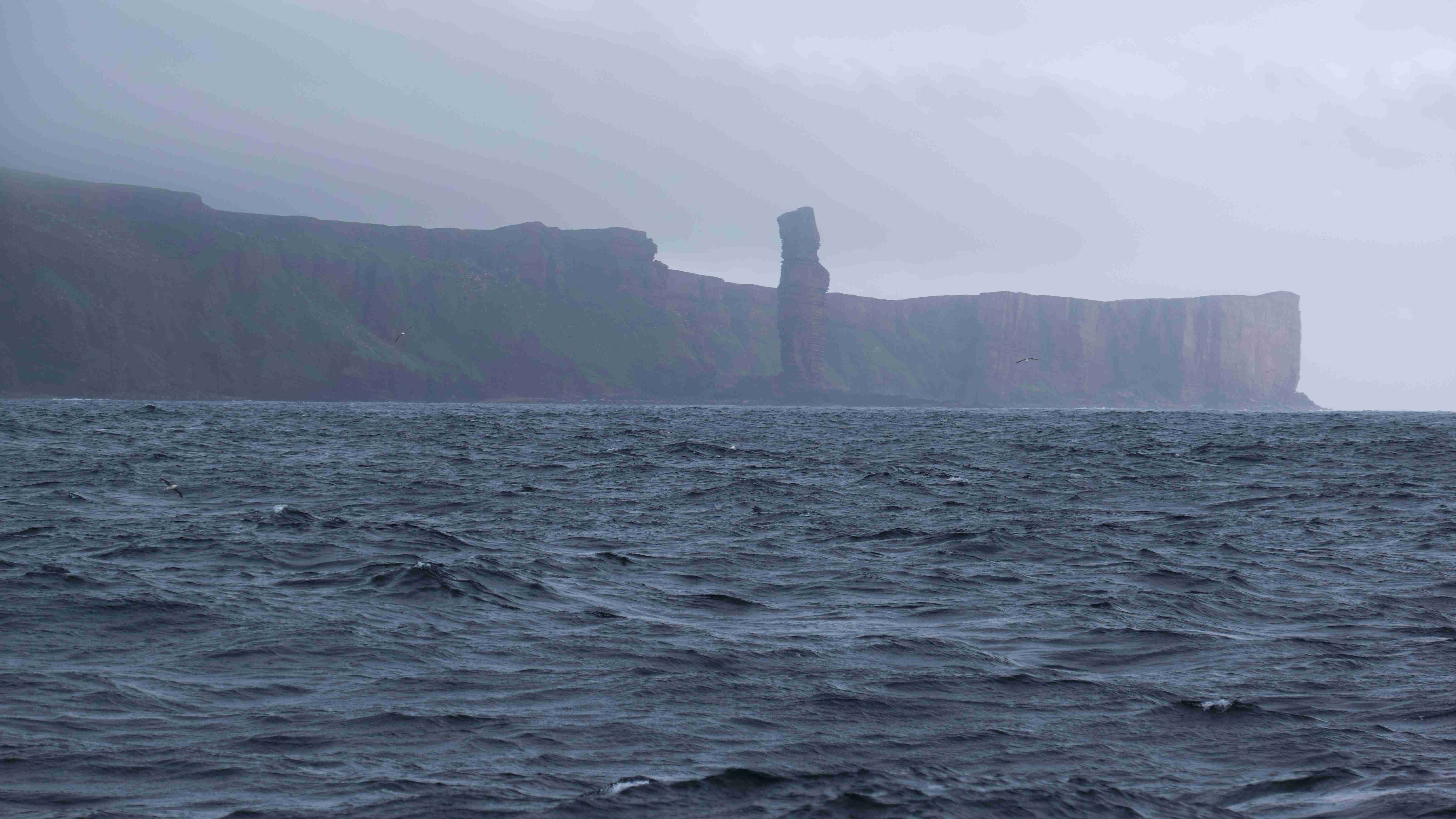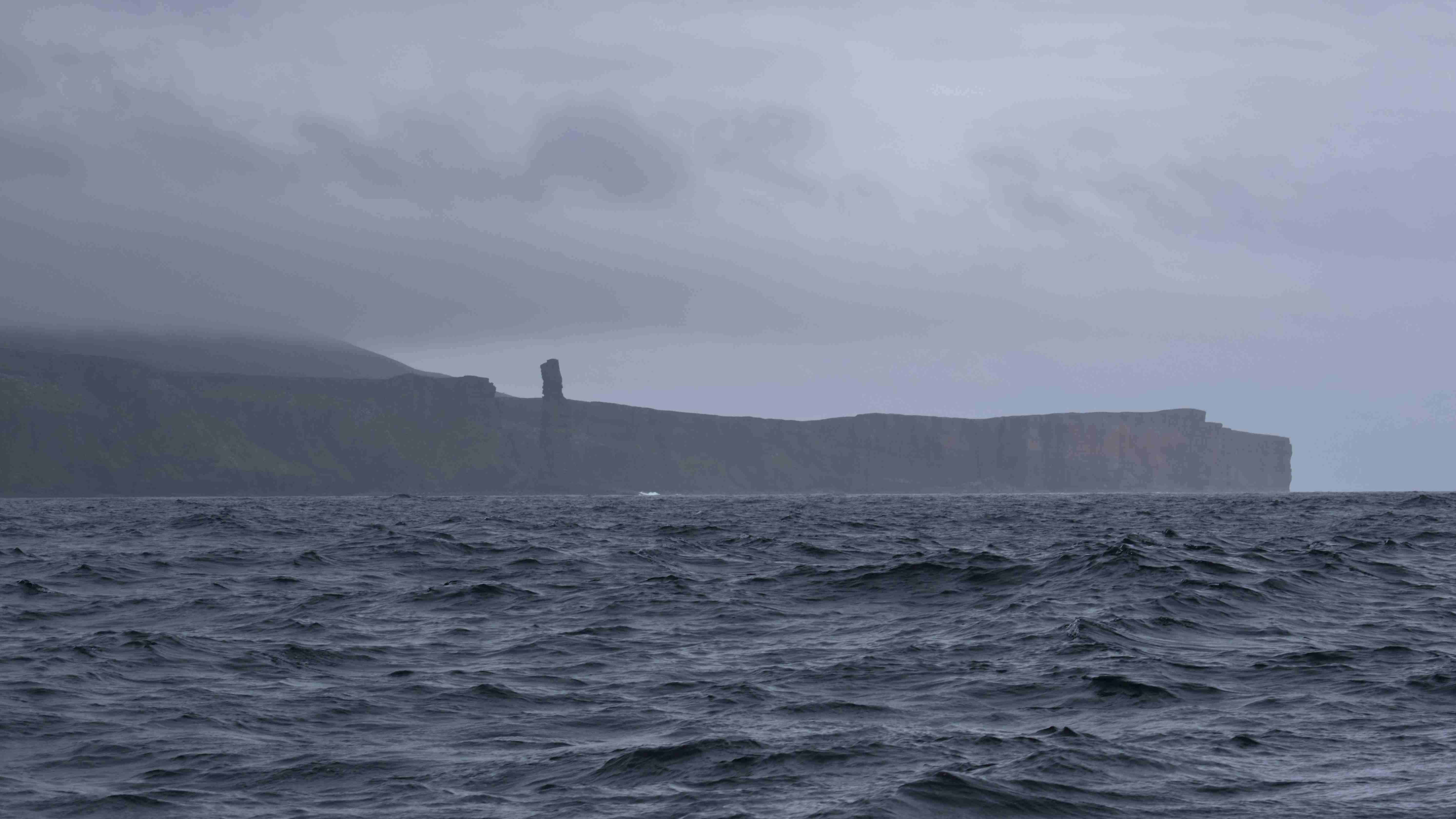 Wir kommen dann so gut voran, dass wir sogar die Geschwindigkeit reduzieren, um nicht zu früh anzukommen, denn es gilt die Situation Wind gegen Strom im Sund zu vermeiden. Dann erreichen wir die Orkney-Inseln am Sound zwischen Mainland und Moy. Vor Moy steht der eine Felsnadel „Old man of Moy“.