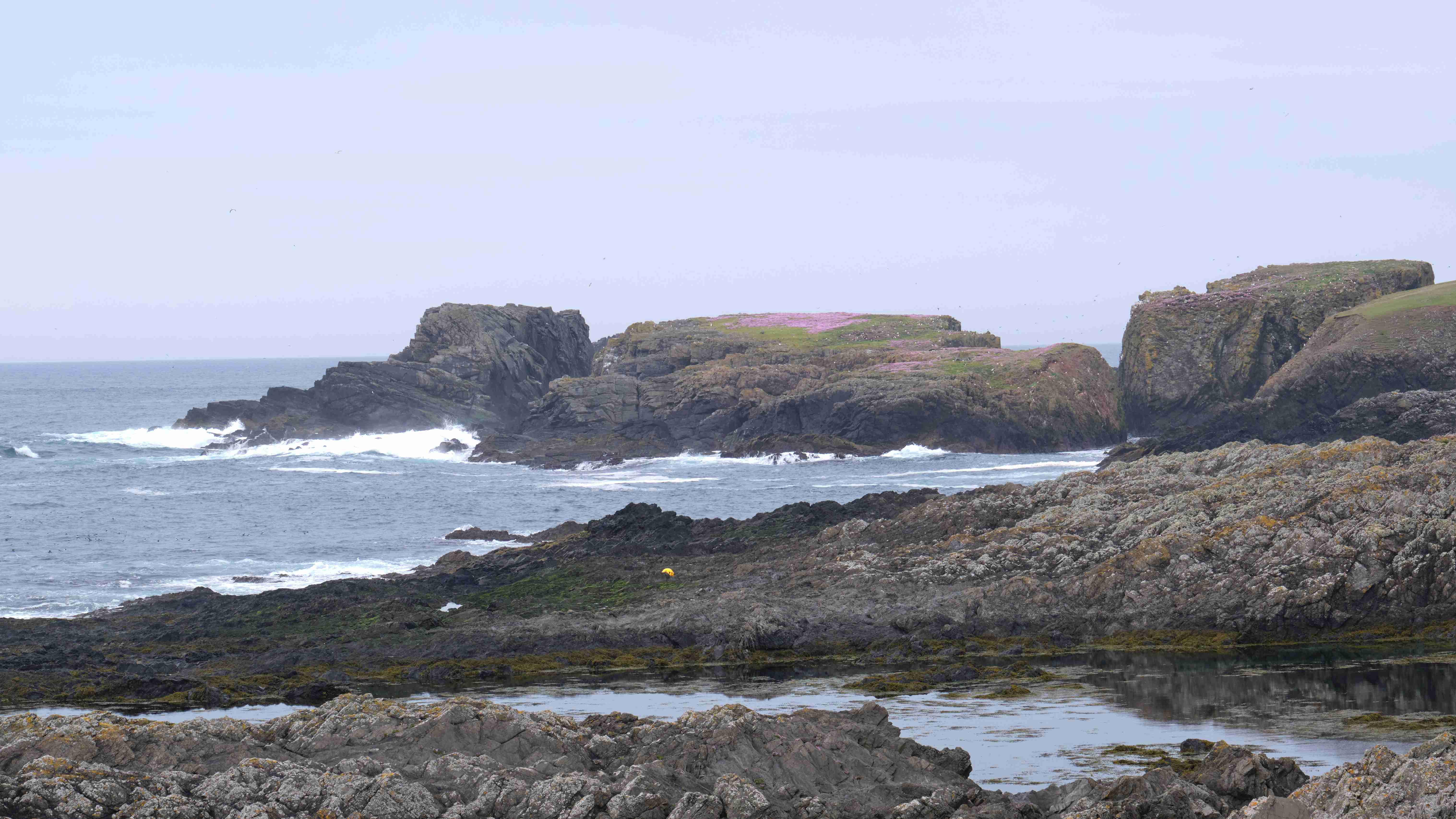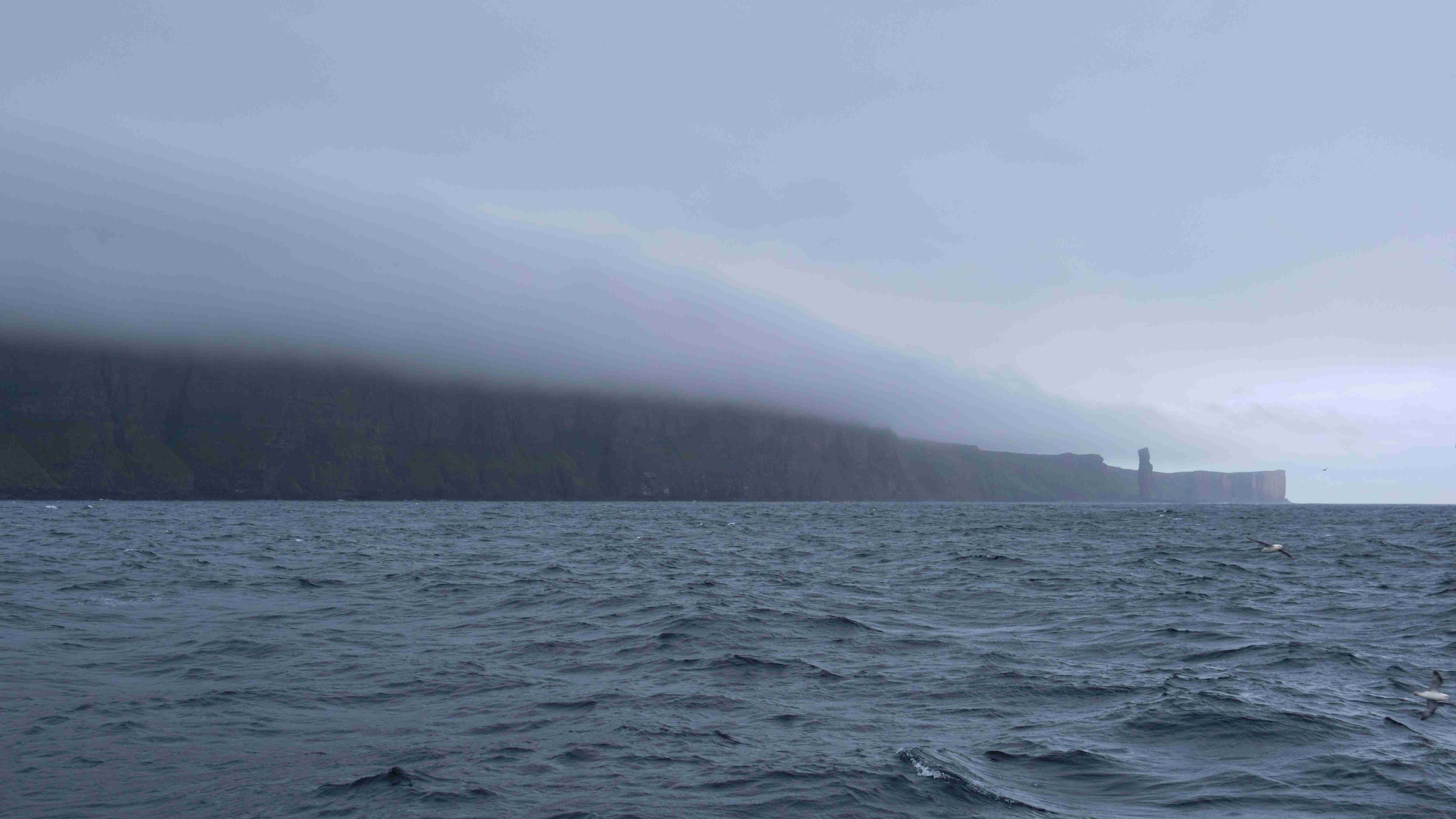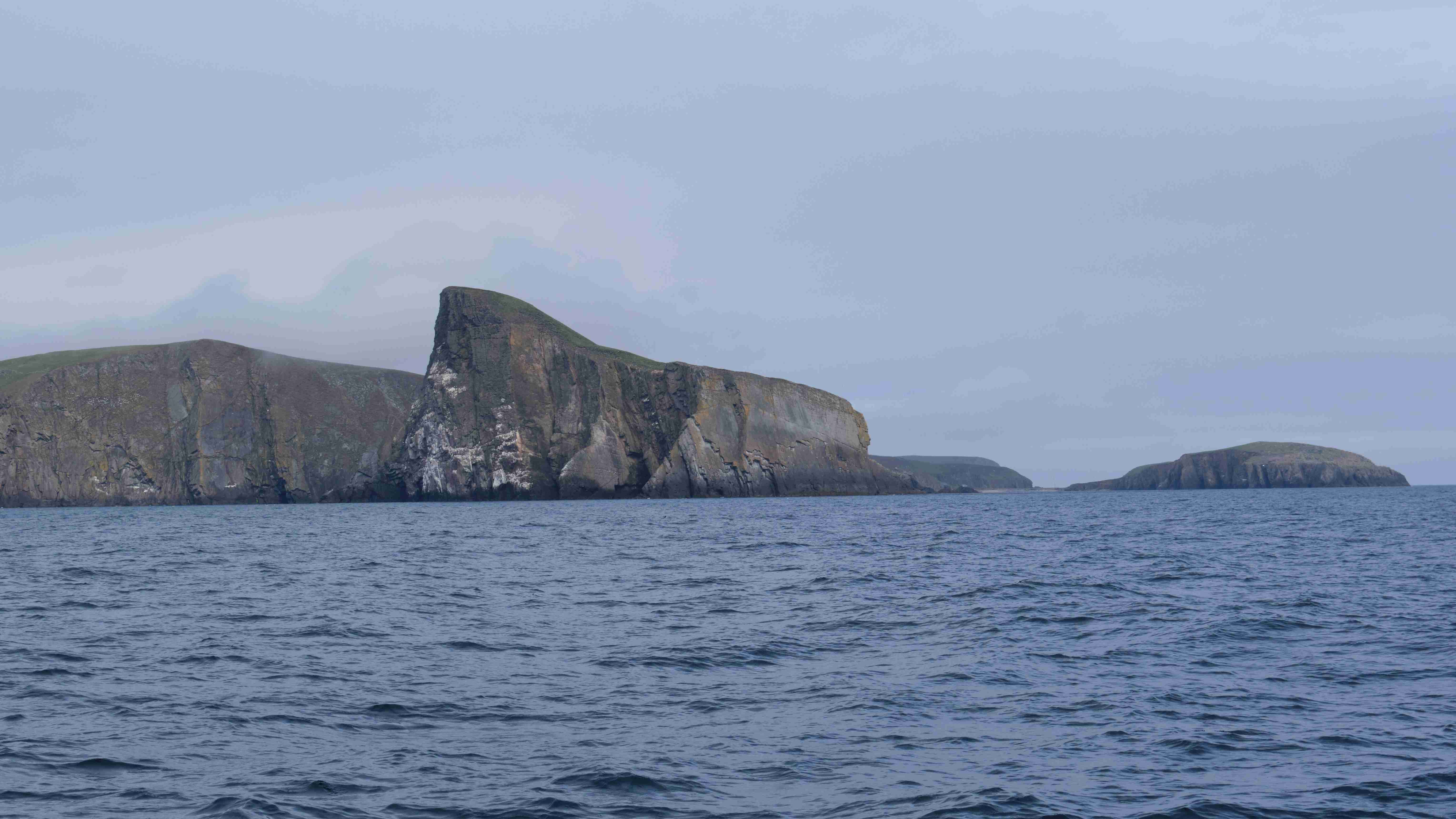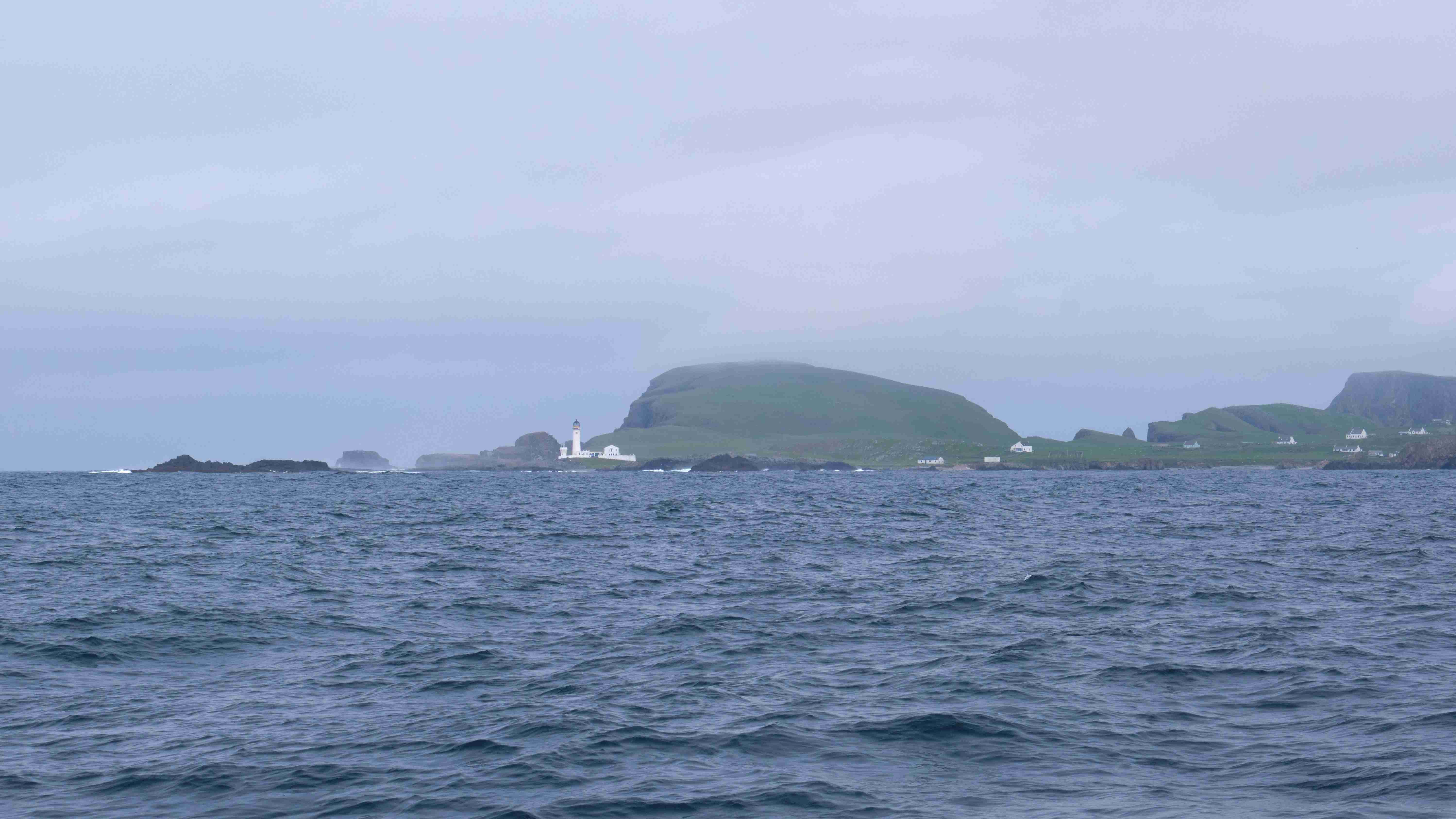 Da wir nun drei Tage mit ruhigem Wetter vor uns haben, entscheiden wir uns, das Kulturprogramm über die Orkney Inseln in Stromness zu streichen und lieber stattdessen das Zeitfenster zu nutzen, um über Fair Isle zu den Shetlands überzusetzen. Also verlassen wir gleich wieder am nächsten Morgen Stromness, um dem Küstenverlauf der Orkney Inseln zu folgen. Für die Ausfahrt haben wir das Kentern der Strömung für 10:30 Uhr ermittelt. Aber wir müssen noch einkaufen und sind eine halbe Stunde zu spät im Sound of Moy, was wir sofort zu spüren bekommen. Wir müssen durch eine extrem kurze steile stehende Welle mit Maschine gegenan kämpfen. Das Boot knallt von Welle zu Welle, bis wir endlich frei sind. Leider ist der Wind schwächer als vorhergesagt und die Dünung viel stärker als erwartet, sodass wir die Segel gleich wieder bergen müssen. Uns bleibt nur, neun Stunden bis Westray zu motoren, was wir hassen. Im kleinen Hafen Pierowall können wir längsseits einer großen niederländischen Yacht liegen und legen gemeinsam am nächsten Morgen um 6 Uhr ab.