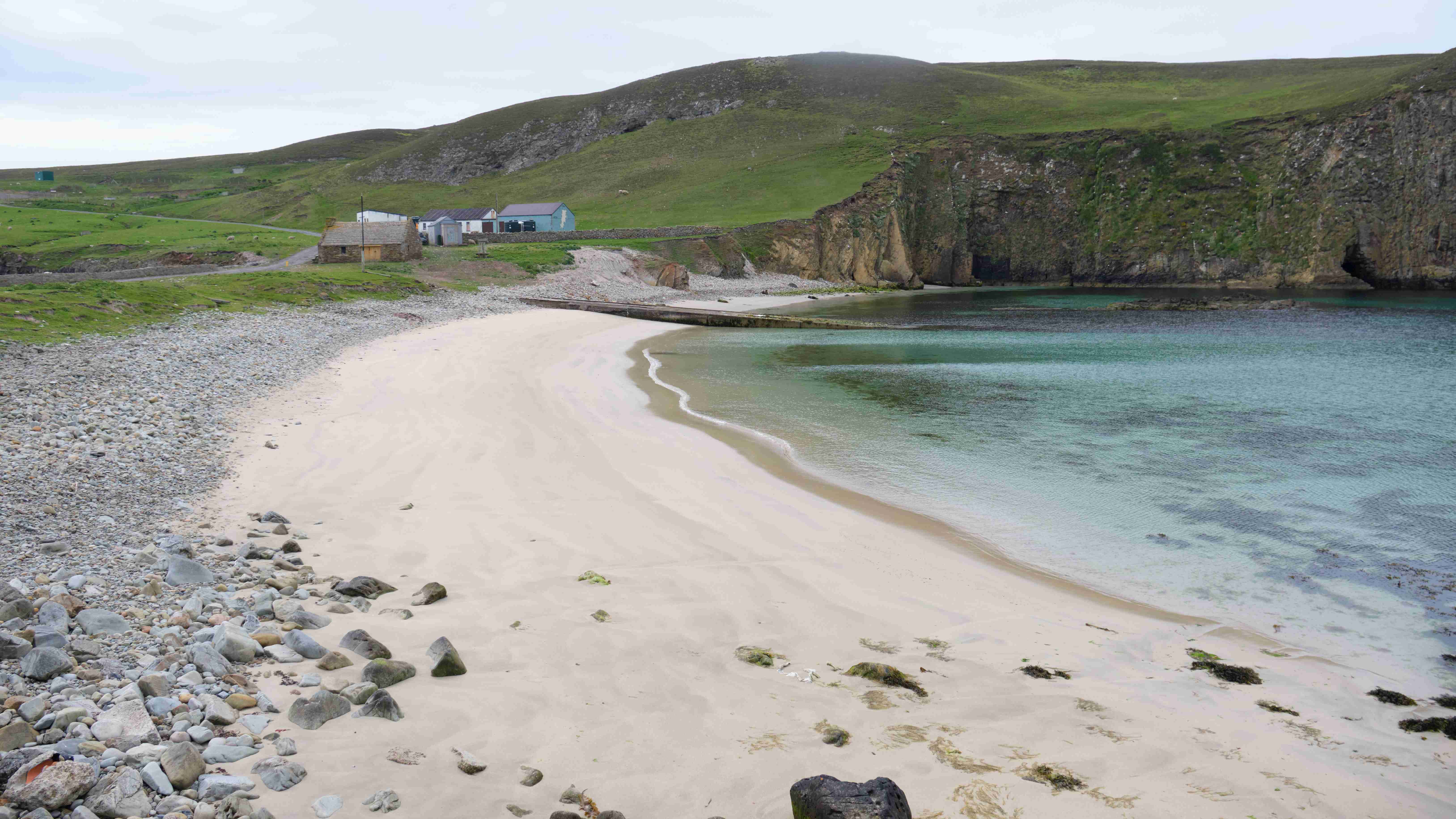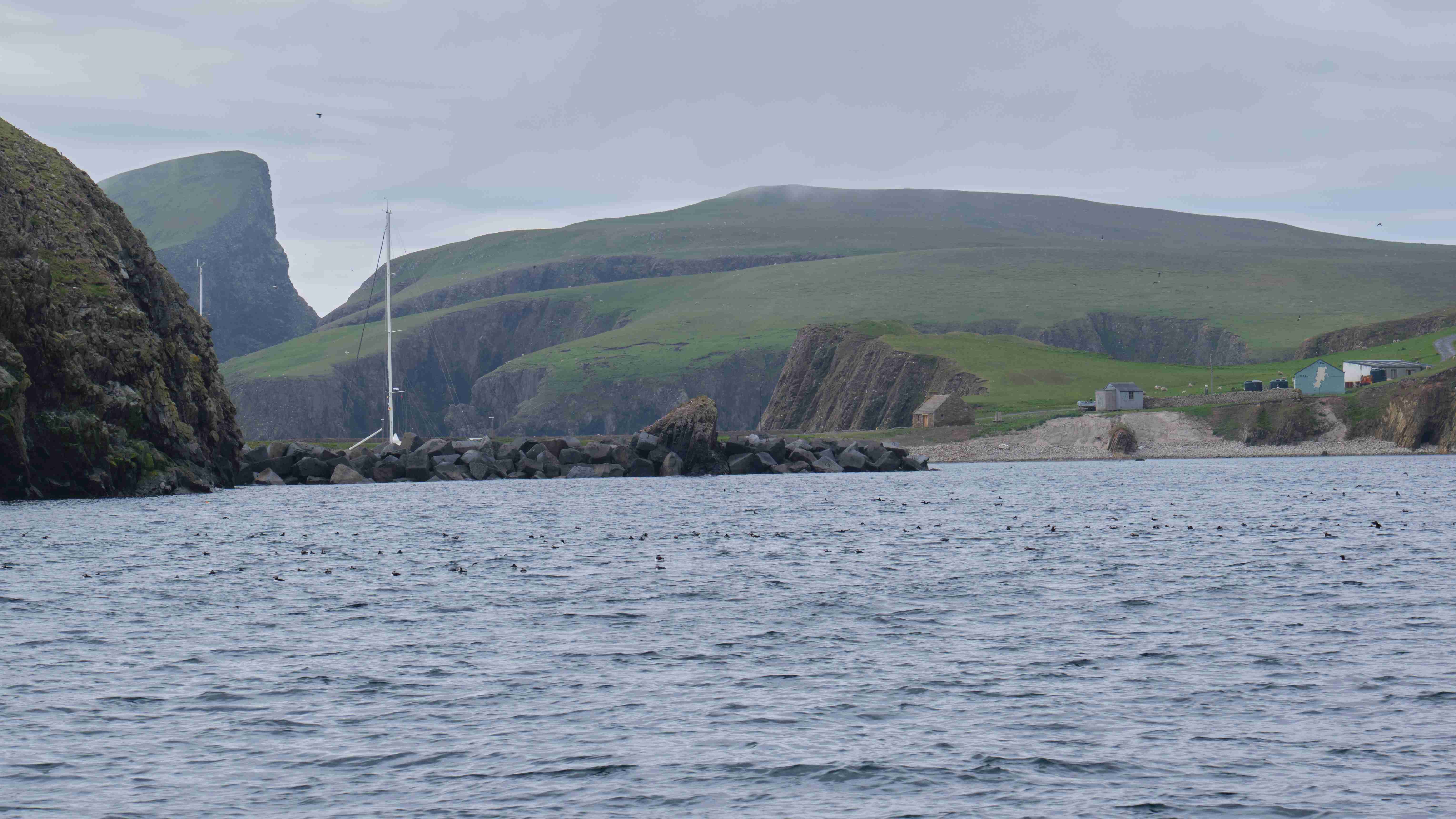 Da der Wind für den nächsten Tag droht ganz einzuschlafen, entscheiden wir uns noch am Nachmittag, die Leinen zu lösen und zusammen mit Marie-Claire und Dave von der Segelyacht La Contenta zu den Shetlands zu segeln. Leider müssen wir das letzte Stück bei Nieselregen motoren und entscheiden uns in der kleinen Bucht Voe zu ankern. Am nächsten Morgen segeln wir bei herrlichem Wetter – die Entscheidung war also richtig – das letzte Stück der wunderschönen Küste bei teilweise lachender Sonne bis Lewrick. Im Mousa Sound sehen wir den alten Broch of Mousa, einen der besterhaltenen Schutztürme Schottlands. Nun haben wir wegen des heranziehenden Sturmtiefs wieder eine Pause von drei Tagen.