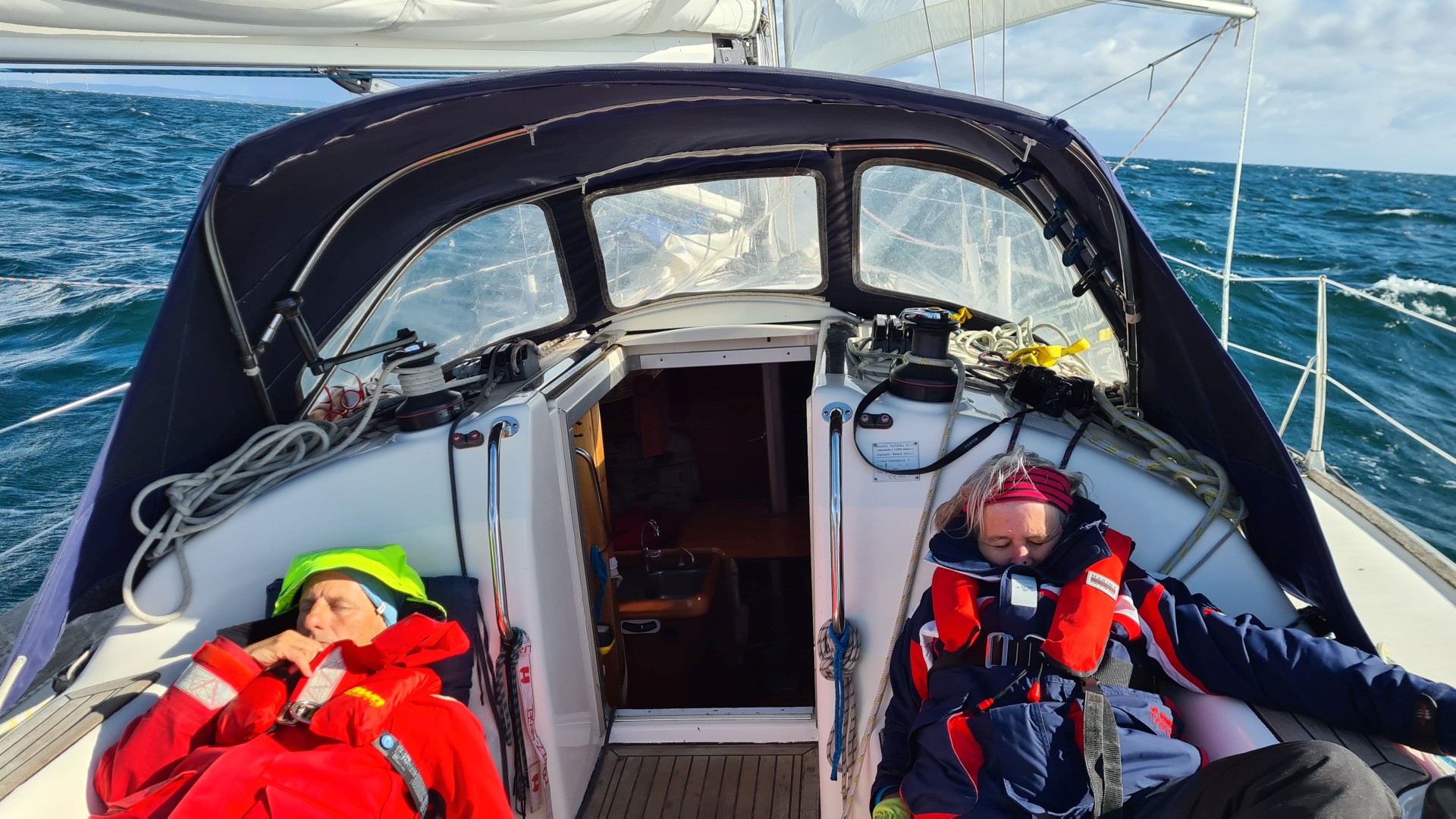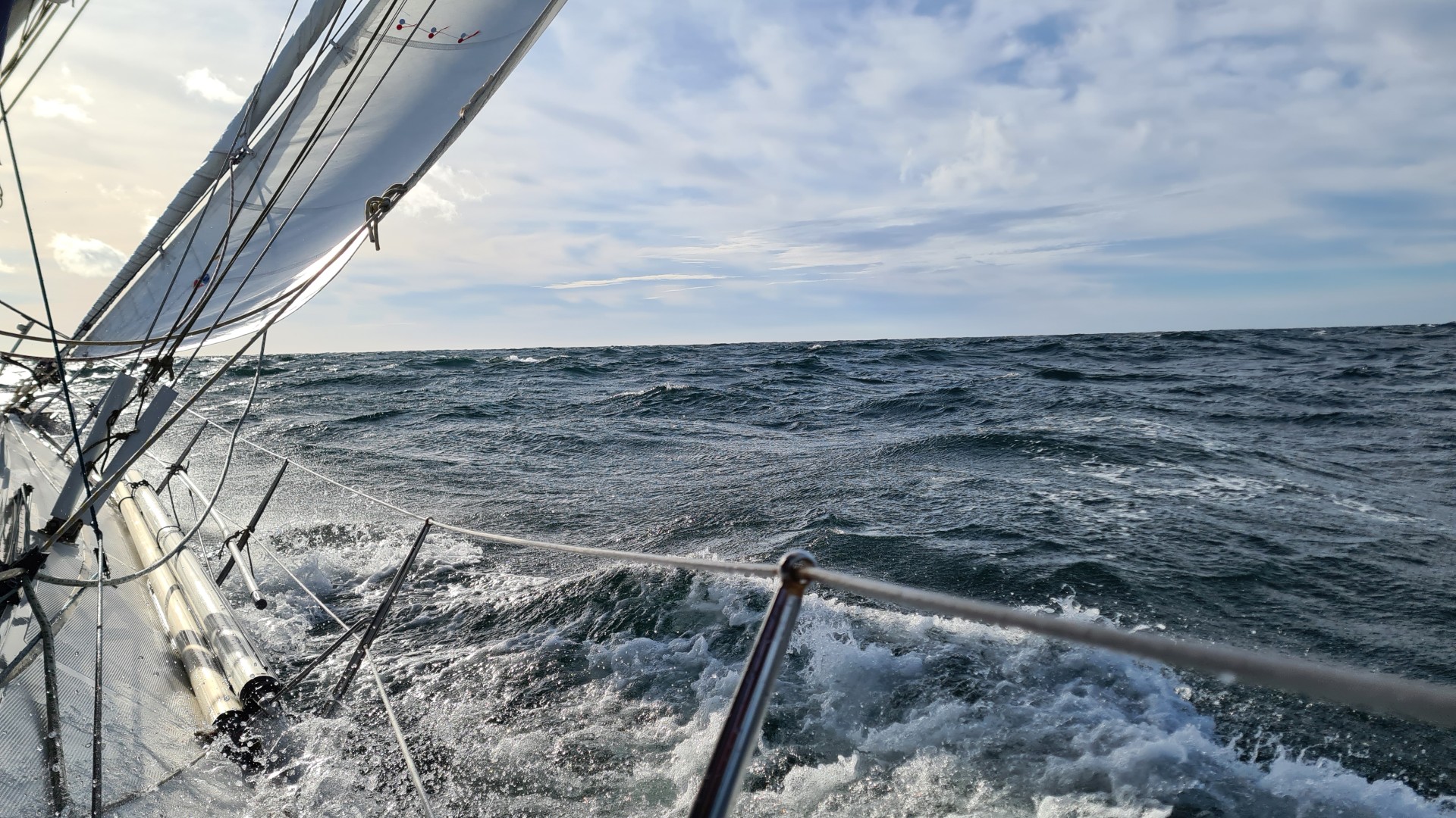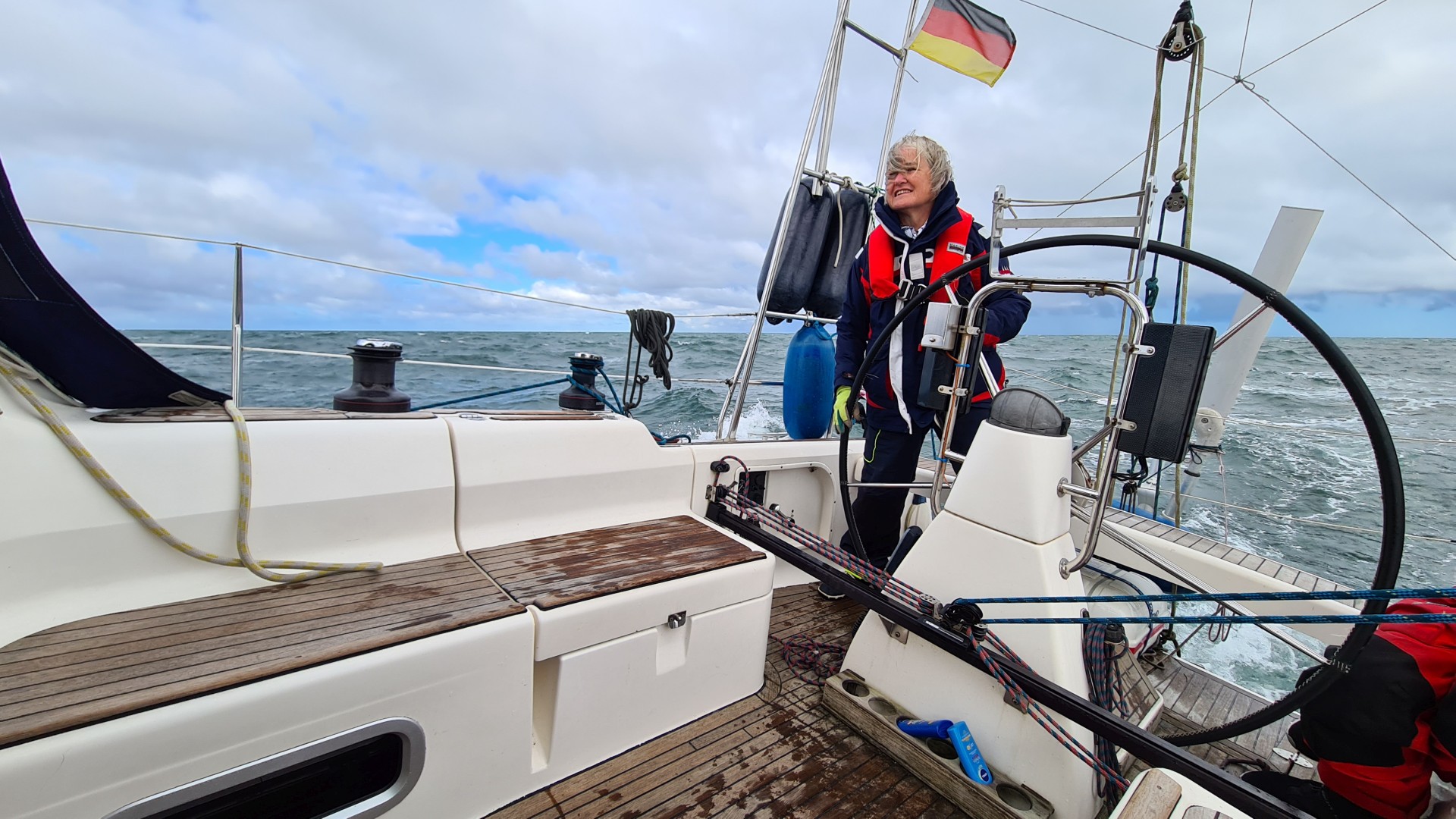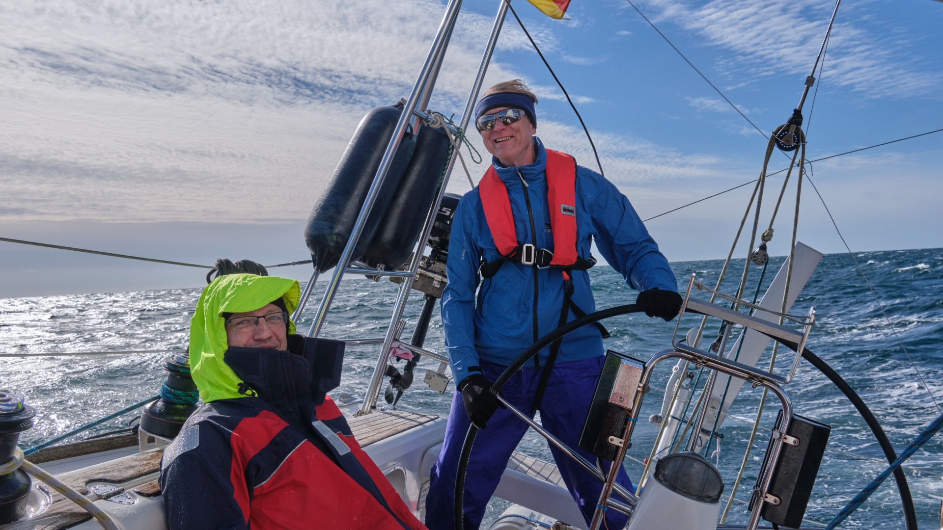 Anfänglich läuft es besser als gedacht, wir haben eine ruhige Fahrt leewärts der Küste und können sogar unseren Kurs anliegen. Später, auf offener See sind wir für einige Zeit enttäuscht, denn eine Kreuzsee macht uns zu schaffen und wir kämpfen mit einem Gegenstrom von 3 kn, was die Überfahrt viel länger zu machen droht. Aber das gibt sich nach einer Weile, dafür frischt der Wind auf 23 kn in Böen auf, 6 Bft. und das hoch am Wind, kein wirklicher Lustgewinn. Aber es gab keine andere Chance, die nächsten Tage versprechen keinen geeigneten Wind für die Überfahrt. Insgesamt haben wir Glück, denn der Wind wird gegen Ende wie angesagt zwar leichter, flaut aber kurz vor der Hafeneinfahrt ab. Wir sind nach der 23-stündigen Überfahrt hoch am Wind erschöpft, aber froh in Dänemark angekommen zu sein.