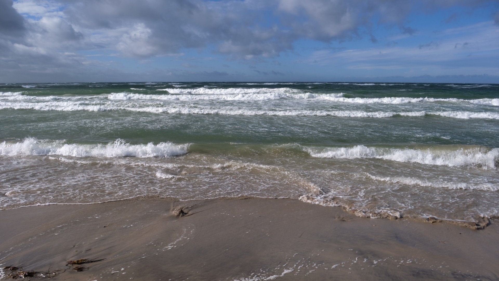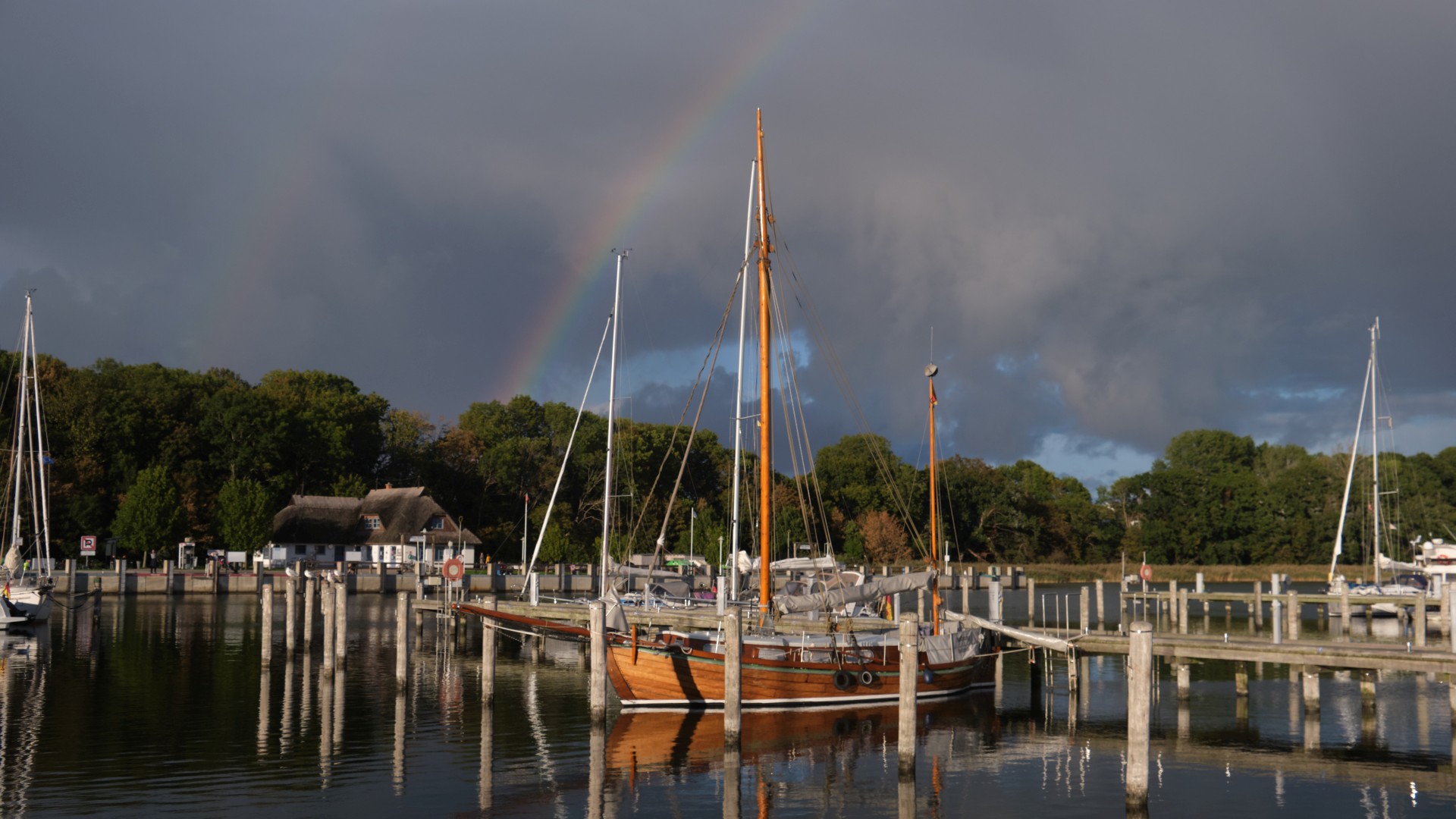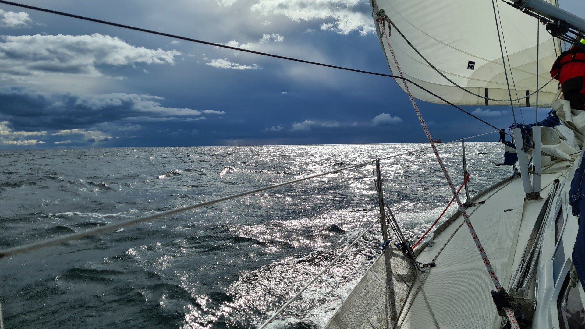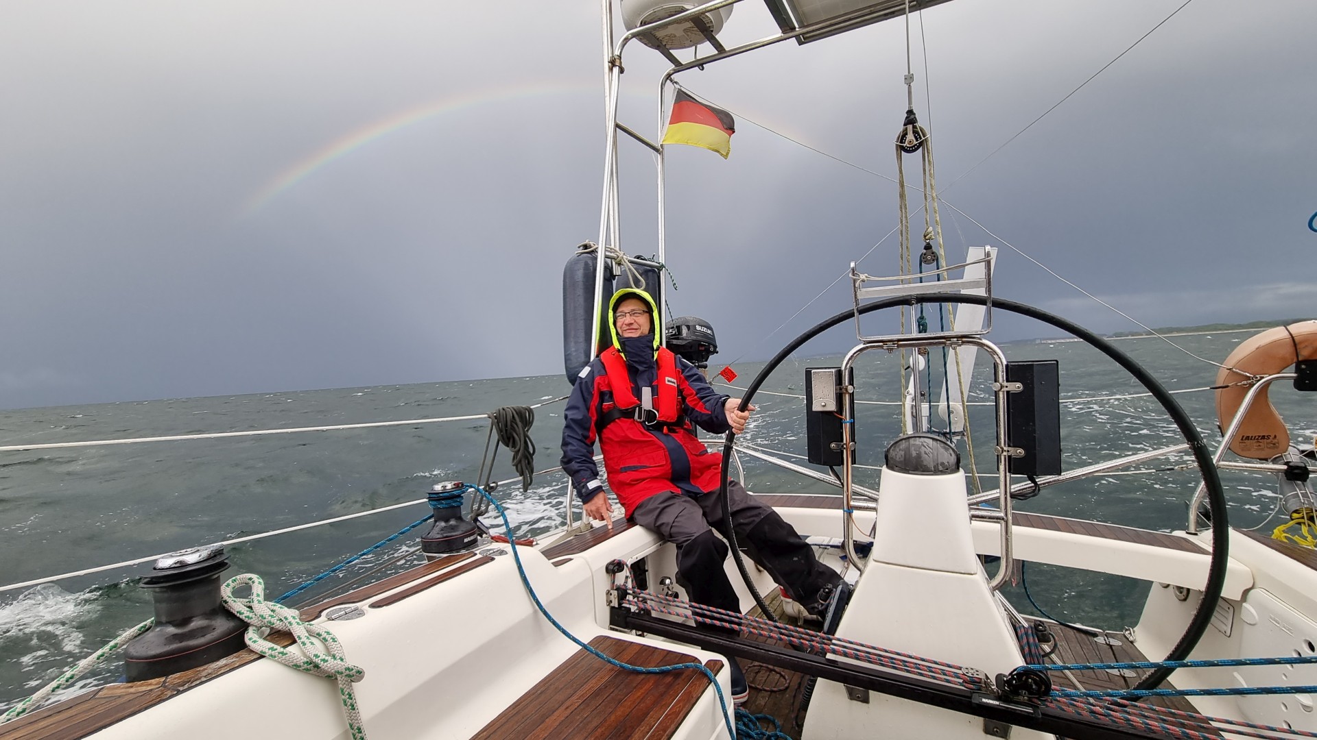 Am Sonntag segeln wir nach Hiddensee. Wir brechen früh auf, da für den Tagesverlauf abflauende Winde angesagt sind. Eine große schwarze Wolke hindert uns nicht am Auslaufen. Wieder haben wir Vorwindkurs. Wir werden mehrmals kräftig geduscht und sind froh, um 14 Uhr in Kloster den Heizlüfter zu starten und warmen Tee zu trinken. Die letzte Etappe wollen wir in Kloster, unserem Lieblingsort, verbringen und wie gewohnt zum Leuchtturm wandern, bevor es am Montag nach Stralsund geht und dieser – in Etappen – zweijährige Törn zu Ende geht.