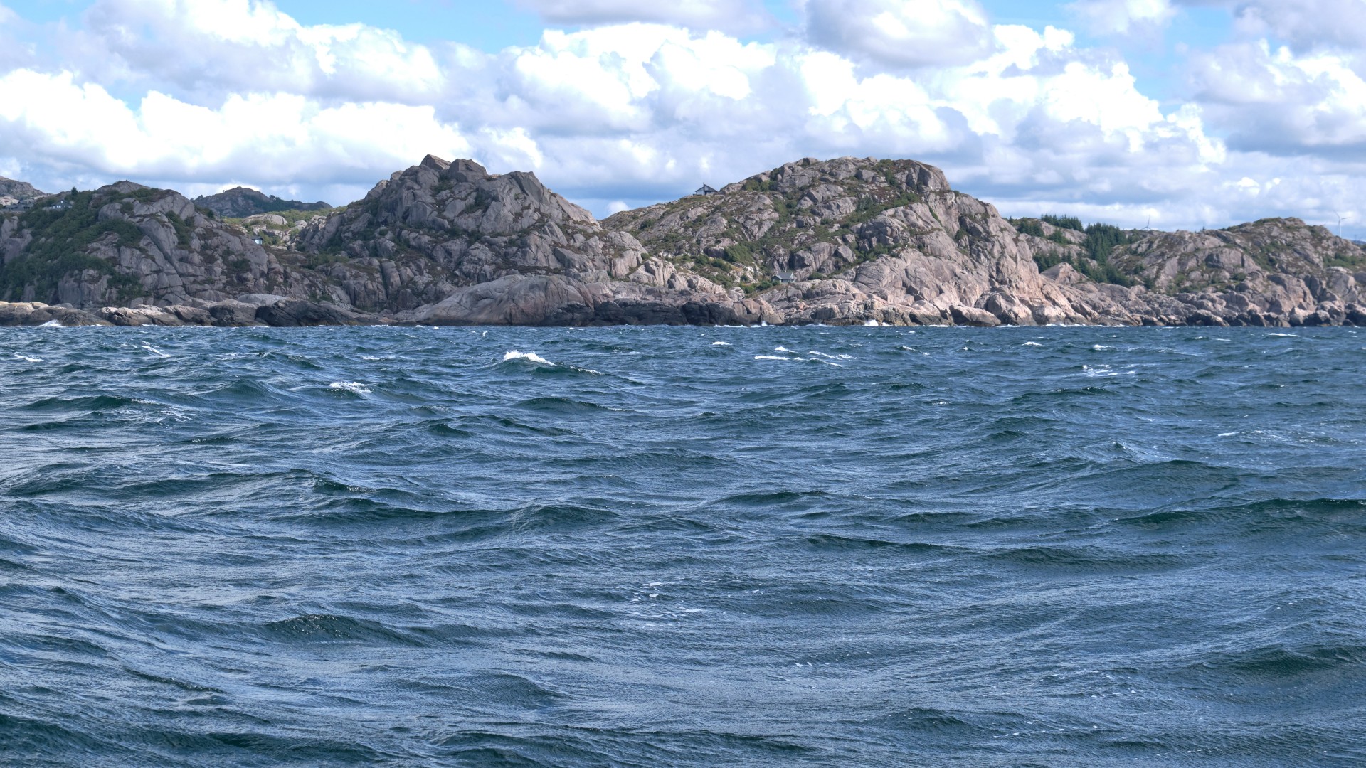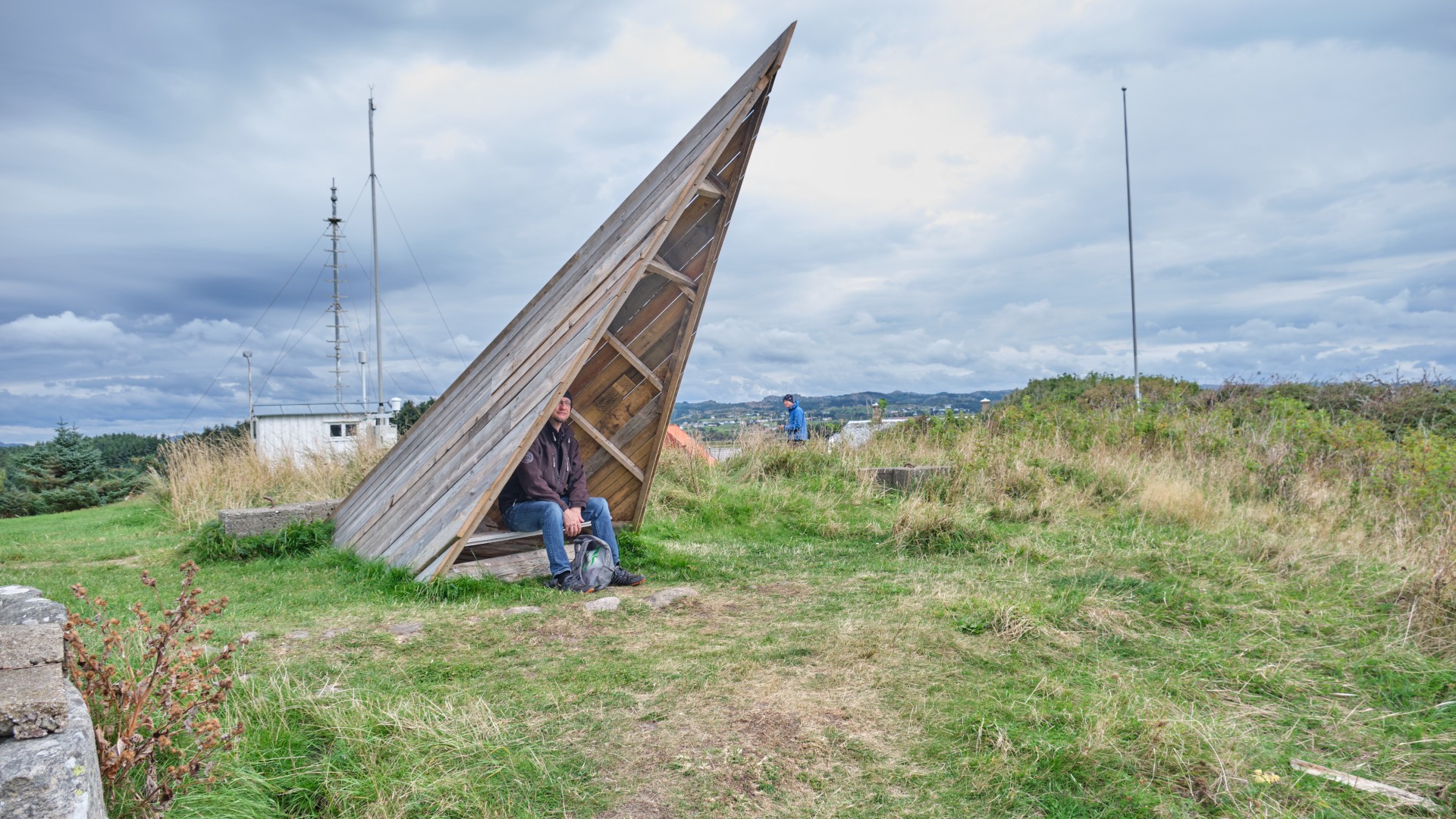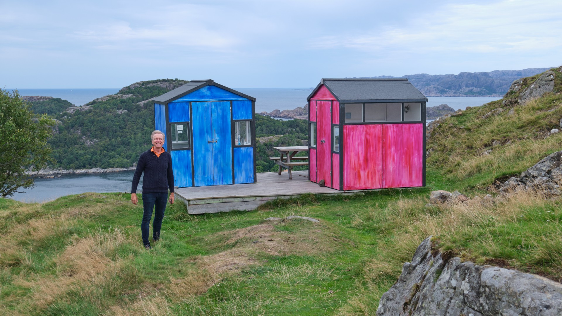 Ab Sonntag weht uns ein kräftiger Wind entgegen. Aus drei Tiefdruckgebieten westlich von Irland entwickelt sich ein kräftiges Tief, das nur langsam Richtung Niederlande wandern wird. Zusammen mit dem Hoch über Südnorwegen stellen sich entlang der Südküste Norwegens Winde aus Ost bis Südost mit 20 bis 45 kn in Böen. Das sind bis 9 Bft und gegenan. Wir werden also unser Ziel für diese Etappe bis Skagen nicht erreichen. Für Sonntag sind Winde aus SE bis 21 kn angesagt und wir wollen versuchen, ein gutes Stück zu schaffen, denn wir wissen, bald wird es nicht mehr möglich sein. Sobald wir den Egersund verlassen haben, weht uns ein kräftiger Wind entgegen und eine starke See steht ebenfalls aus südlichen Richtungen entgegen. Nach sieben Stunden Stampfen haben wir keine Lust mehr, vor allem, da der Wind auf 26 kn zugenommen hat. Wir laufen den kleinen Hafen Kirkehamn an, wo wir am Pier vor einem Restaurant festmachen können. Die Prognose sagt für Montag stärkeren Wind voraus und für Dienstag etwas weniger, also entschließen wir uns, einen Tag in dieser herrlichen Fjordlandschaft zu verbringen. Wir wandern auf den Hausberg und besichtigen Kunst in Form von Berghütten und kommen an alten Befestigungsanlagen aus dem zweiten Weltkrieg vorbei. Die gesamte Insel war von den Deutschen befestigt worden.