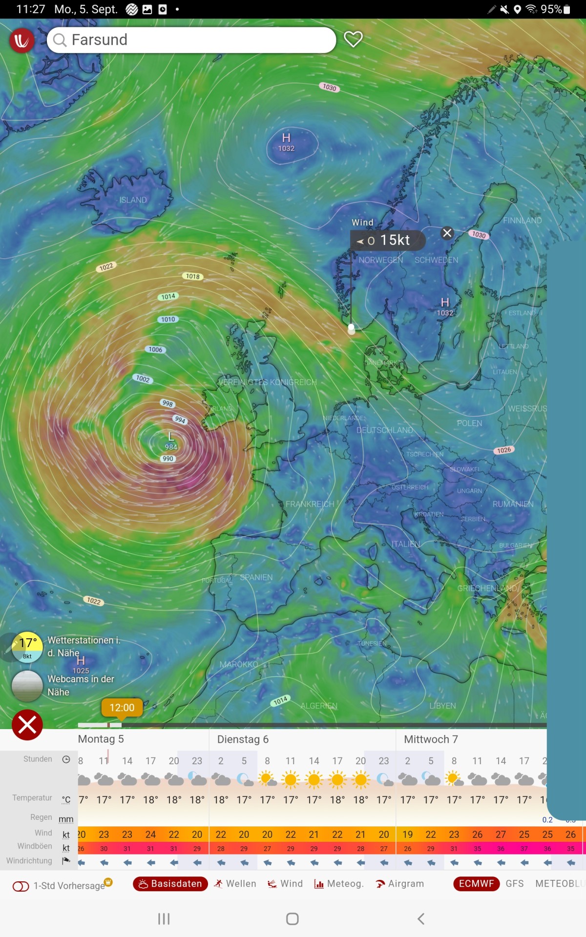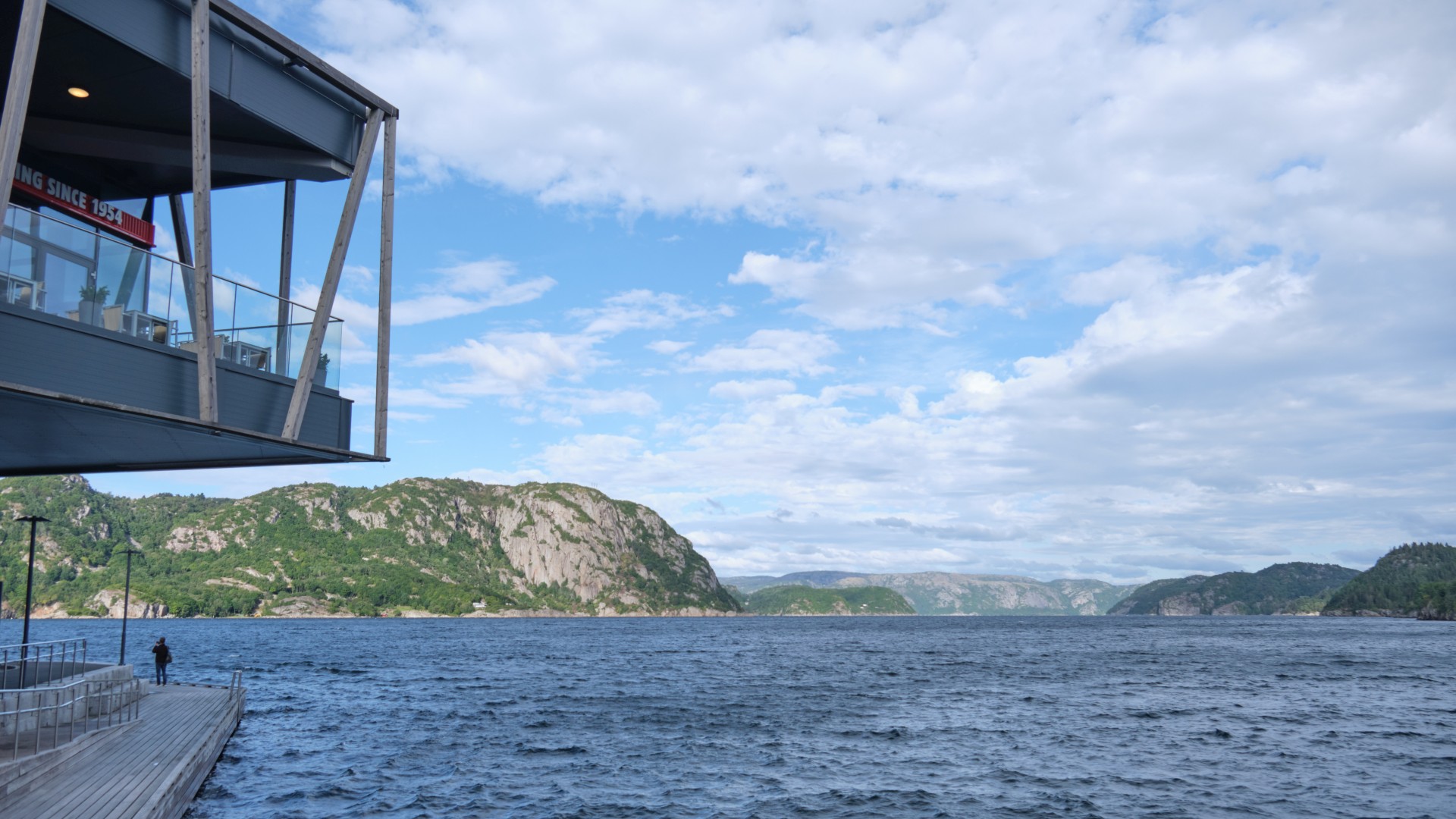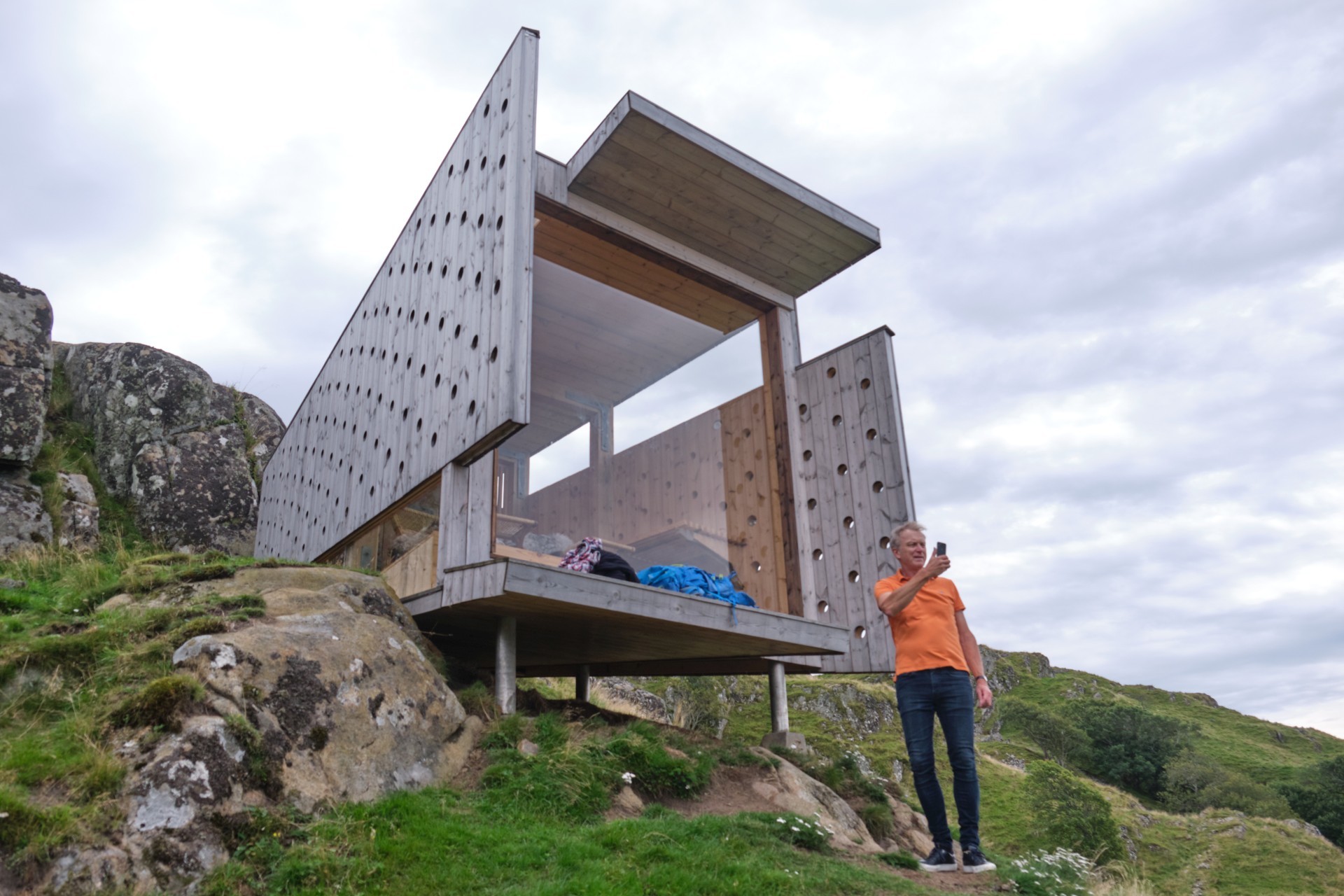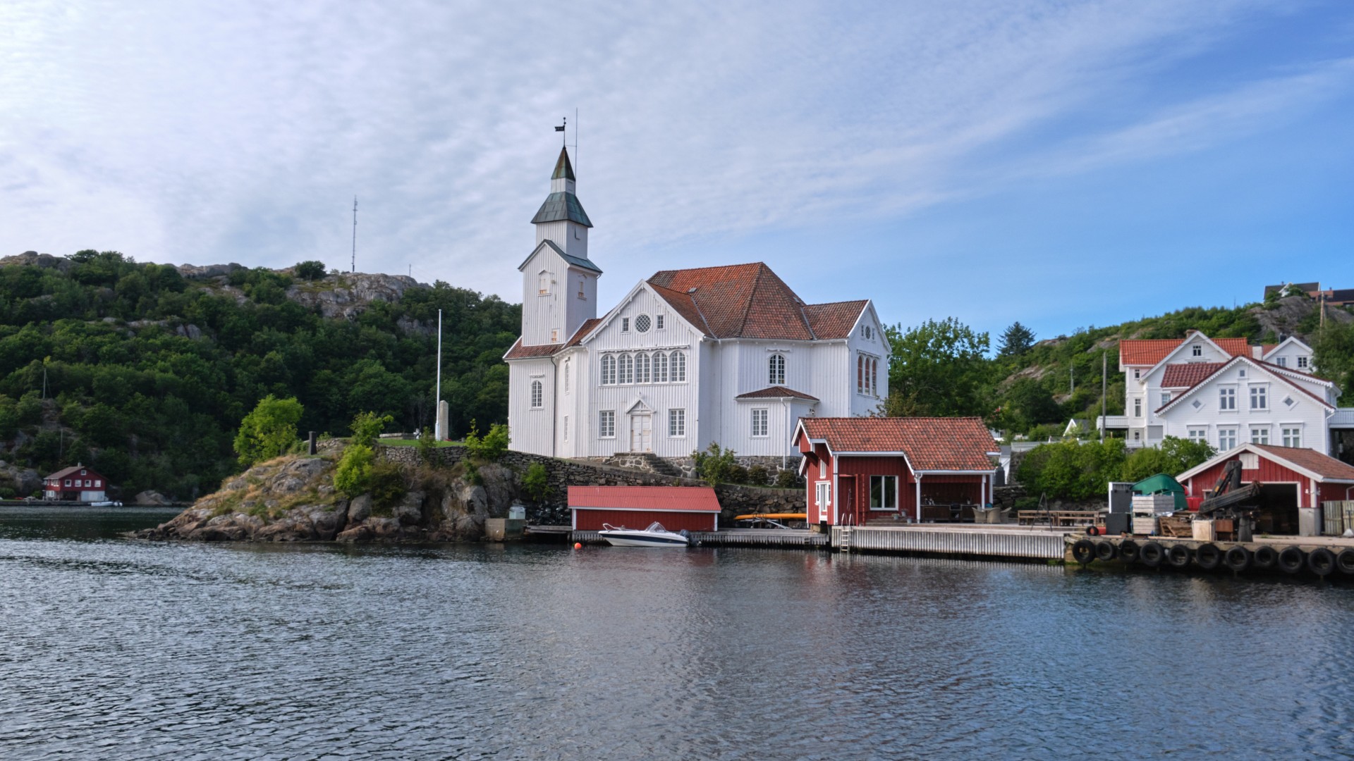 Ab Sonntag weht uns ein kräftiger Wind entgegen. Aus drei Tiefdruckgebieten westlich von Irland entwickelt sich ein kräftiges Tief, das nur langsam Richtung Niederlande wandern wird. Zusammen mit dem Hoch über Südnorwegen stellen sich entlang der Südküste Norwegens Winde aus Ost bis Südost mit 20 bis 45 kn in Böen. Das sind bis 9 Bft und gegenan. Wir werden also unser Ziel für diese Etappe bis Skagen nicht erreichen. Für Sonntag sind Winde aus SE bis 21 kn angesagt und wir wollen versuchen, ein gutes Stück zu schaffen, denn wir wissen, bald wird es nicht mehr möglich sein. Sobald wir den Egersund verlassen haben, weht uns ein kräftiger Wind entgegen und eine starke See steht ebenfalls aus südlichen Richtungen entgegen. Nach sieben Stunden Stampfen haben wir keine Lust mehr, vor allem, da der Wind auf 26 kn zugenommen hat. Wir laufen den kleinen Hafen Kirkehamn an, wo wir am Pier vor einem Restaurant festmachen können. Die Prognose sagt für Montag stärkeren Wind voraus und für Dienstag etwas weniger, also entschließen wir uns, einen Tag in dieser herrlichen Fjordlandschaft zu verbringen. Wir wandern auf den Hausberg und besichtigen Kunst in Form von Berghütten und kommen an alten Befestigungsanlagen aus dem zweiten Weltkrieg vorbei. Die gesamte Insel war von den Deutschen befestigt worden.