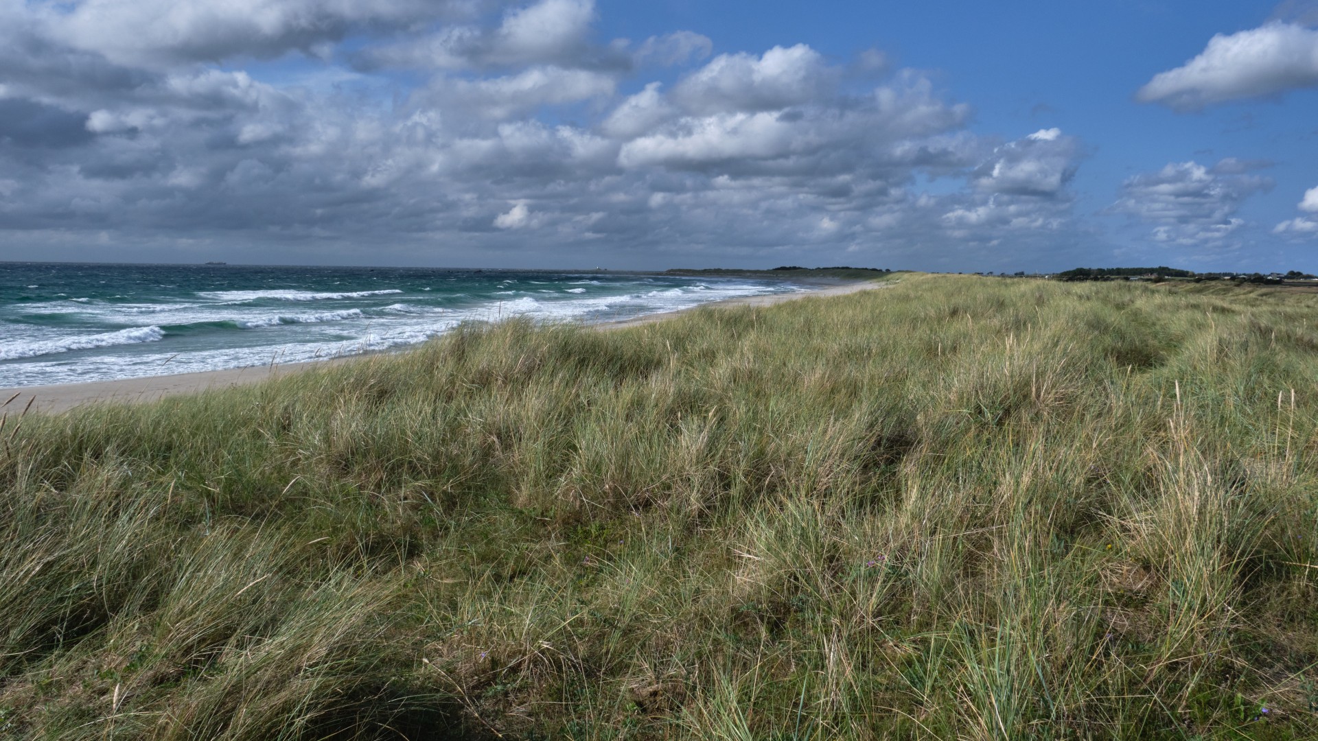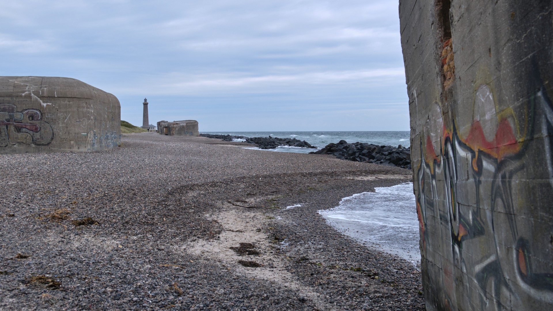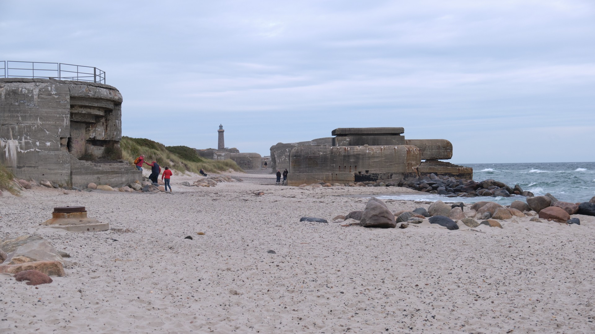 Am Sonntag ruhen wir uns aus, klarieren das Boot, dann kommt Birgit von Göteborg mit Fähre und Zug zu uns. Wir kaufen gemeinsam ein und haben einen gemütlichen ersten Abend. Am nächsten Morgen nutzen wir den südlichen Wind, um in Lee der Küste bei gemäßigten Winden bis an die Nordspitze Dänemarks zu segeln. 2019 war ich hier mit Freunden und wir standen auf der Sandbank mit einem Bein in der Nord- und dem anderen in der Ostsee. Wir sind erstaunt, wie leer der Yachthafen von Skagen ist. Das letzte Mal hatten wir mit Mühe einen Platz mit Buganker und Heckleine bekommen, dieses Mal können wir uns einen Platz an einem Pier frei auswählen, da nur sehr wenige Yachten hier liegen, die Saison scheint vorbei zu sein. Wie wandern von Skagen bis zum Leuchtturm am Strand entlang und die Bunker regen zum Nachdenklichwerden an. Wir legen einen zusätzlichen Tag ein, da der Wind zwar aus der richtigen Richtung kommt, aber wir wollen nicht bei 8 Bft. den Hafen verlassen, wir nehmen uns die Zeit für einen weiteren Landgang zur Nordseeseite. Leider müssen wir zwei Mal ein Industriegebiet queren und finden keinen guten Weg durch die Dünenlandschaft.