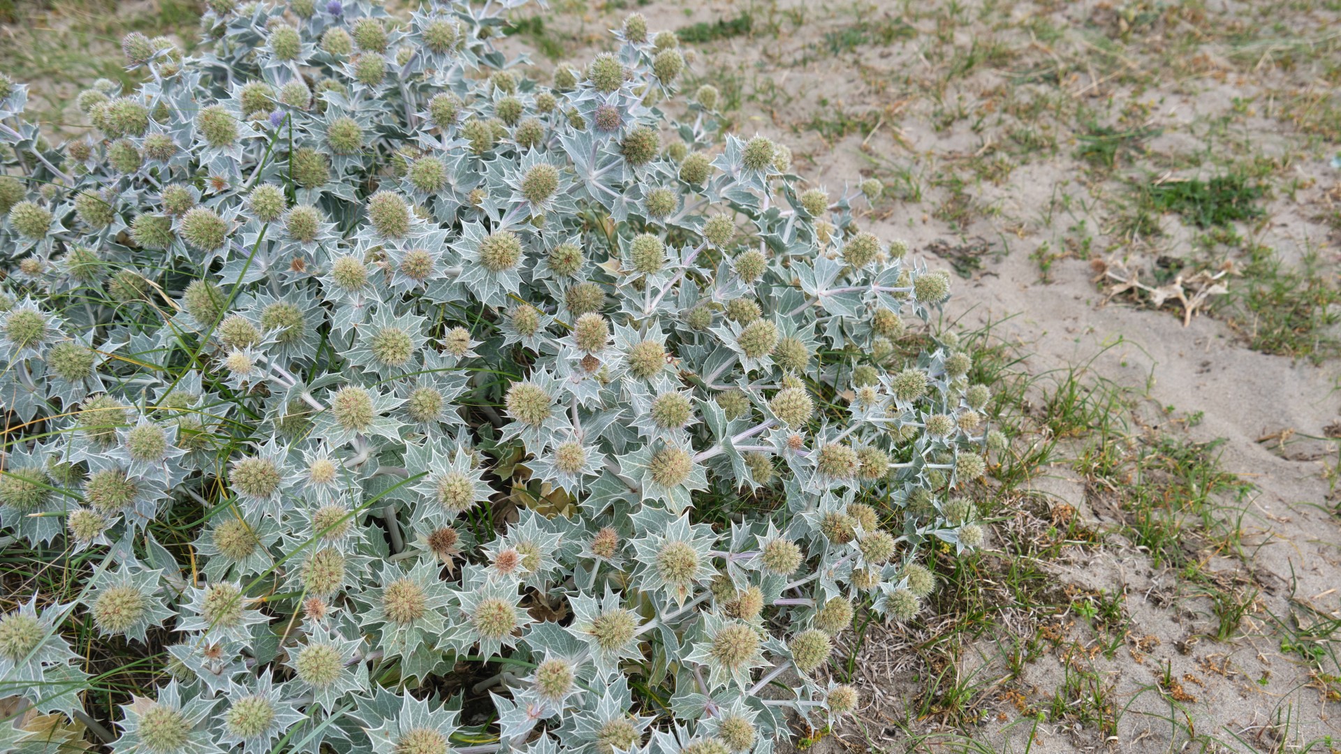 Am nächsten Morgen nehmen wir den Bus nach Vanse, um von dort an die Küste zu wandern und durch die Vogelschutzgebiete zu streifen. Wir bekommen ein Strandgefühl, die Düfte von Sand, Tang und Salzwasser mischen sich mit denen von Gräsern und Nadelbäumen. Wir finden Meer-Mannstreu, auch Stranddistel genannt (Eryngium maritimum) und lernen, dass sie sehr selten in Norwegen ist und 90% davon genau hier zu finden sind. Dazu weht ein sehr starker Wind mit über 8 Bft aus Ost, dem wir uns teilweise regelrecht entgegenwerfen müssen. Wir wandern bis Farsund und sind nach den 13 km wandern durch Sand und gegen den Wind so müde, als ob wir 20 km gewandert wären. Wir erfrischen uns mit Kaffee und Kuchen, kaufen einen neuen Wasserkocher und fahren mit dem Bus zurück, um in unserer gemütlichen Runde ein Abendessen zu kochen und den importierten Rotwein zu trinken.