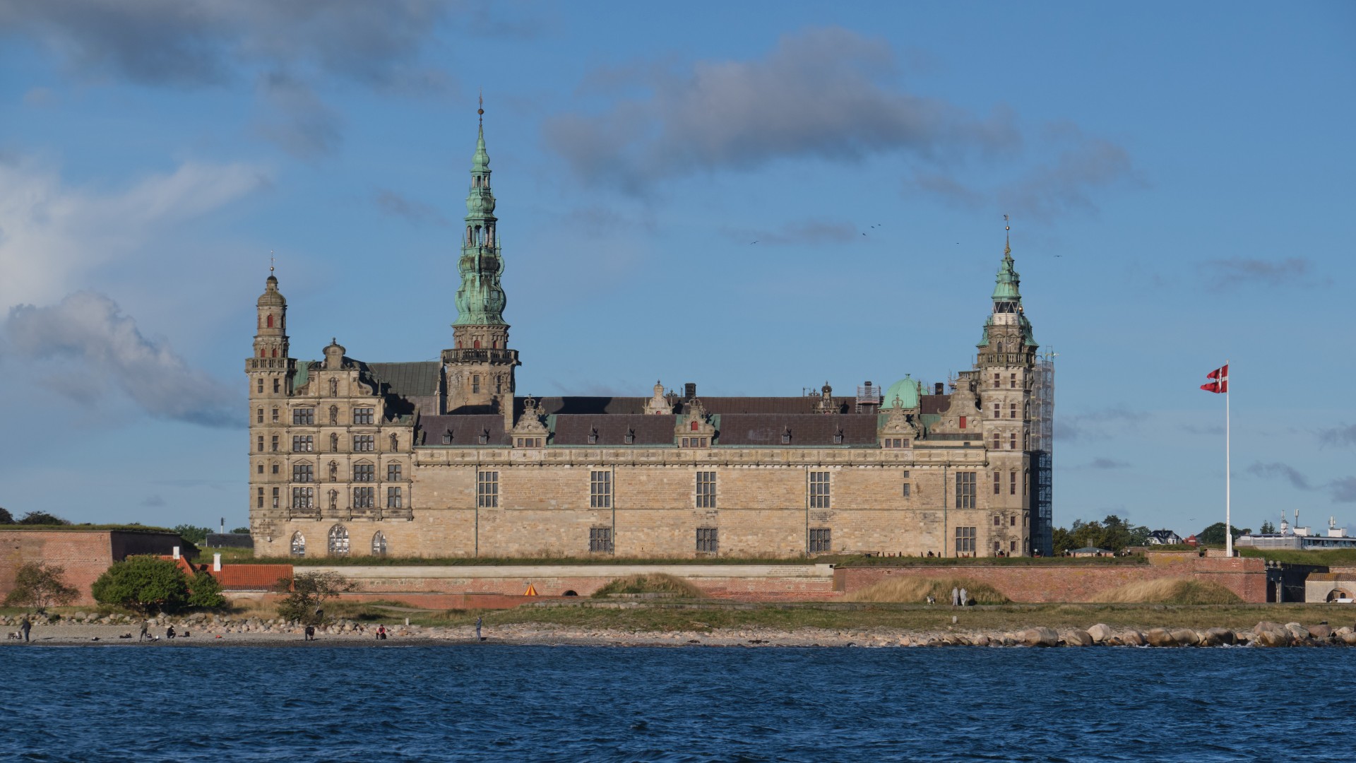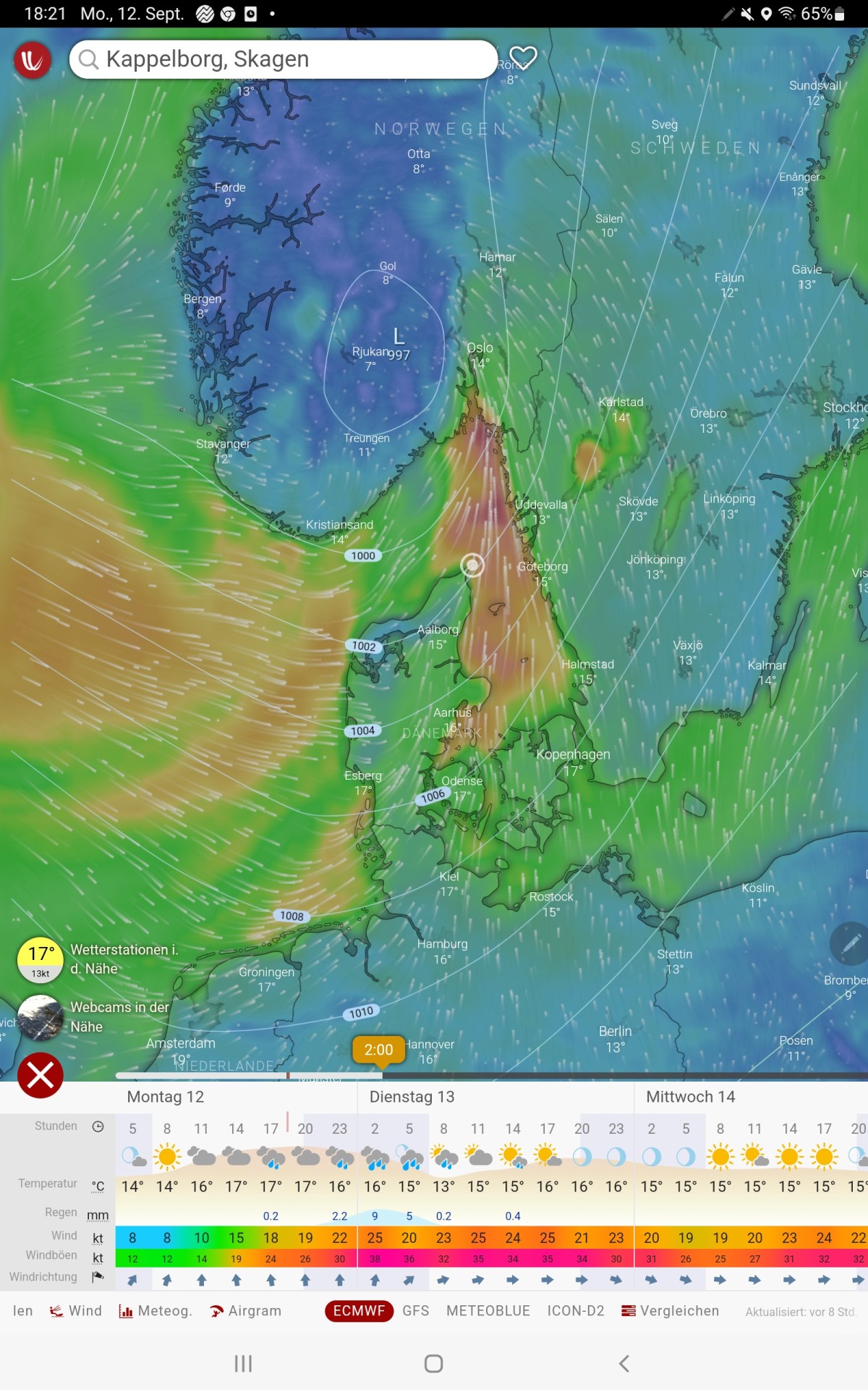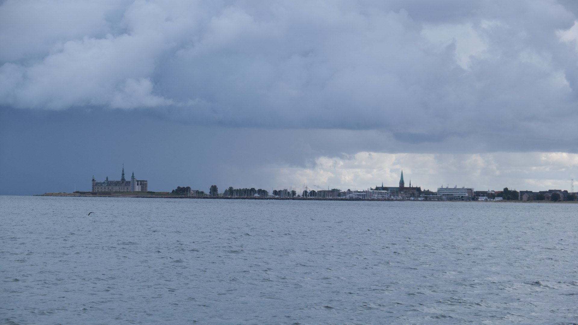 Der frische Westwind weht weiter und nun aus NW und wir laufen zügig gegen Süden auf unser Tagesziel Helsingør zu. Wie viel Energie im Wettergeschehen steckt, sehen wir an einem kräftigen Schauer und an einer Windhose. Es ist schon die zweite, denn auch am Tag zuvor hatten wir eine am Horizont beobachtet. Wir spazieren um das schöne Schloss, ich denke dabei an unseren letzten Besuch 2020, und wir finden das nette englische Restaurant Jellyfish Elsinore und speisen Fisch, wirklich zu empfehlen.