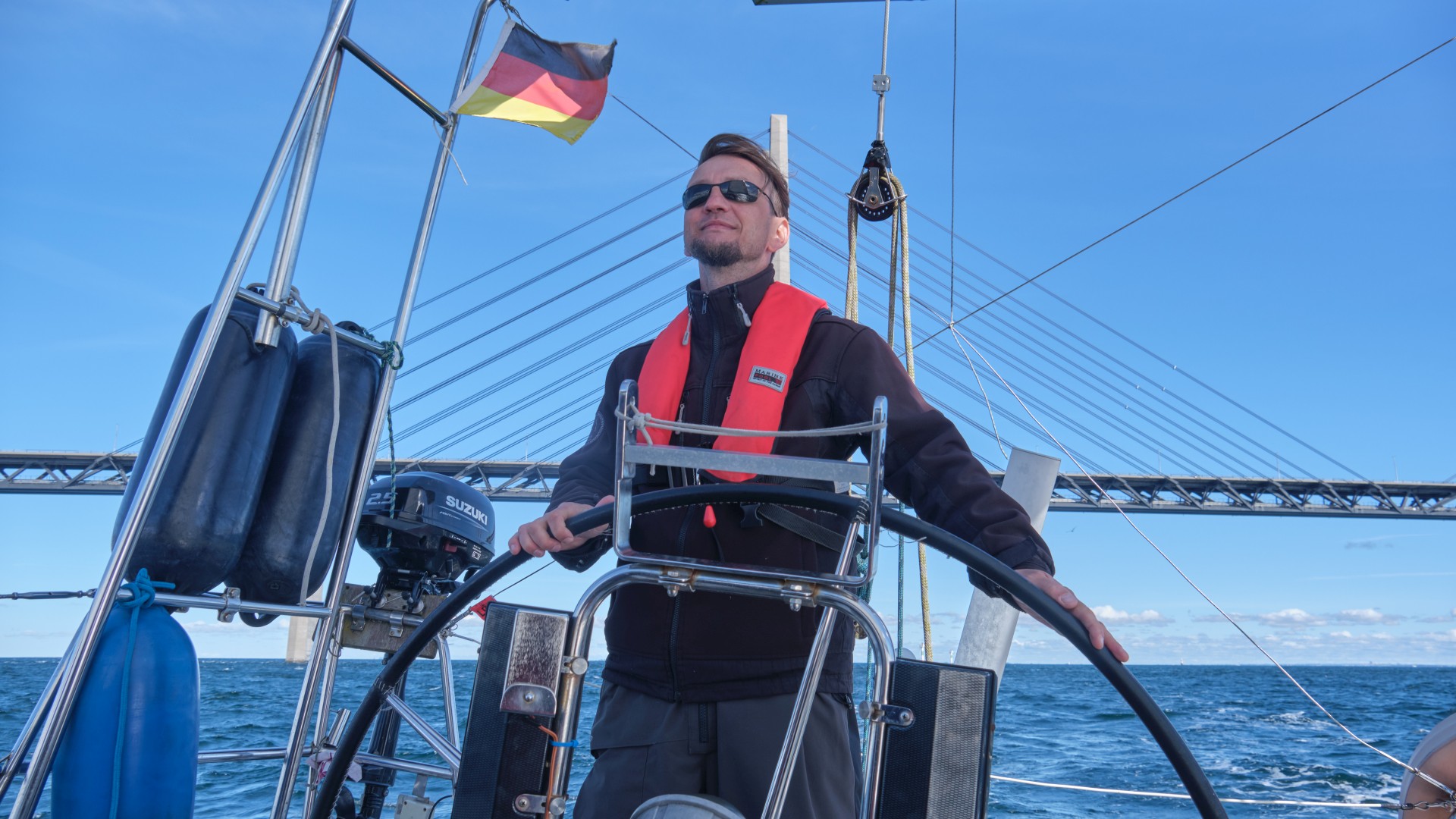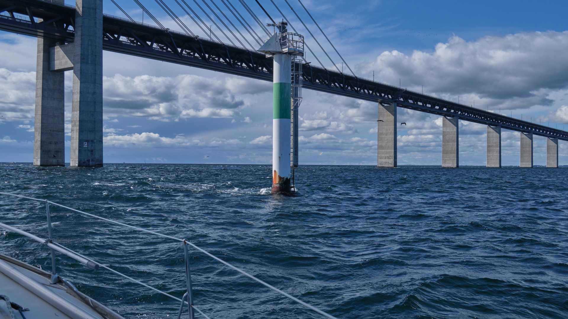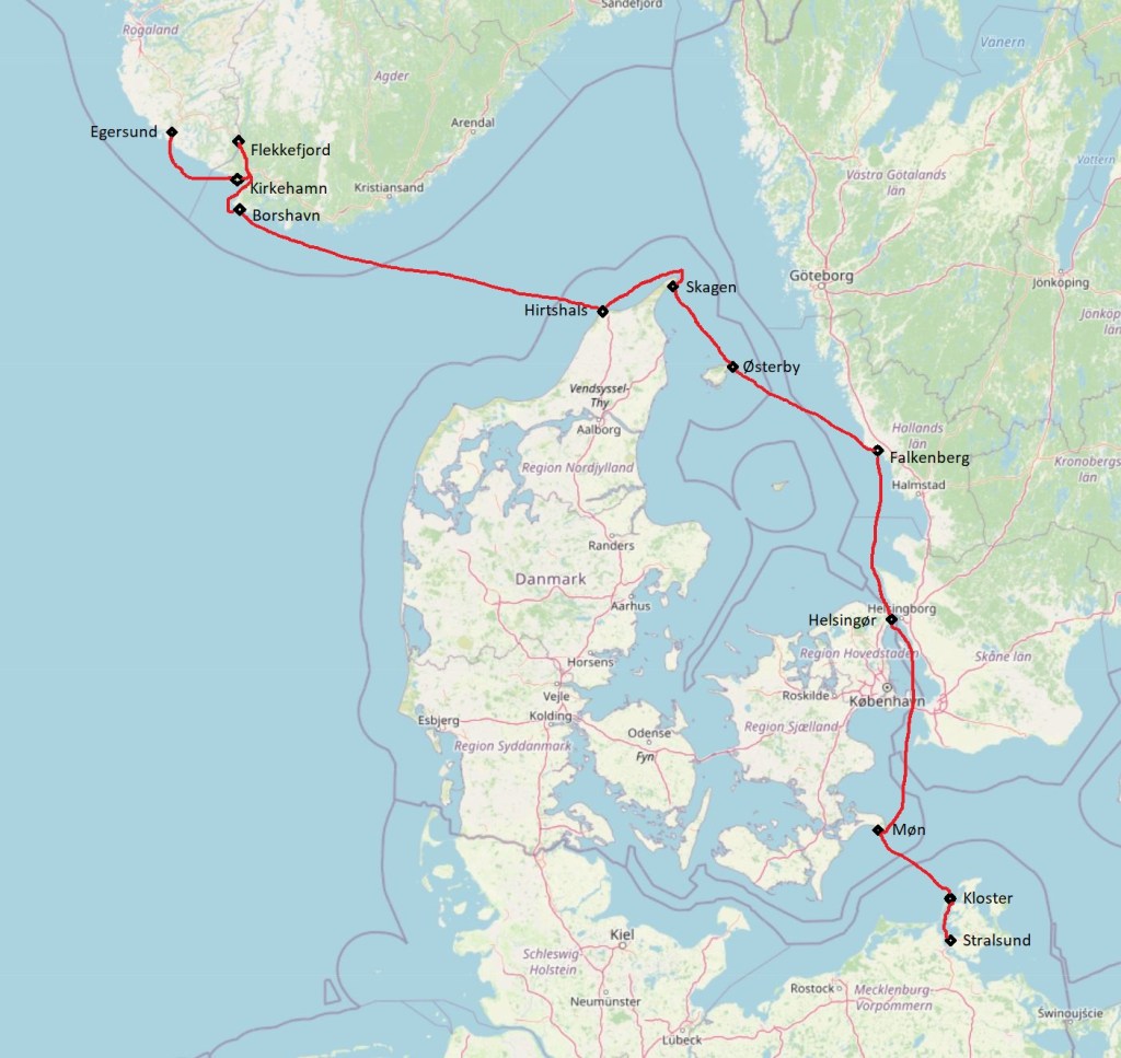 Der Wind lässt nach und weht gemäßigt aus Nord und wir segeln den Sund mit ausgebaumter Genua flott nach Süden, teilweise von einer Strömung mit 1 bis 2,5 kn unterstützt an der kleinen Insel Ven vorbei und dann unter der Öresundbrücke durch. Eigentlich wollten wir nur bis Skanør segeln, aber da es unter ausgebaumter Genua und Groß so gut läuft, entscheiden wir uns, bis Klintholm auf Møn weiter zu segeln. Wir sind nun wieder in heimischen Gewässern, denn dies ist ein Ziel, das wir uns schon oft an verlängerten Wochenenden gesteckt haben. Ein langer Segeltag geht mit 74 sm nach 11,5 Stunden zu Ende.