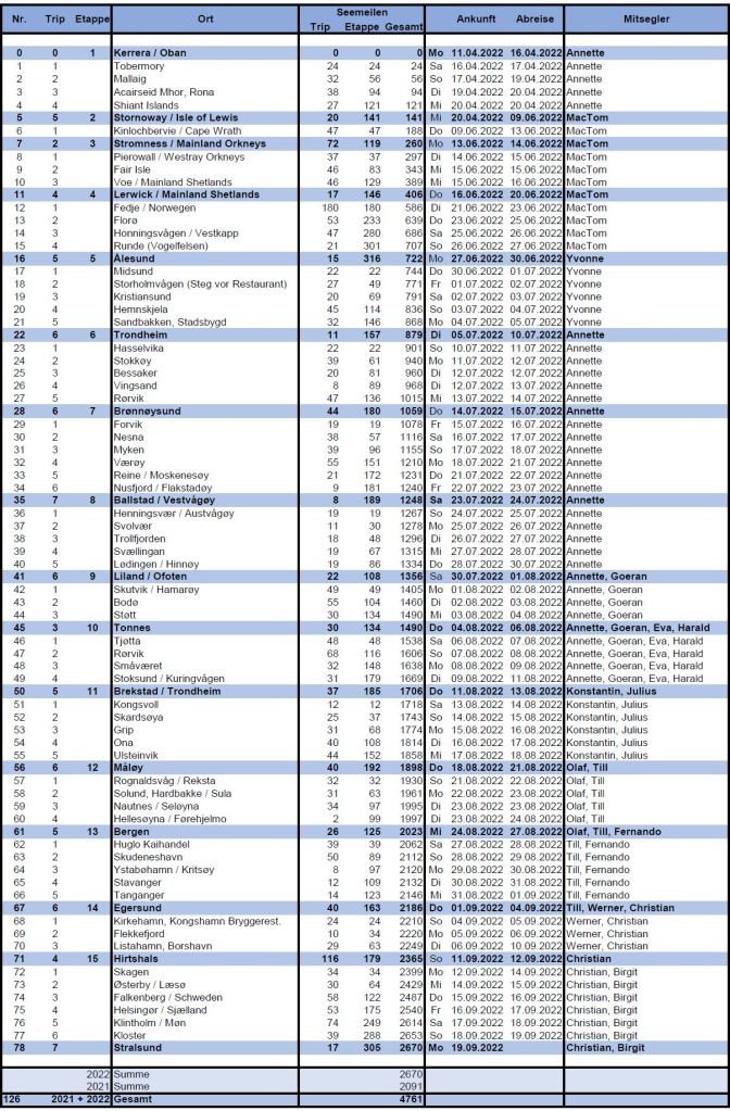 Fahrt 2021 + 2022: 4.761 Seemeilen ü. Grund, 183 Tage, 126 Häfen / Buchten