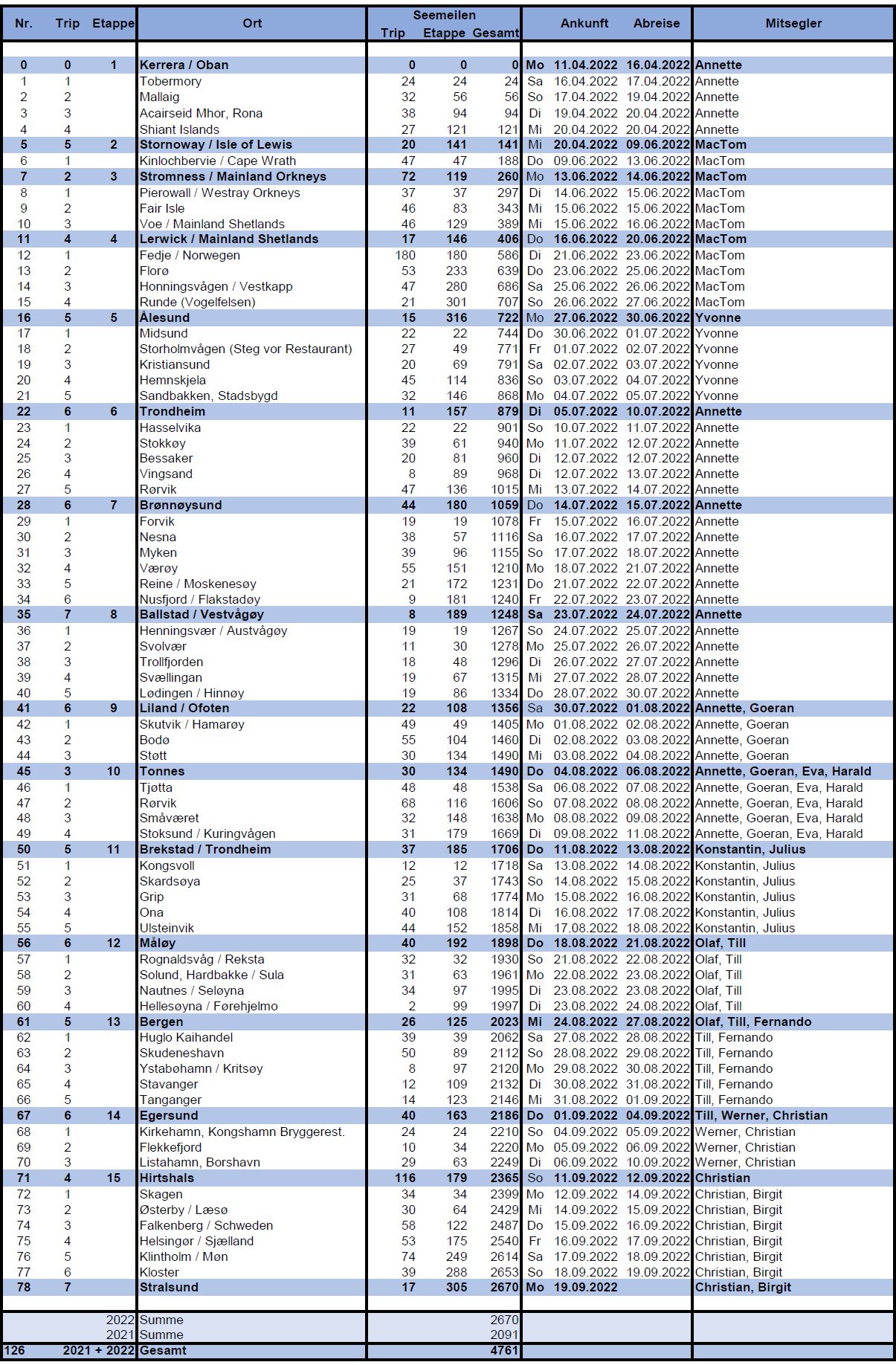 Fahrt 2021 + 2022: 4.761 Seemeilen ü. Grund, 183 Tage, 126 Häfen / Buchten