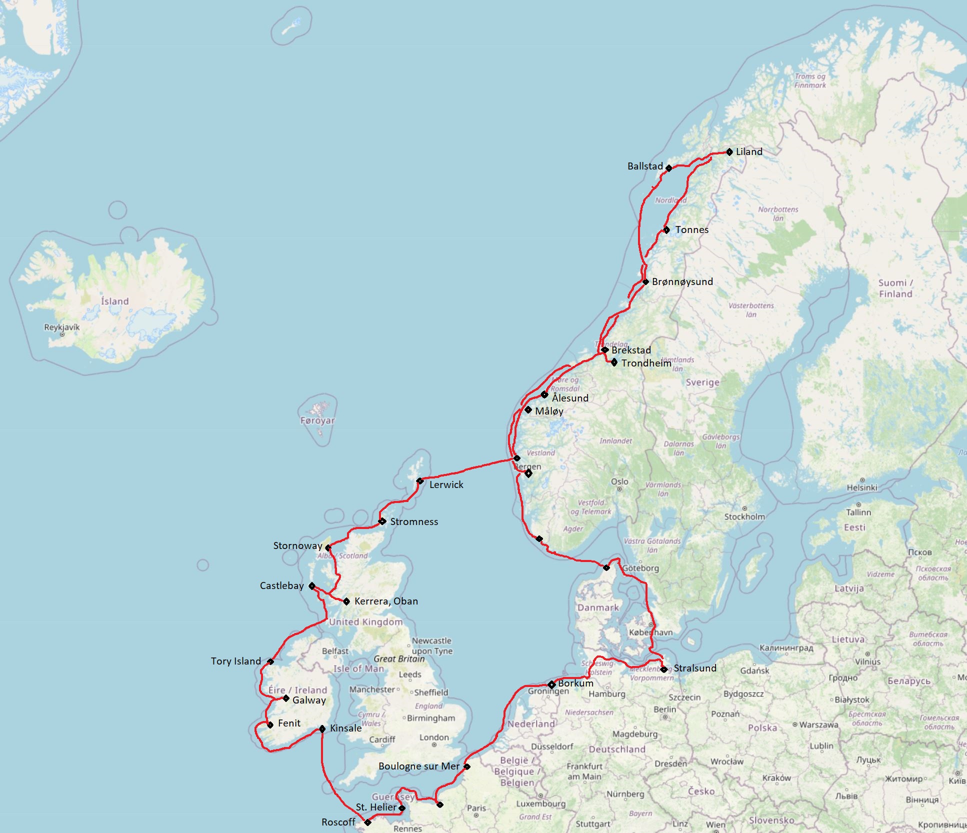 Wir haben zehn Länder bereist: Deutschland, Niederlande, Belgien, Frankreich, Jersey, Irland, Schottland, Norwegen, Dänemark und Schweden.
