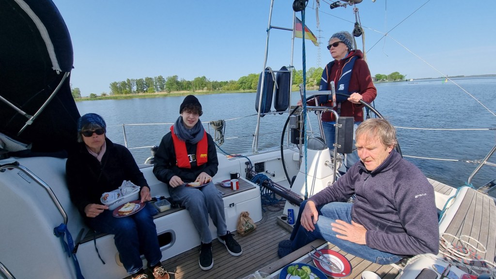 Über Pfingsten segelt die traditionsreiche Crew mit Dorothé und Thomas, ergänzt um ihren Patensohn Henry rund Usedom bei wechselnden Winden über Lubmin und Rankwitz. In Świnoujście gehen wir – sehr gut – polnisch essen.
