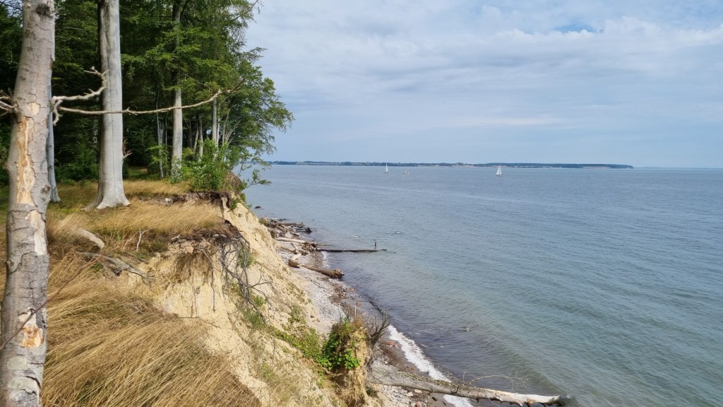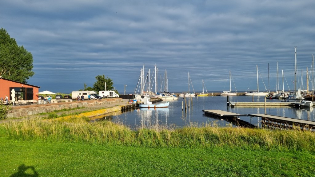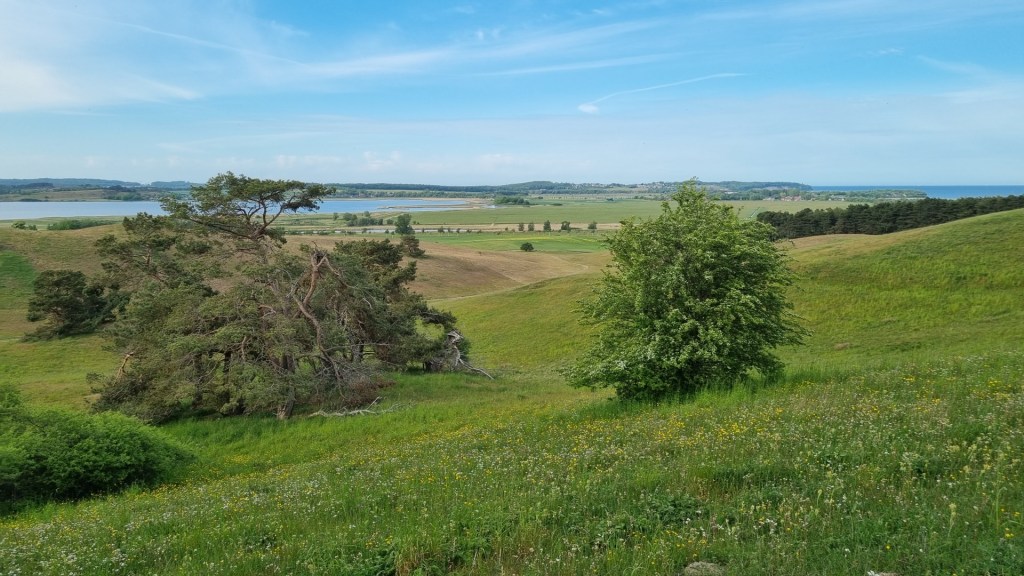 Am nächsten Morgen stehen wir um 5 Uhr auf, denn wir wollen die Ostsee überqueren nach Darßer Ort und wissen aus den Wettervorhersagen, dass der Wind gegen Mittag einschlafen wird. Beim nochmaligen Prüfen des Wetters am Morgen werde ich unsicher, der Wind kommt nun doch östlicher als Süd und es sind Böen bis 35 kn angesagt, es liegen Gewitter in der Luft. Wir sind vernünftig und lassen es sein, denn wir haben keinen Druck und sind lieber vorsichtig, denn Gewitter auf See versuchen wir zu vermeiden. Wir gehen nach dem Frühstück wieder in die Koje und wandern später die Küste bis zum Grønsund entlang. Es ist für uns immer wieder ein schönes Erlebnis, eine Landschaft aus einer anderen Perspektive nun zu Fuß zu sehen und wir sind froh, auch auf Falster eine Wanderung gemacht zu haben.