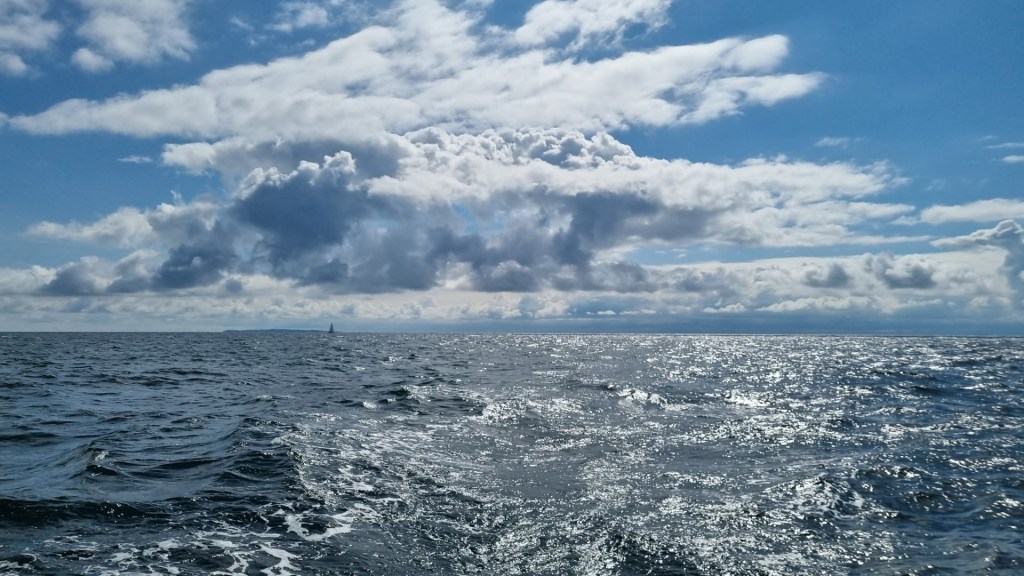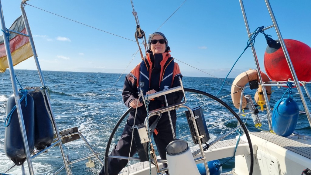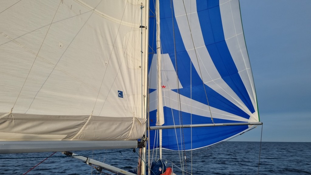 Am nächsten Morgen stehen wir wieder um 5 Uhr auf, um gleich abzulegen, frühstücken können wir auf See. Das Ziel ist nun Kloster auf Hiddensee und wir haben in der Prognose gesehen, dass der Wind um die Mittagszeit abnehmen wird. Wir haben 15 kn Wind aus West und können raumschots über die Ostsee fliegen unter Groß und Spi. Ich lege mich in den Salon, um ein wenig Schlaf nachzuholen, bis mich ein Ruf von Annette weckt: „Der Spi geht kaputt“; ich hechte an Bord und sehe das Elend. Der gesamte Spi ist zerrissen. Nach 19 Jahren intensiven Segelns ist er wohl nun doch mürbe geworden. So ein Mist, noch eine Neuanschaffung…