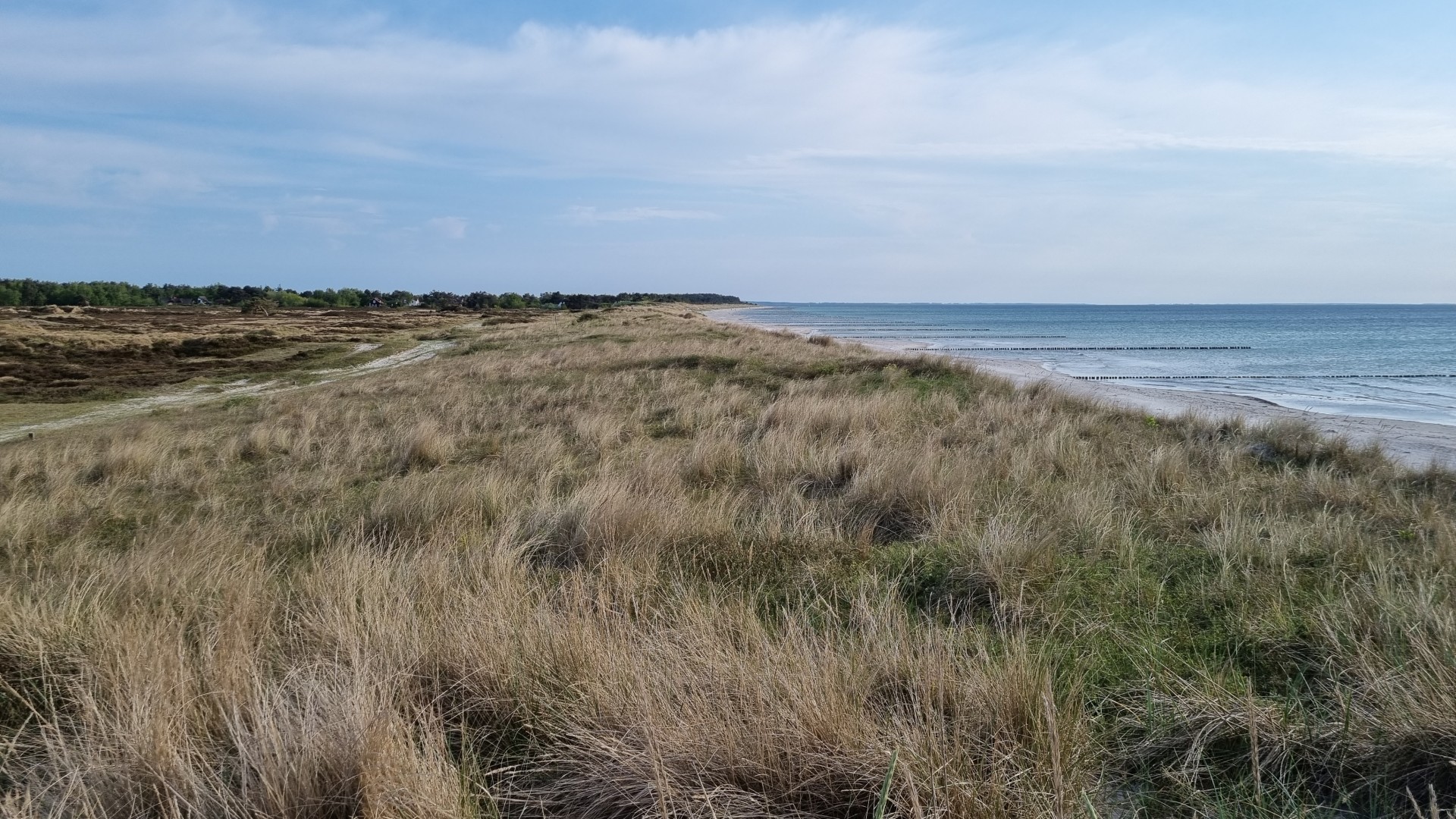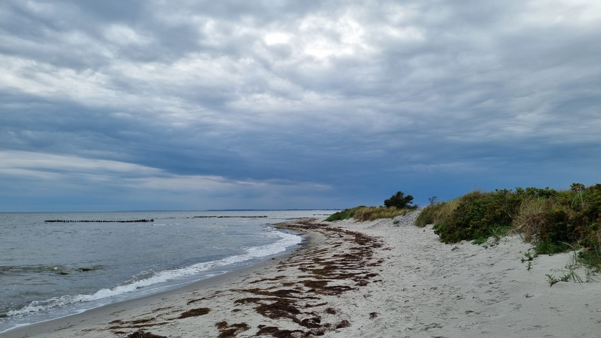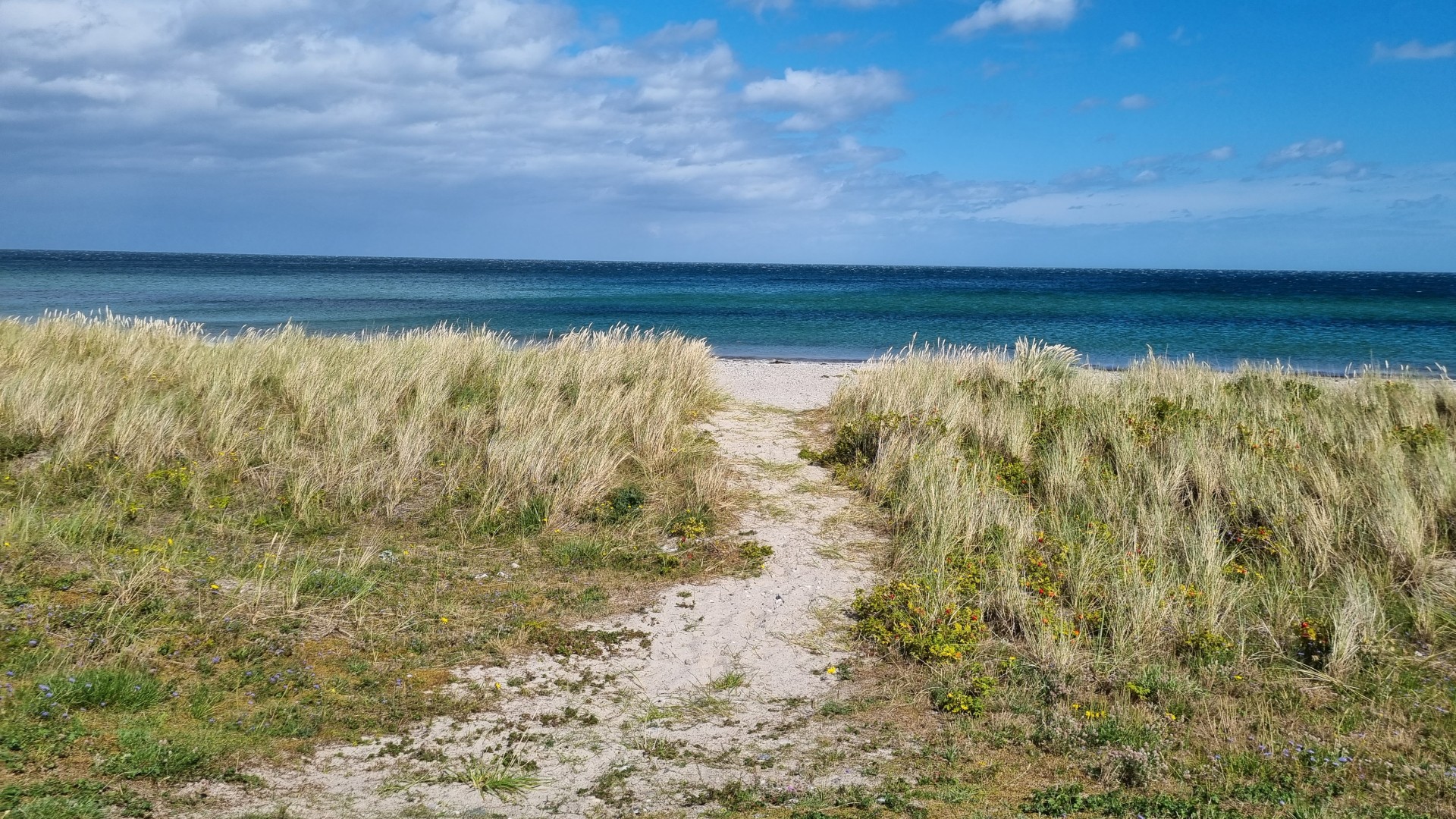 Am nächsten Morgen stehen wir um 5 Uhr auf, denn wir wollen die Ostsee überqueren nach Darßer Ort und wissen aus den Wettervorhersagen, dass der Wind gegen Mittag einschlafen wird. Beim nochmaligen Prüfen des Wetters am Morgen werde ich unsicher, der Wind kommt nun doch östlicher als Süd und es sind Böen bis 35 kn angesagt, es liegen Gewitter in der Luft. Wir sind vernünftig und lassen es sein, denn wir haben keinen Druck und sind lieber vorsichtig, denn Gewitter auf See versuchen wir zu vermeiden. Wir gehen nach dem Frühstück wieder in die Koje und wandern später die Küste bis zum Grønsund entlang. Es ist für uns immer wieder ein schönes Erlebnis, eine Landschaft aus einer anderen Perspektive nun zu Fuß zu sehen und wir sind froh, auch auf Falster eine Wanderung gemacht zu haben.