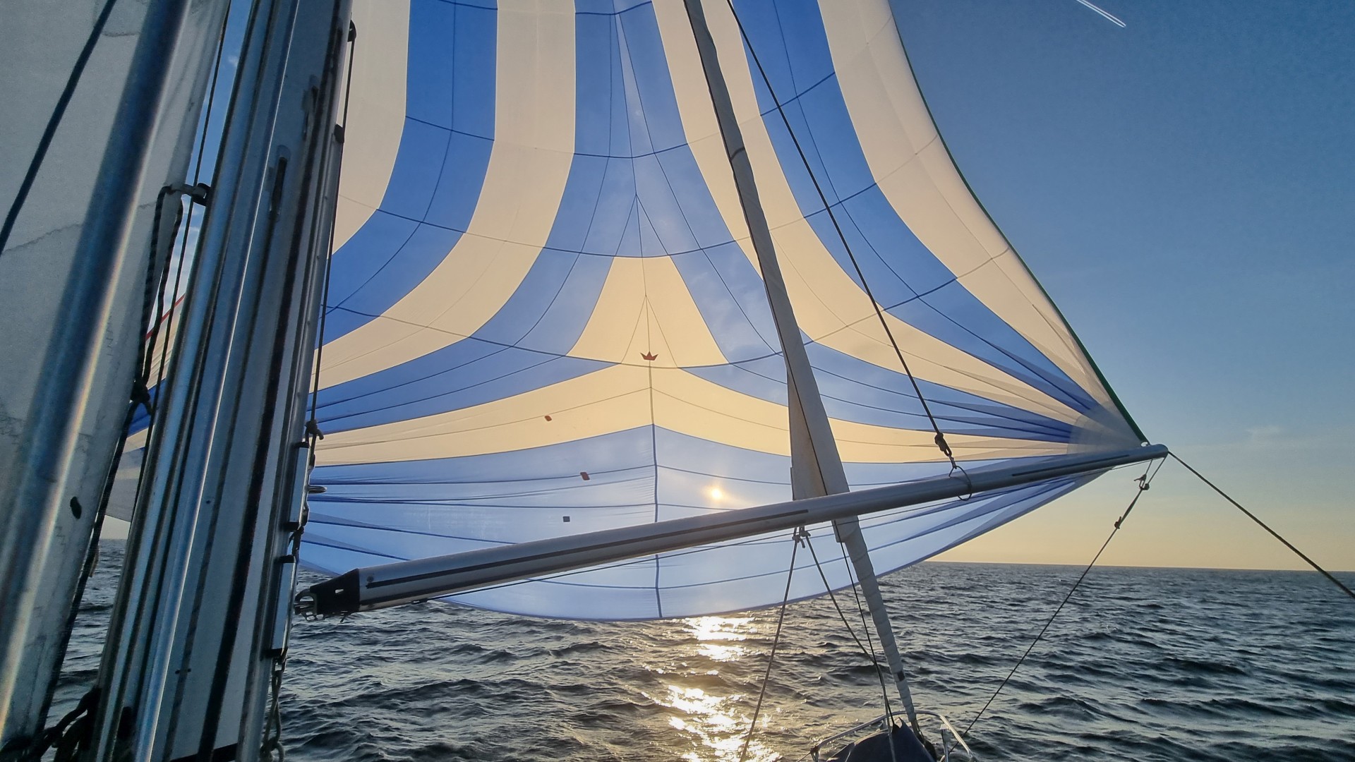 Am nächsten Morgen stehen wir wieder um 5 Uhr auf, um gleich abzulegen, frühstücken können wir auf See. Das Ziel ist nun Kloster auf Hiddensee und wir haben in der Prognose gesehen, dass der Wind um die Mittagszeit abnehmen wird. Wir haben 15 kn Wind aus West und können raumschots über die Ostsee fliegen unter Groß und Spi. Ich lege mich in den Salon, um ein wenig Schlaf nachzuholen, bis mich ein Ruf von Annette weckt: „Der Spi geht kaputt“; ich hechte an Bord und sehe das Elend. Der gesamte Spi ist zerrissen. Nach 19 Jahren intensiven Segelns ist er wohl nun doch mürbe geworden. So ein Mist, noch eine Neuanschaffung…